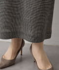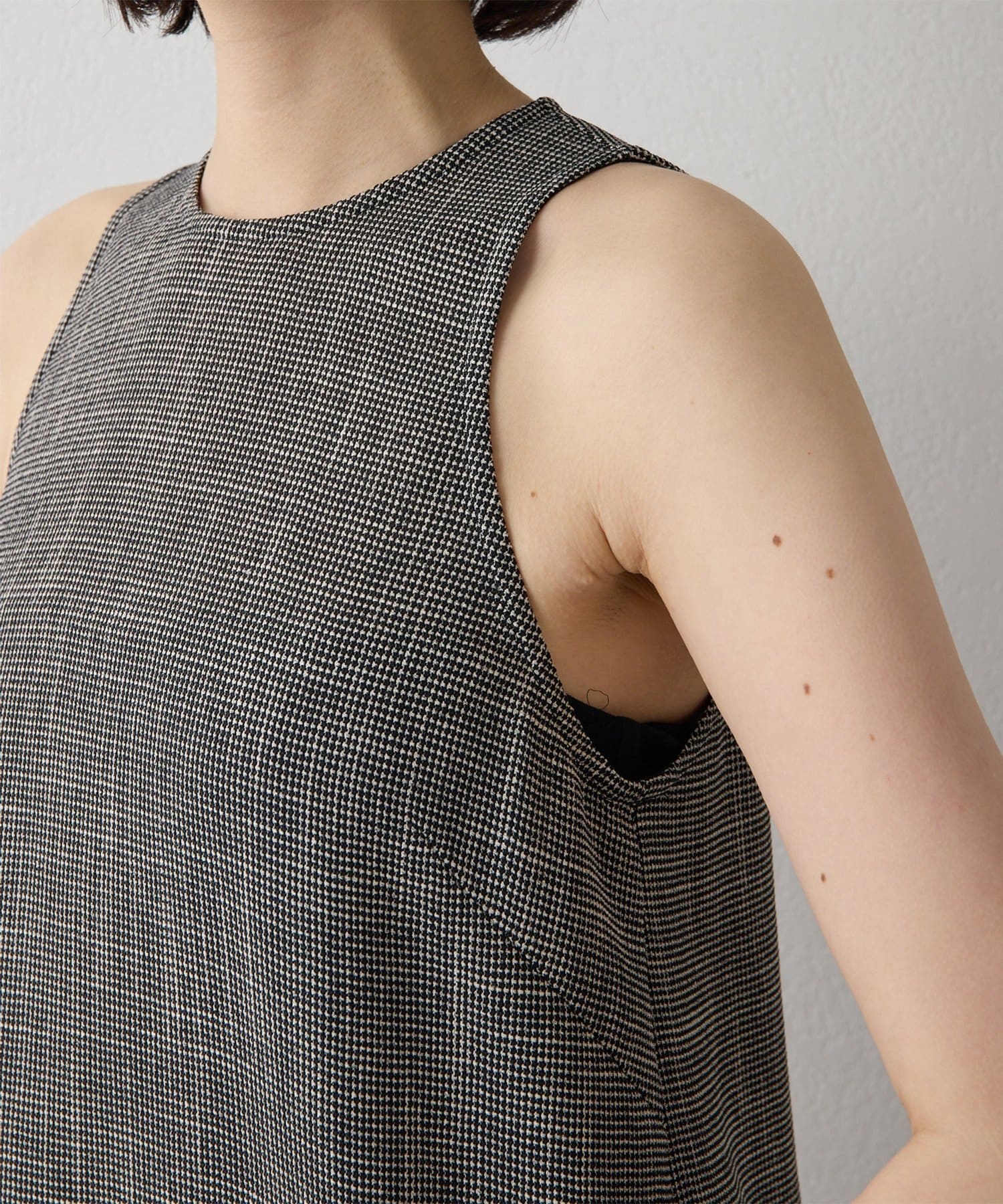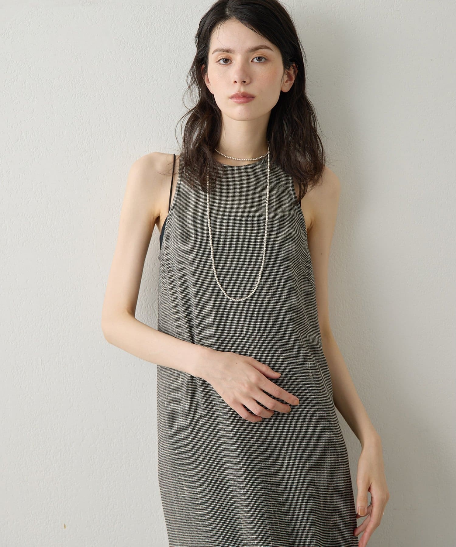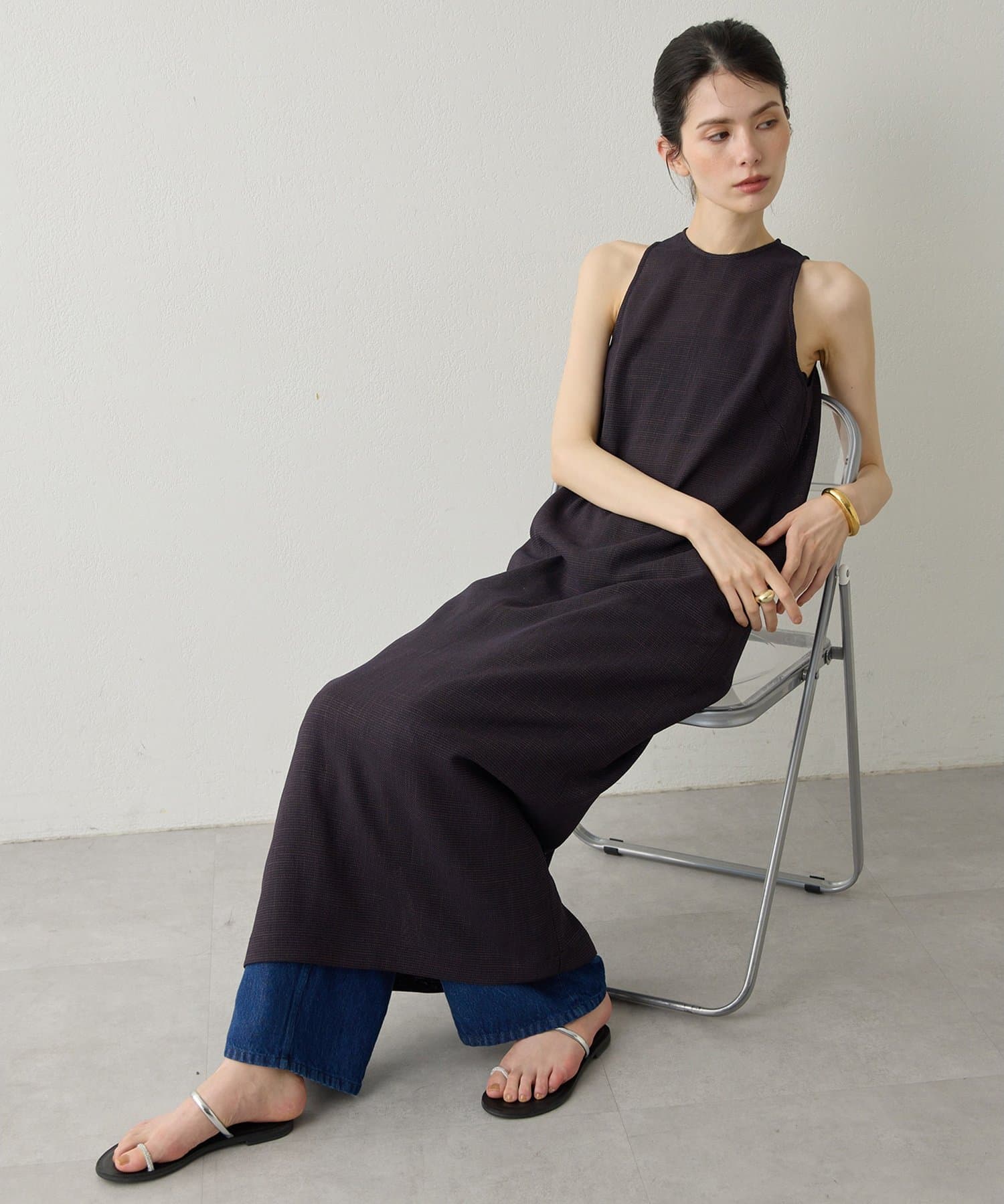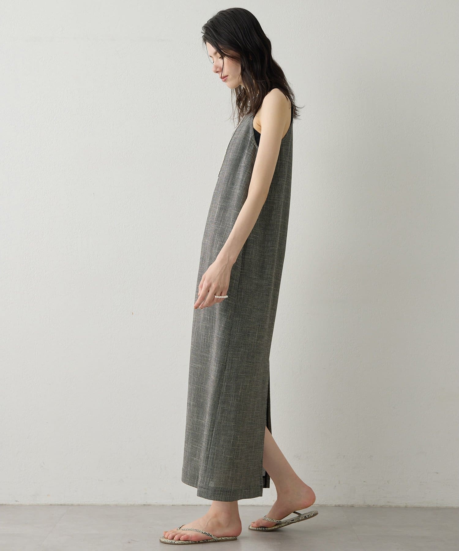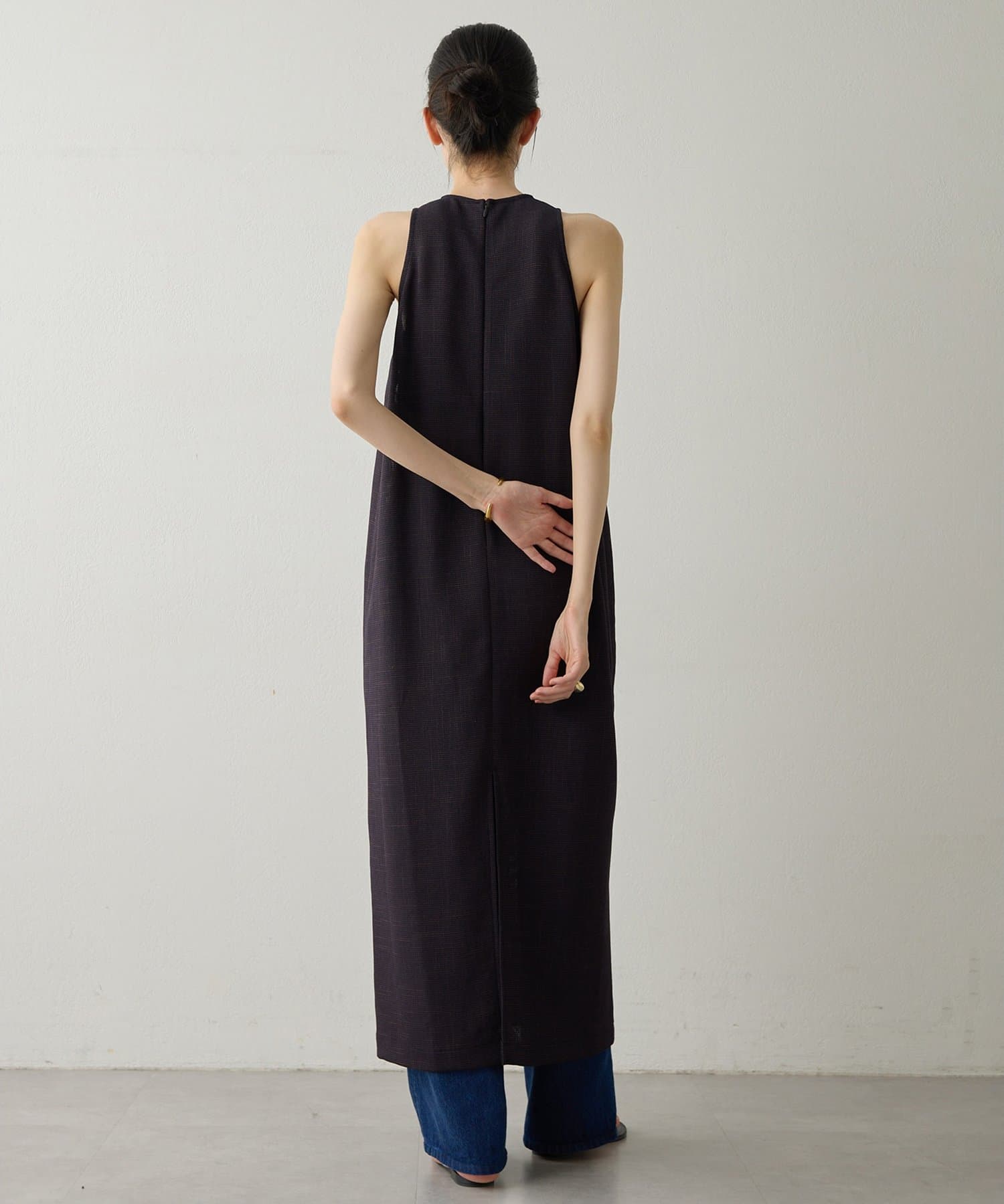 ■表情感のある生地で仕立てたノースリーブワンピース。