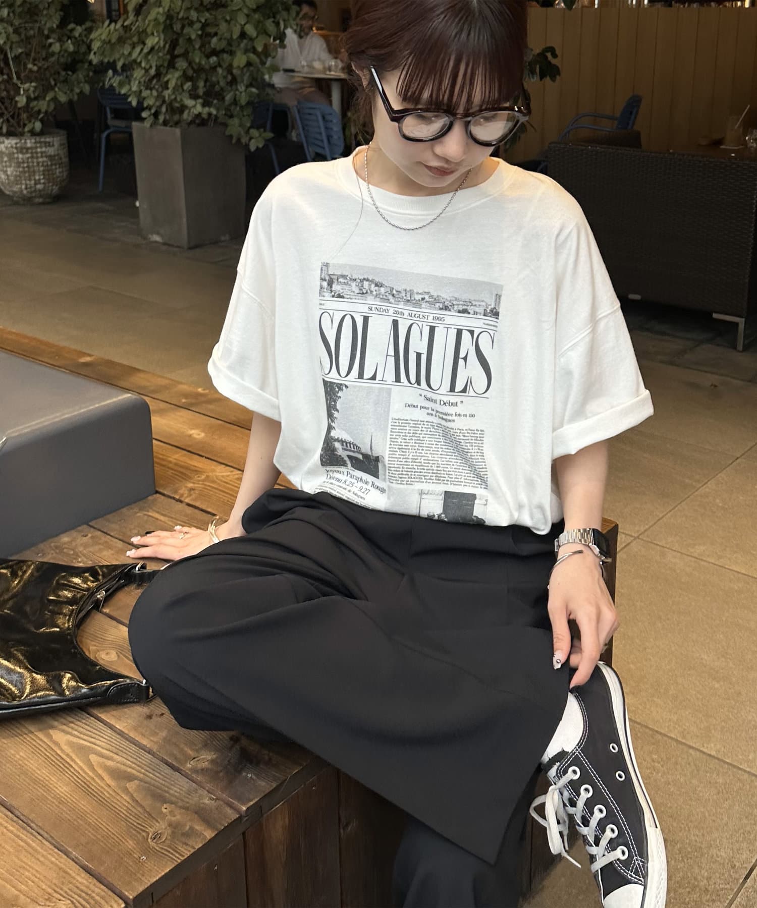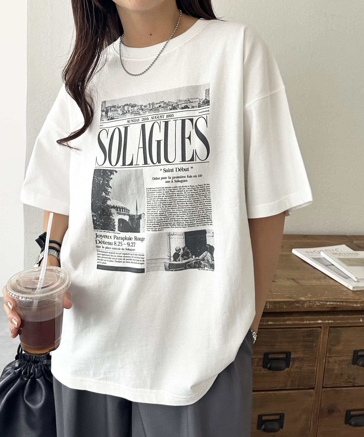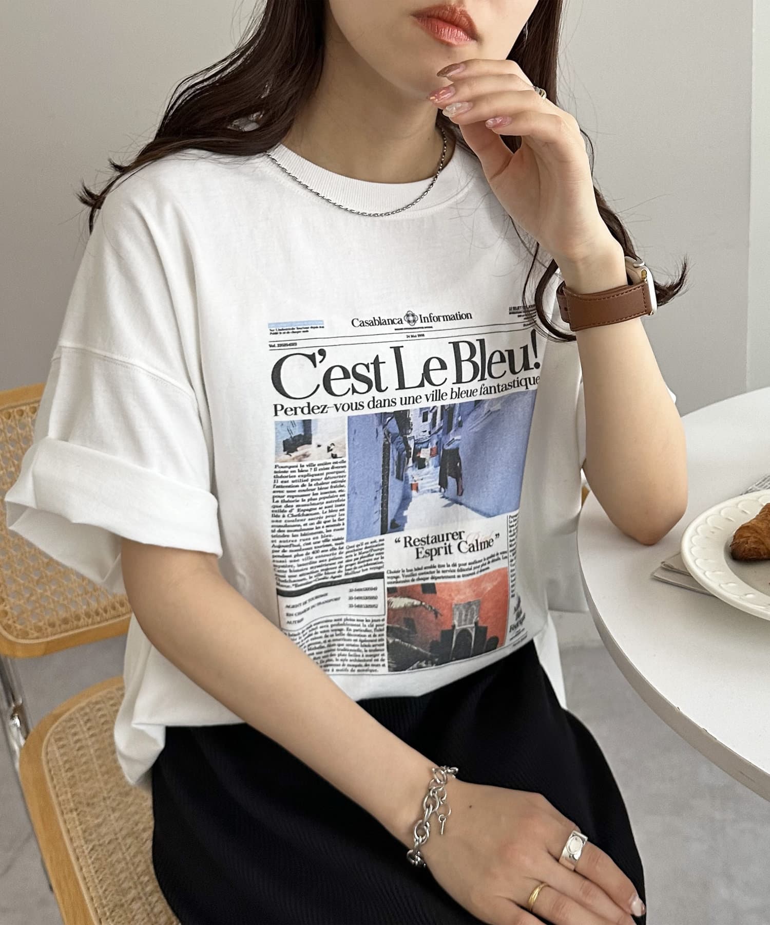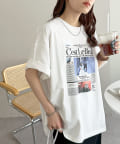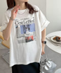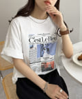 ニュースペーパーをプリントしたようなデザインがコーデのポイントになるトップス。