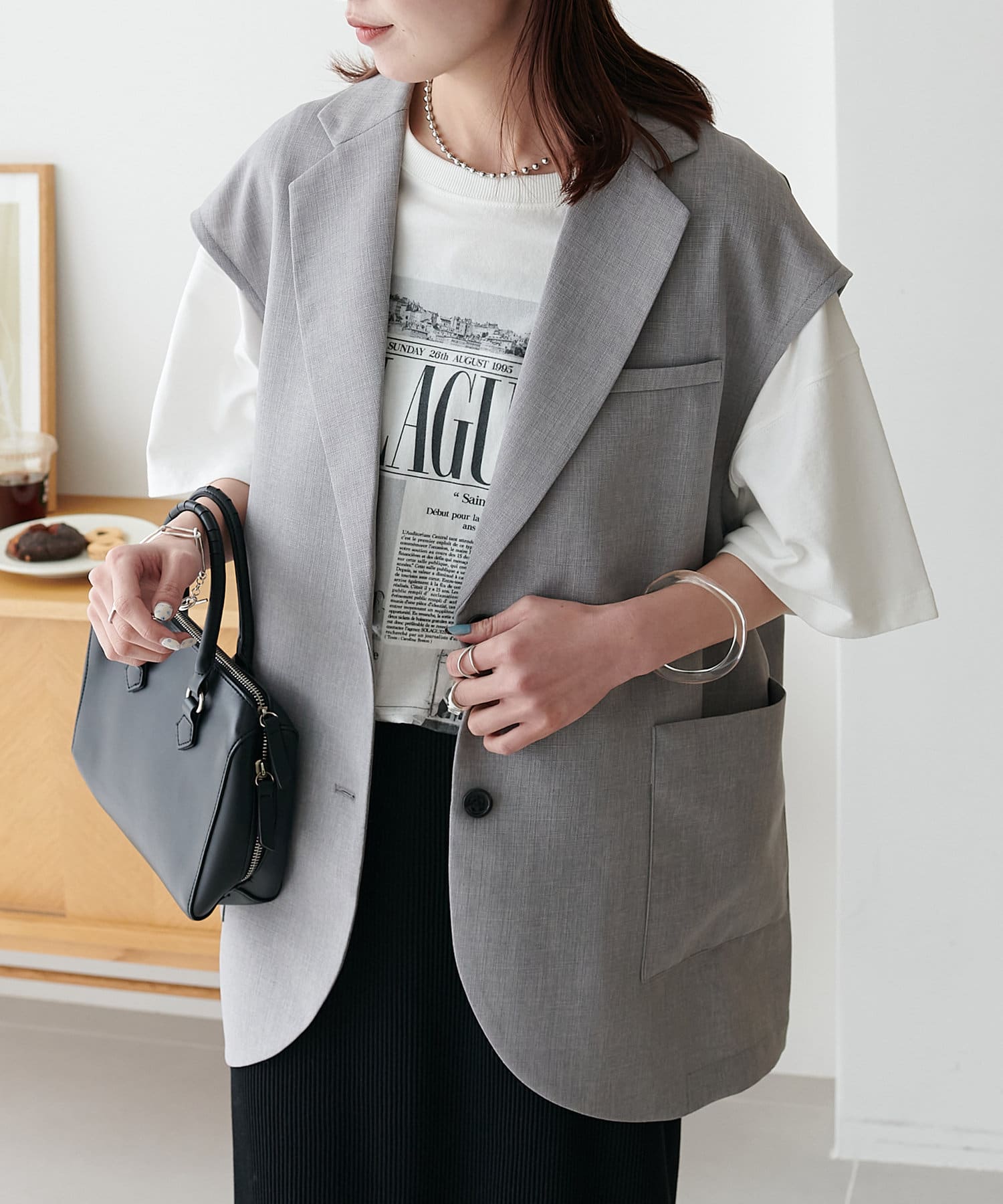 今の季節はジャケットの中に、夏には1枚で着てもお袖と二の腕に隙間ができるサイズ感で、体型カバーできそうです。