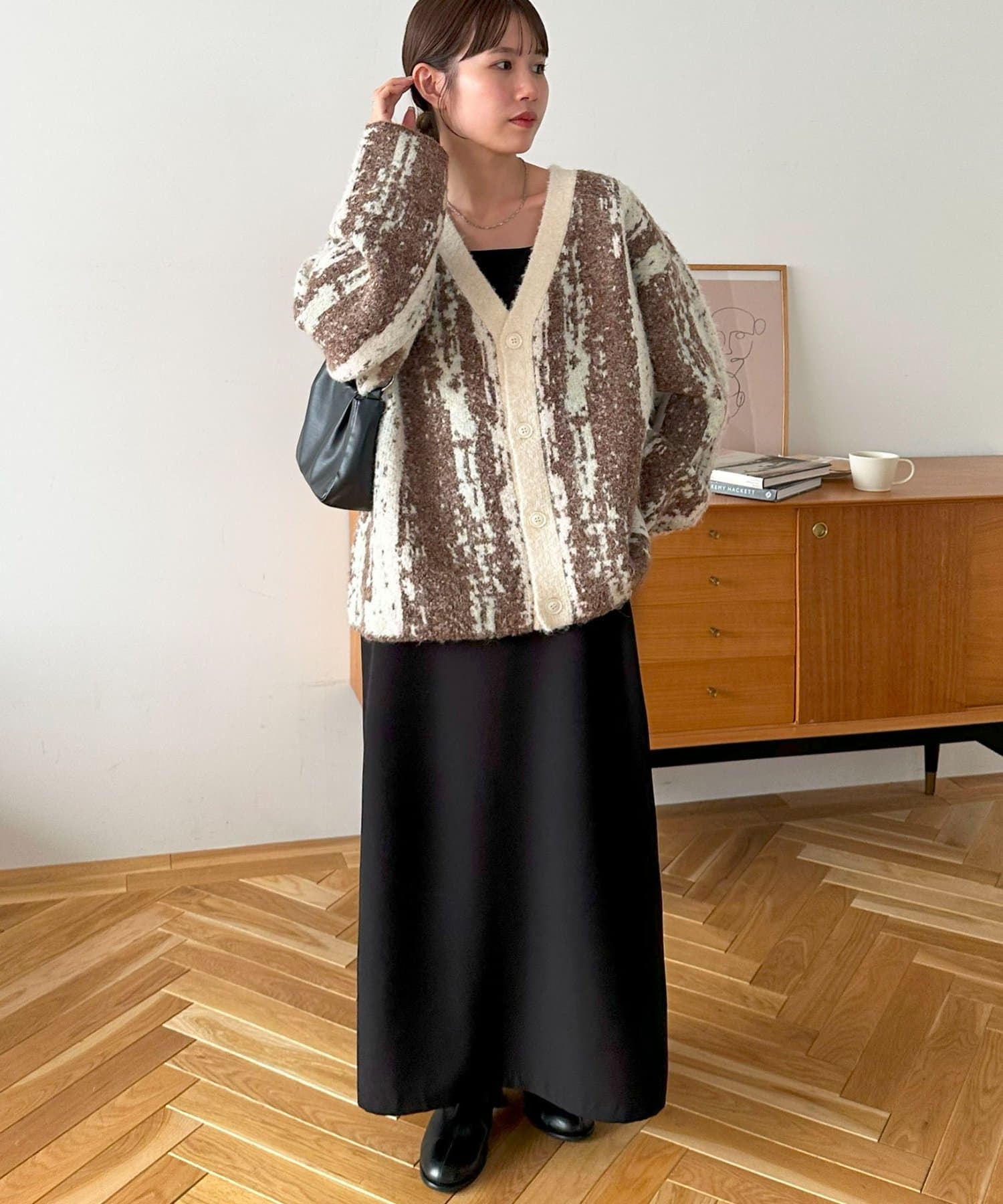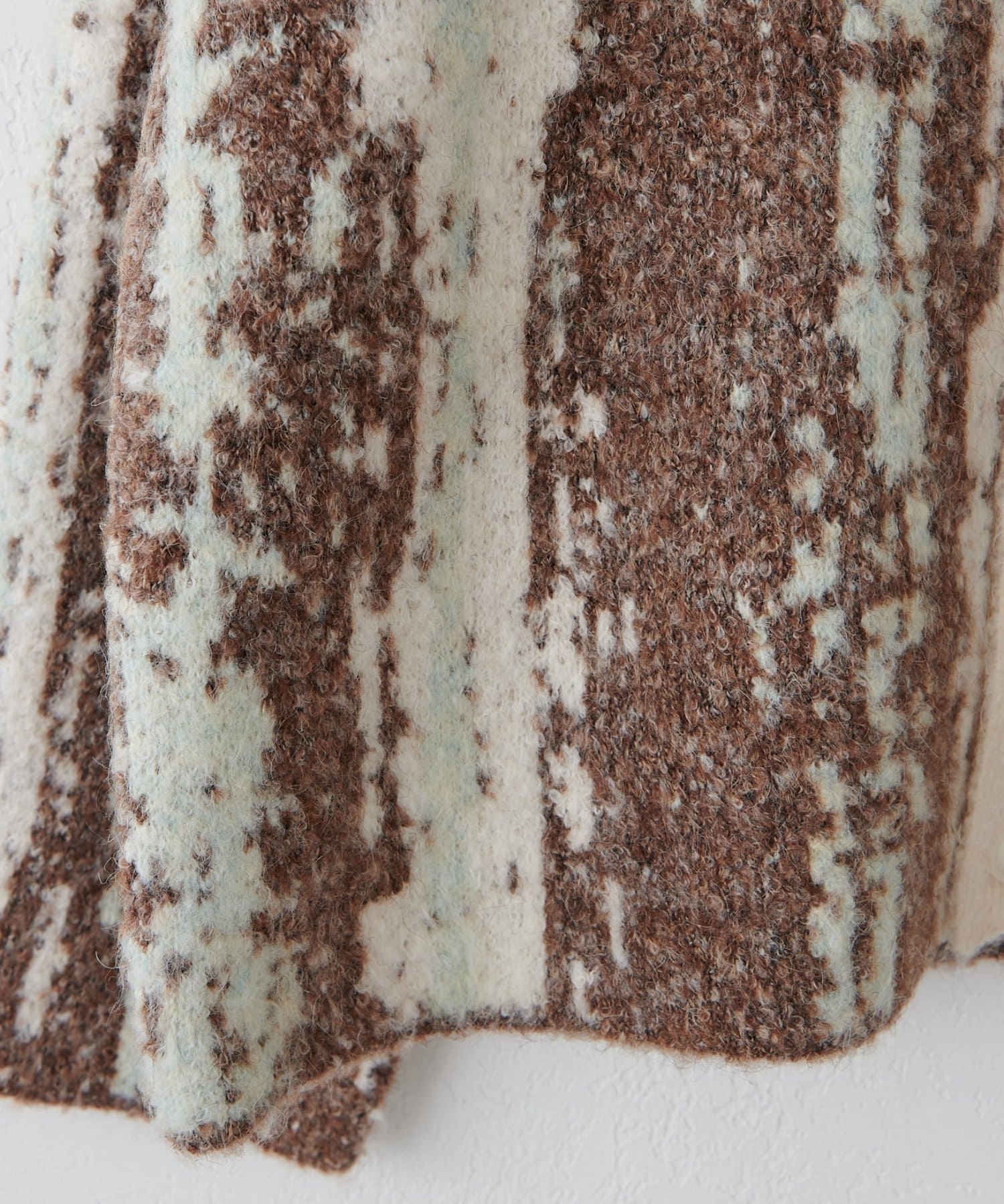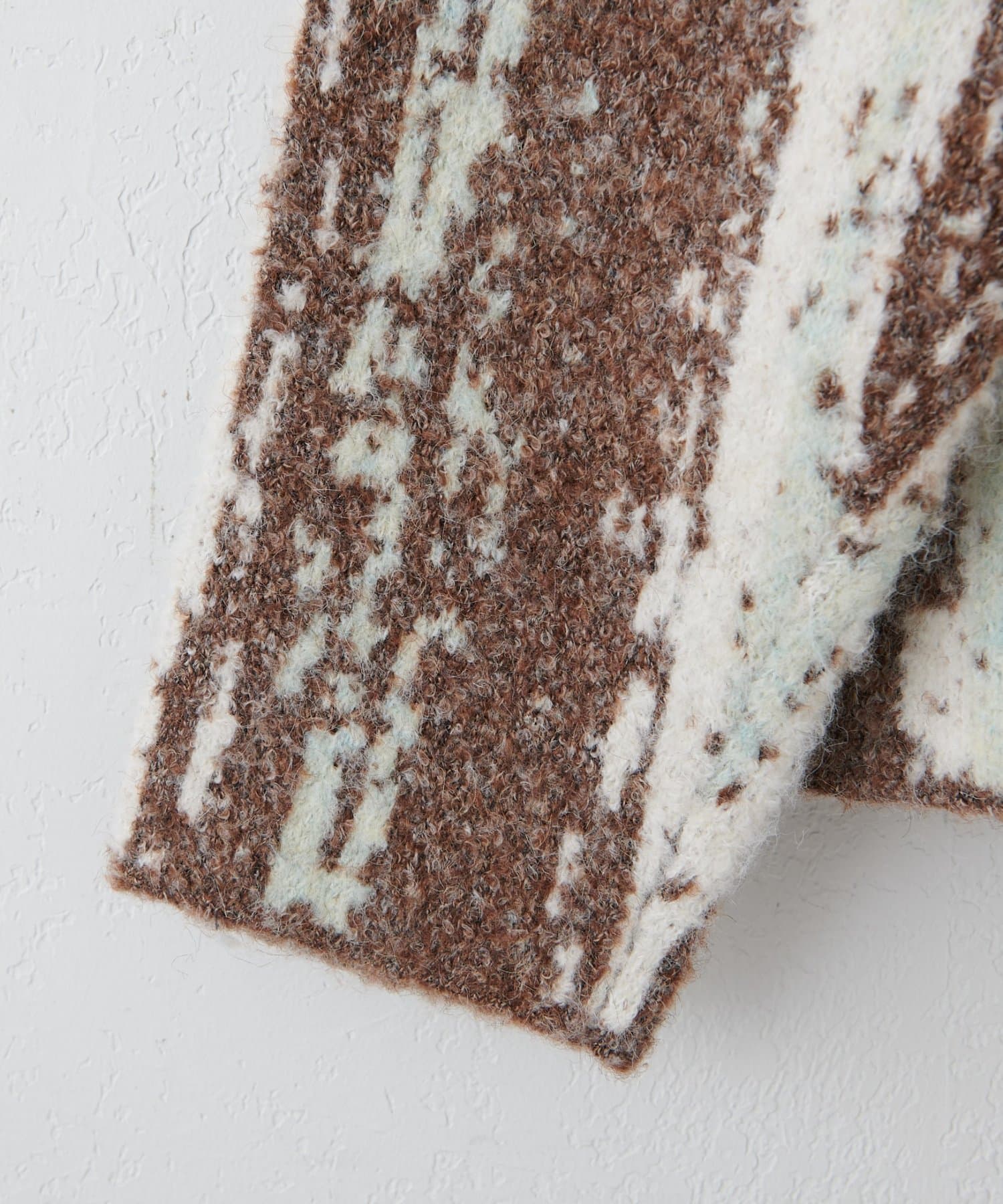 表情豊かなジャガード編みで仕立てた、ふんわりと柔らかな肌触りの素材を使用。チクチクしにくく、ニット特有のごわつき感もなく、快適な着心地を実現しています。適度な厚みがありつつも軽量なので、ロングシーズン使えるのも魅力◎肌寒い季節の羽織りとしてはもちろん、真冬はアウターの中に差し込むレイヤードアイテムとしても活躍します。