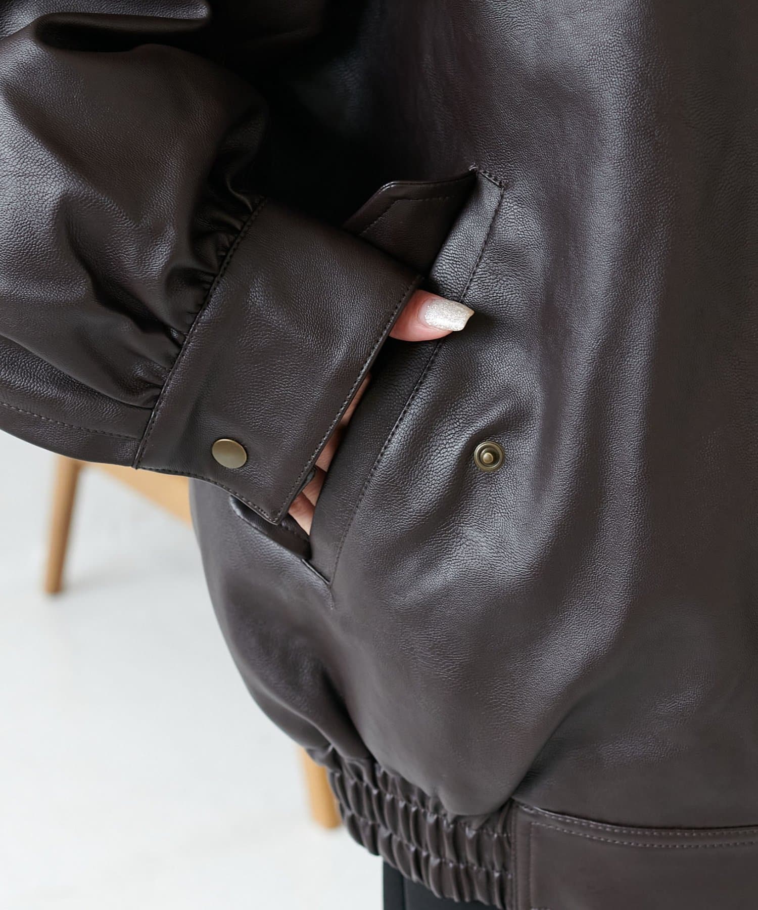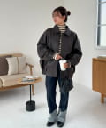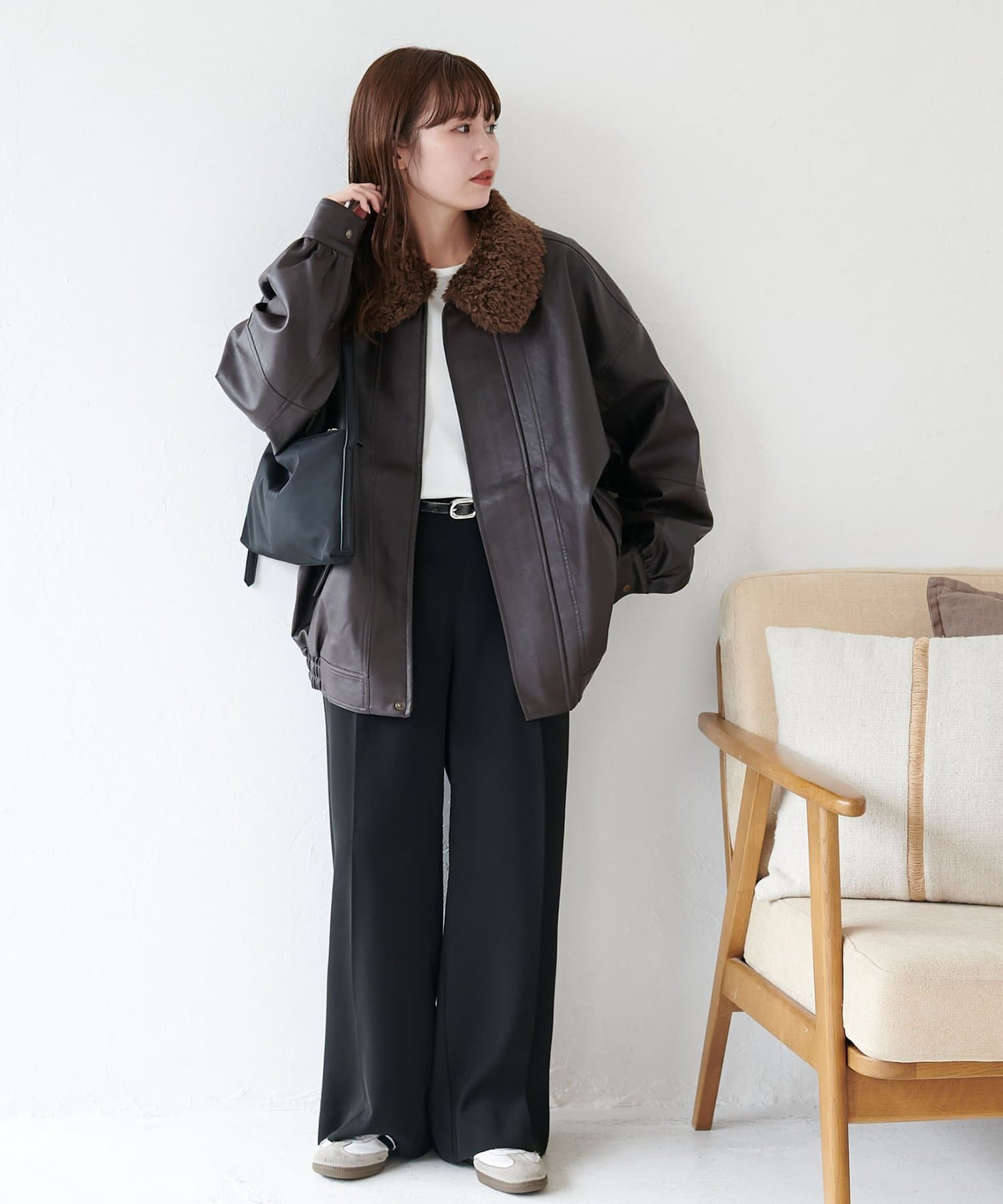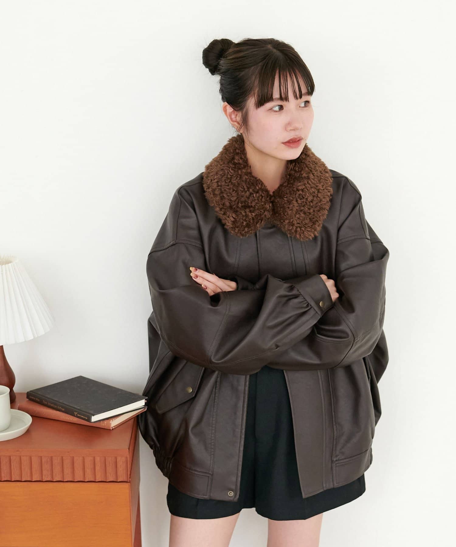 ヴィンテージ感あるフェイクレザーに、もこもこのボア襟を施したことで、顔回りに立体感を与え、スタイリングに程よいアクセントをプラスします◎