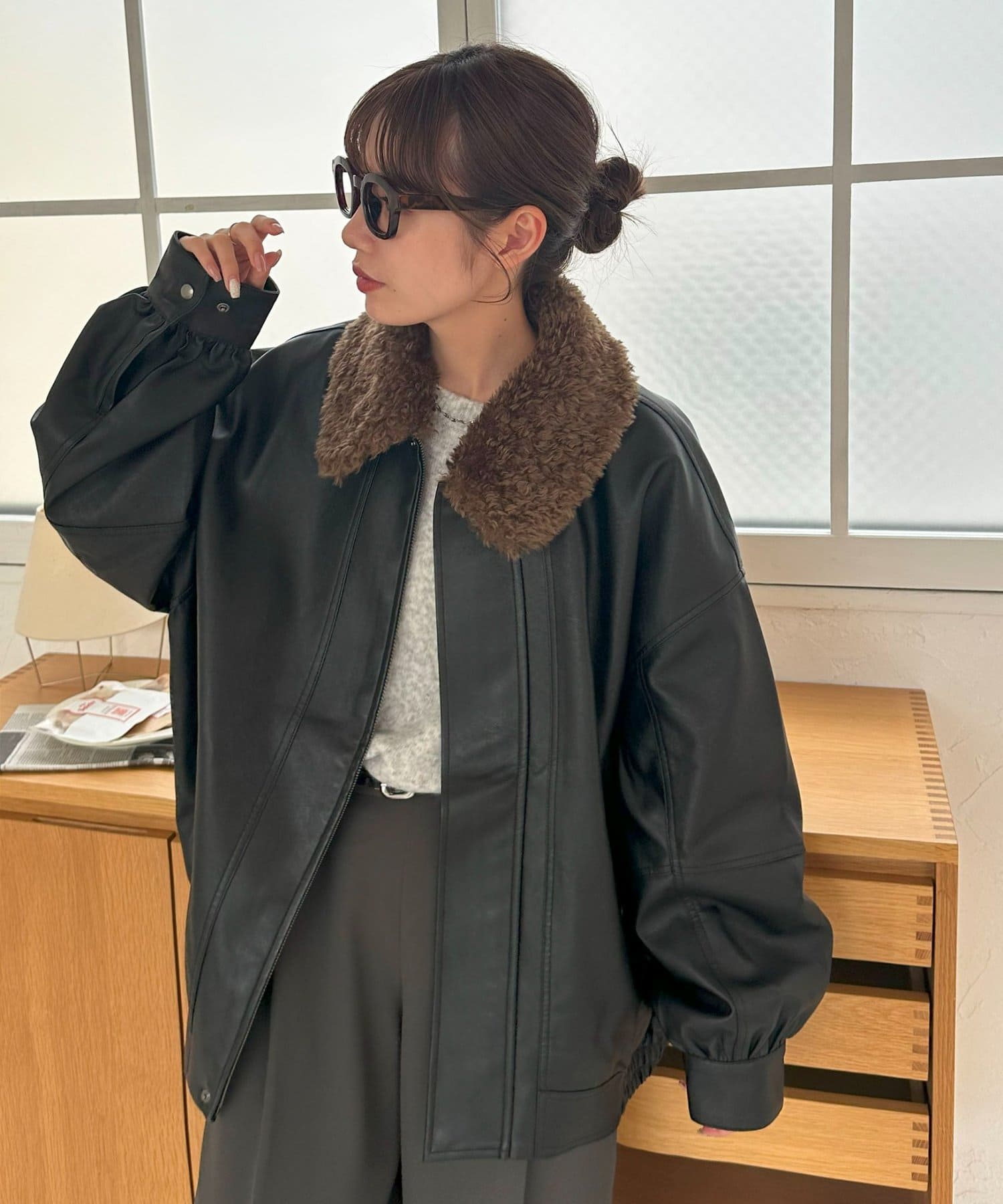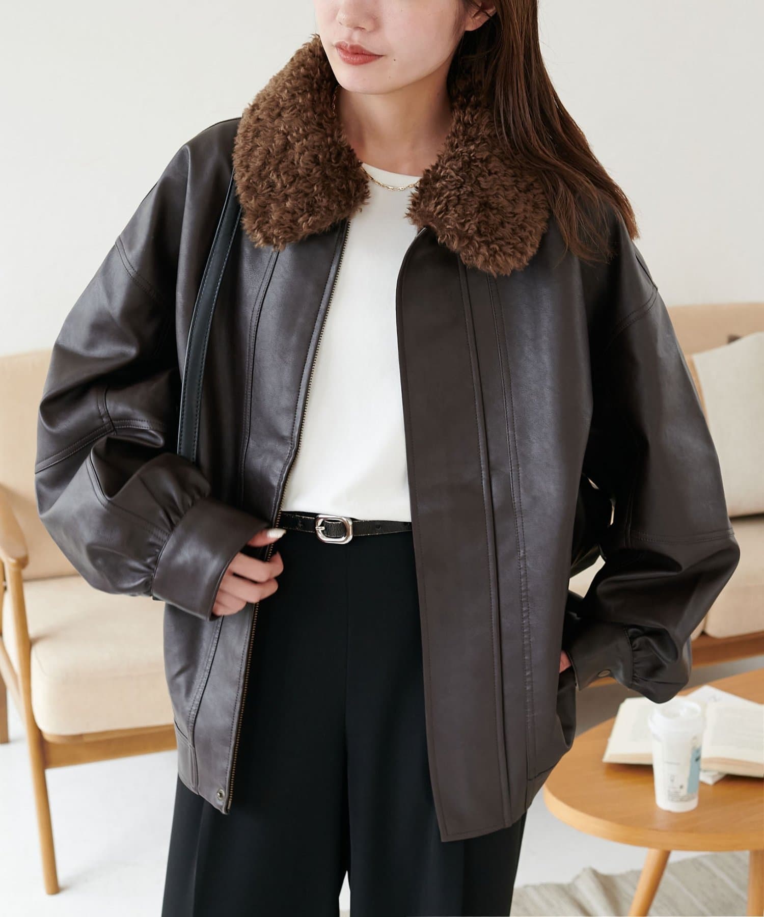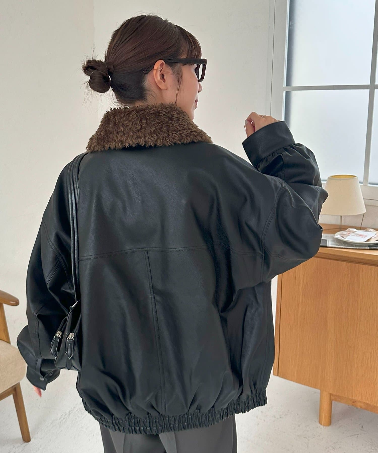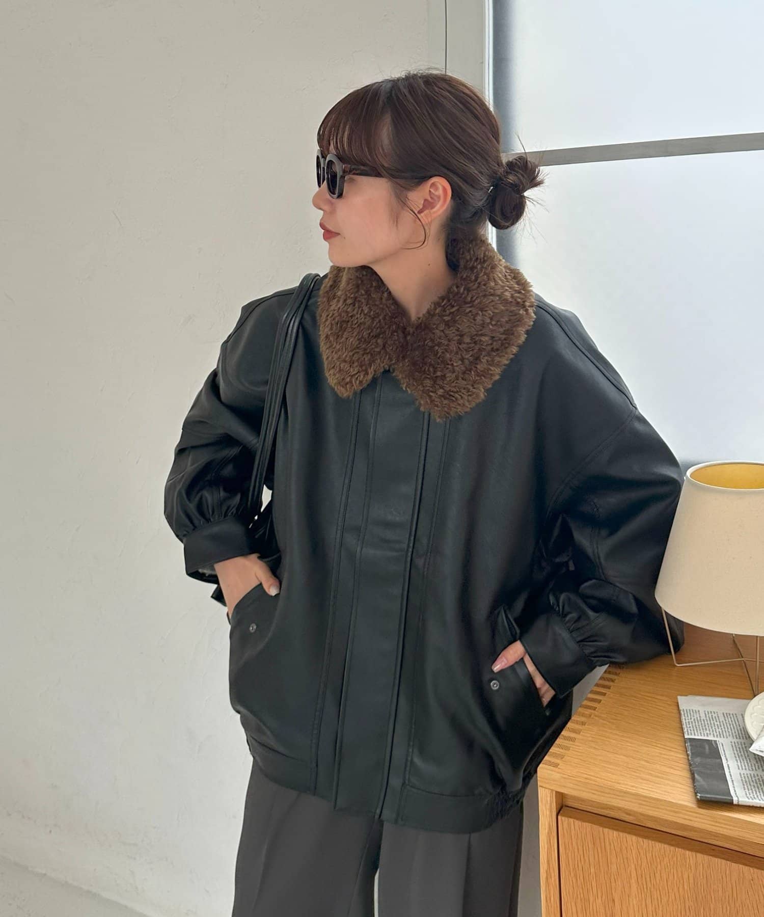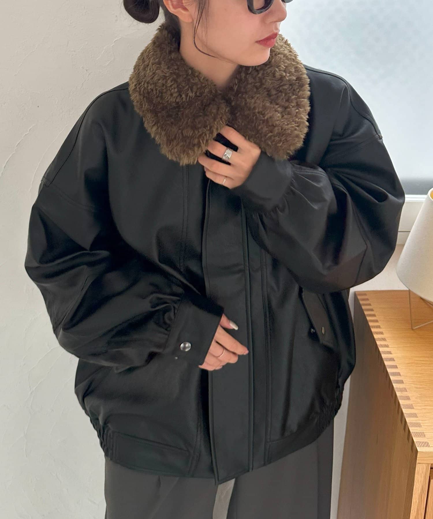 ボアの衿は取り外し可能なので、シンプルなレザージャケットとしても着用できます!