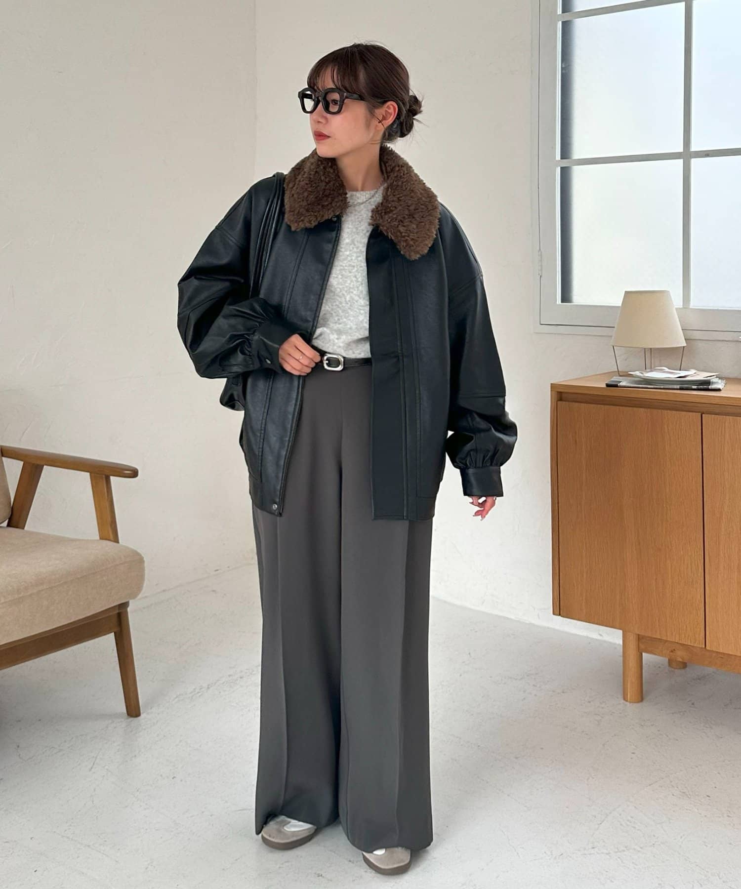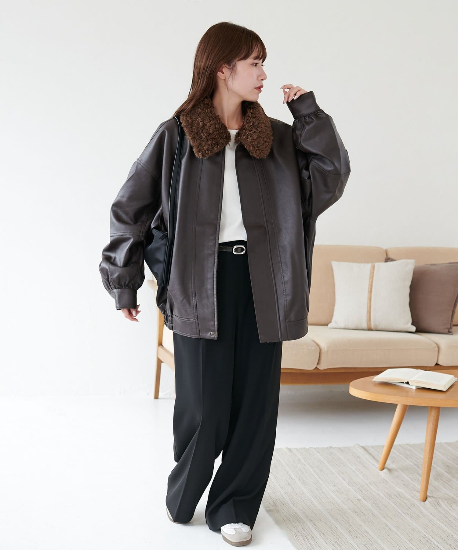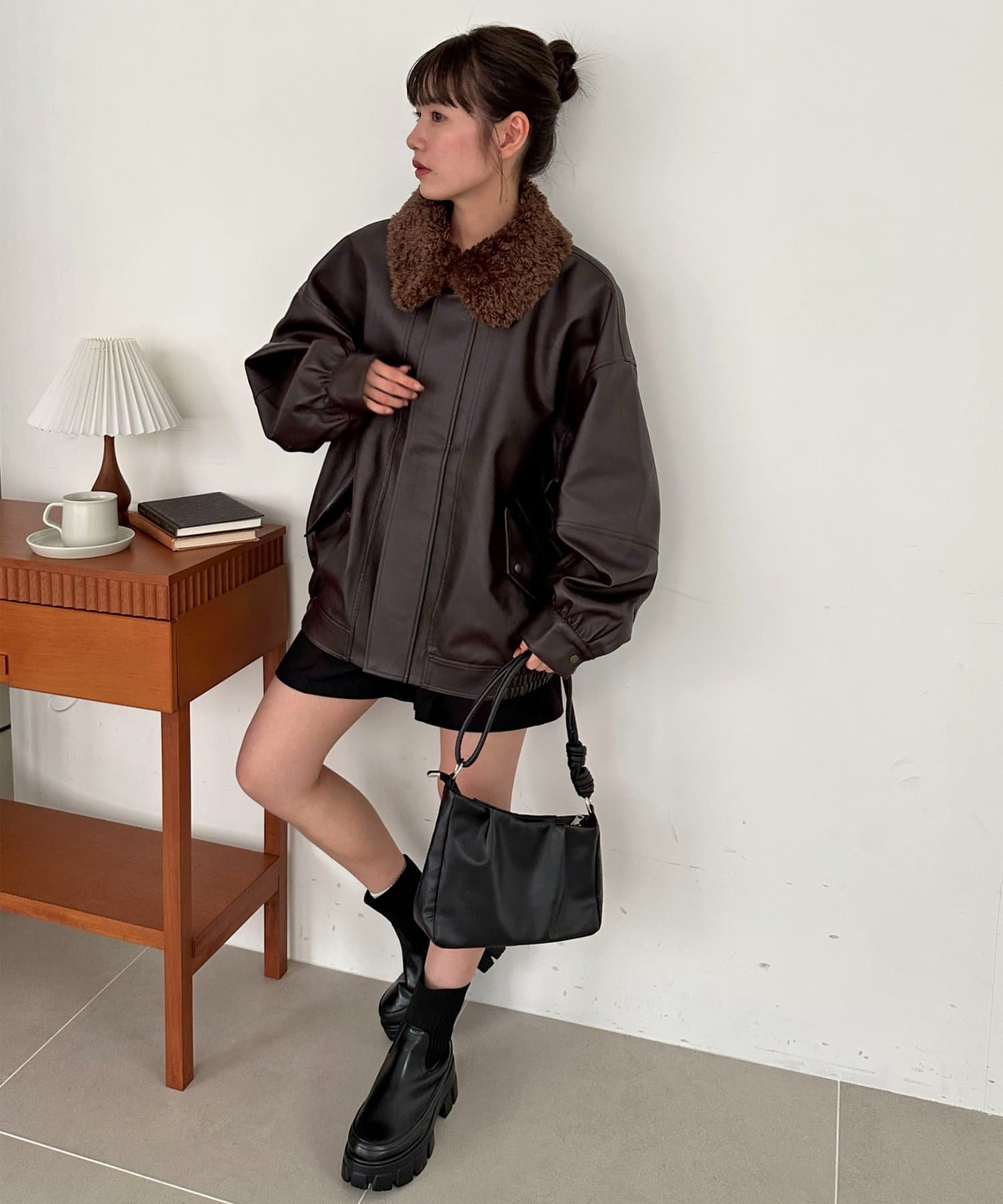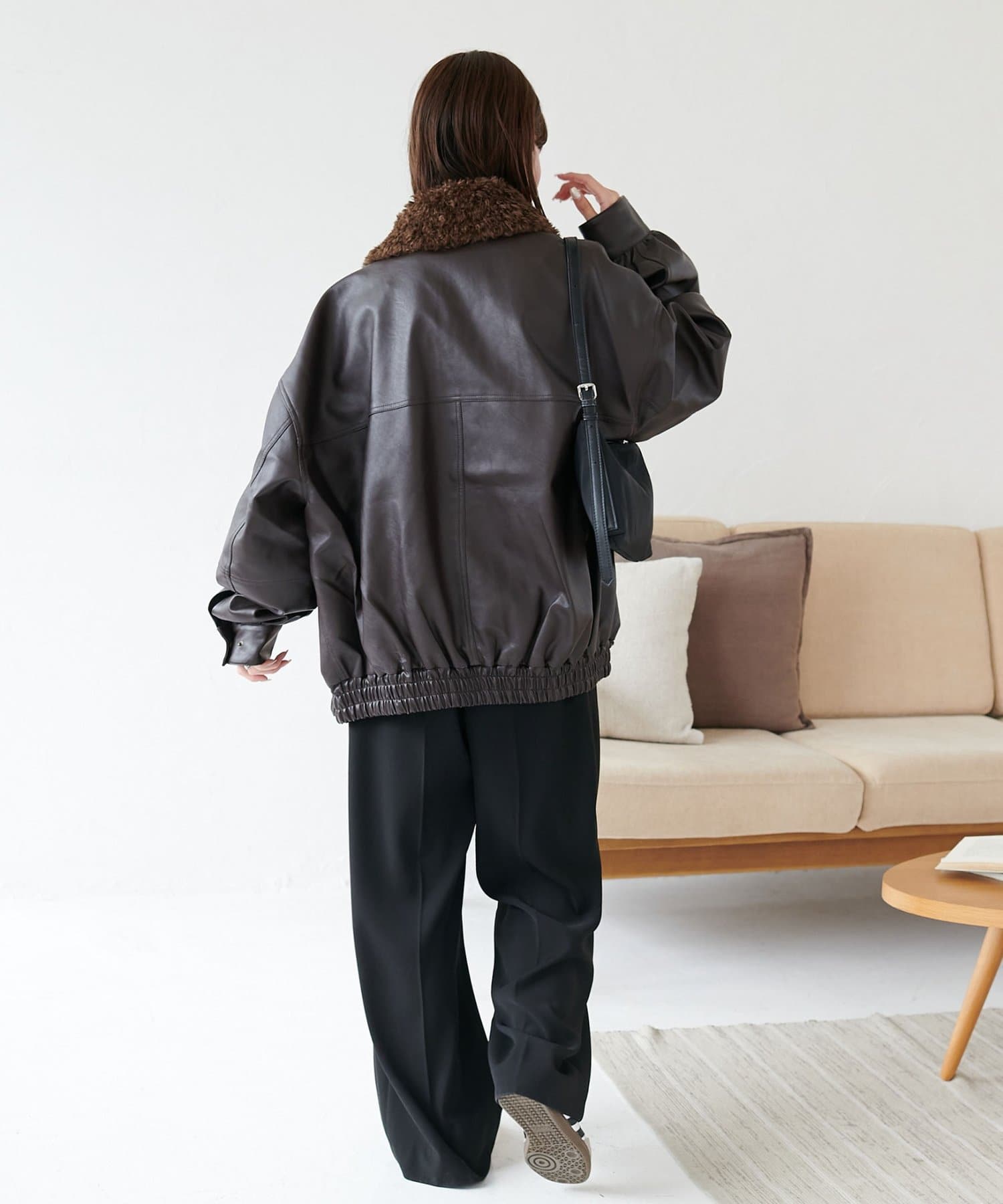 ボアの衿は取り外し可能なので、シンプルなレザージャケットとしても着用できます!