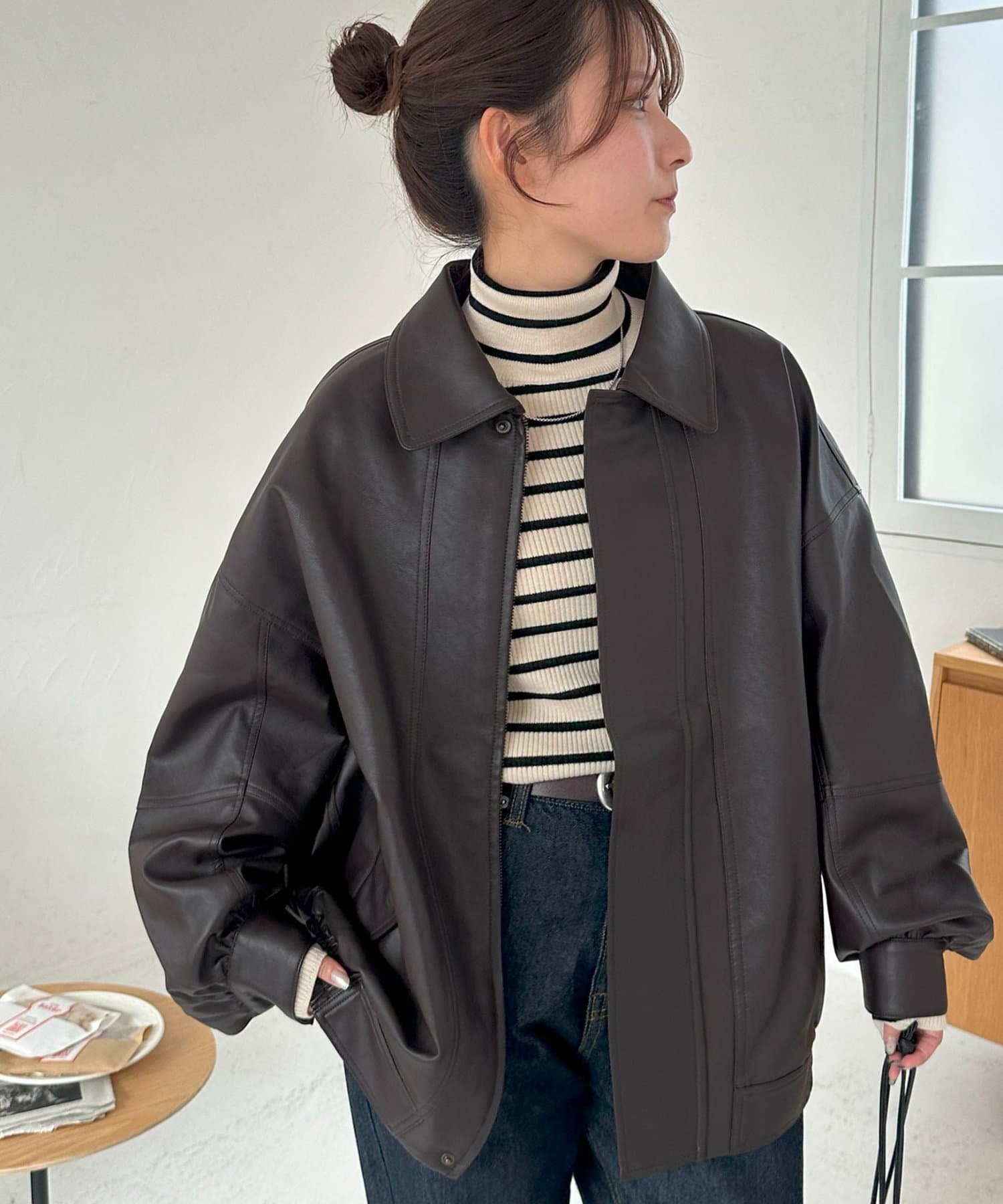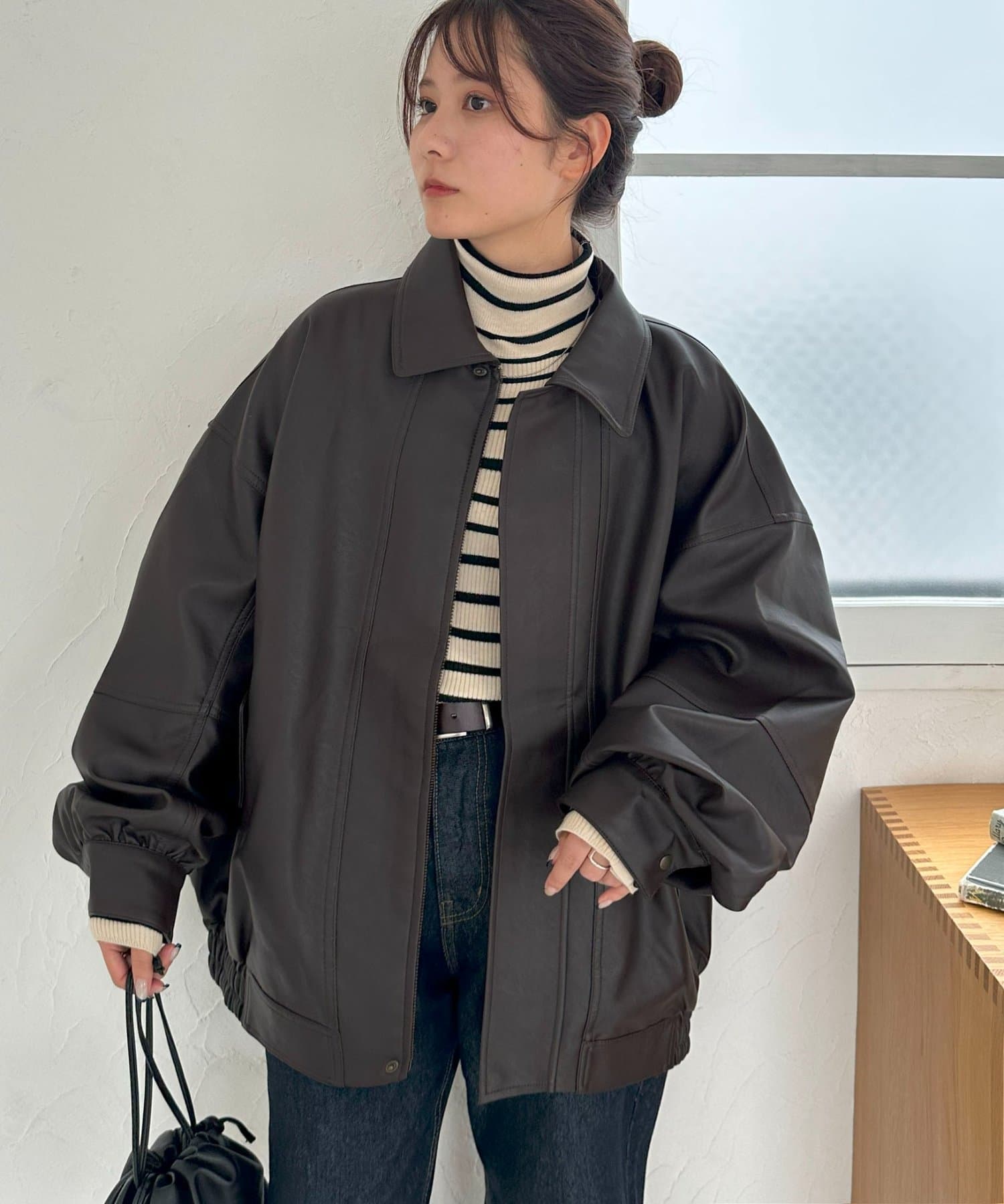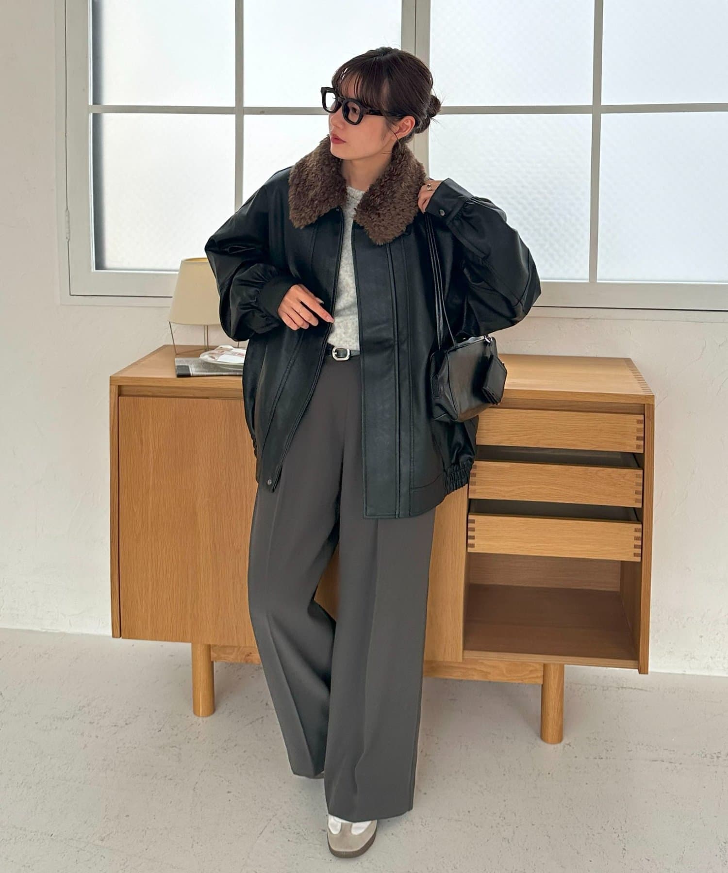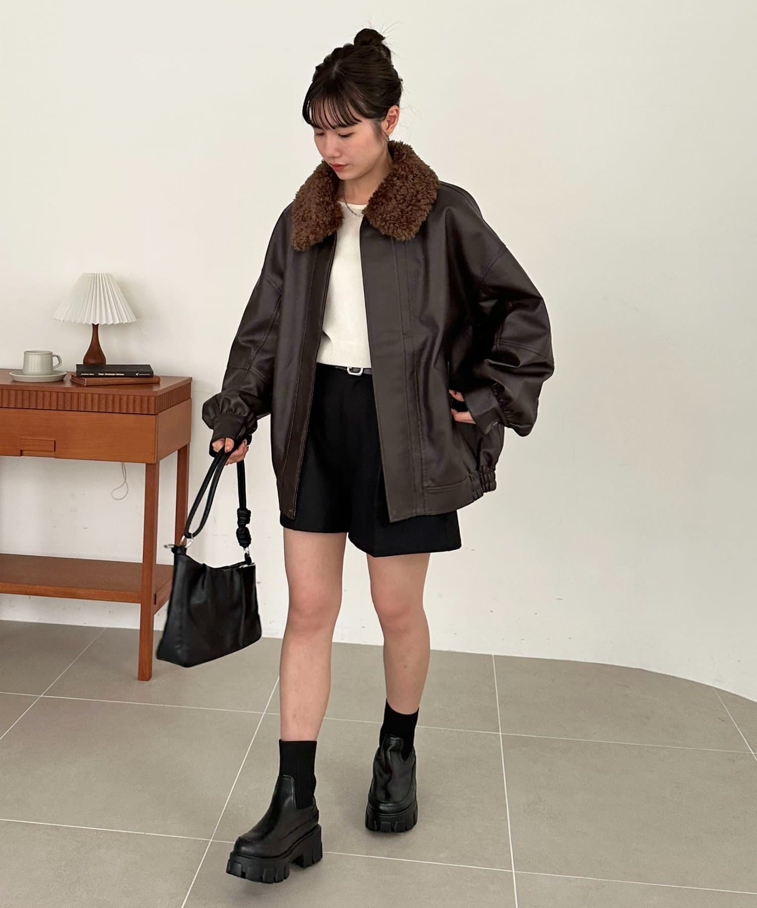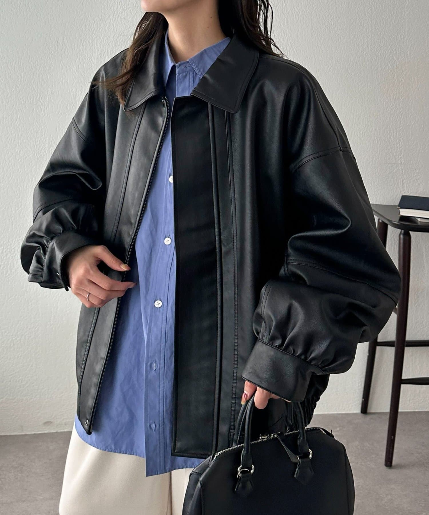 ボアの衿は取り外し可能なので、シンプルなレザージャケットとしても着用できます!