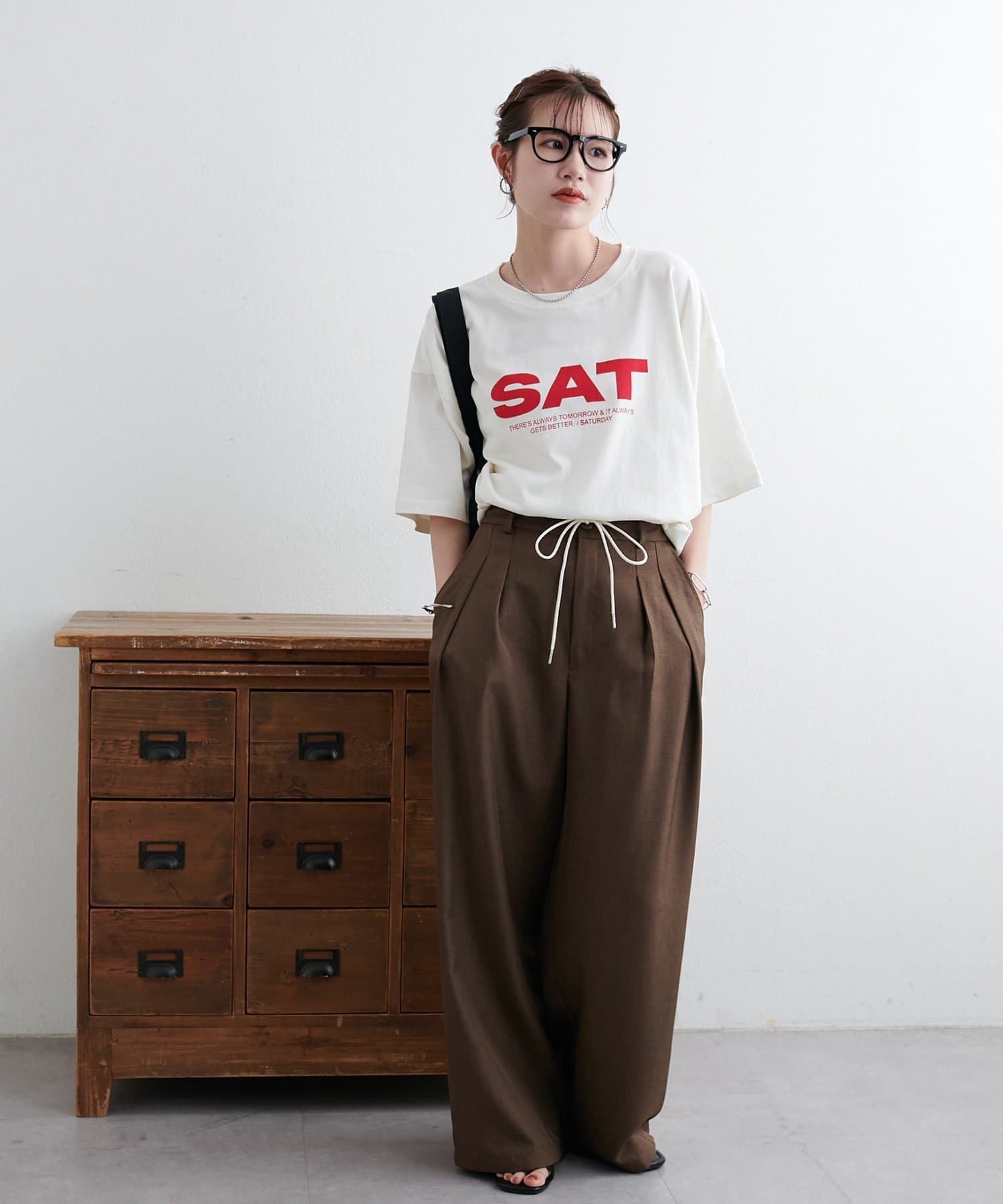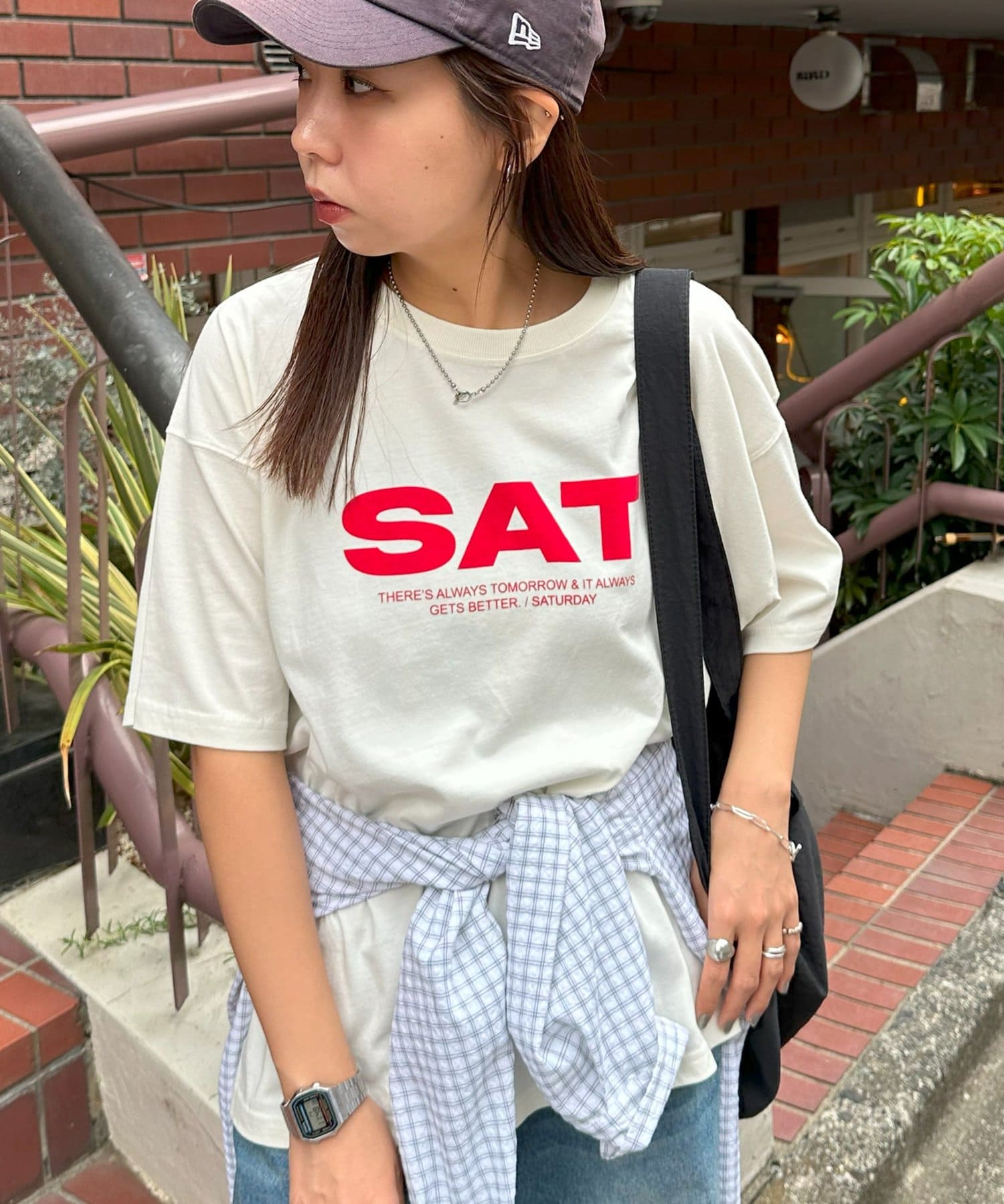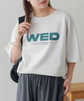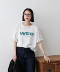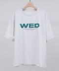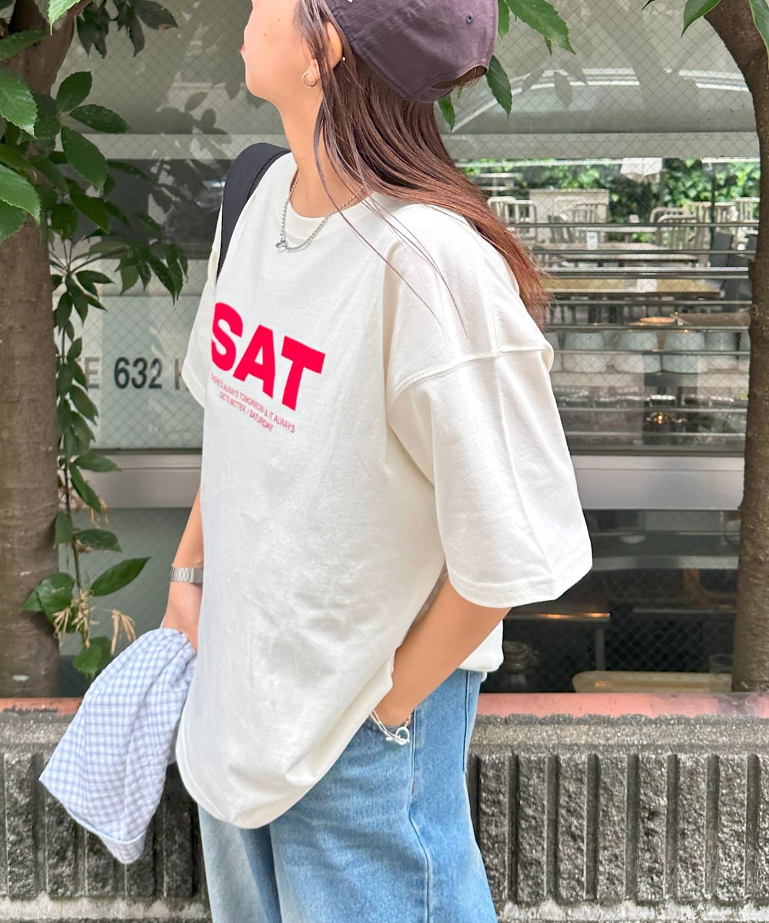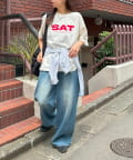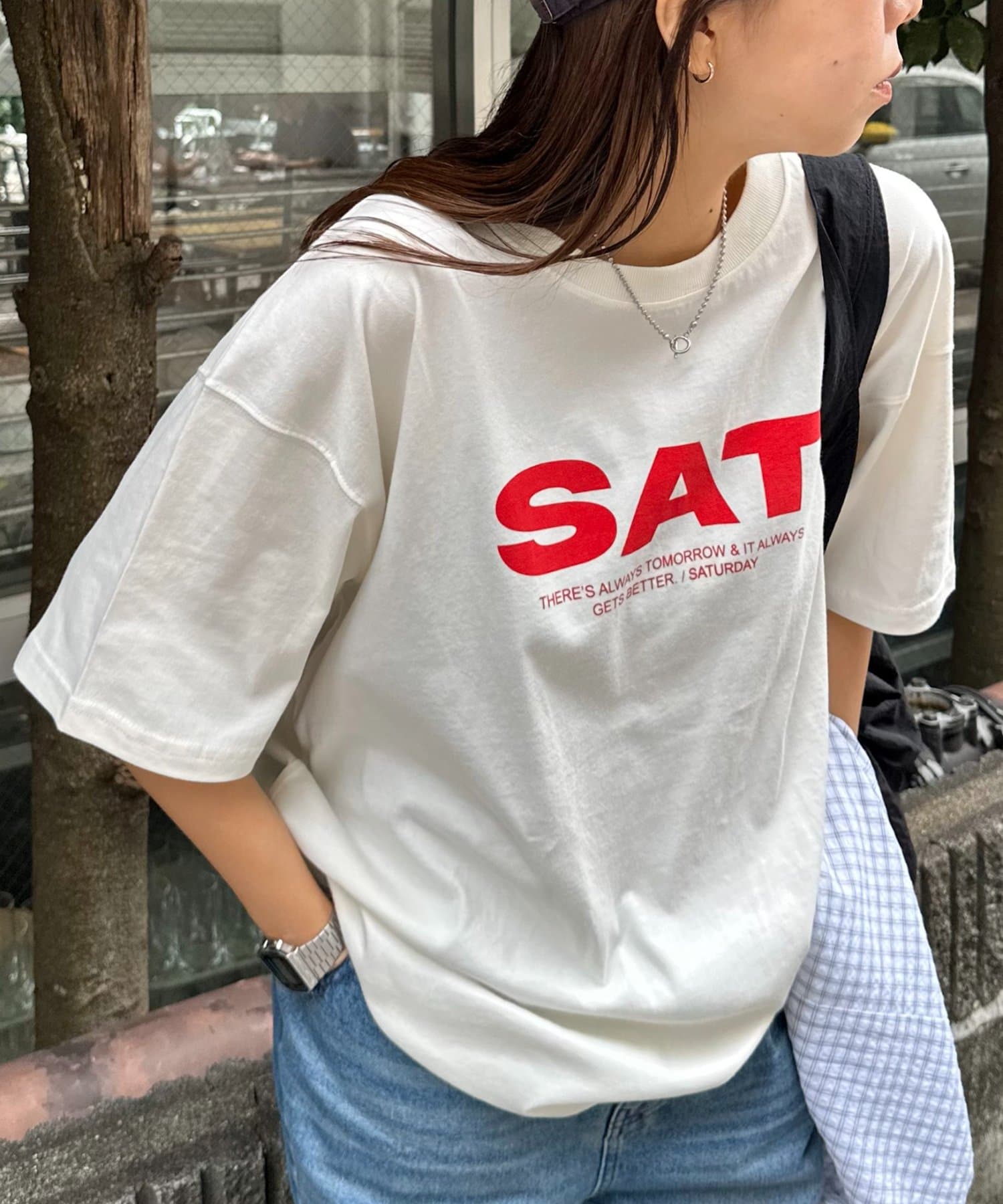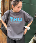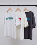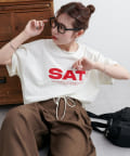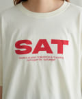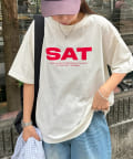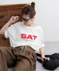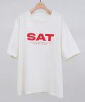 胸元に大きくプリントされた「SAT」「WED」「THU」の3文字ロゴは、シンプルながらも視線を引きつける大胆なデザインです。