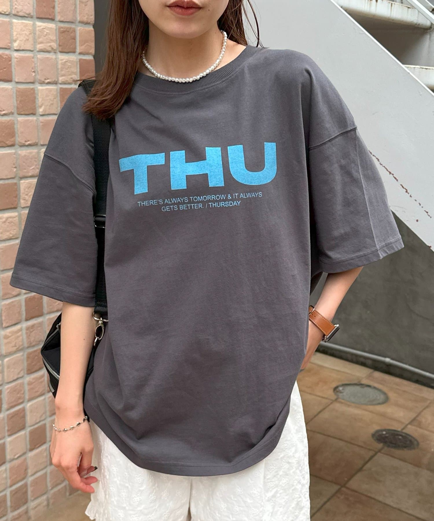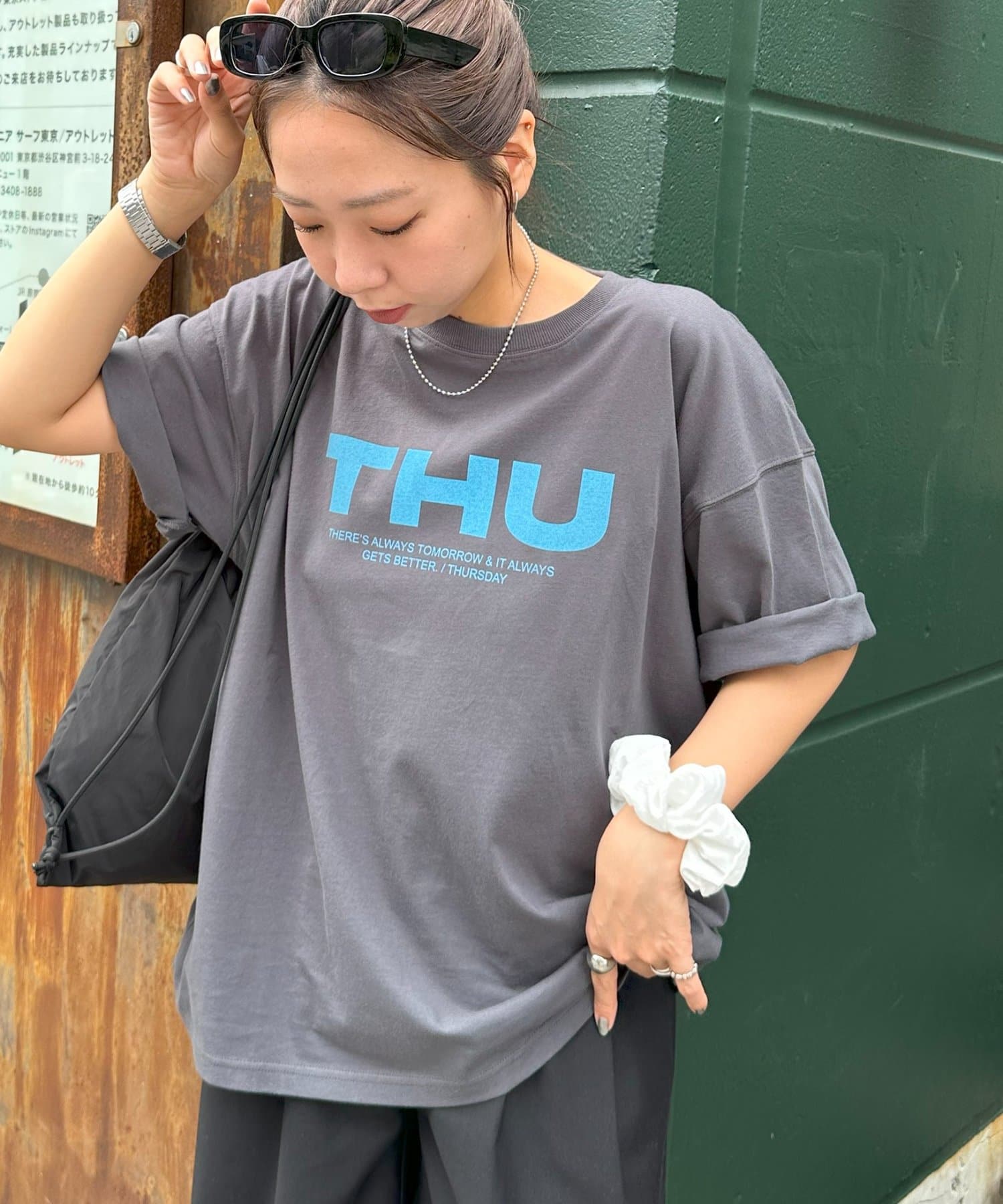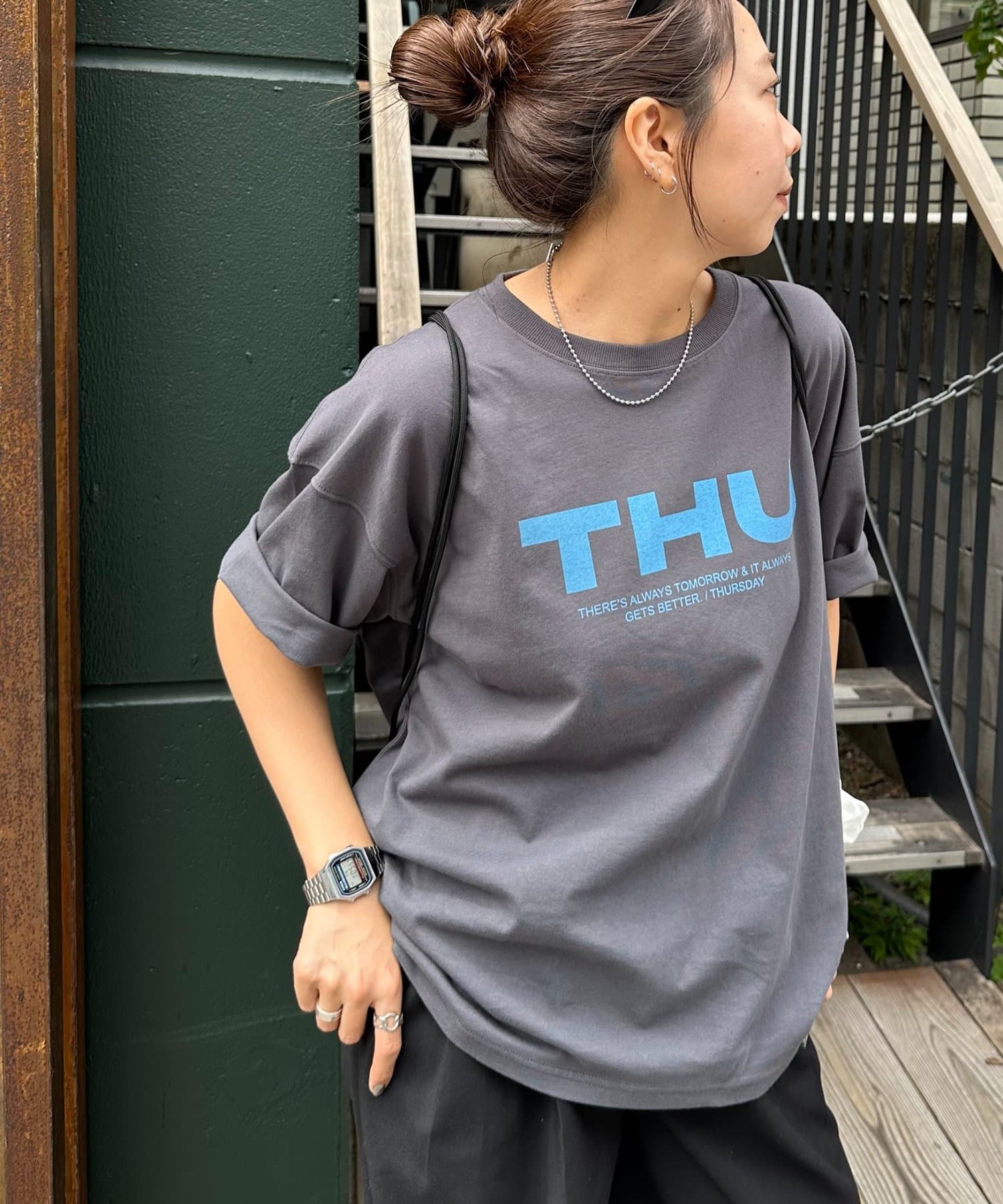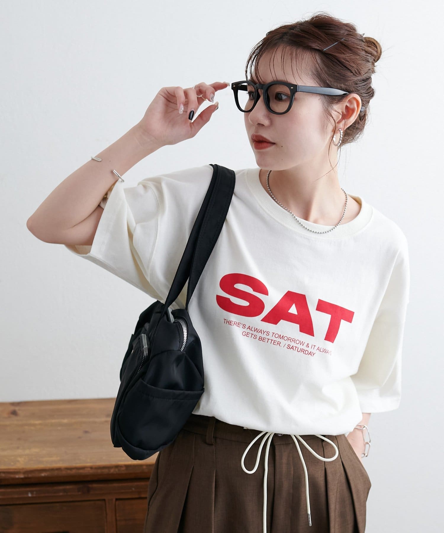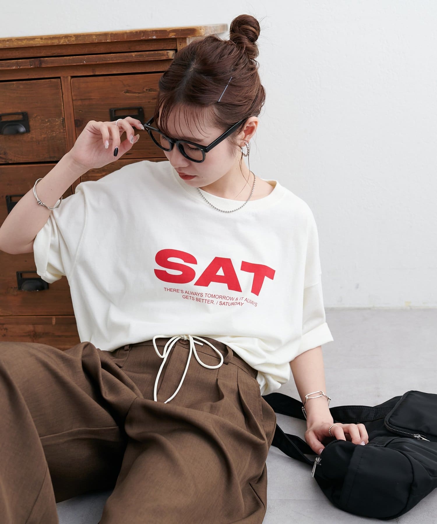 胸元に大きくプリントされた「SAT」「WED」「THU」の3文字ロゴは、シンプルながらも視線を引きつける大胆なデザインです。