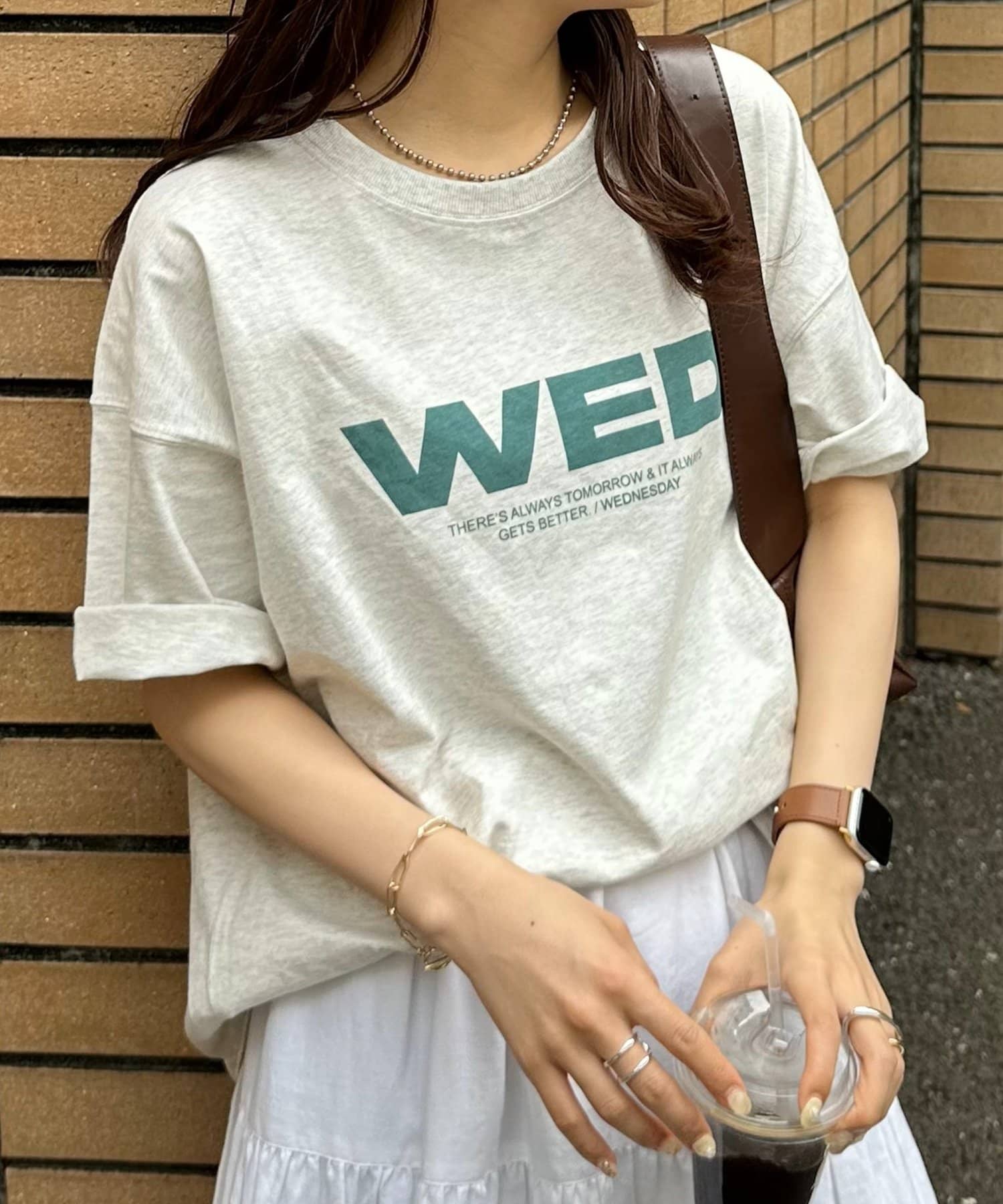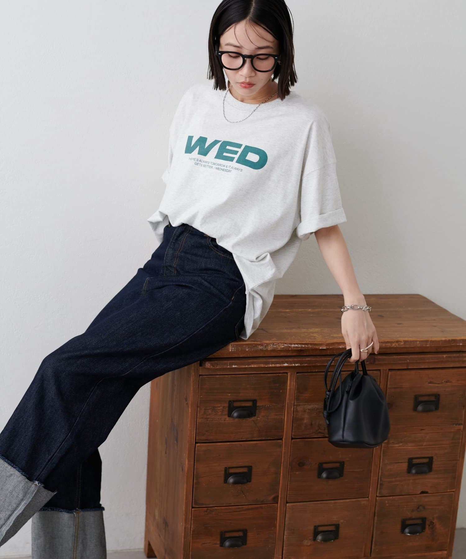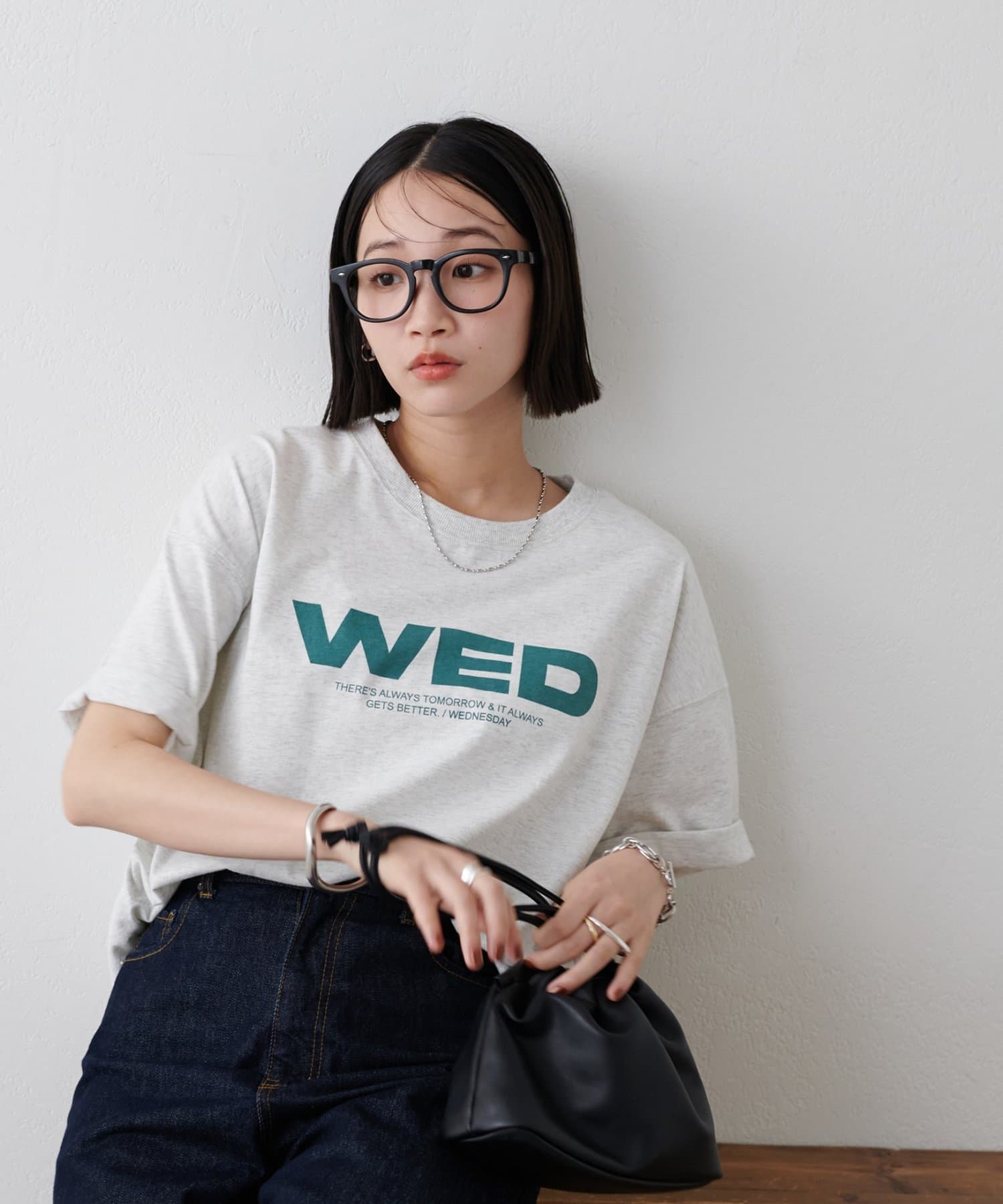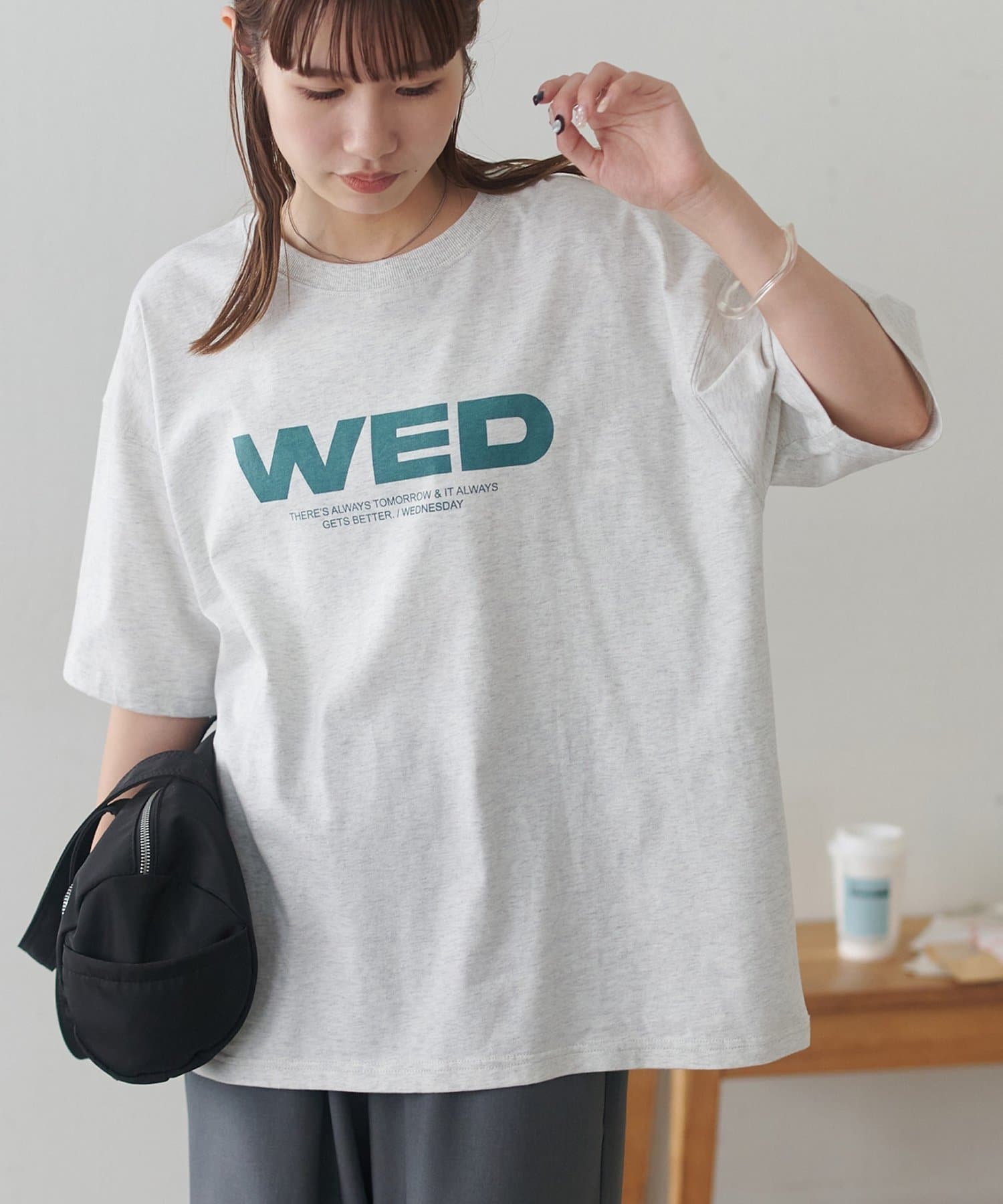 胸元に大きくプリントされた「SAT」「WED」「THU」の3文字ロゴは、シンプルながらも視線を引きつける大胆なデザインです。