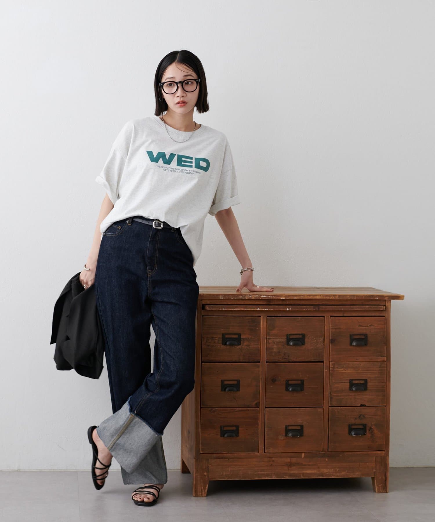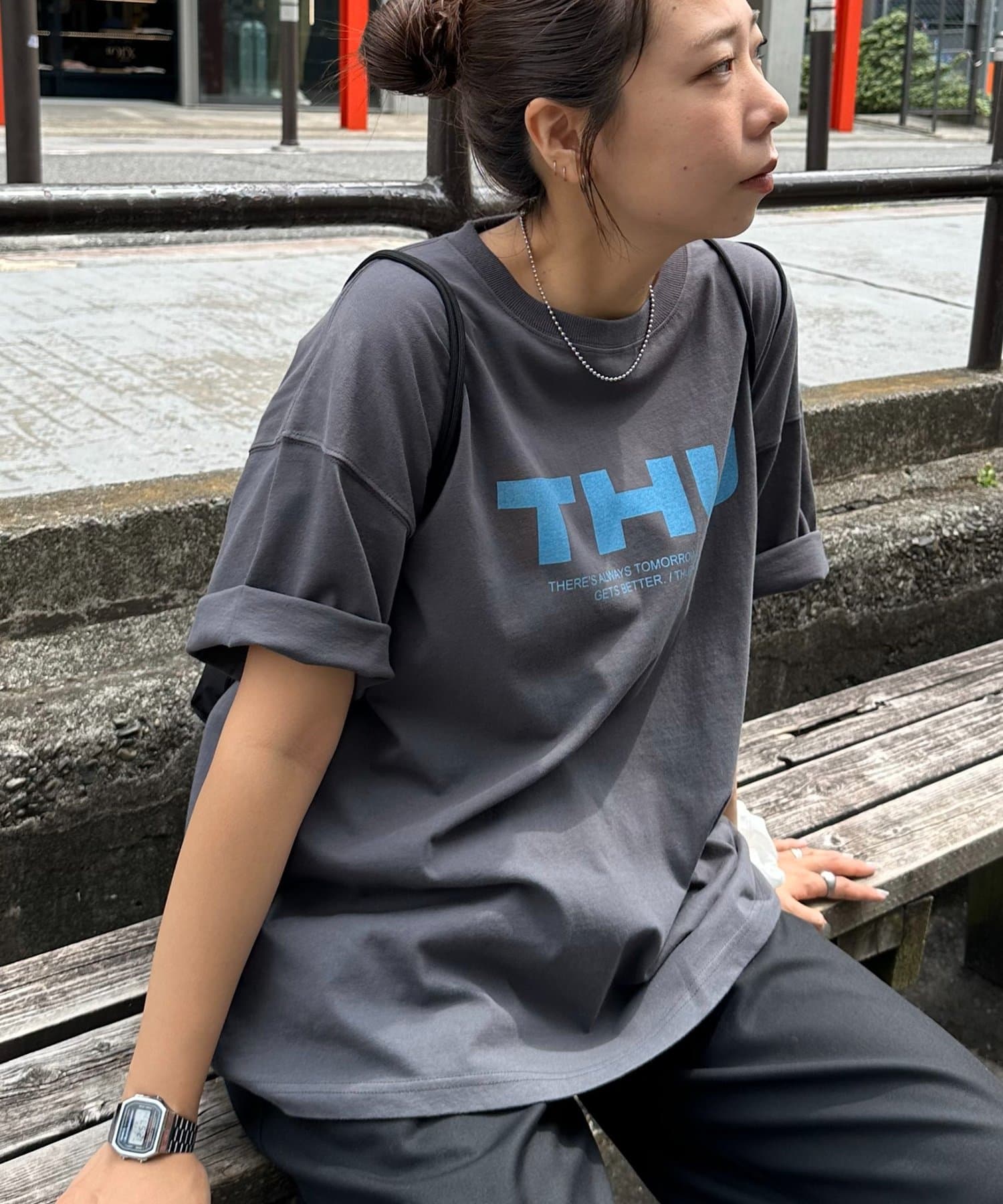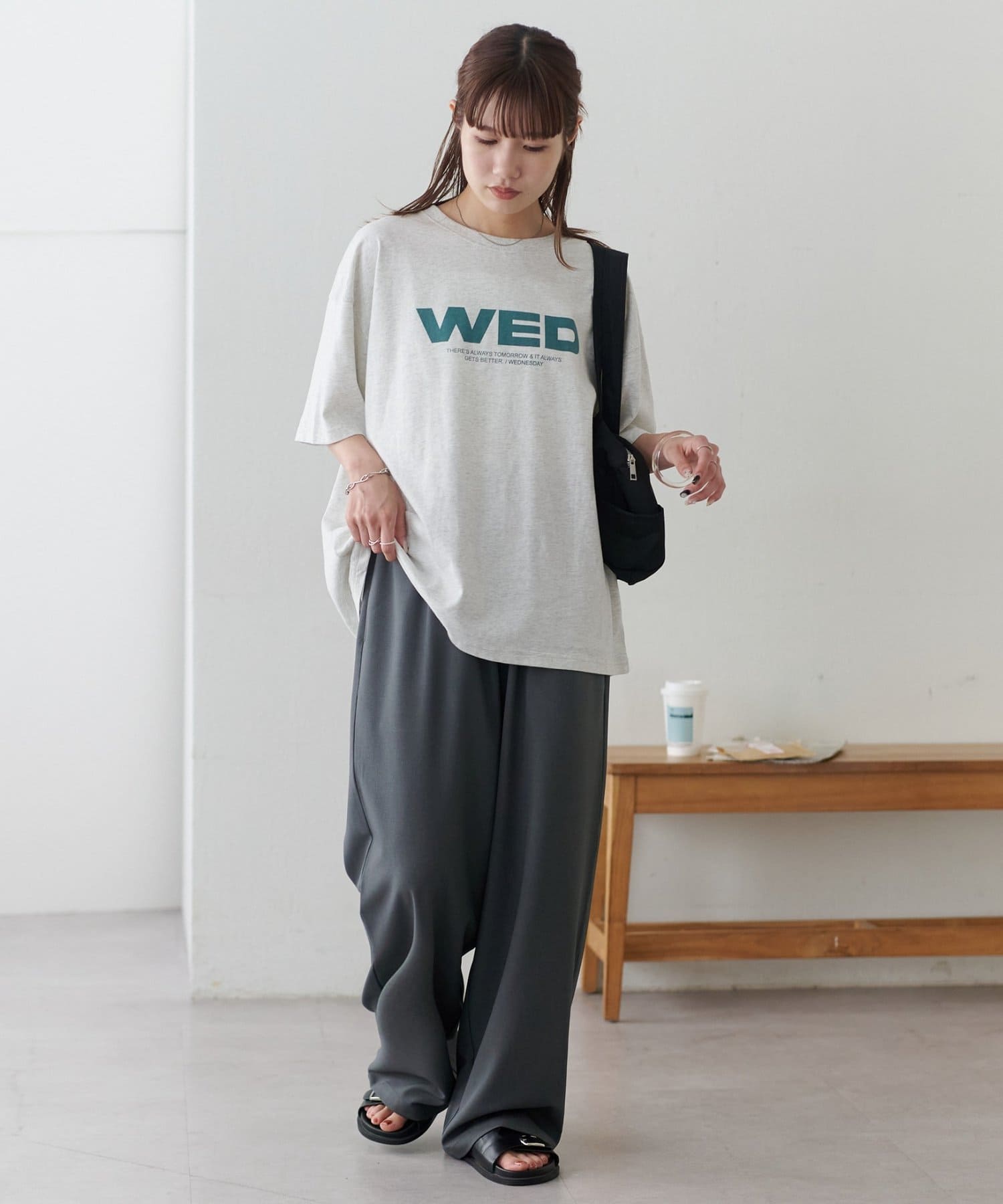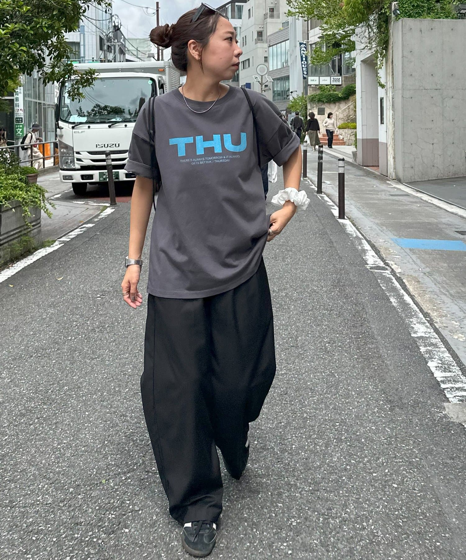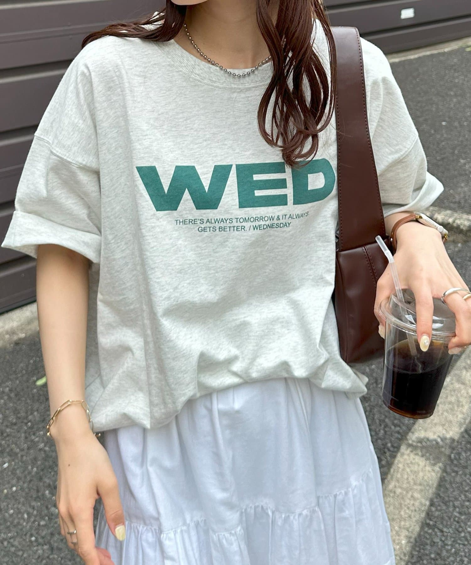 胸元に大きくプリントされた「SAT」「WED」「THU」の3文字ロゴは、シンプルながらも視線を引きつける大胆なデザインです。