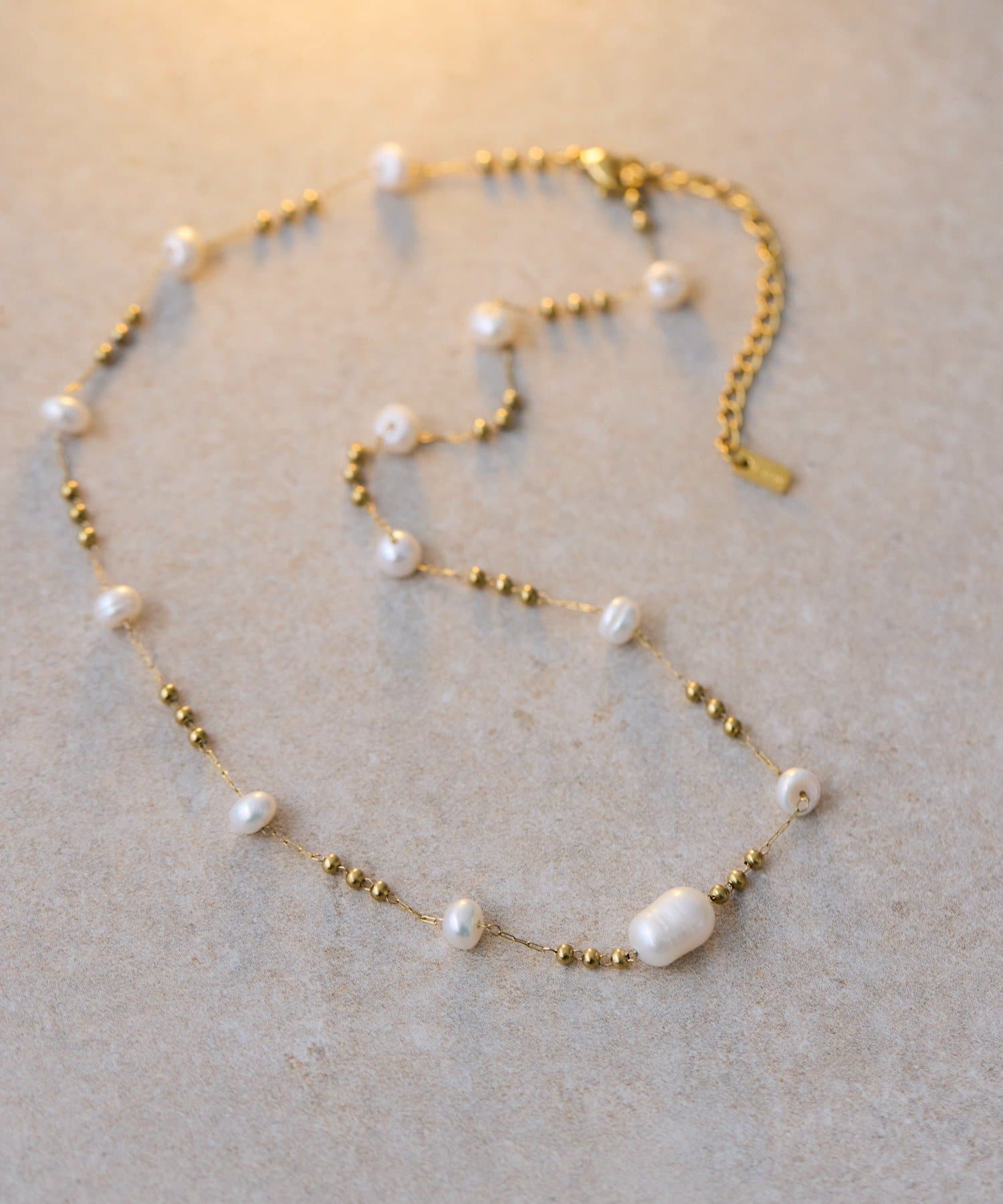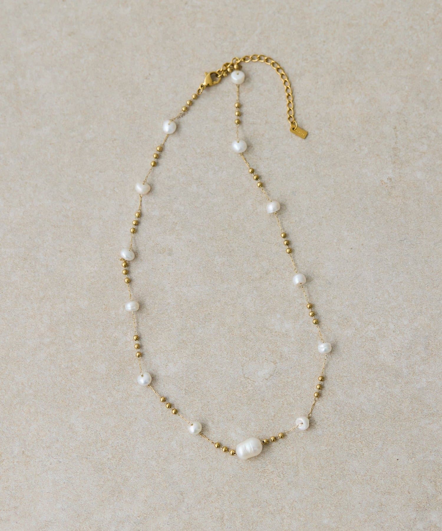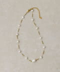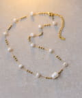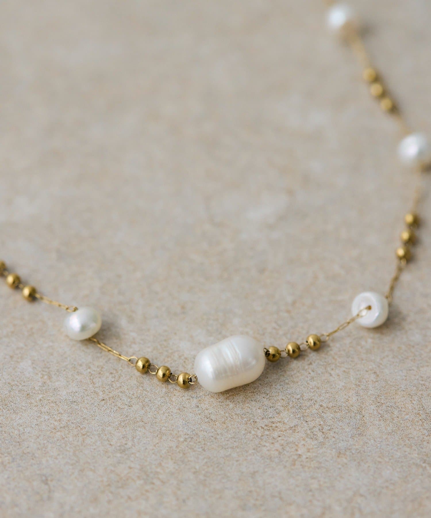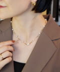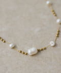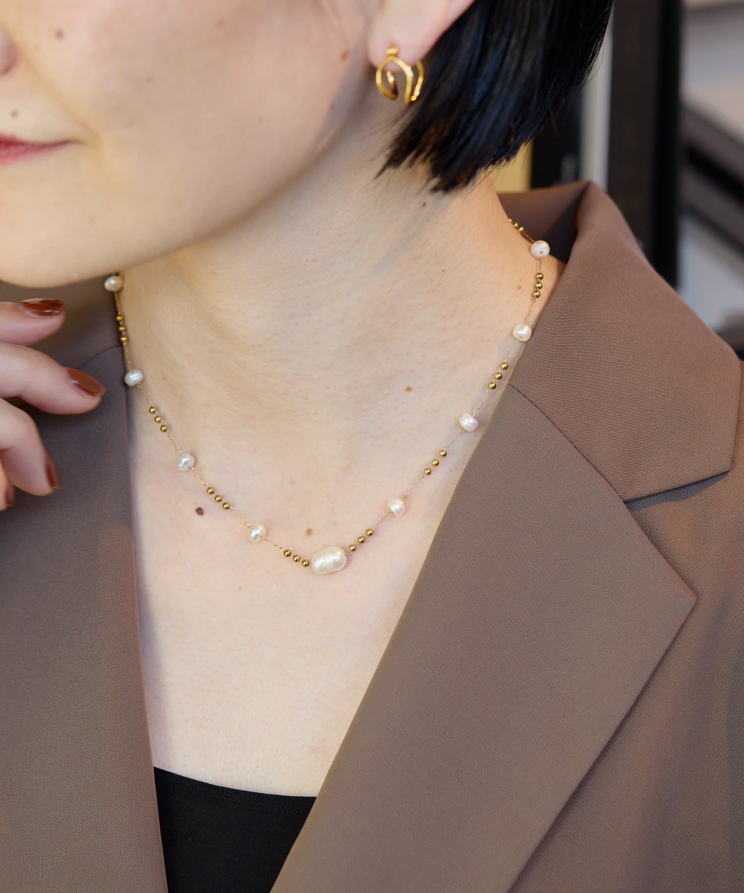 上品な淡水パールと、きらめくメタルボールの組み合わせが、胸元を華やかに彩ります。