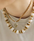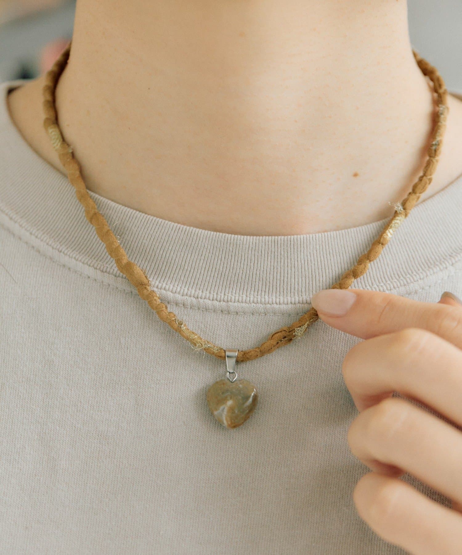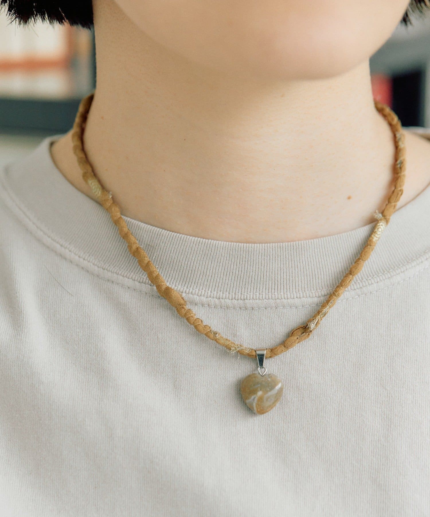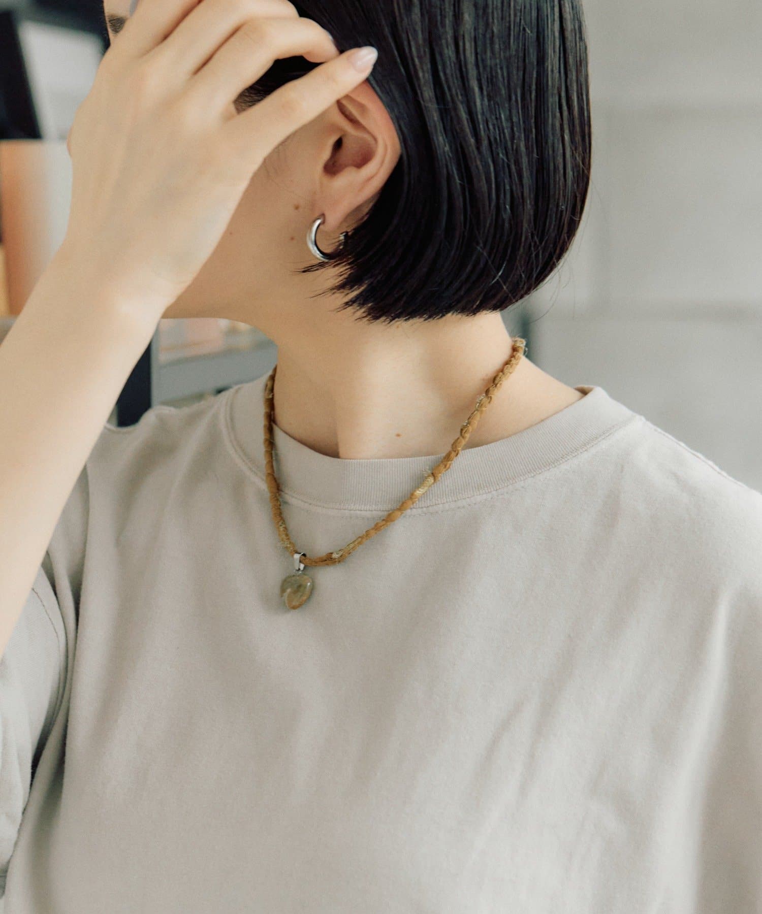 シルクコットンコードの風合いと、不規則な柄が魅力のクレイジーアゲートが、胸元に個性をプラスします。