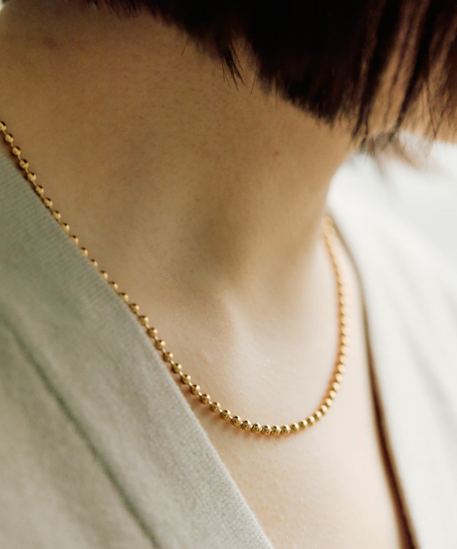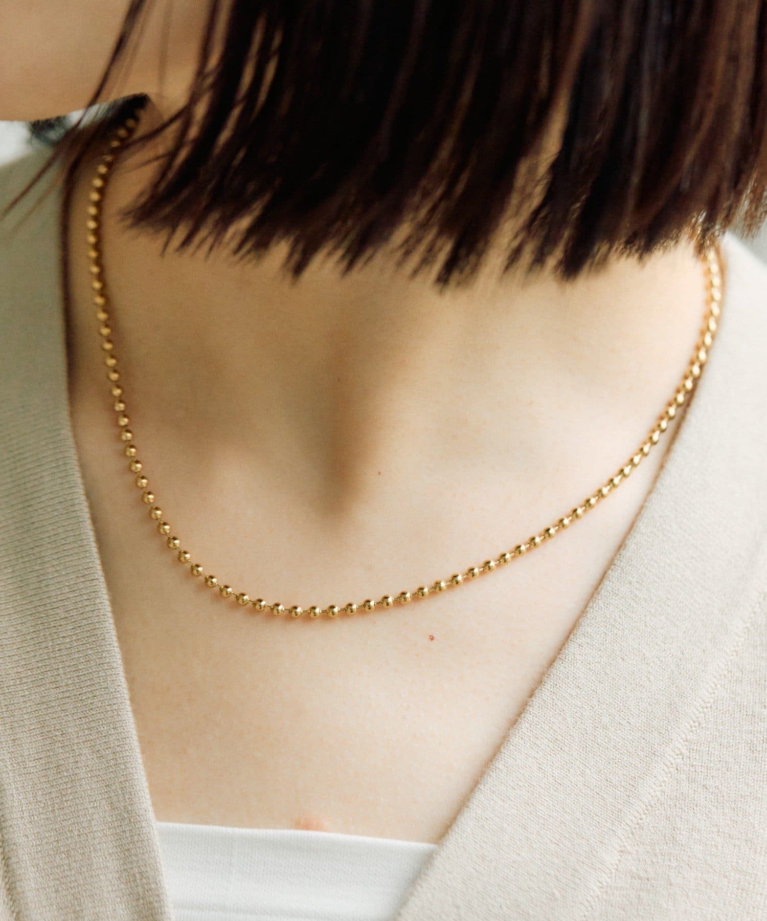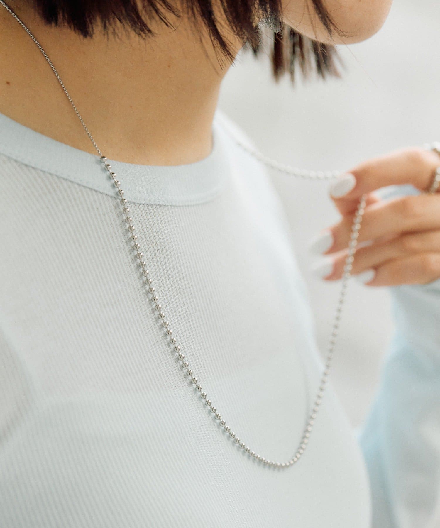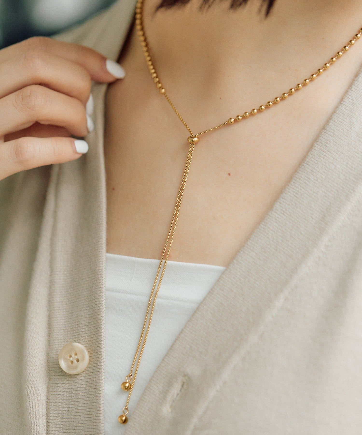 ボールチェーンと繊細なチェーンの組み合わせが、洗練された印象を与えるスライドネックレスです。