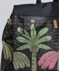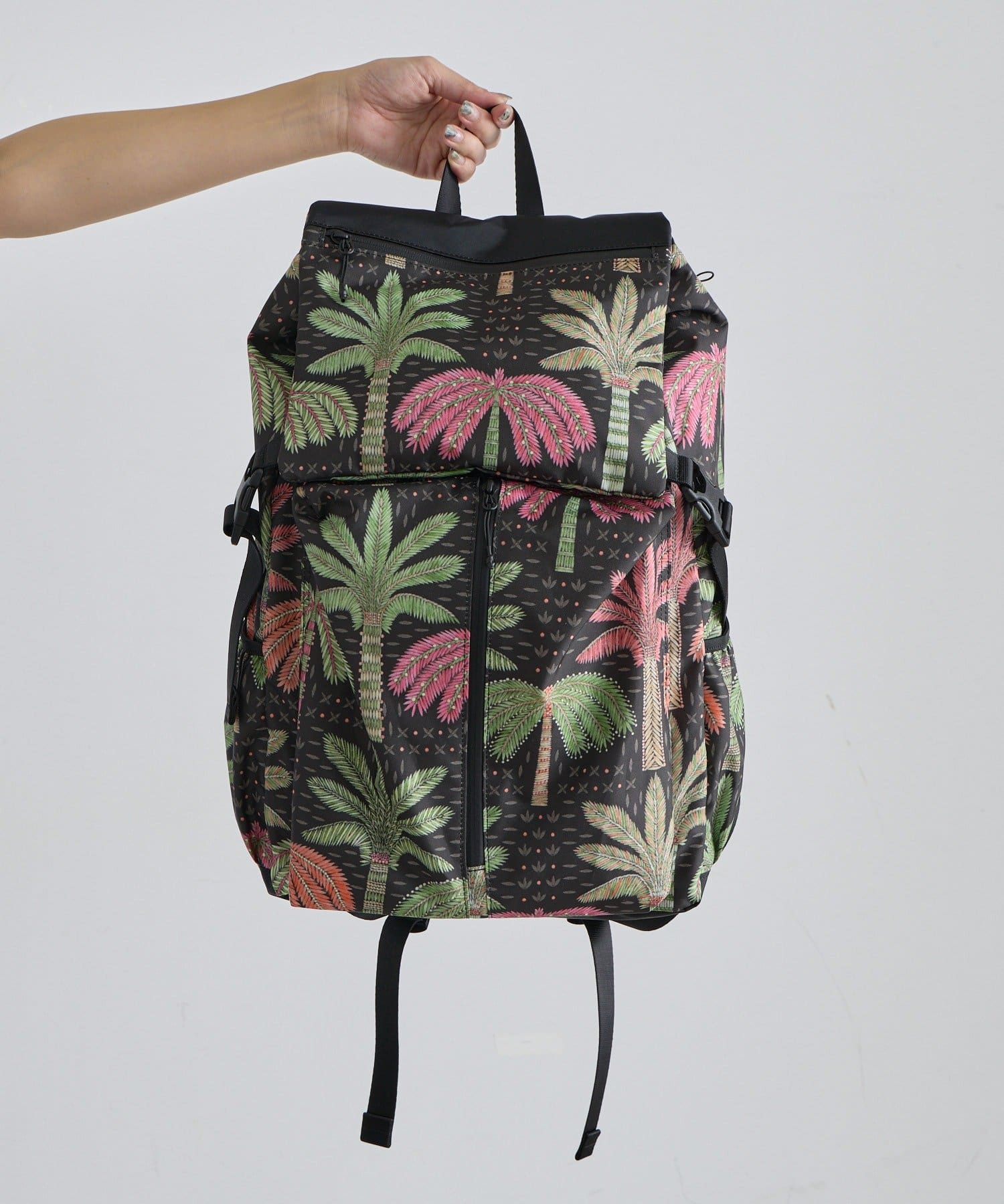 ピンクとグリーンの配色が効いた個性的なヤシの木柄リュック。