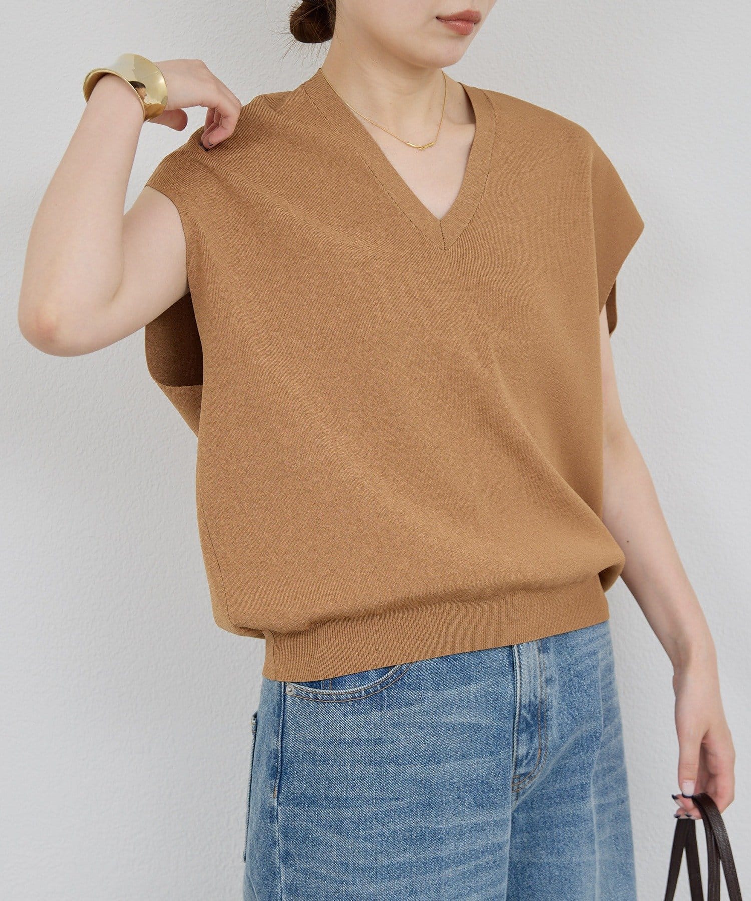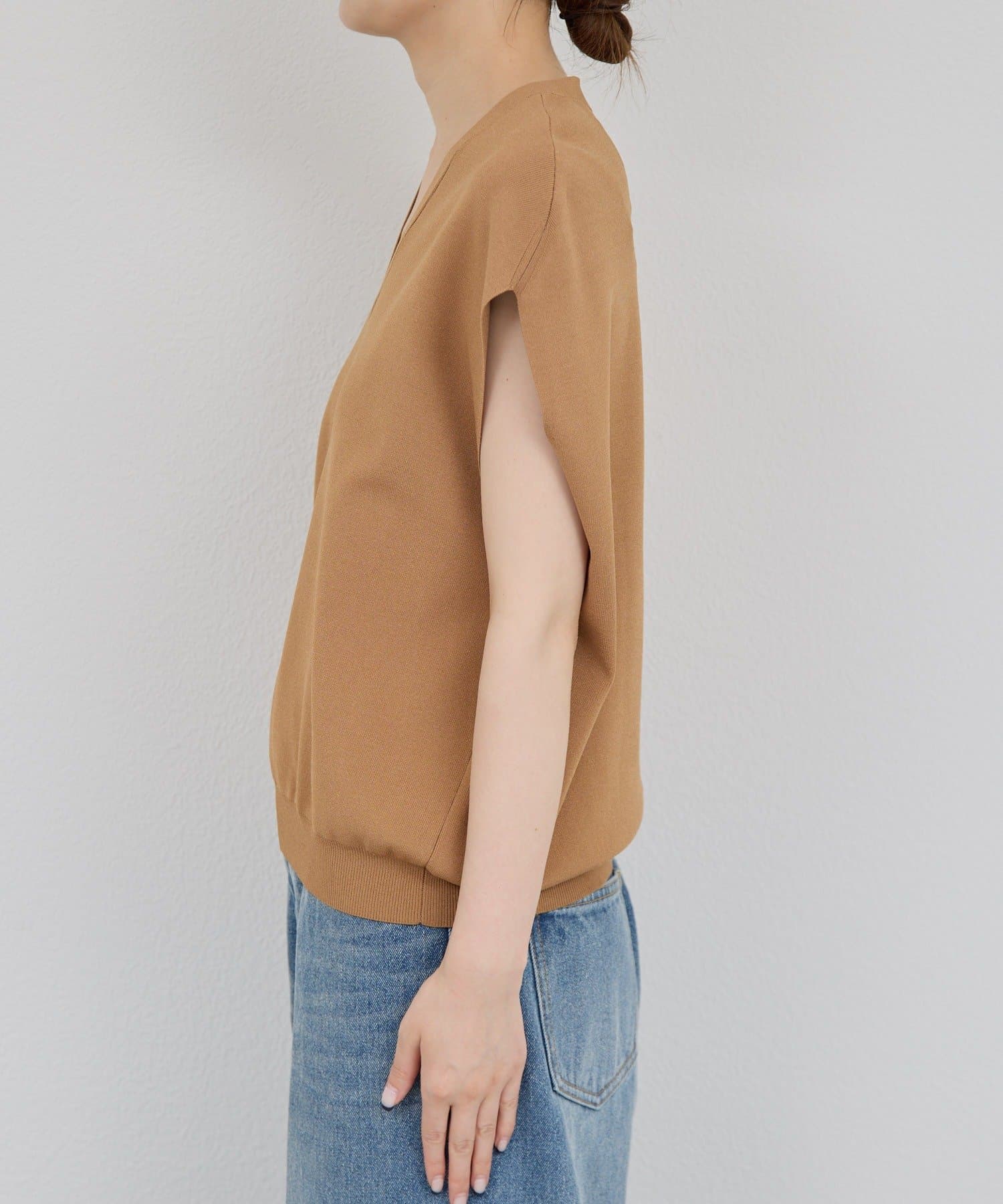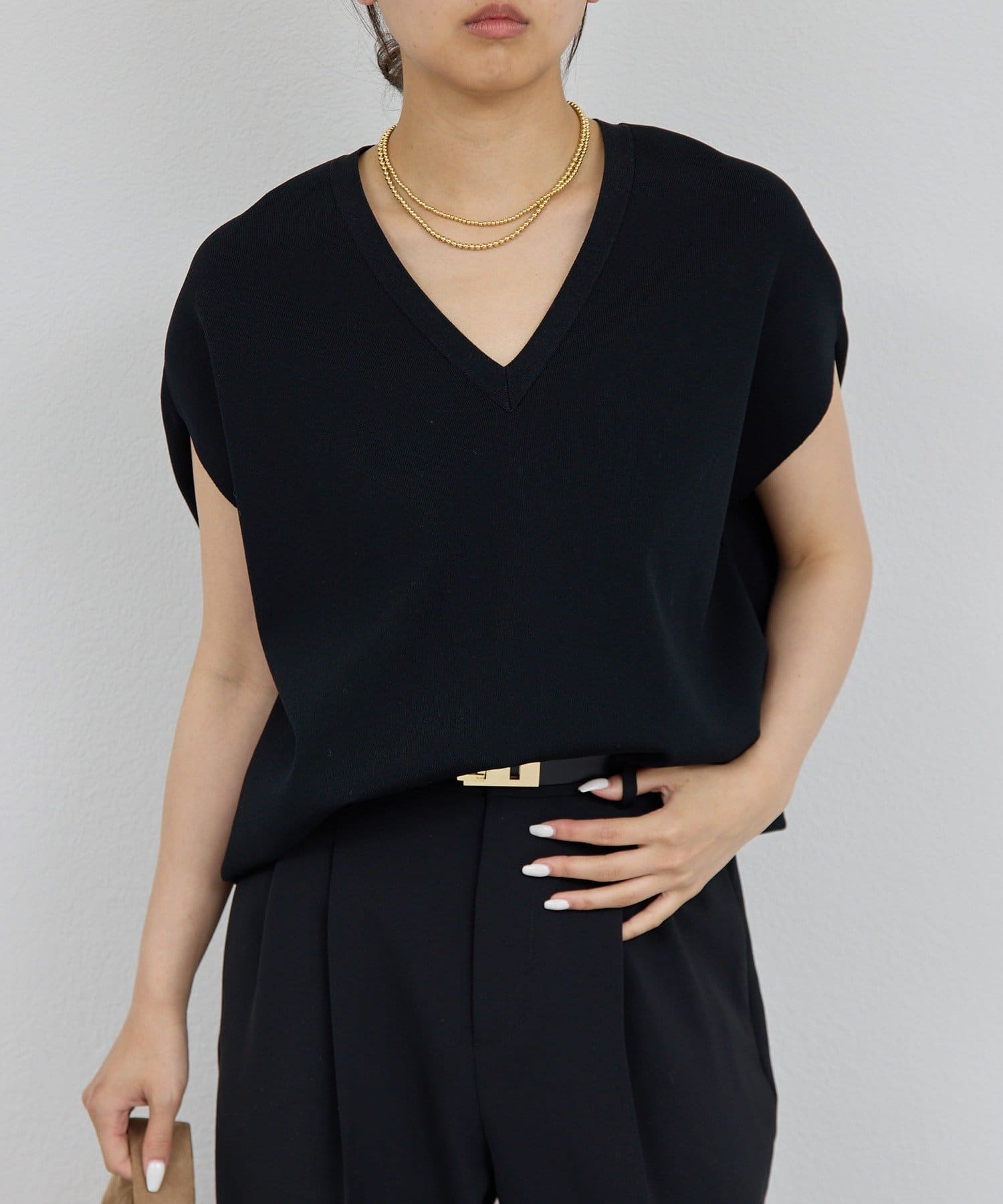 程よいVネックとフレンチスリーブで首元も二の腕もすっきり華奢見え!