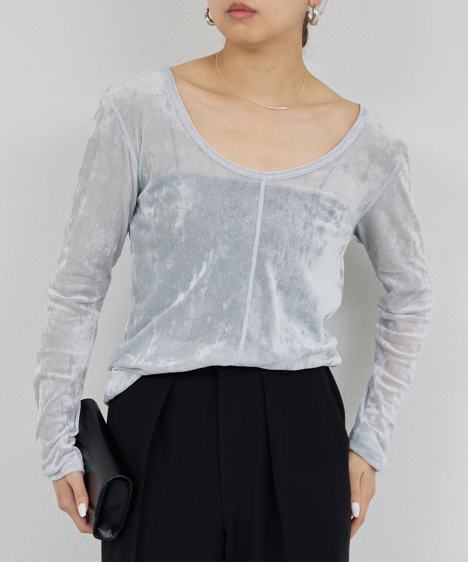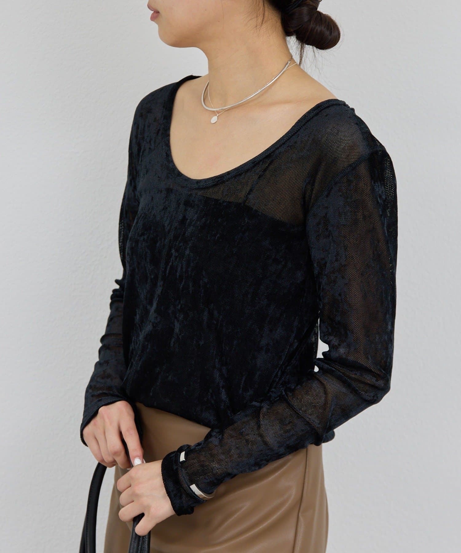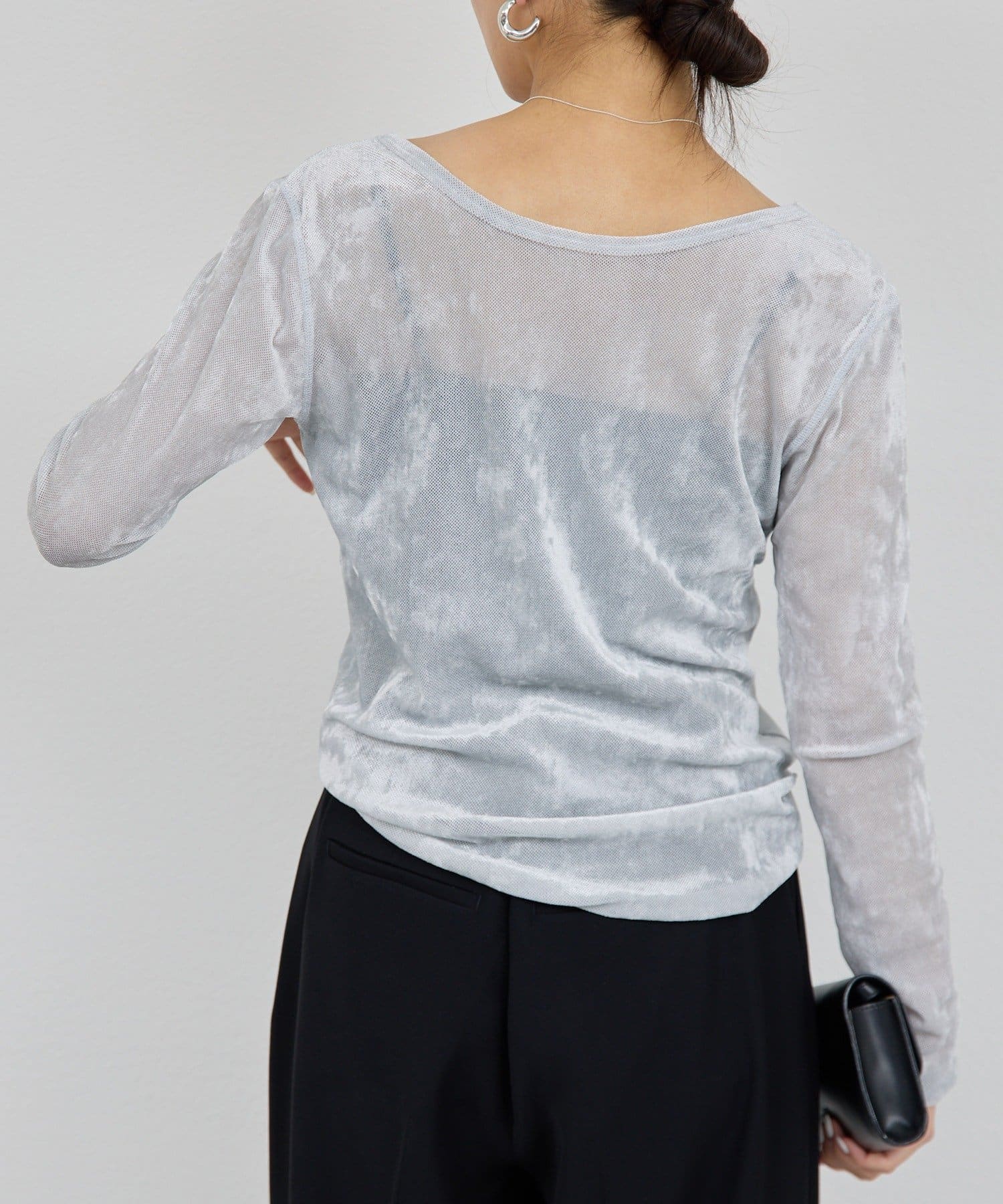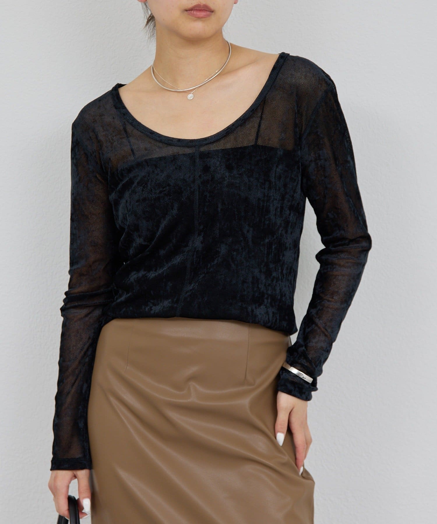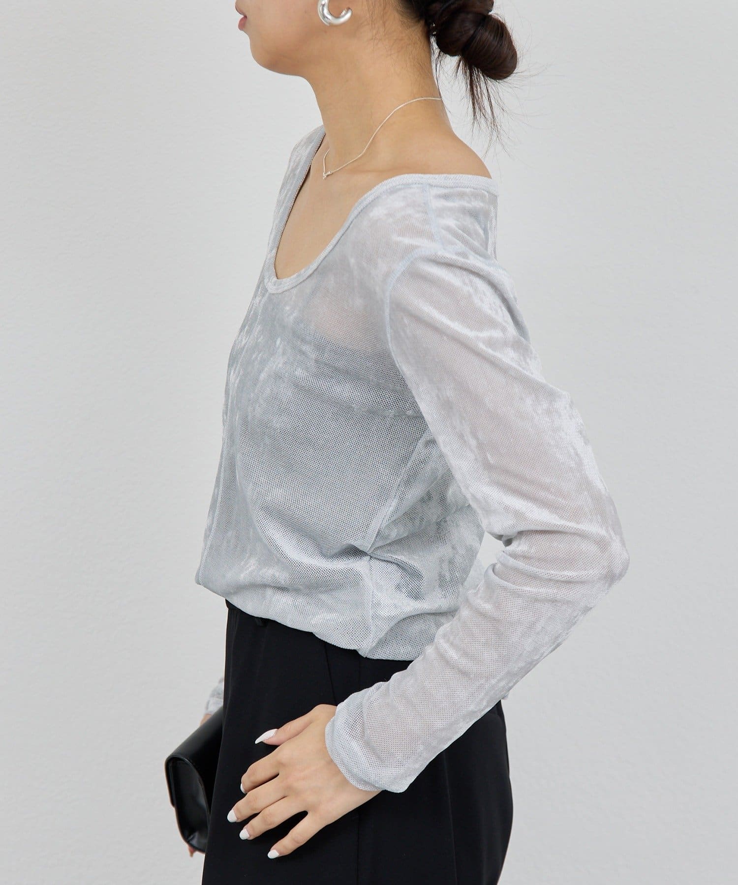 ●ベロアのような光沢と、メッシュの涼しさを併せ持つ秋見えトップス。