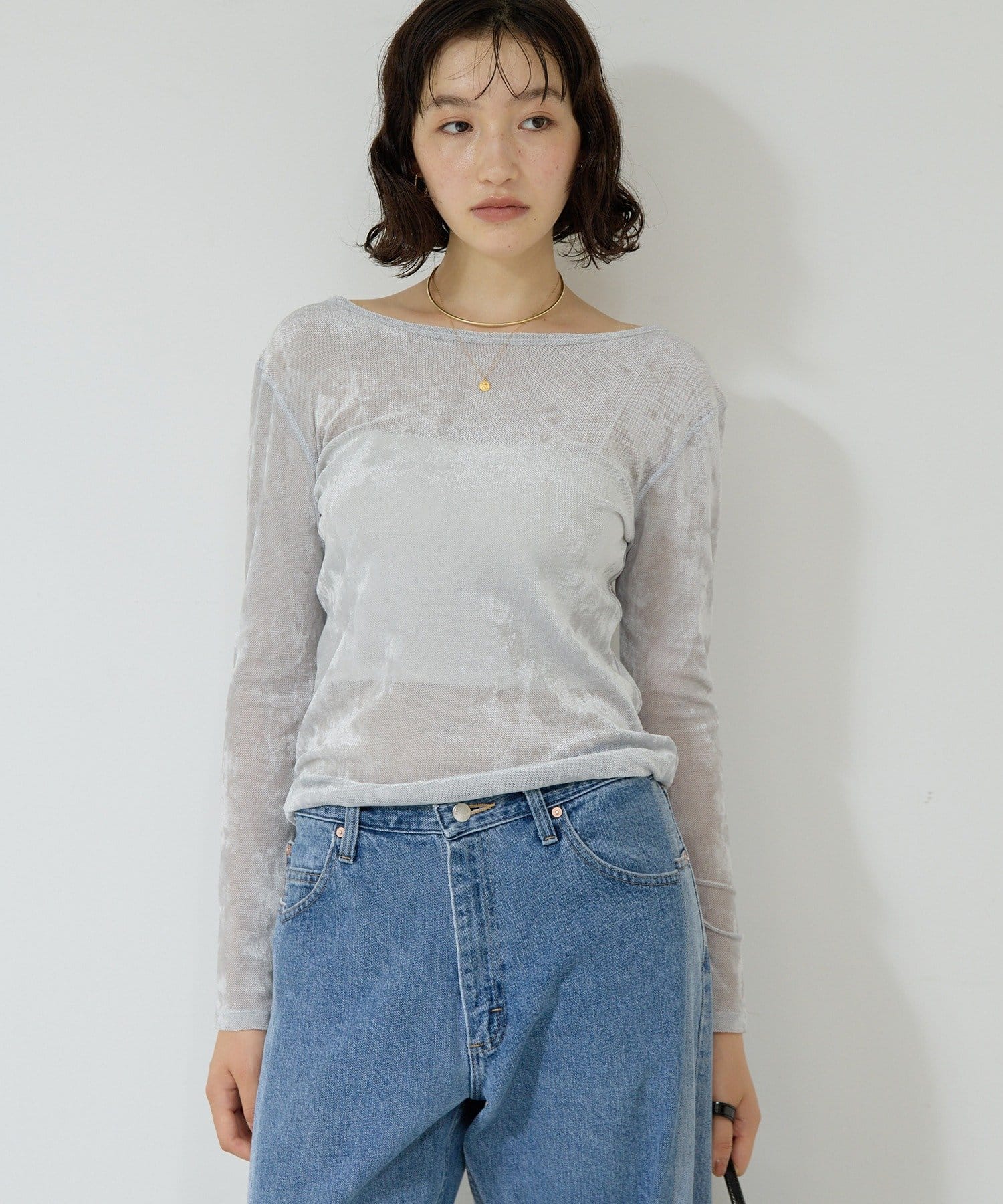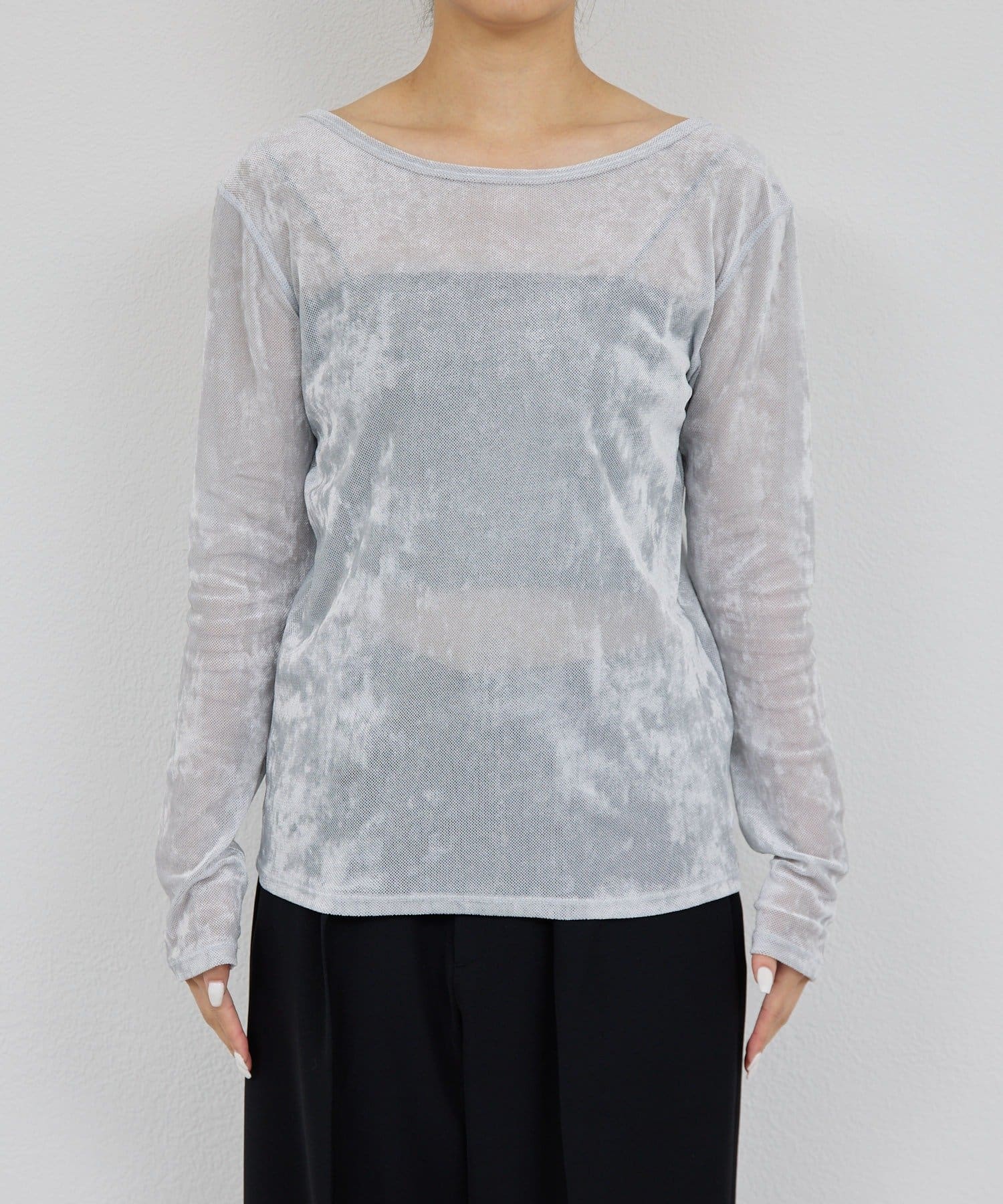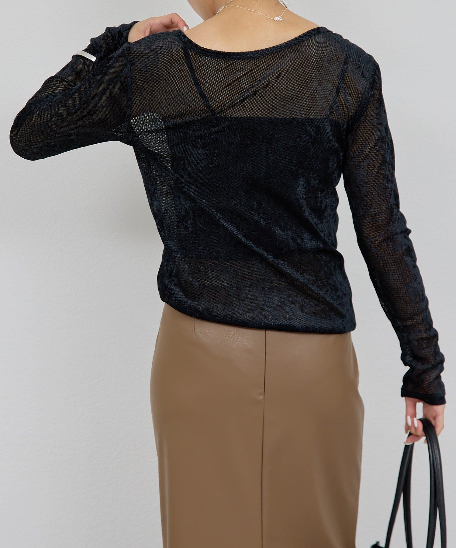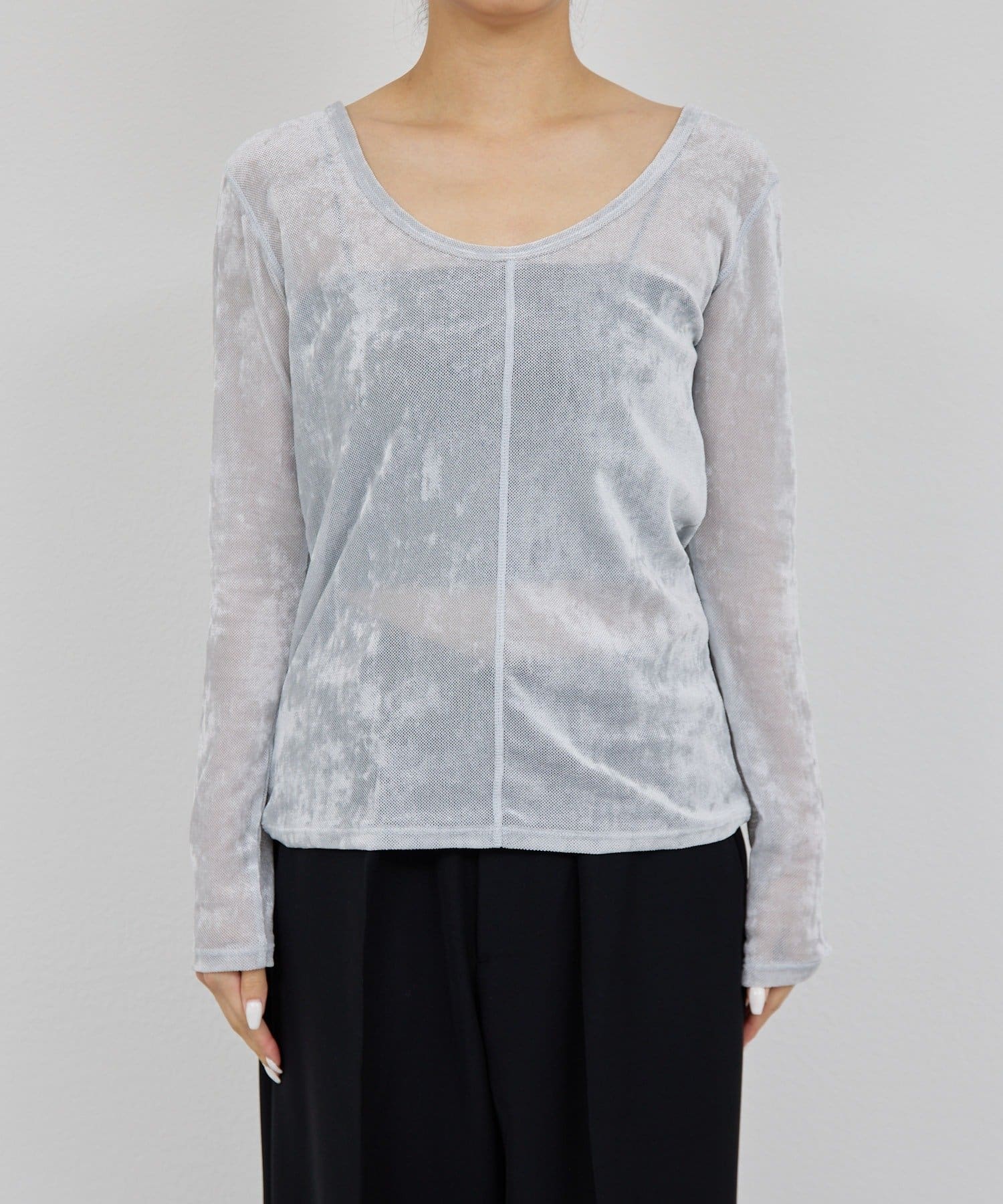 ●ベロアのような光沢と、メッシュの涼しさを併せ持つ秋見えトップス。