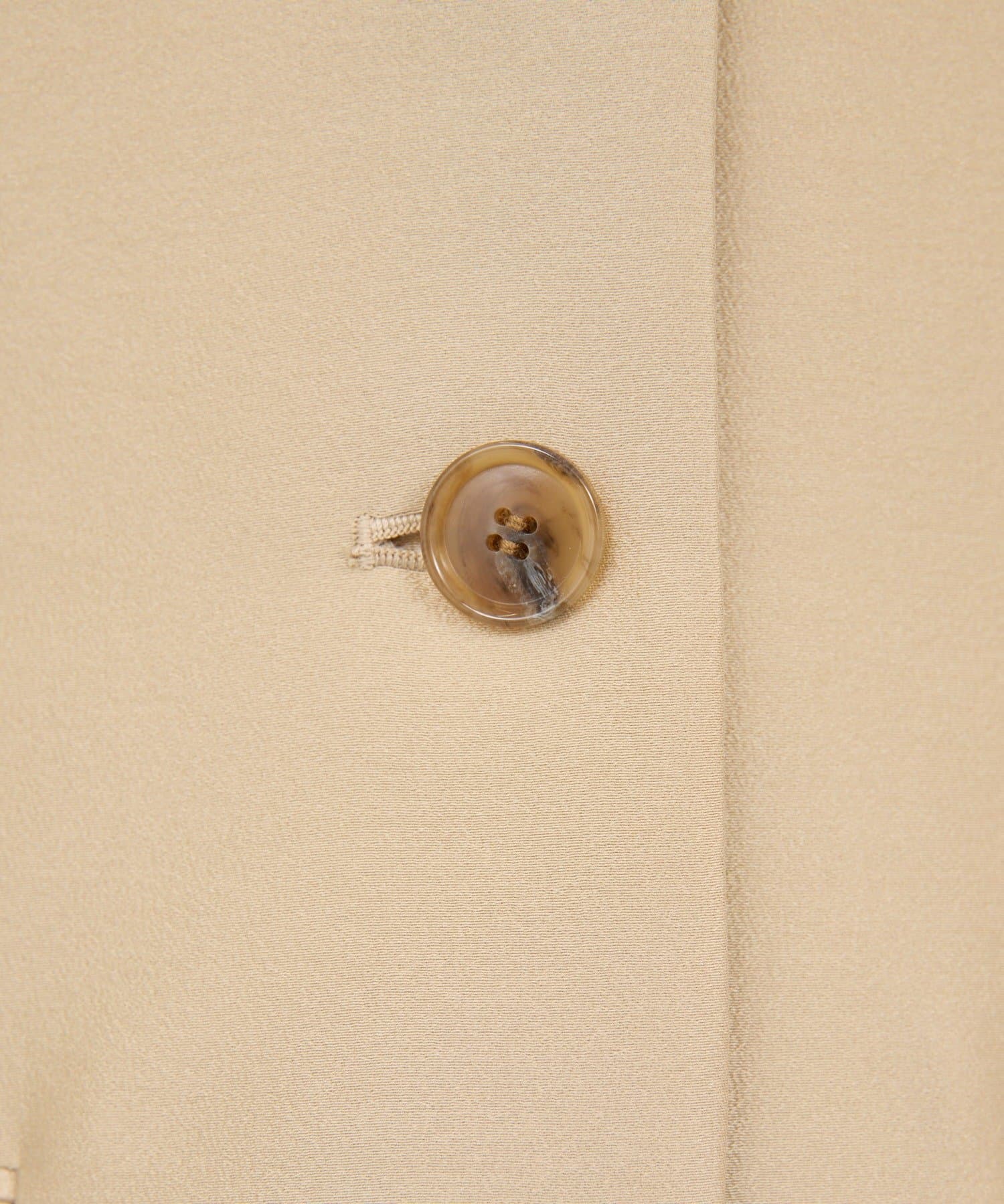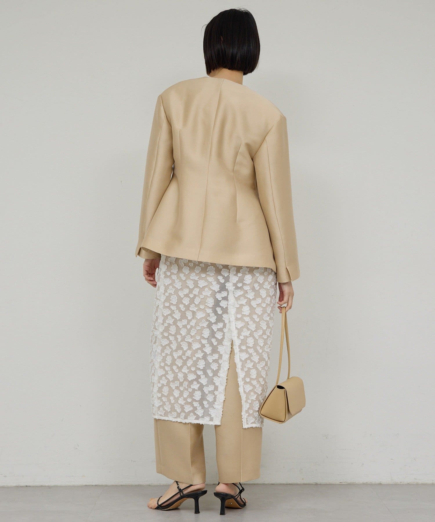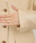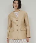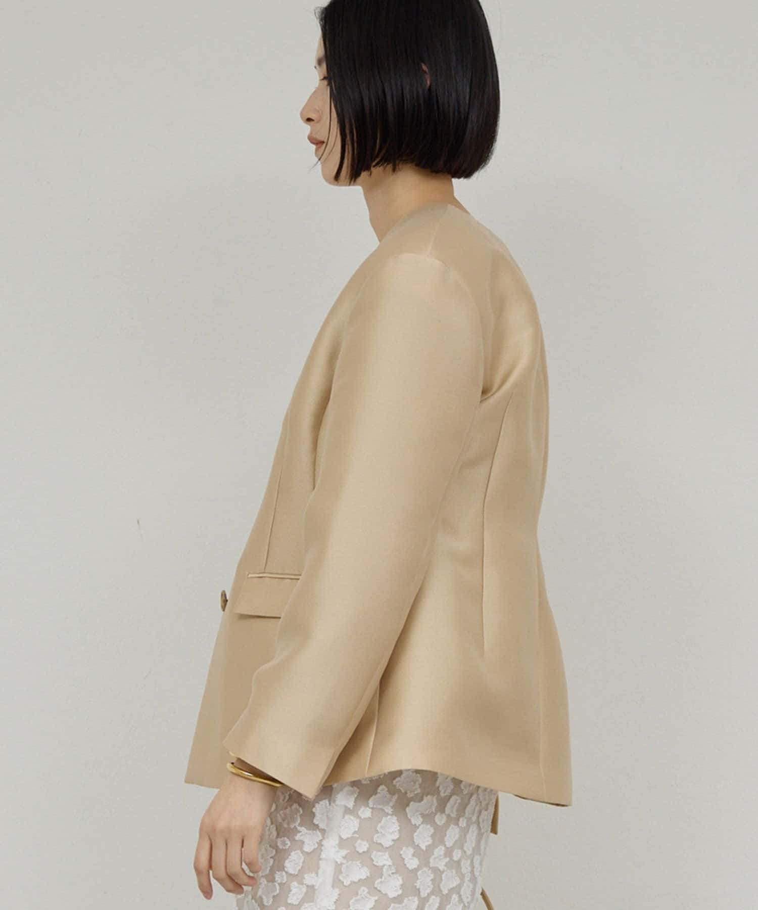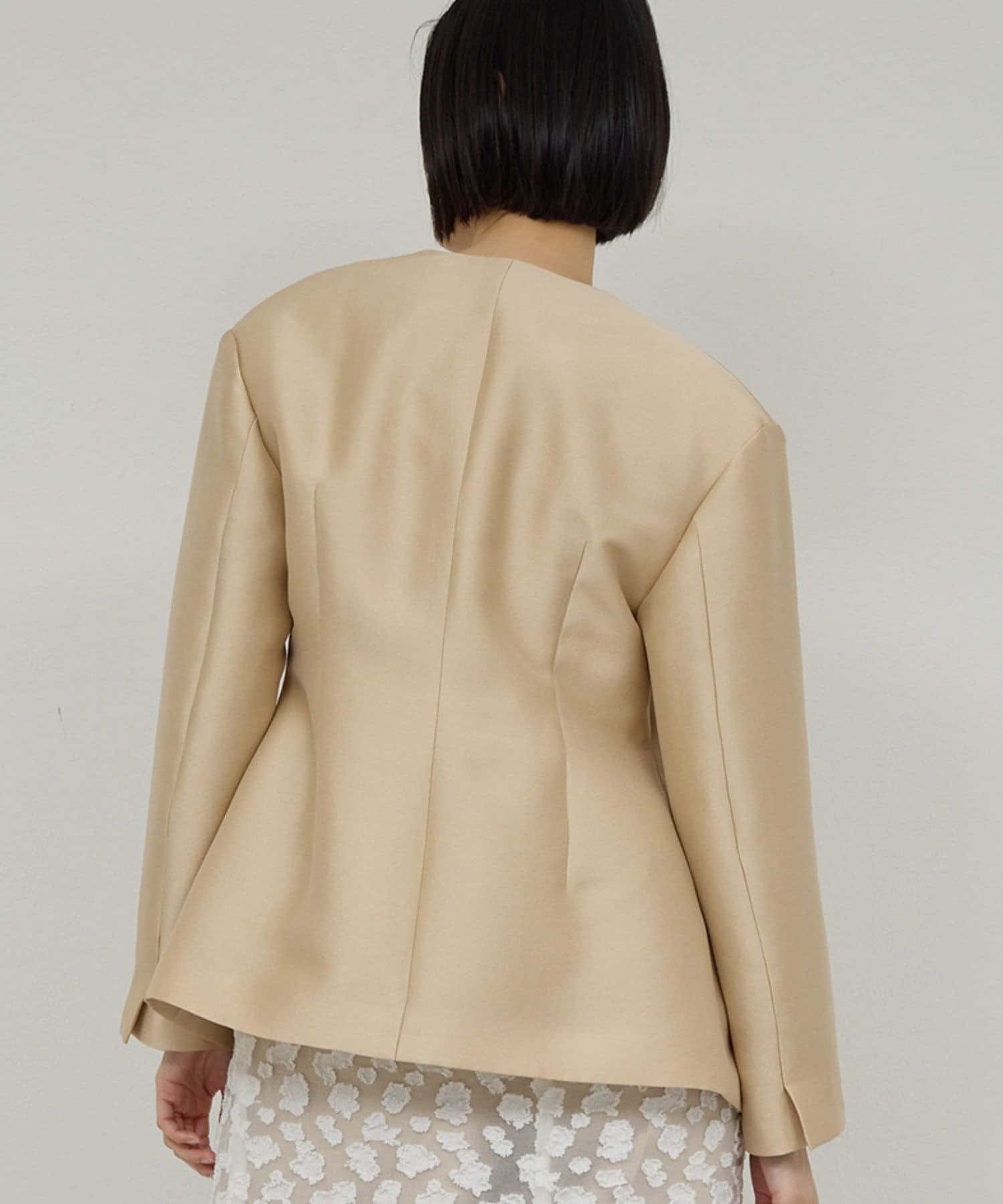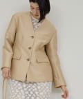 ●女性らしさを感じさせる、艶素材が魅惑的なジャケット。