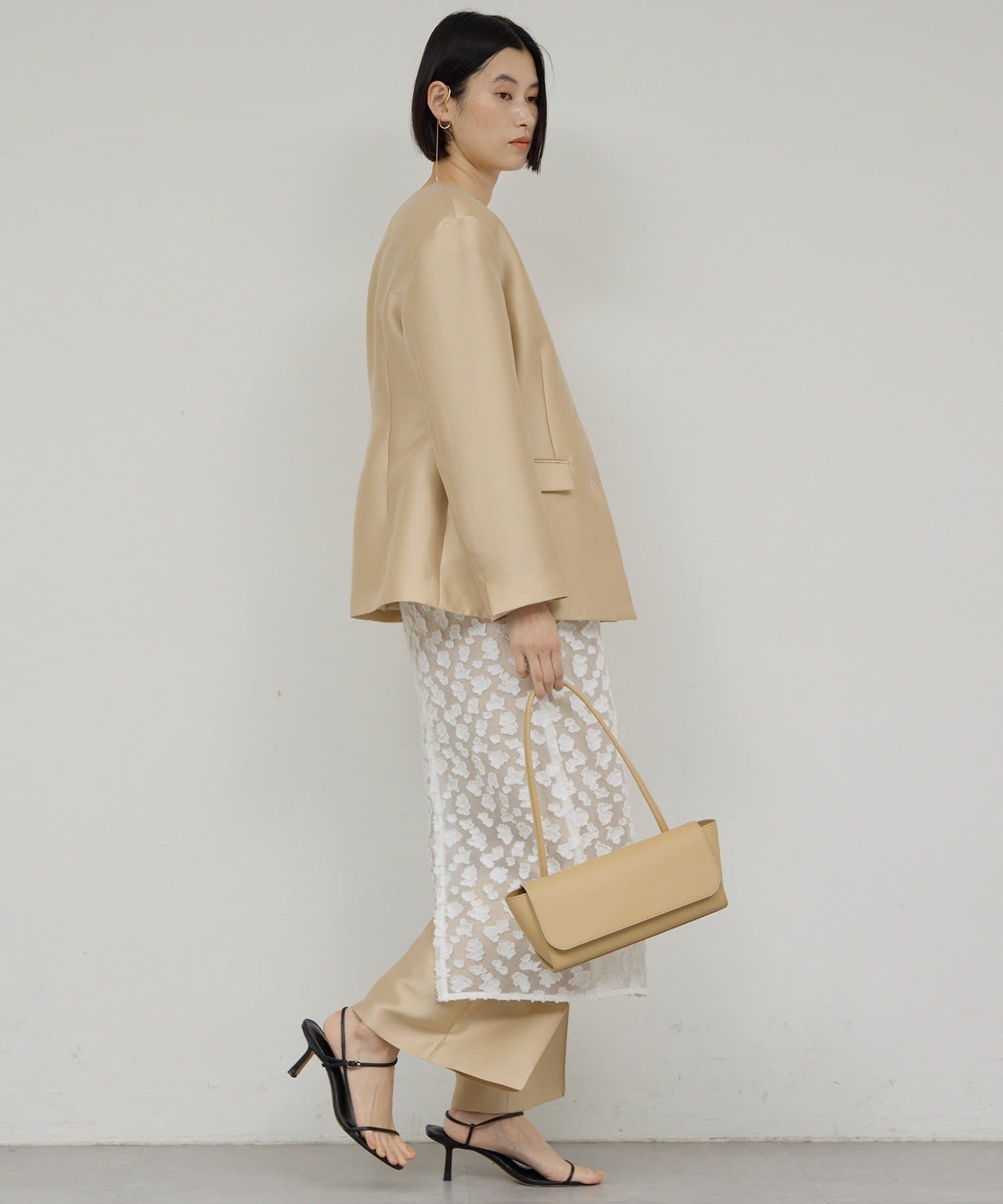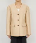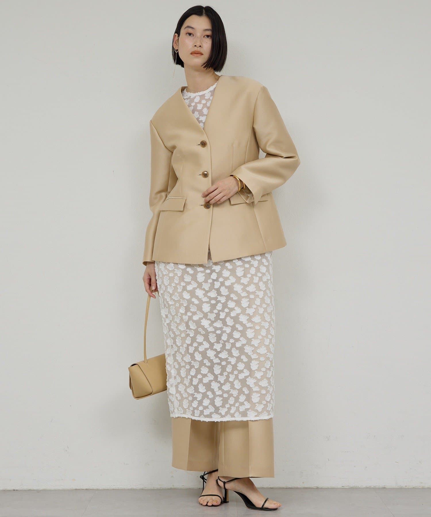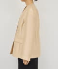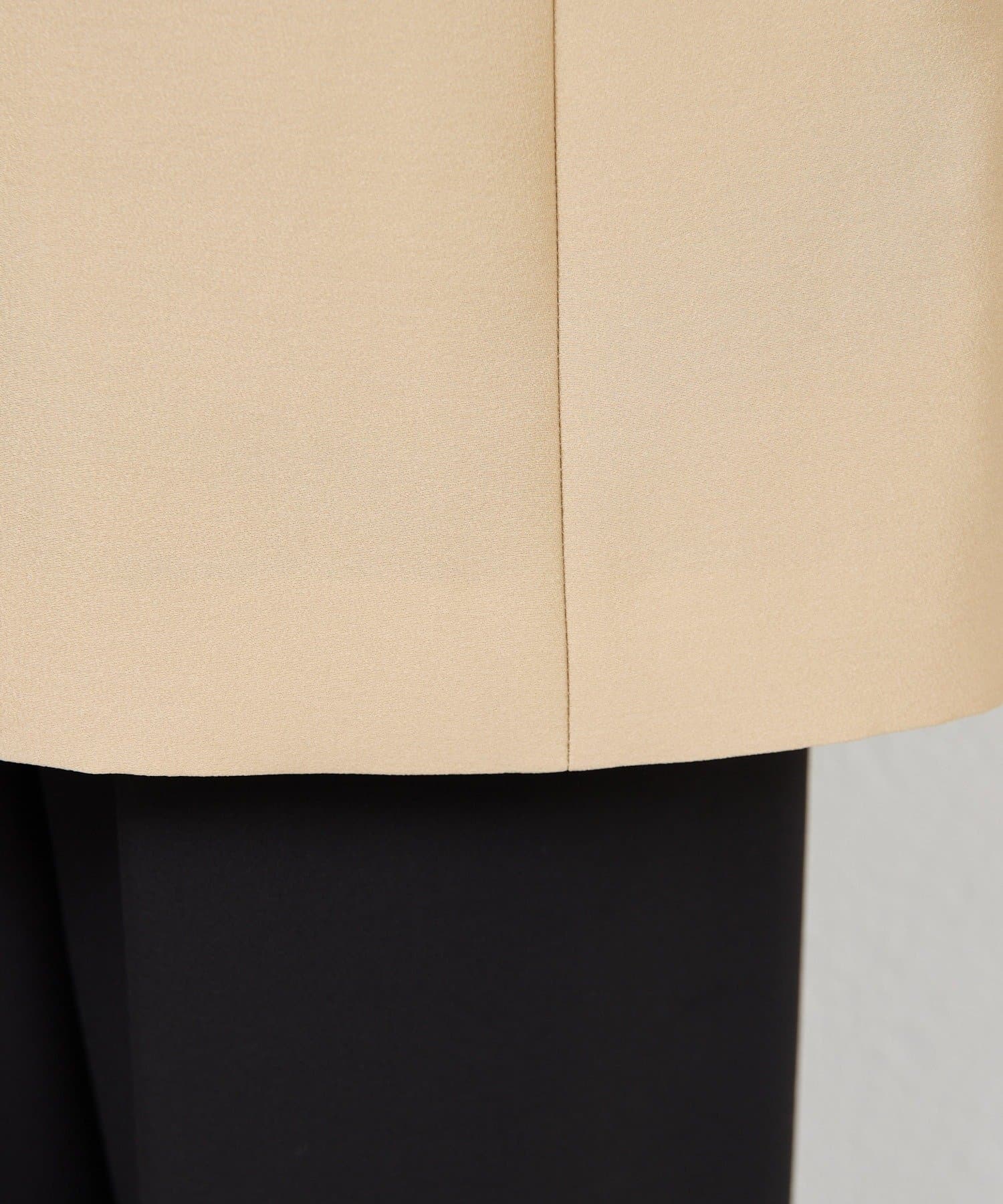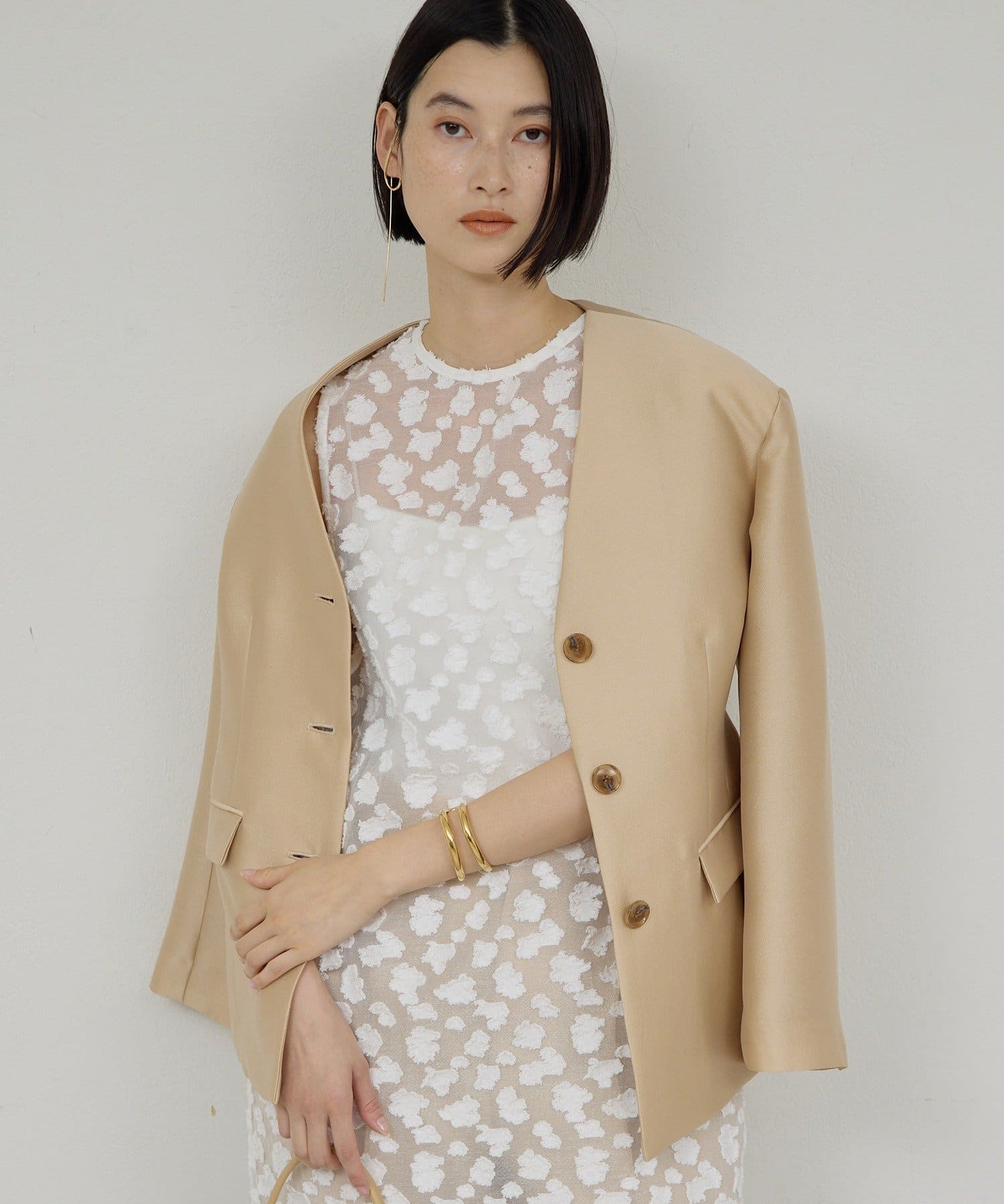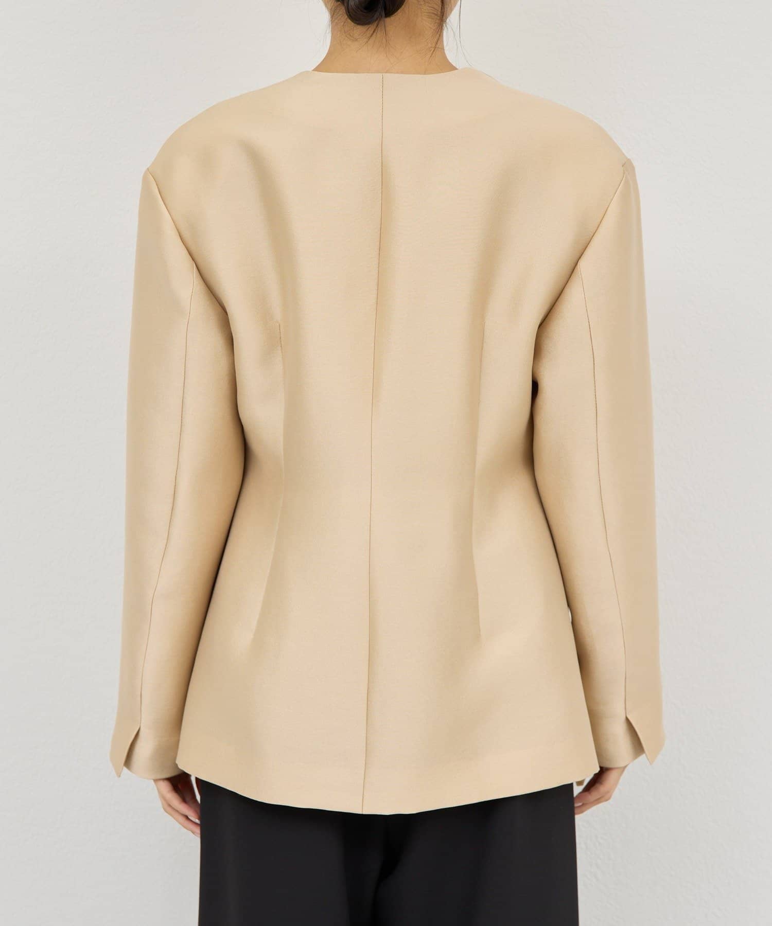 ●女性らしさを感じさせる、艶素材が魅惑的なジャケット。