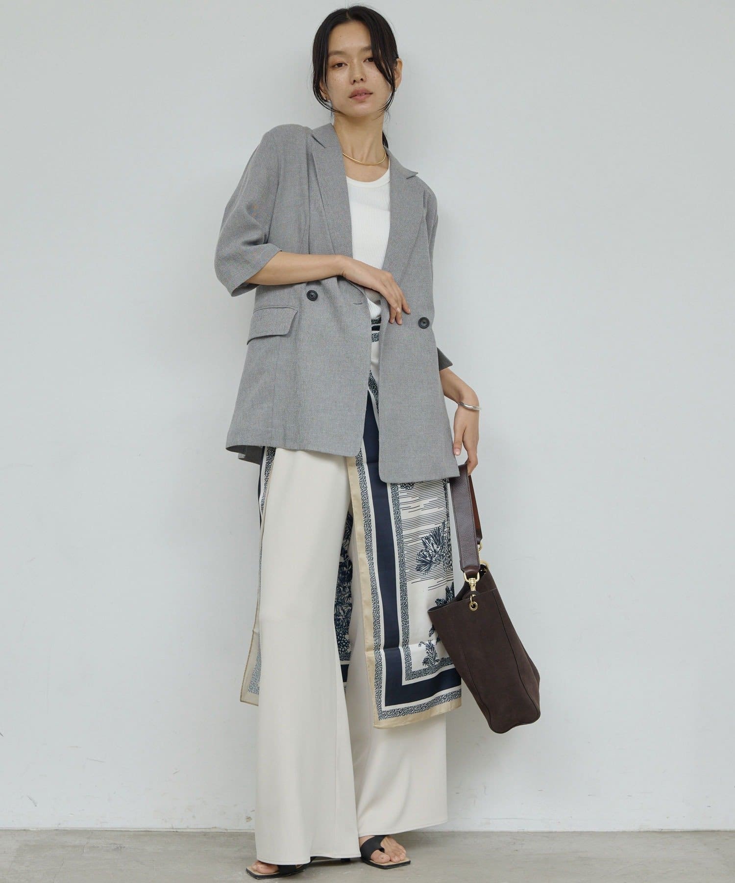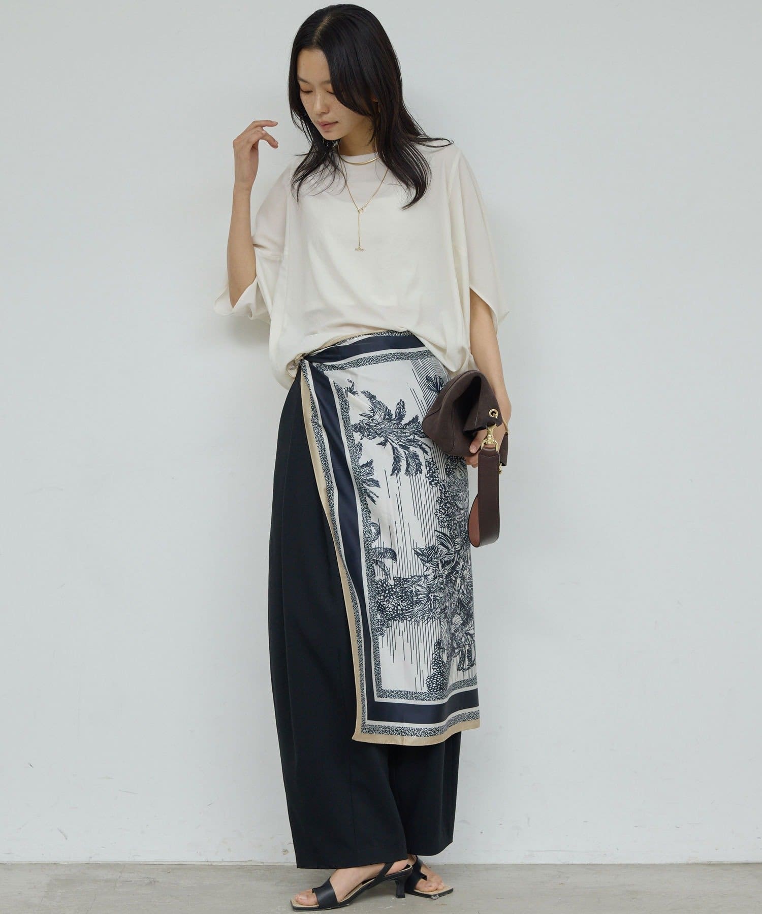 ●巻き方次第で、装いにさりげない華やぎを添える1枚。