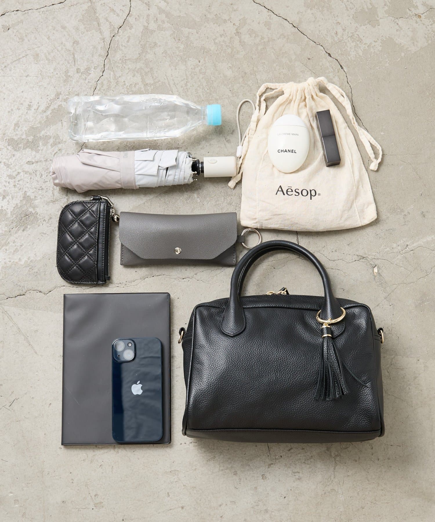 折りたたみ傘、500mlペットボトル、財布、ハンカチ、ティッシュ、ポーチ、キー、などなど。