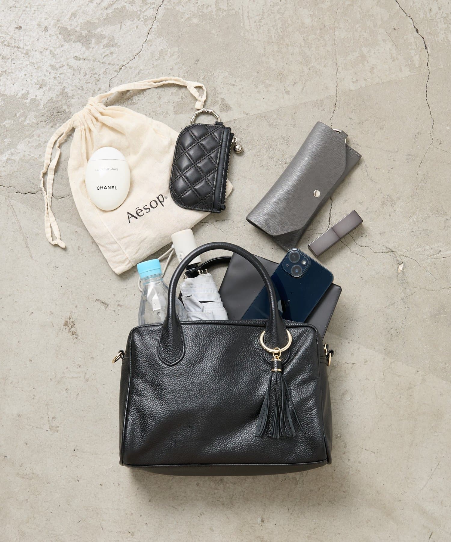 A. 長財布、500mlペットボトル、ポーチ、スマートフォンなど、