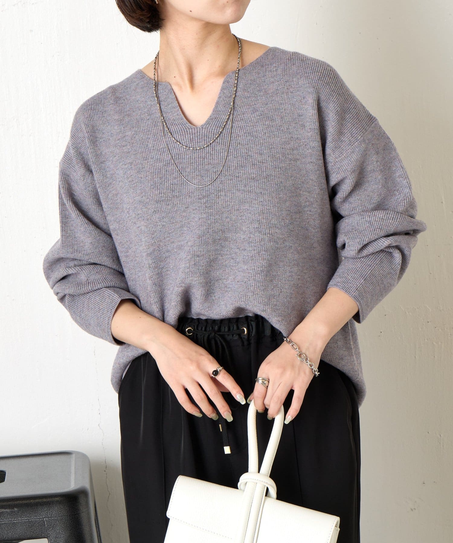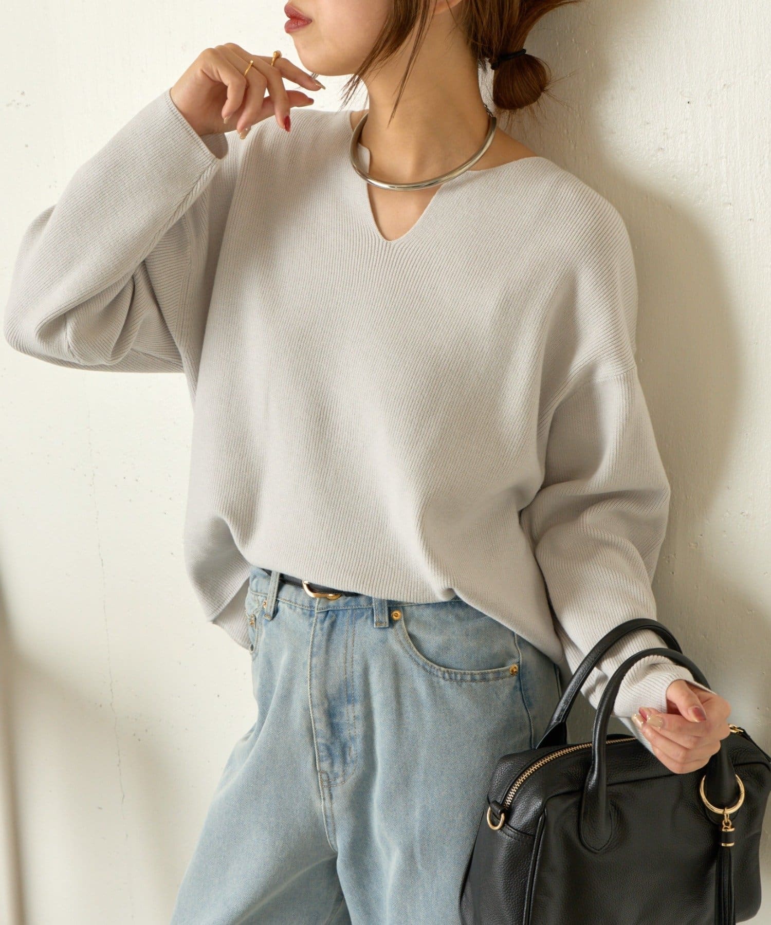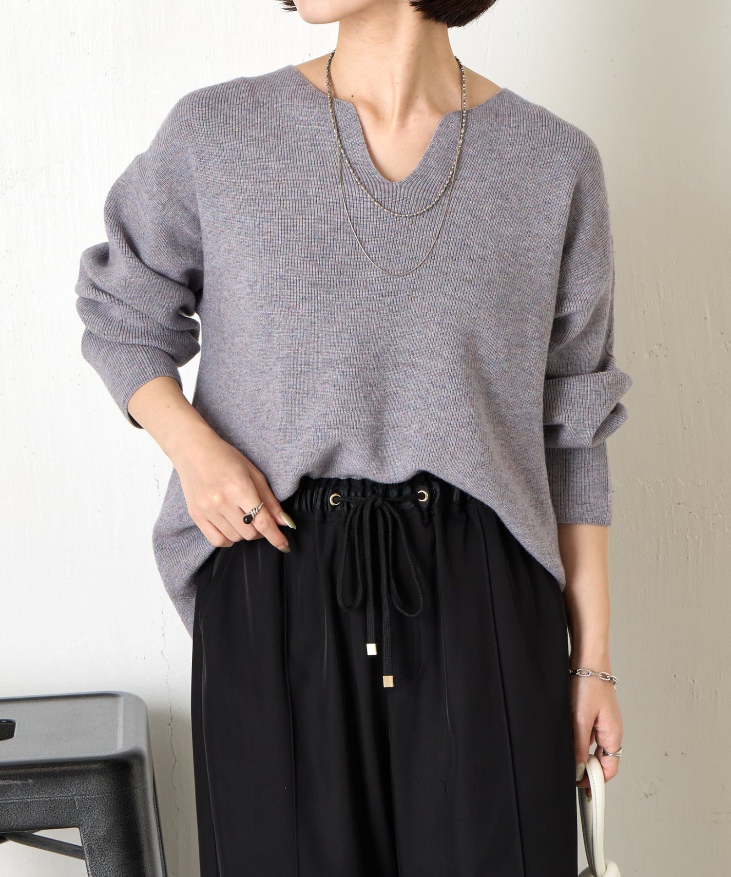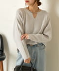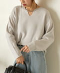 ・絶妙な厚さの生地感と、首元のキーネックデザインががすっきり見えの秘訣!