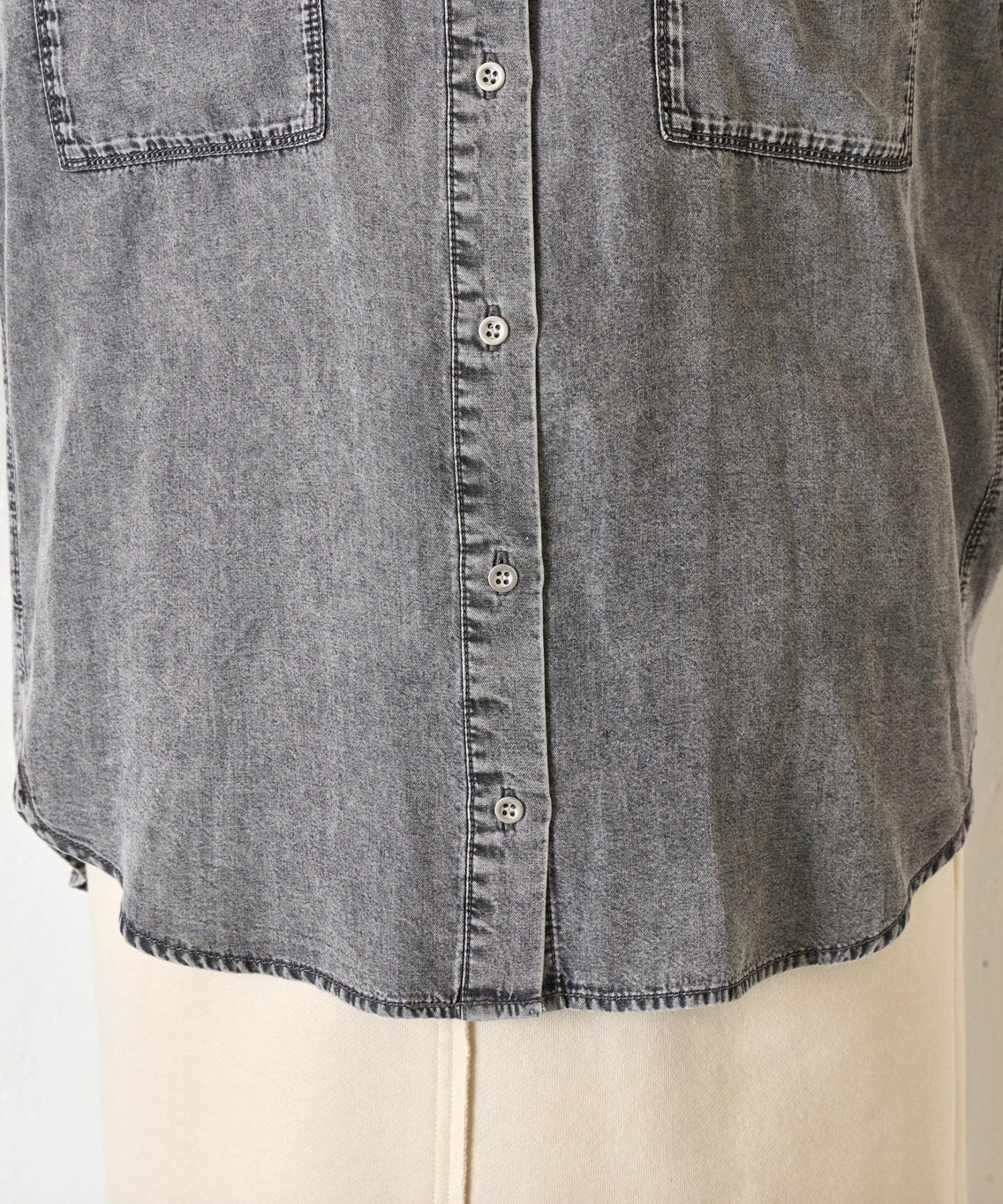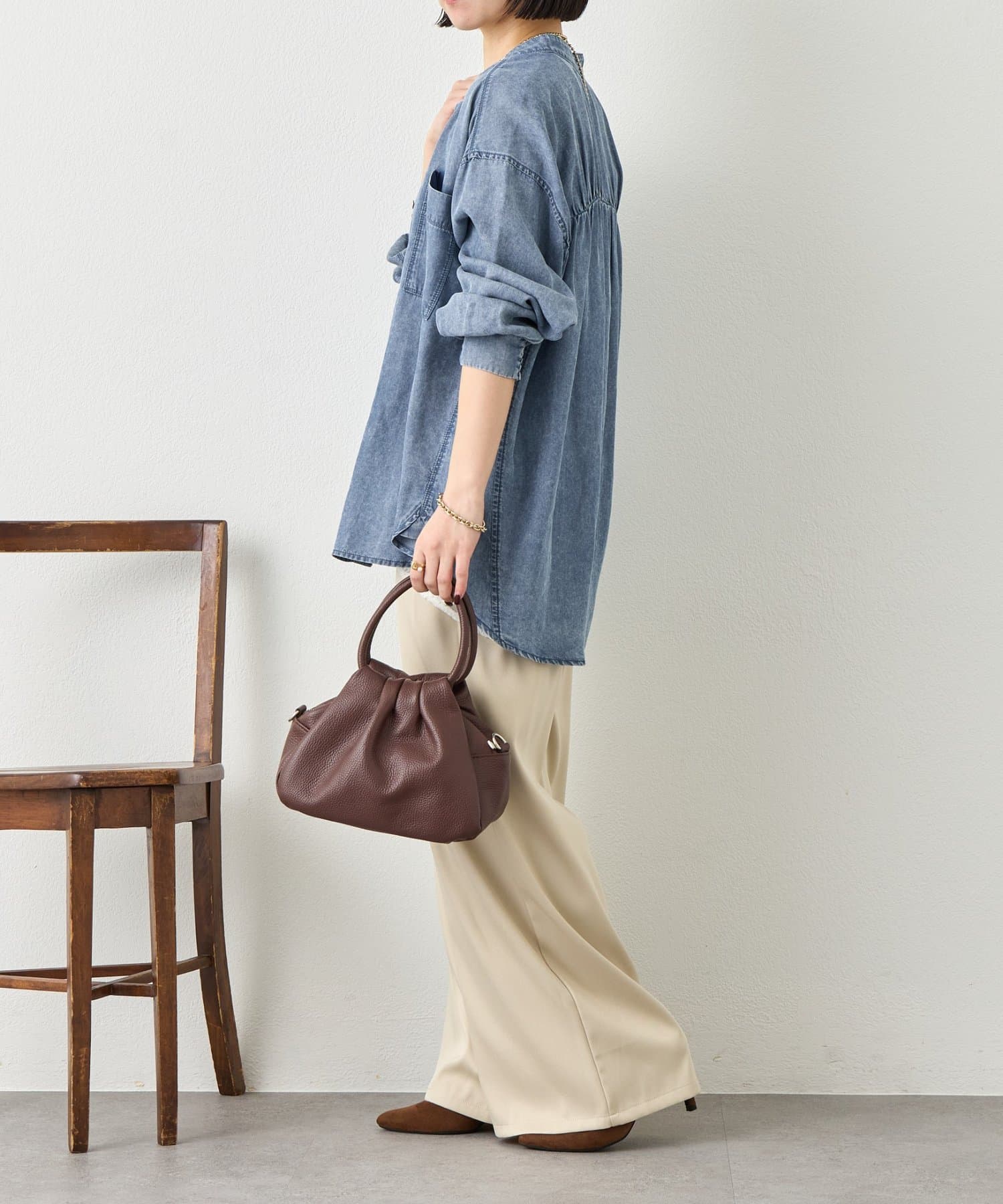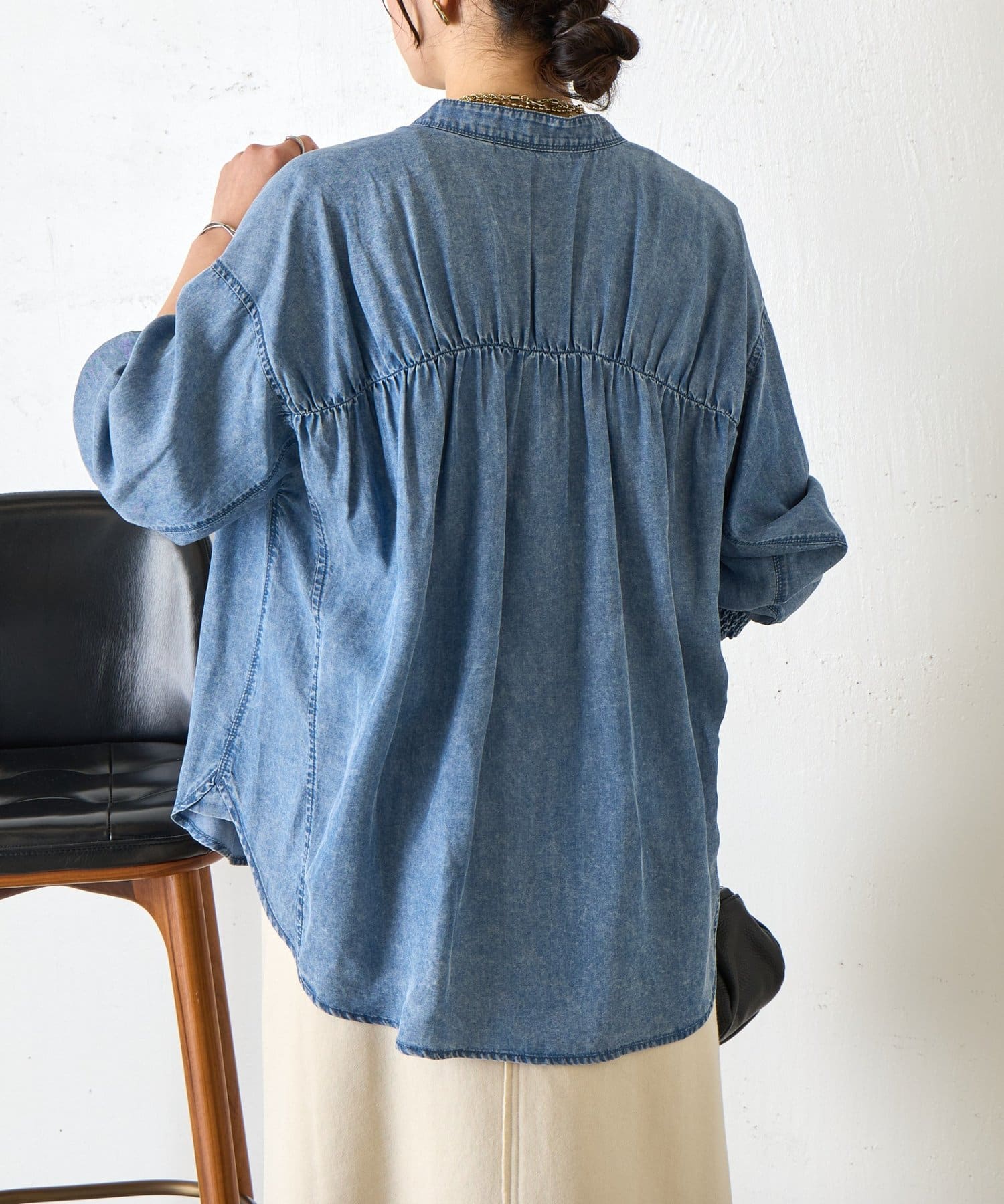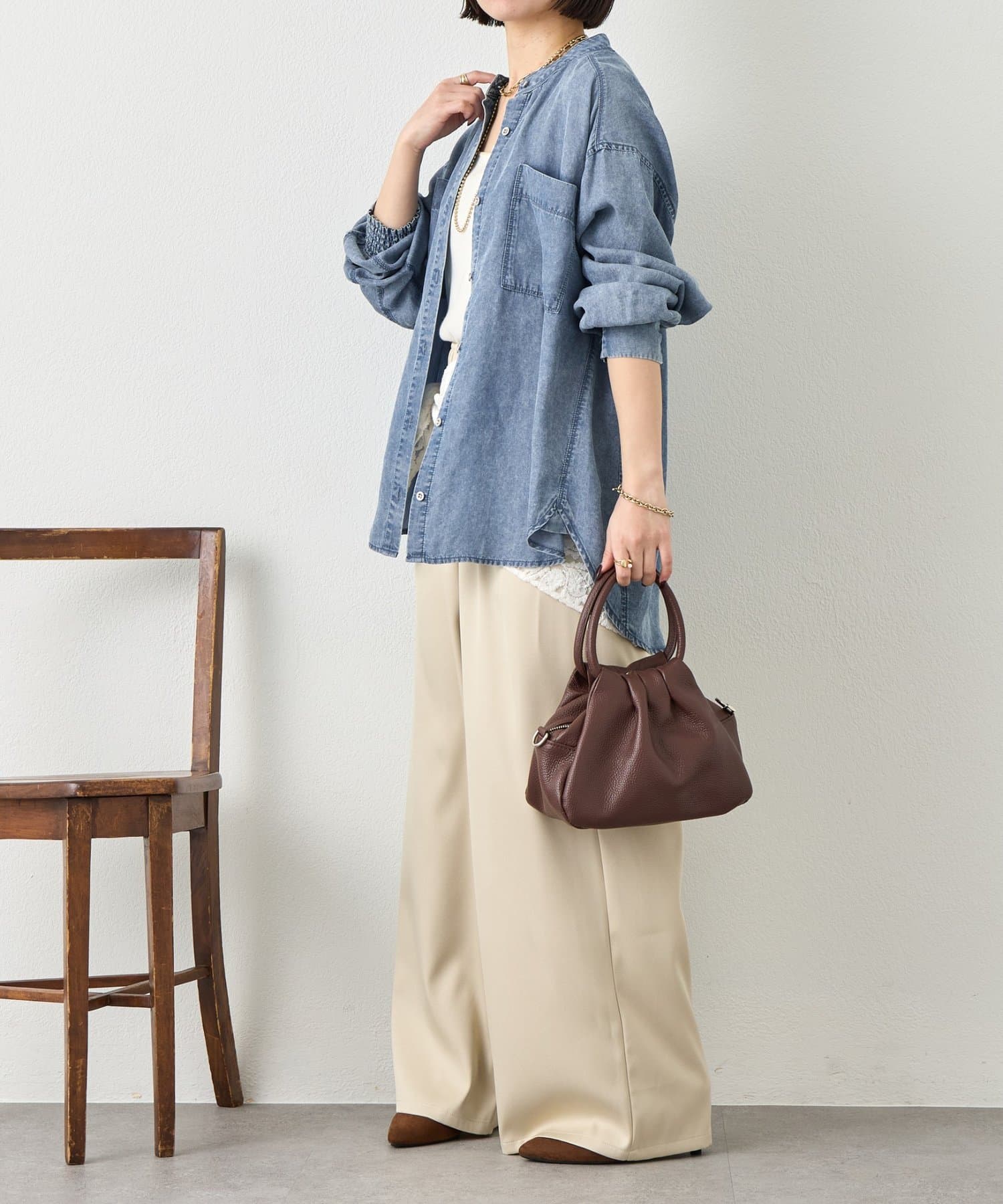 ・落ち感のあるテンセル素材で、デニムシャツでも柔らかく女性らしい印象に