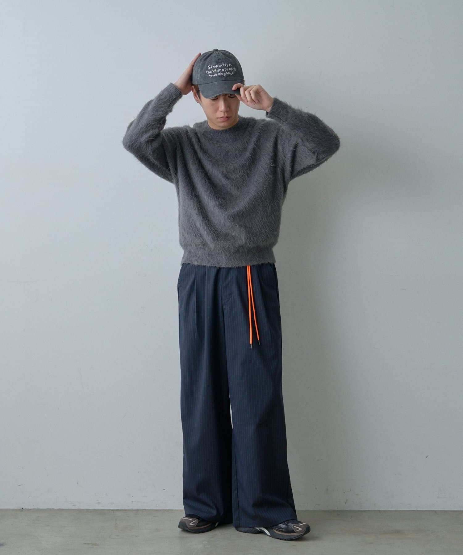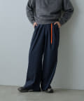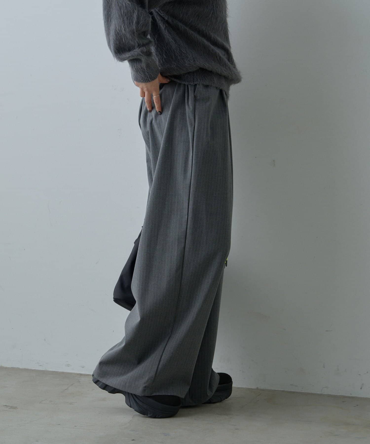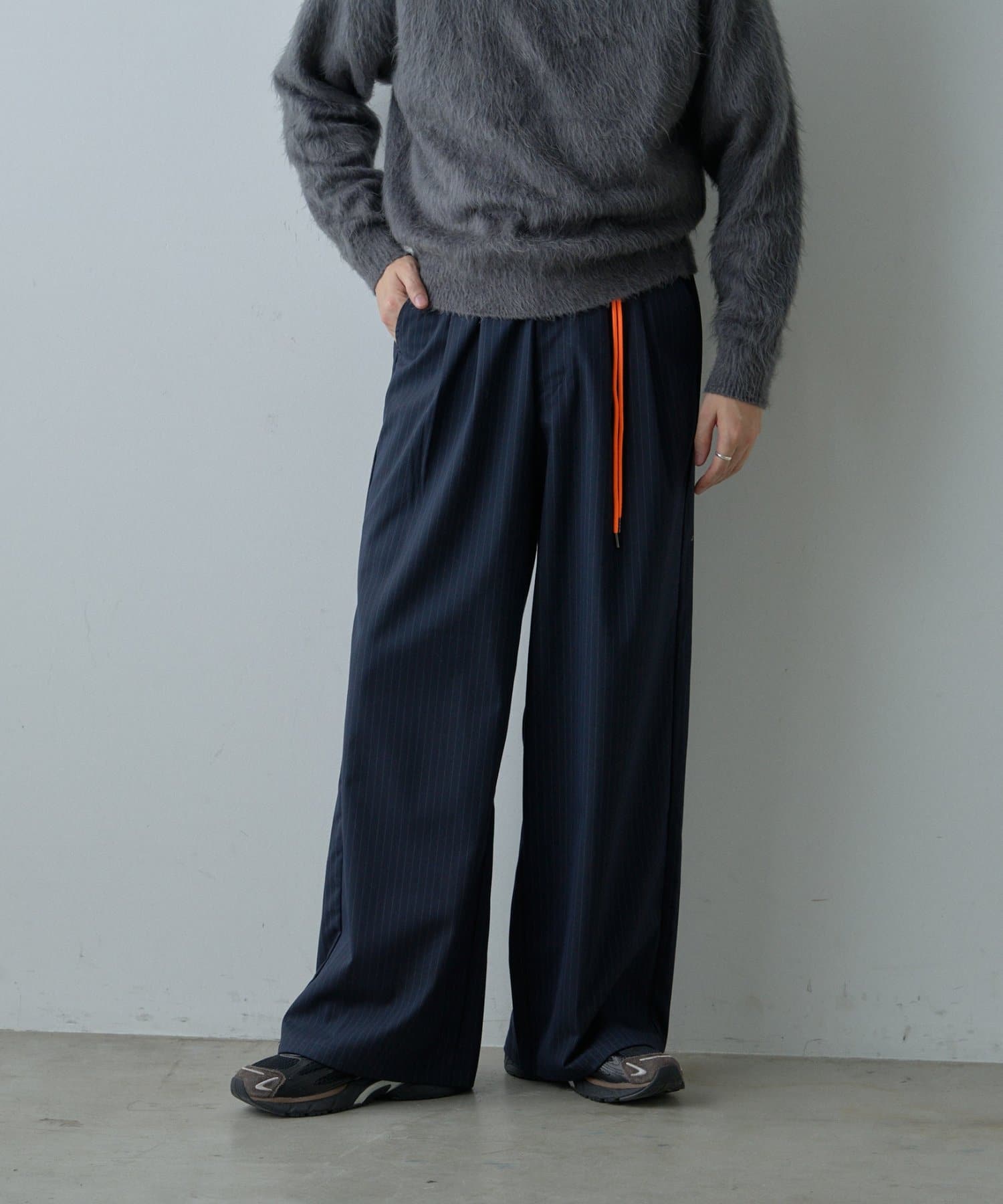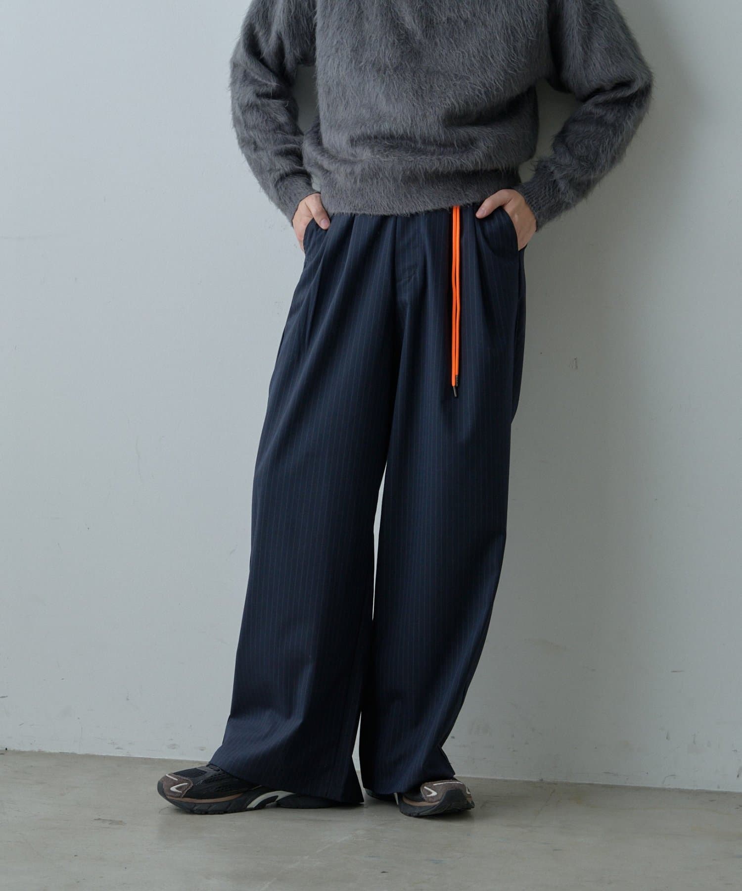 クラシックなピンストライプにストリート要素が漂うネオンカラーのコード紐を組み合わせたワイドスラックス。