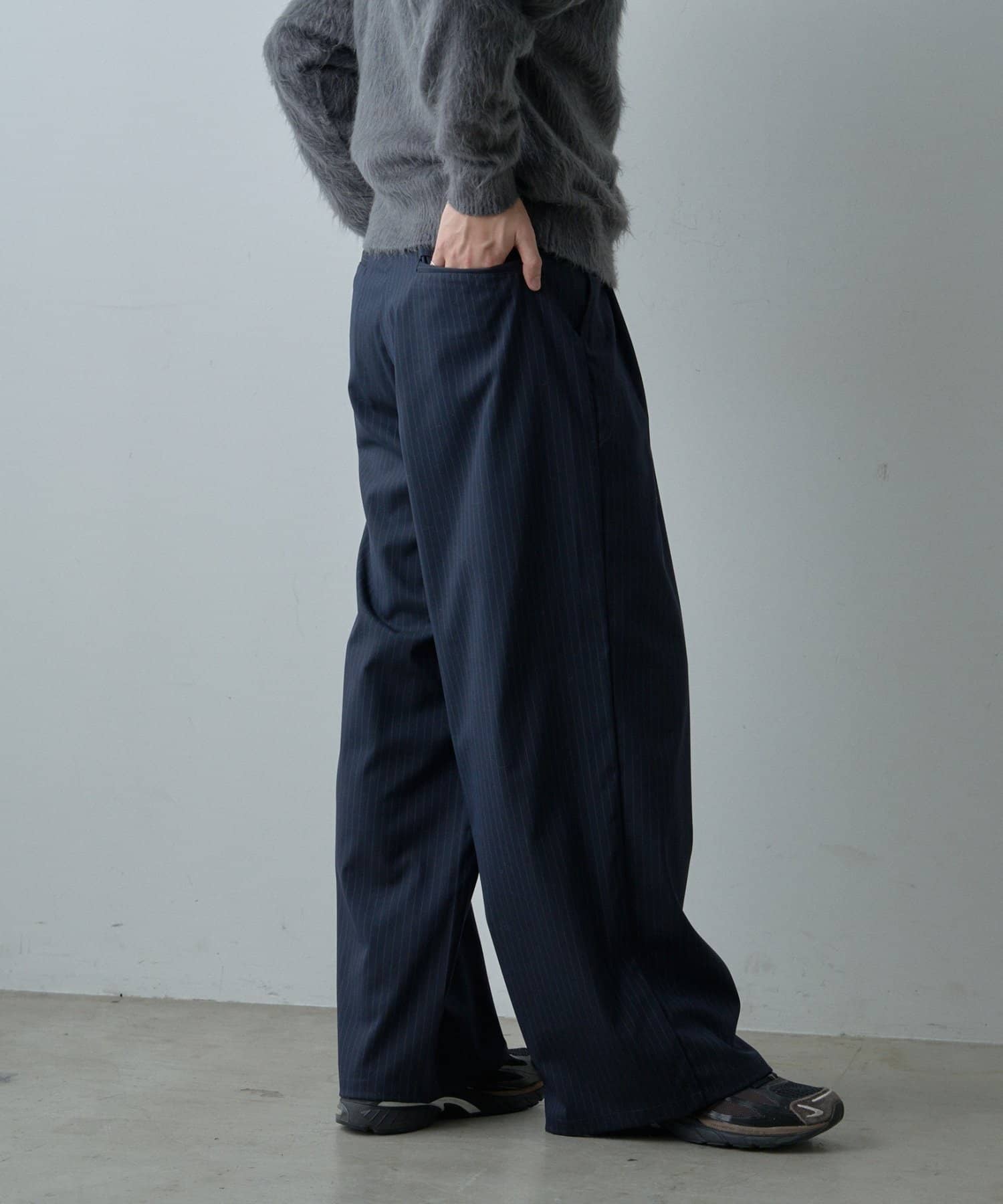 深めのタックによる立体的なシルエットが特徴で、歩くたびにゆったりとしたドレープが生まれます。