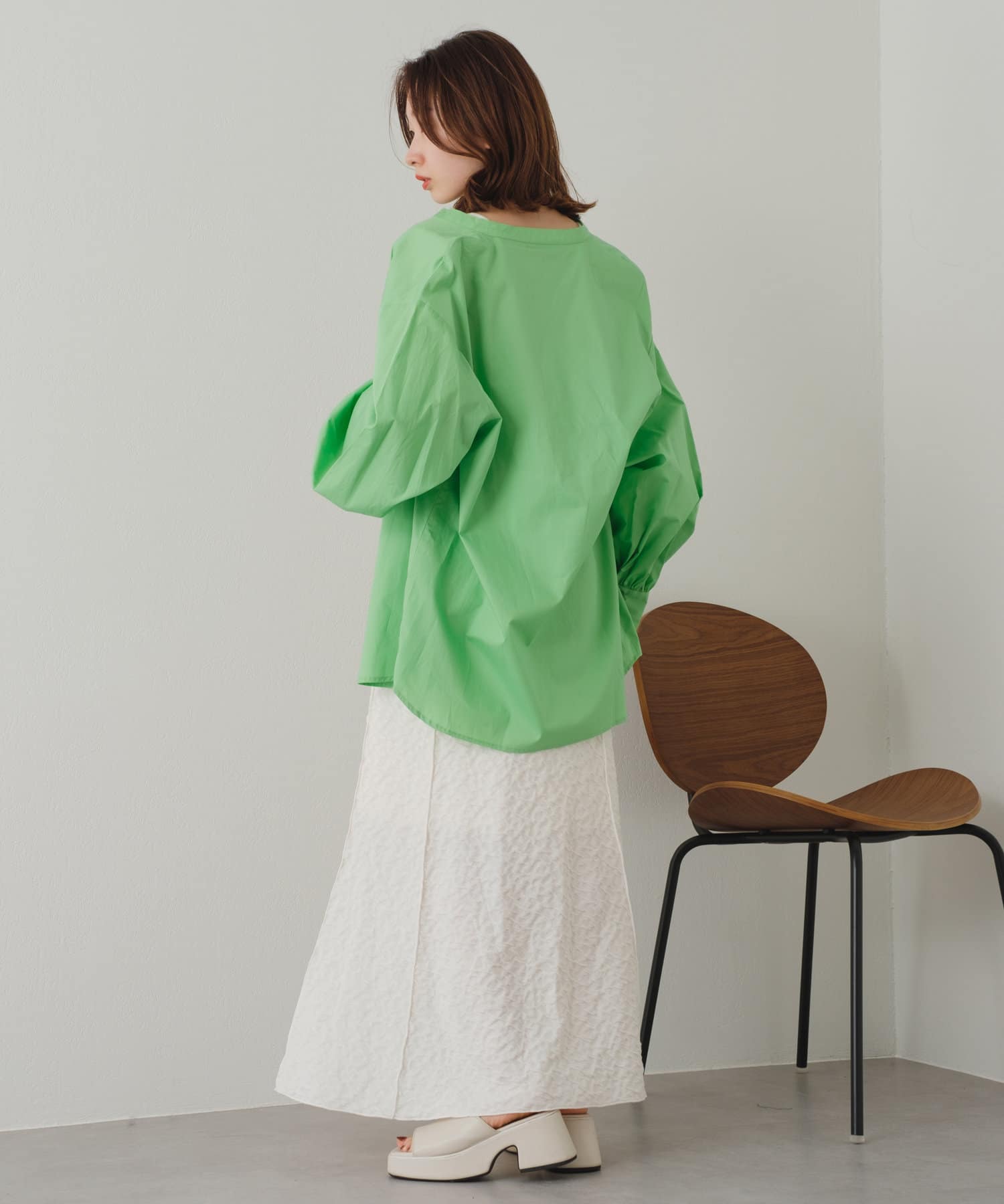 トレンドのミニ丈のバランスから、パンツスタイルまで幅広く着用頂けます。