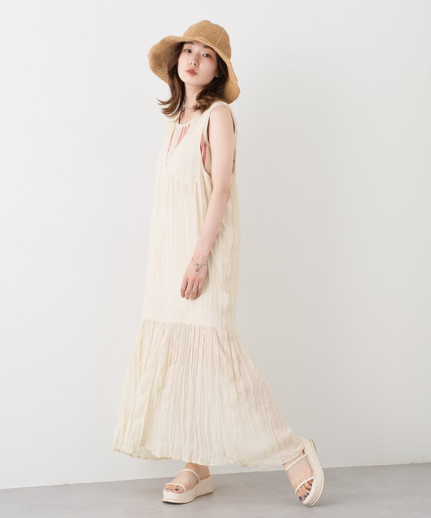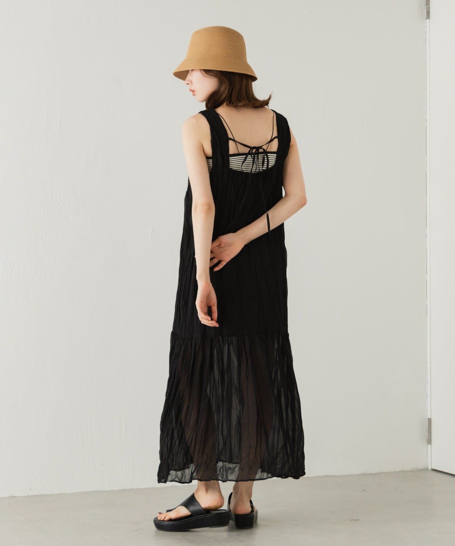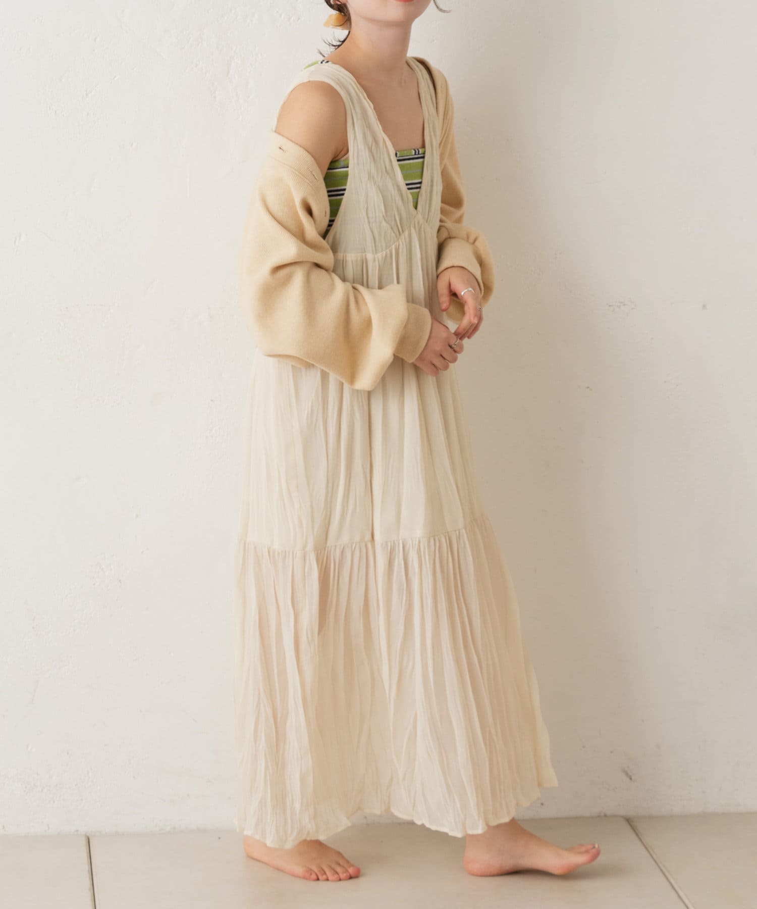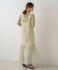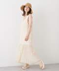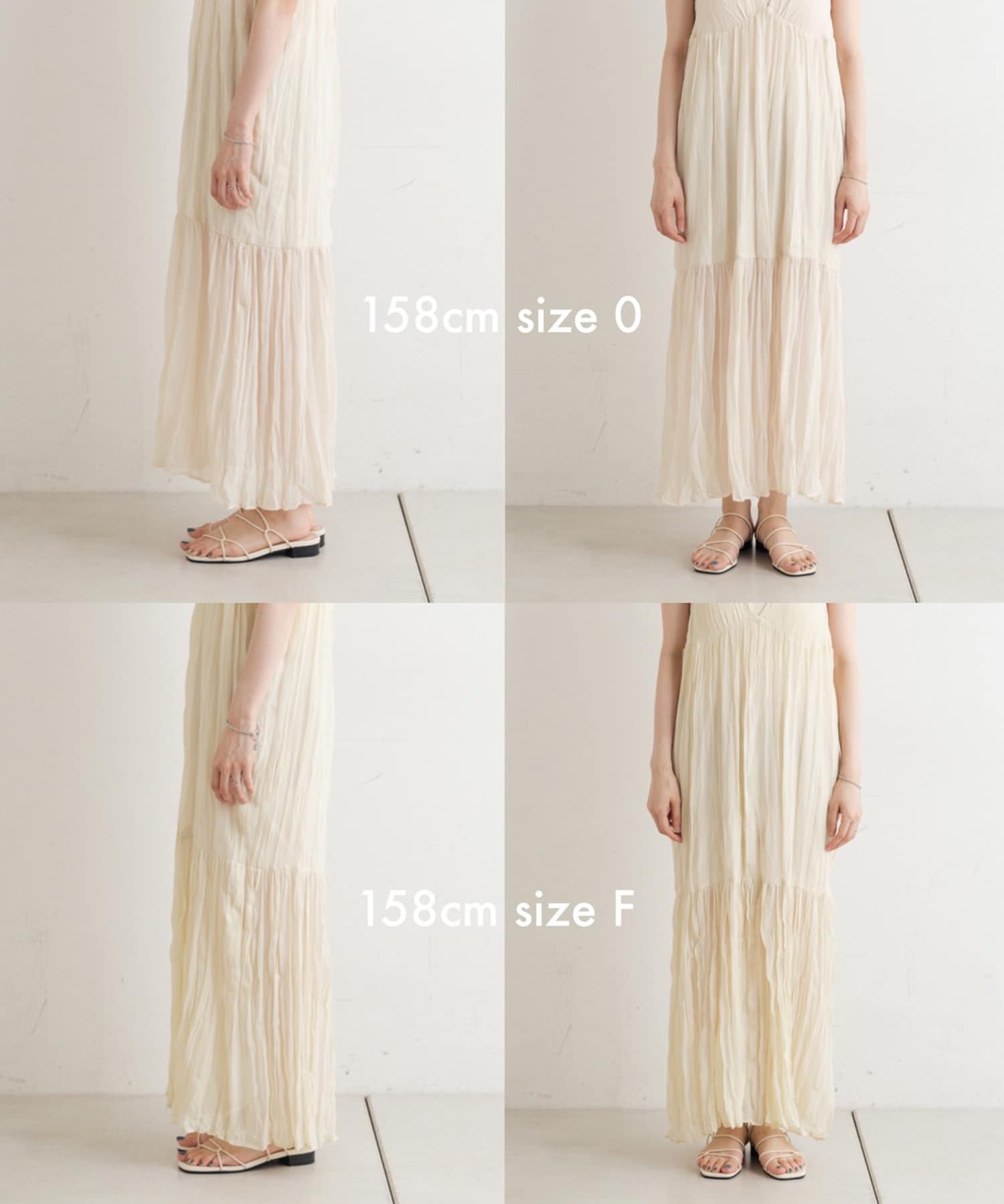 ティアード切り替えから裾にかけてはあえて裏地をつけず、透け感を出すことでマキシ丈でも軽やかに着こなせます。