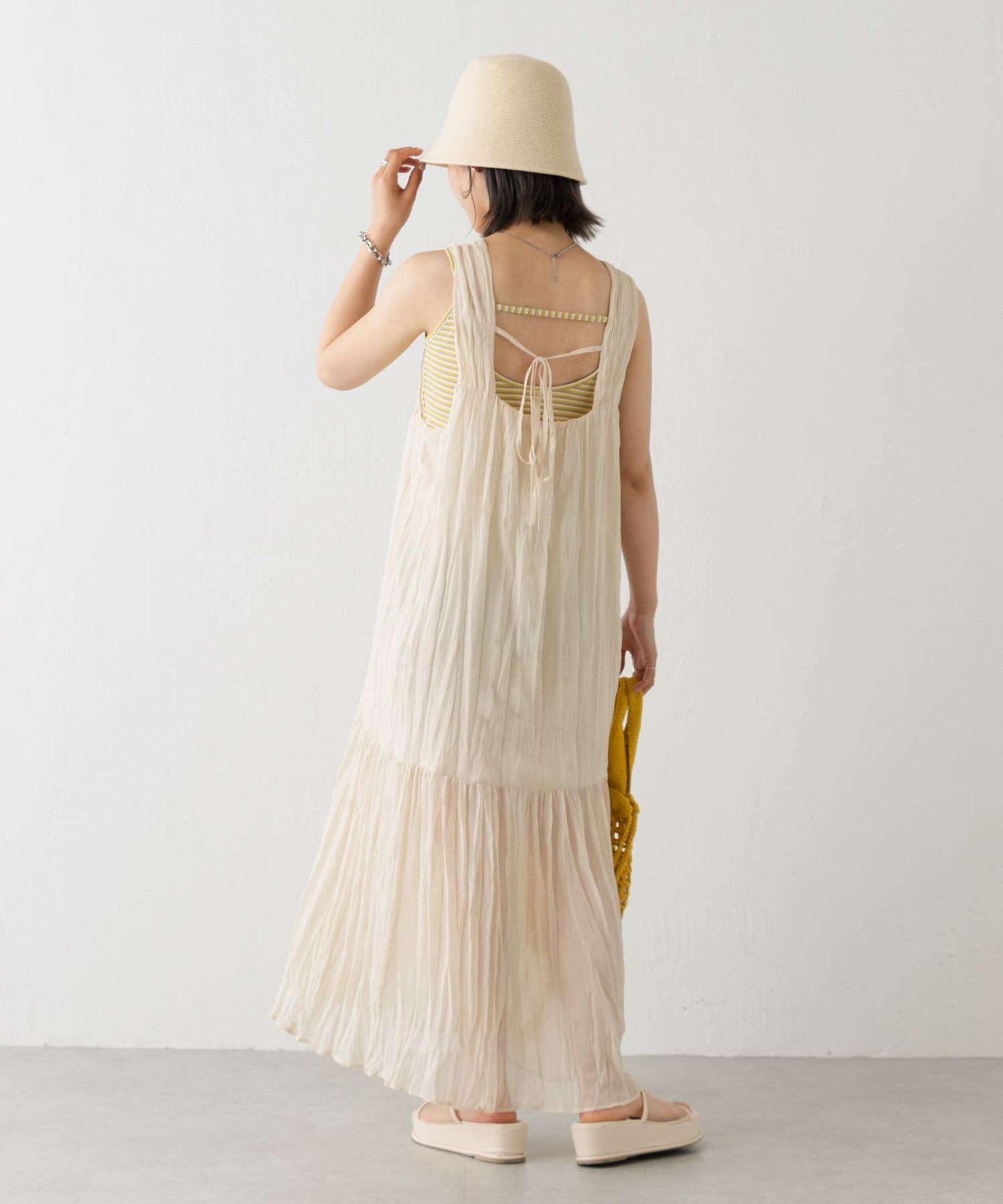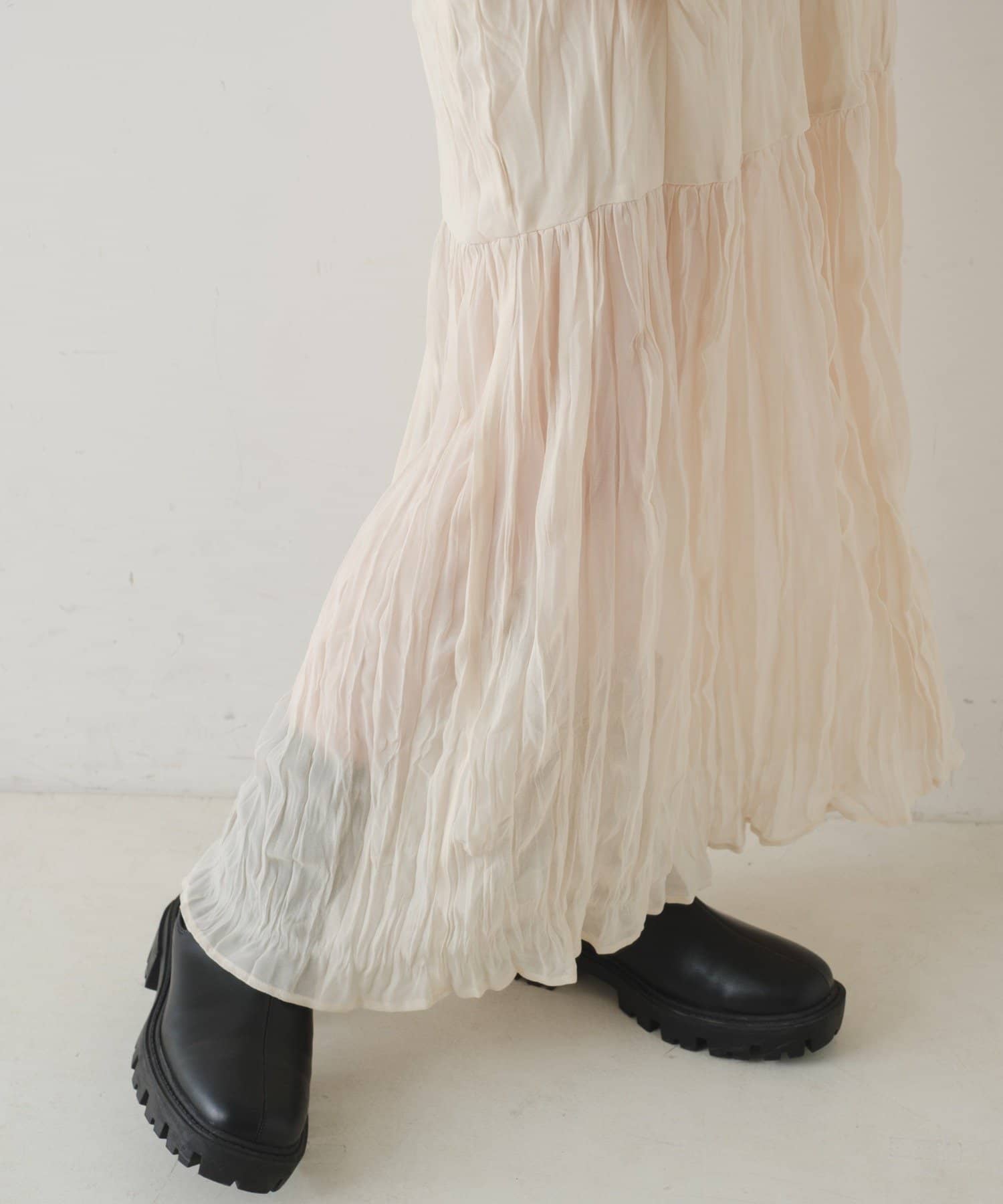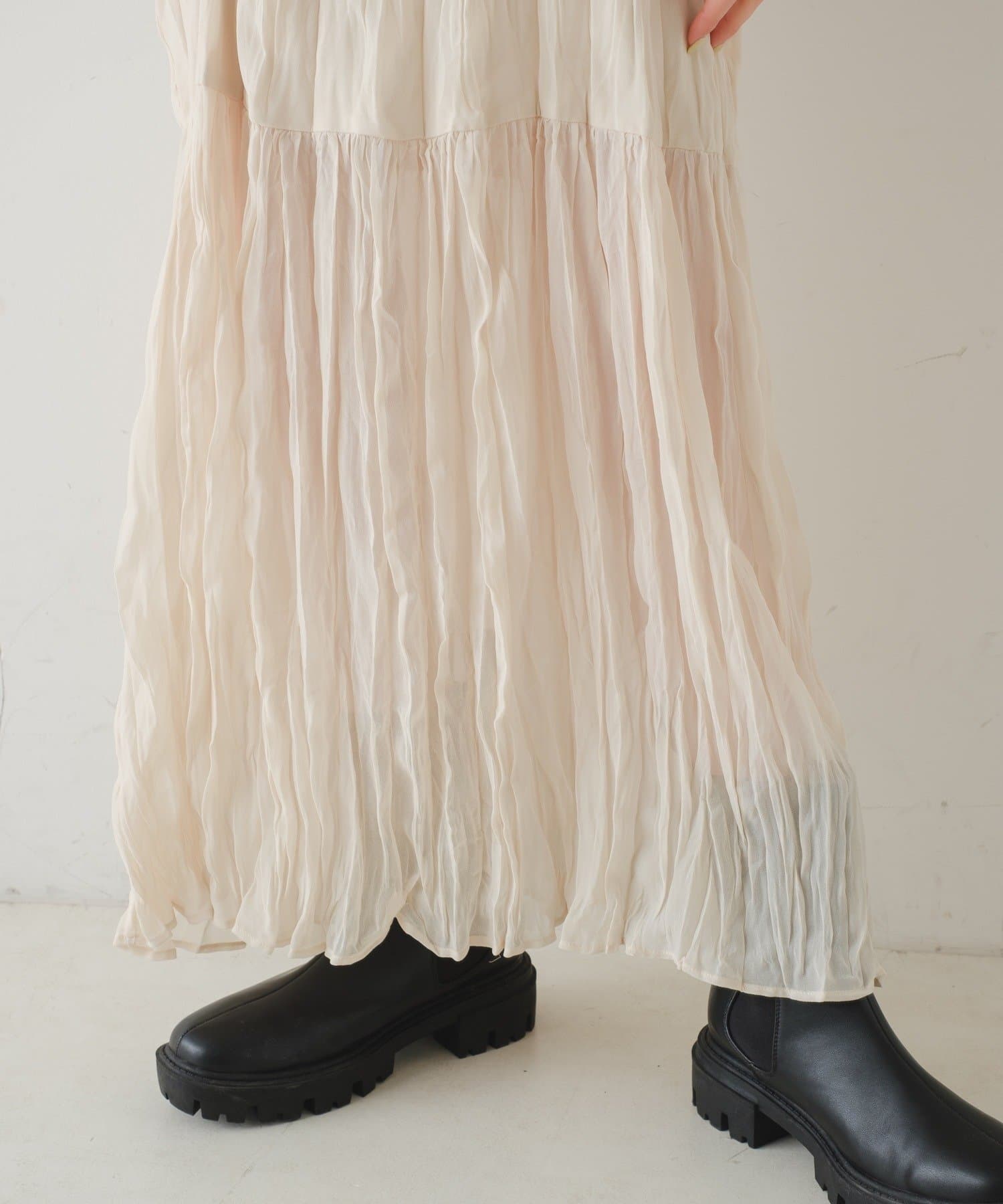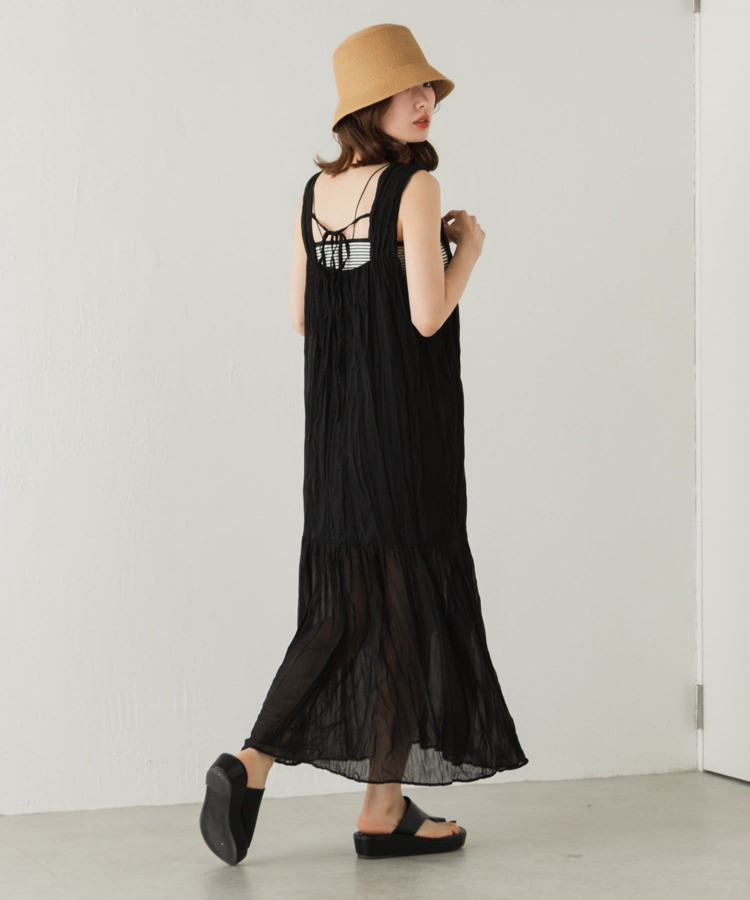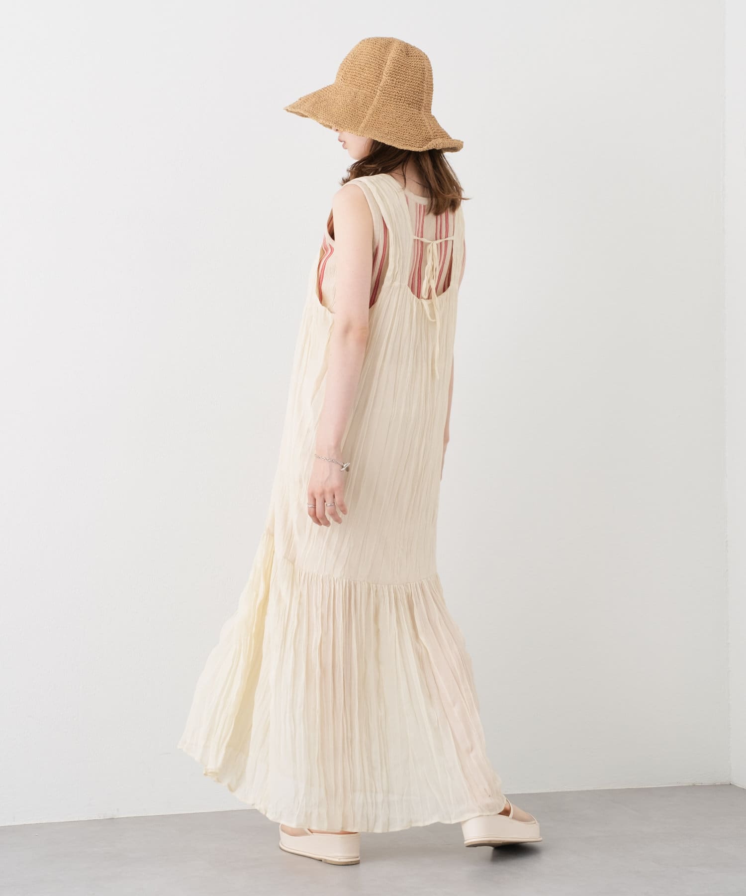 ティアード切り替えから裾にかけてはあえて裏地をつけず、透け感を出すことでマキシ丈でも軽やかに着こなせます。