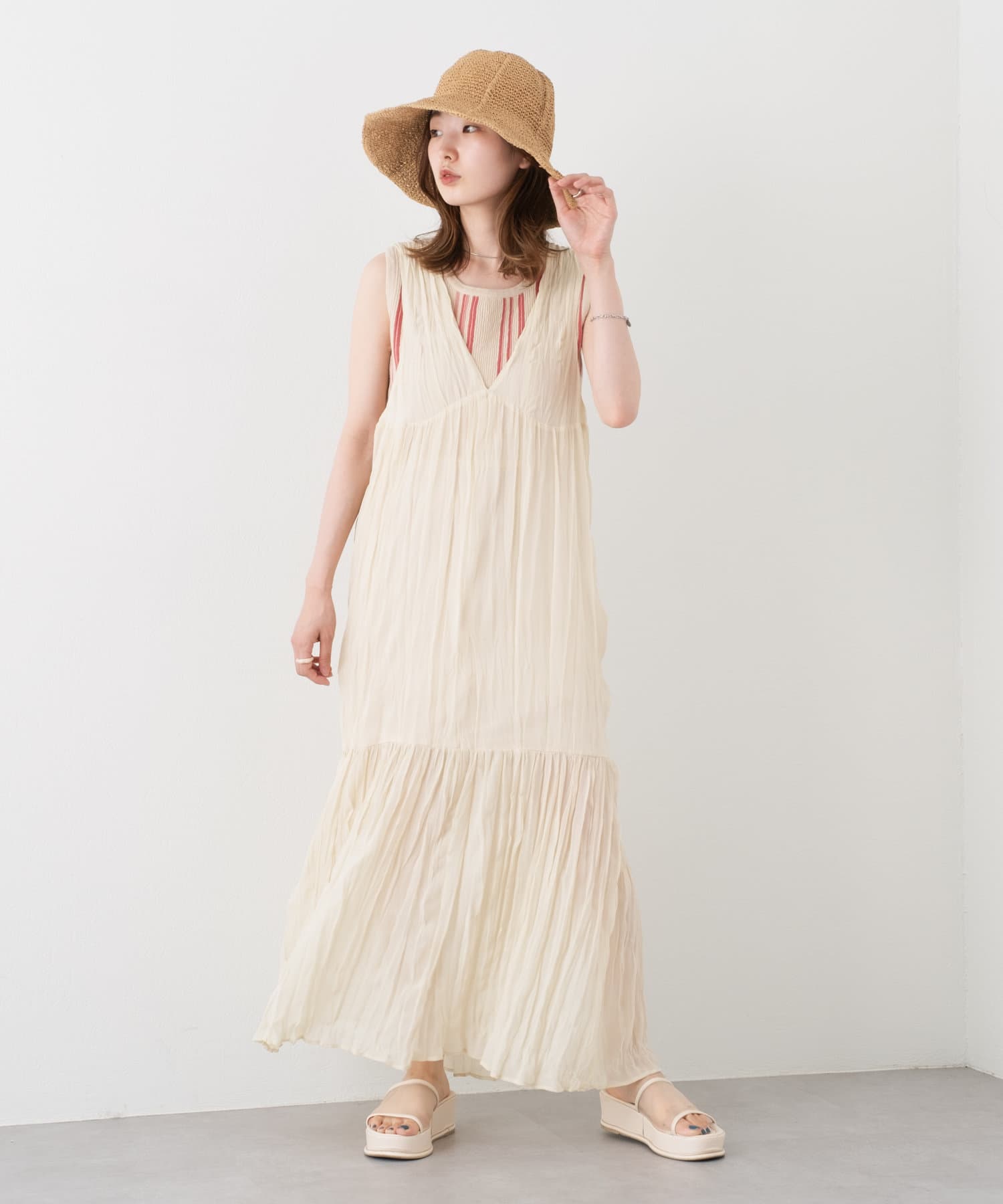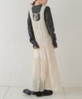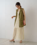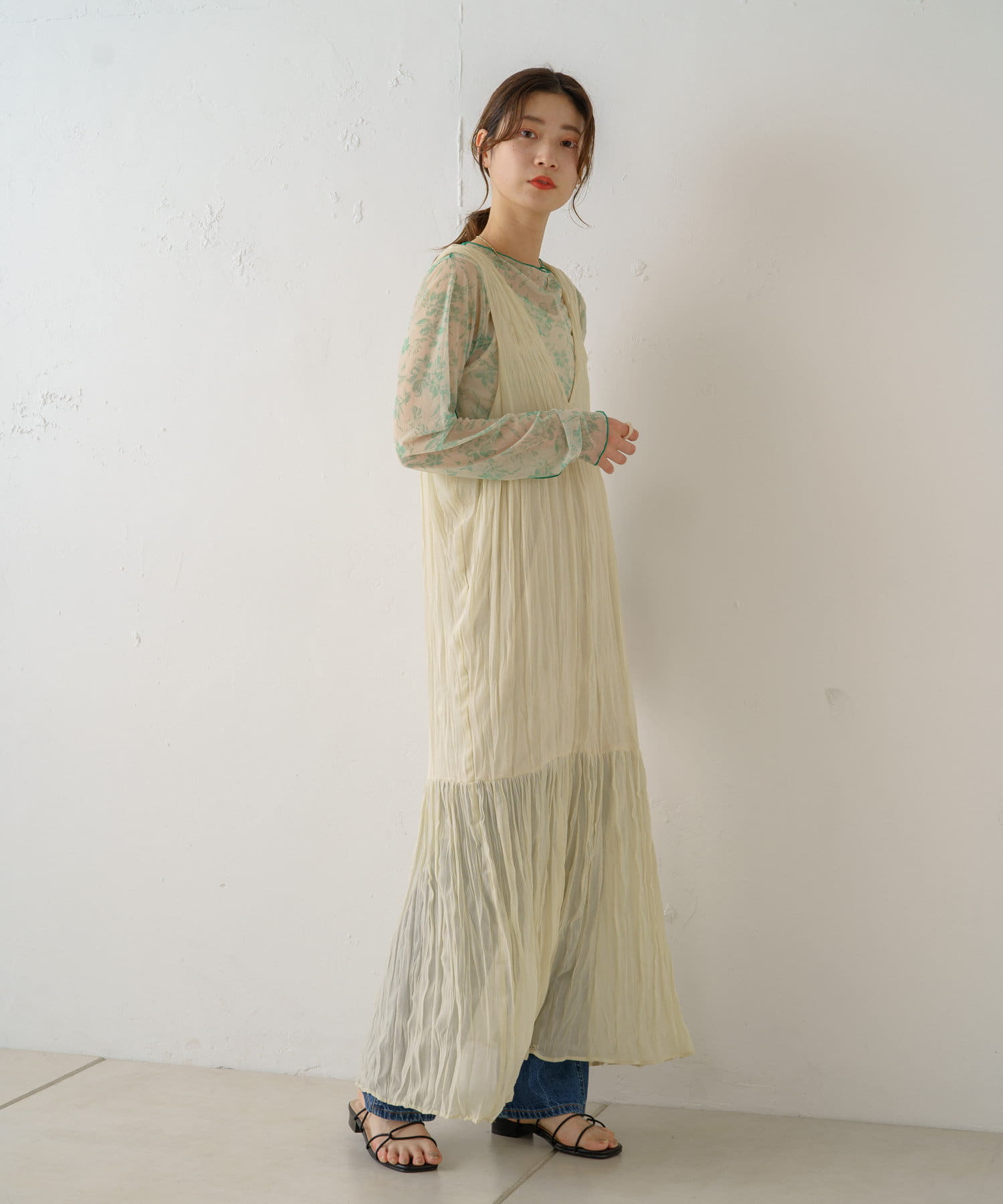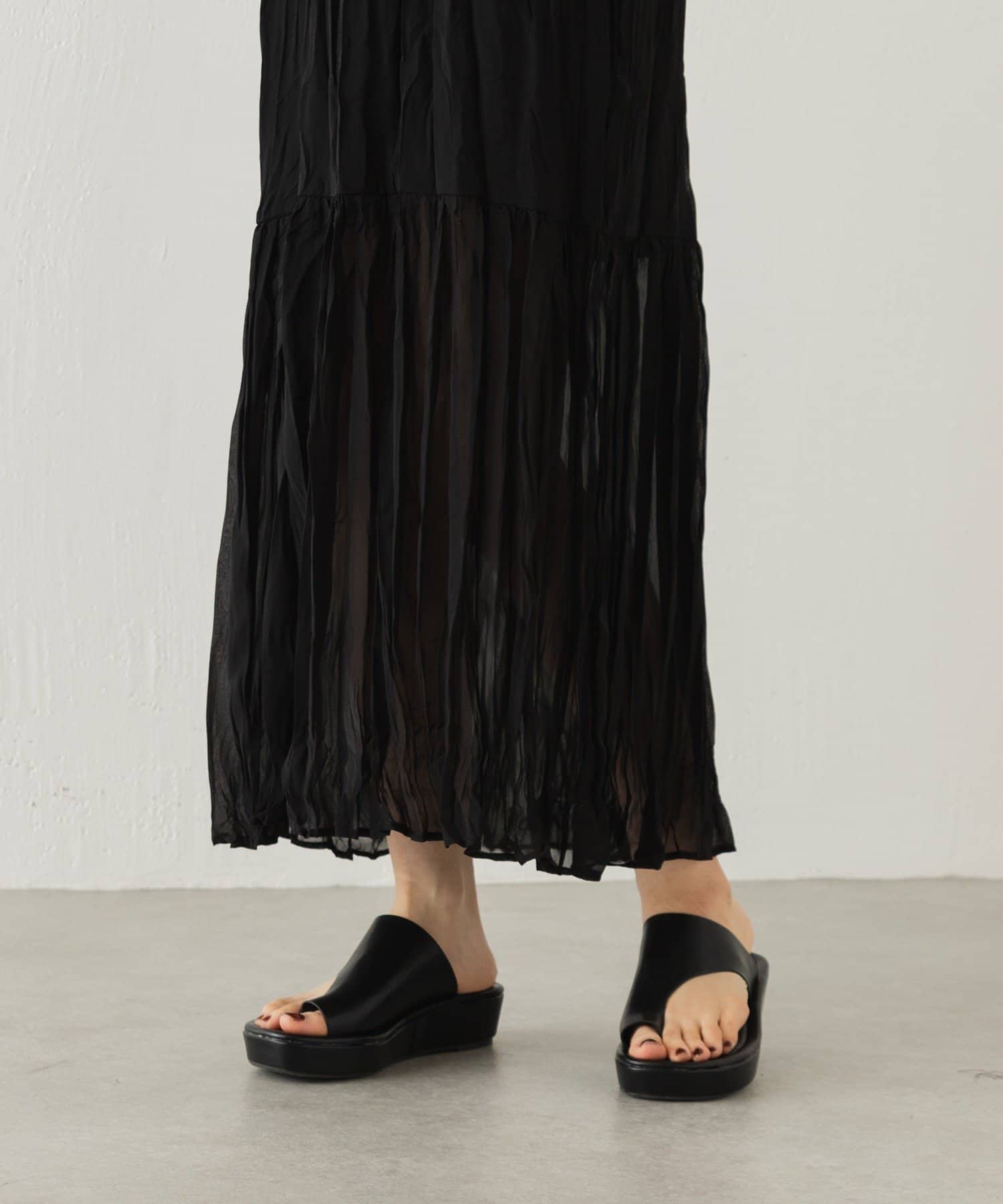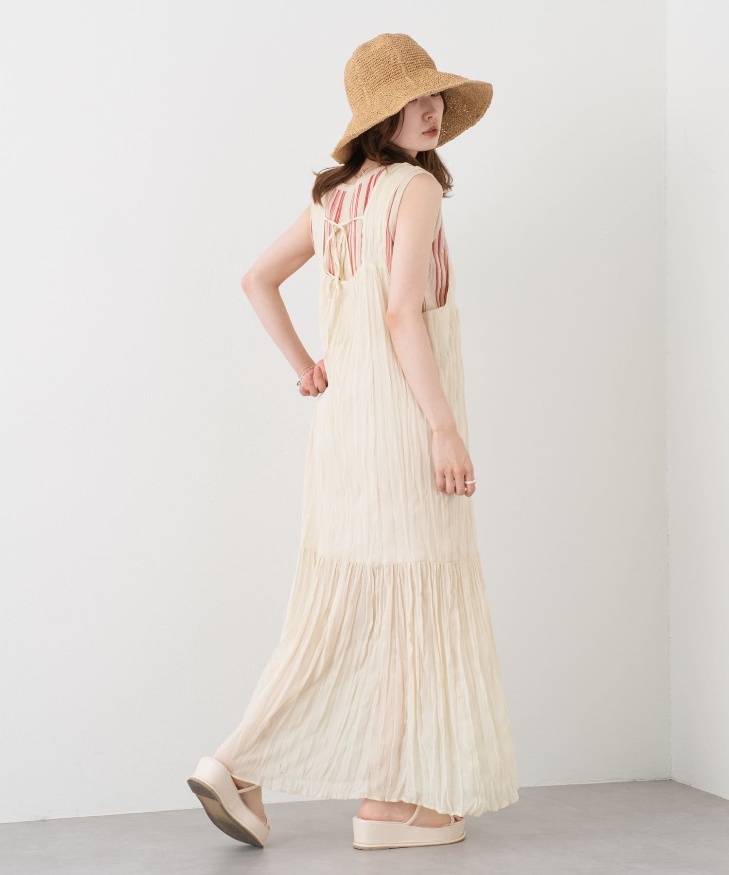 ティアード切り替えから裾にかけてはあえて裏地をつけず、透け感を出すことでマキシ丈でも軽やかに着こなせます。