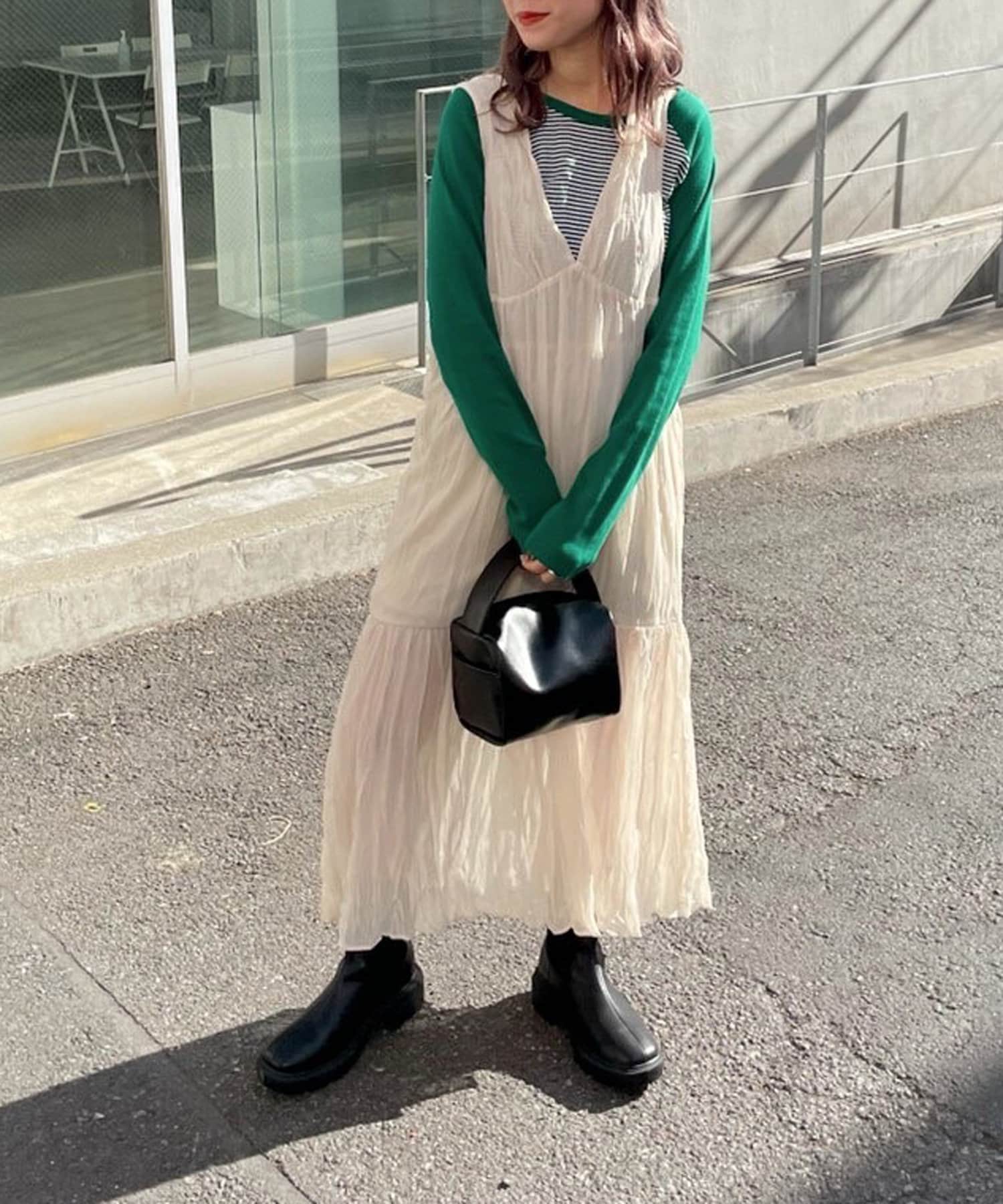 冬はハイネックニットをインナーに、カーディガン羽織るもよし。