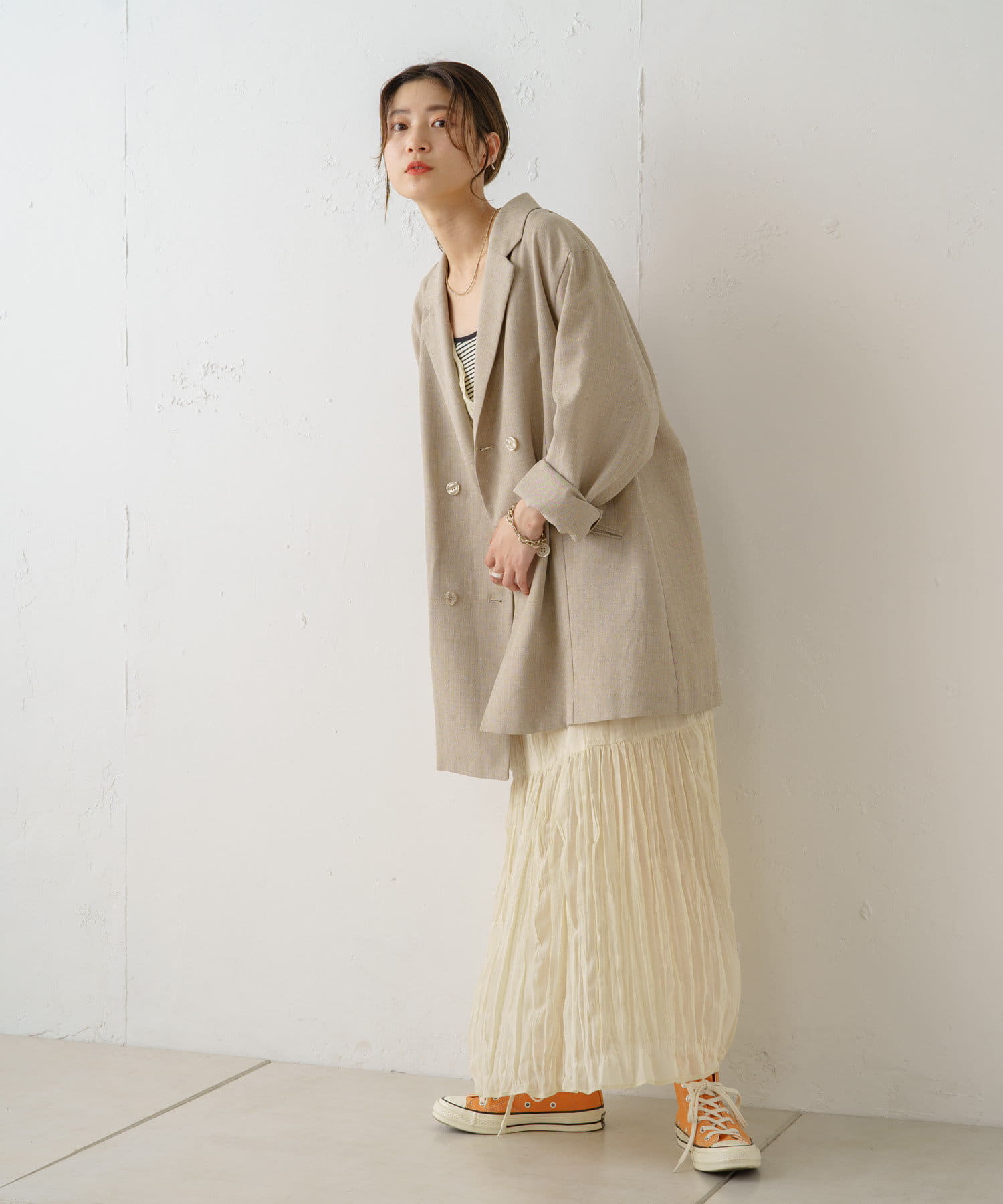 身長160cm以上の方はスラックスパンツやデニムの重ね着もおすすめです。
