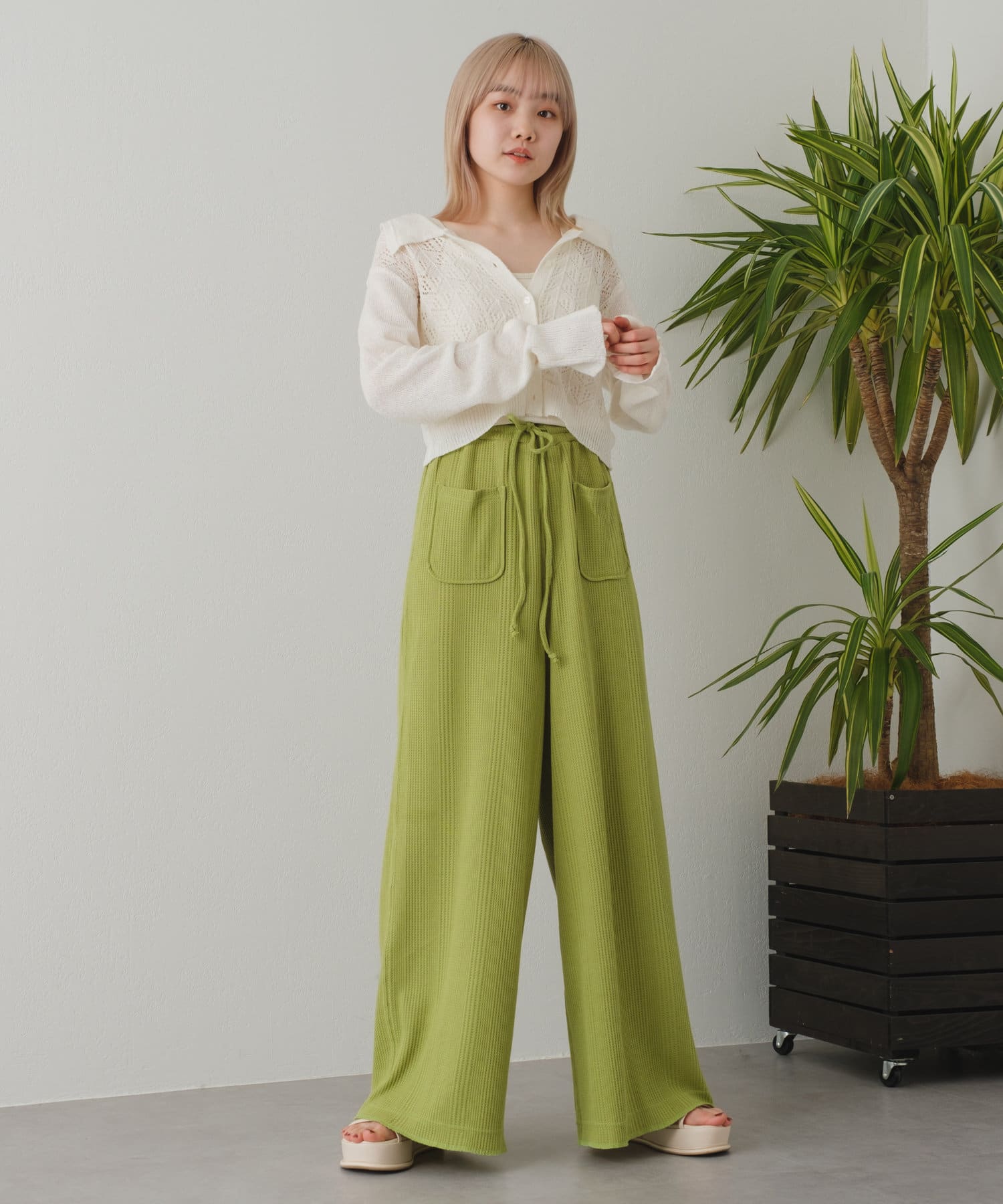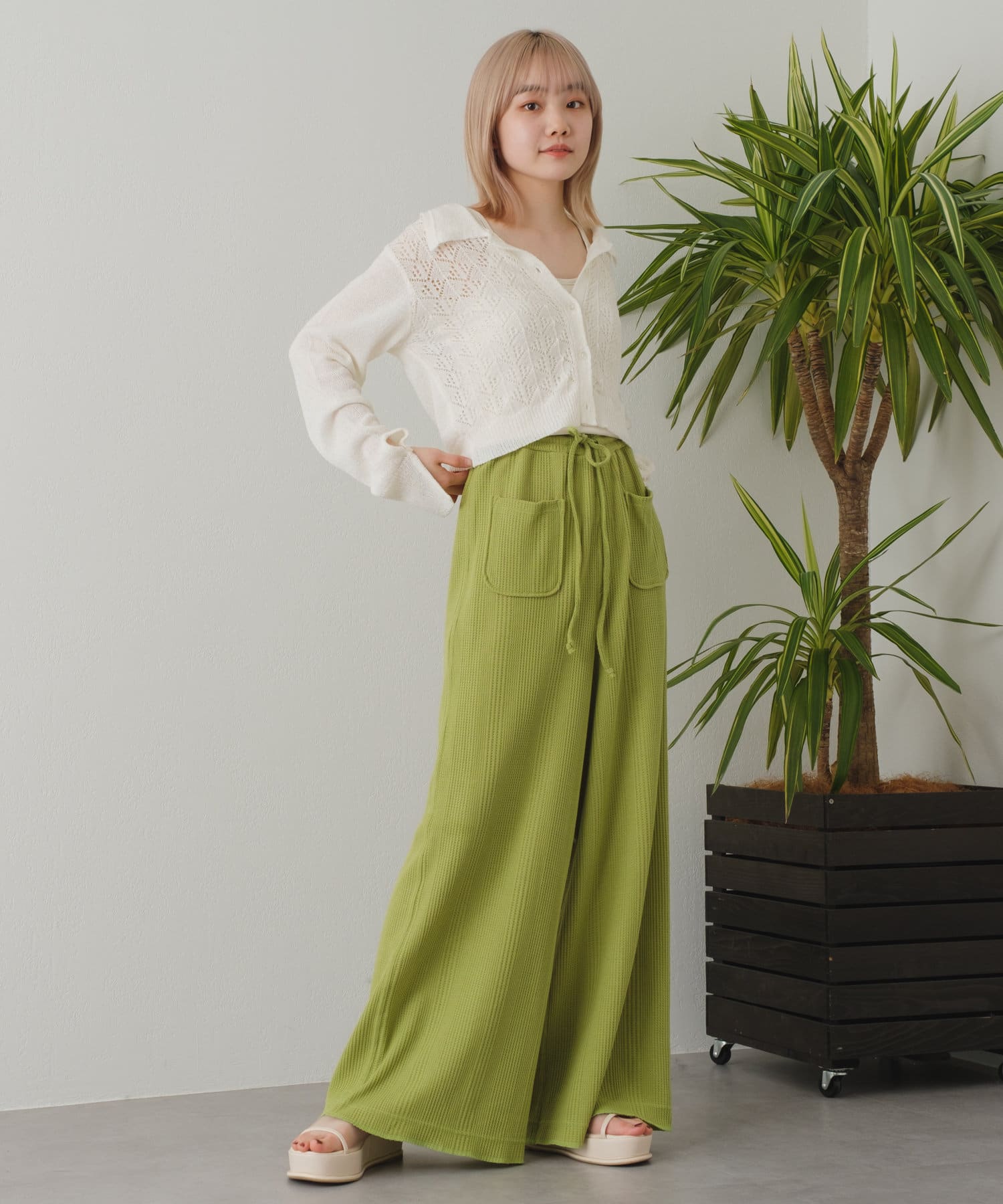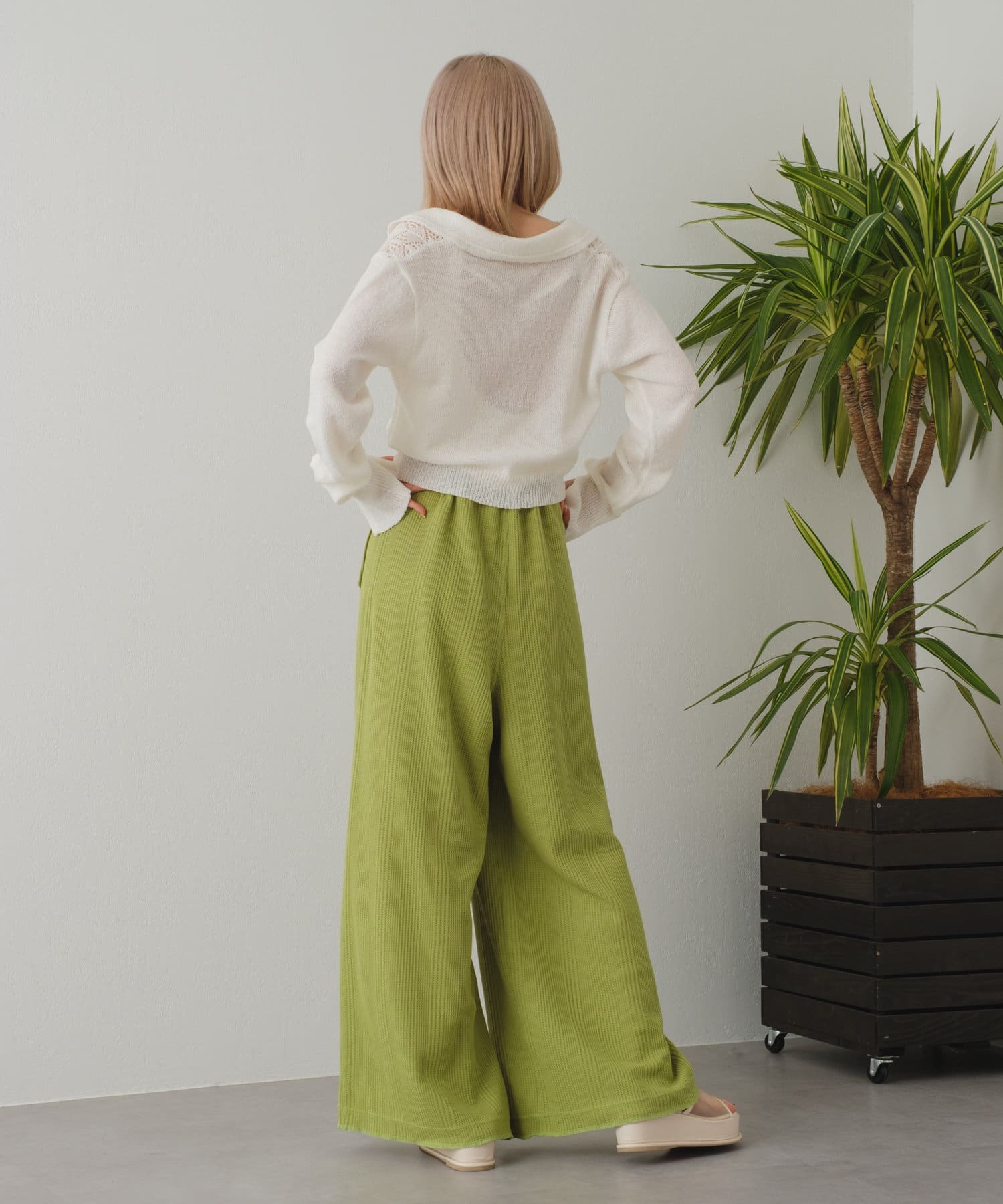 トレンドの衿×春の定番透かし編みニット
