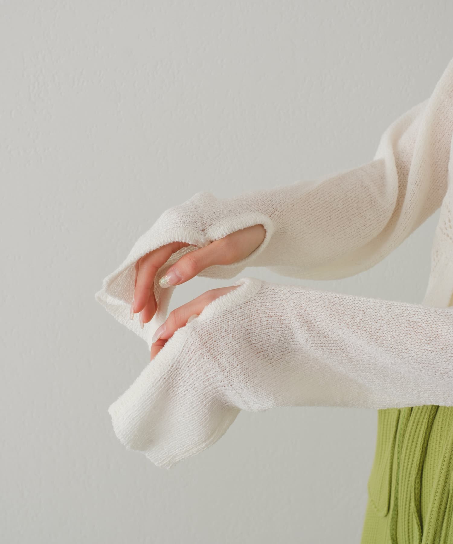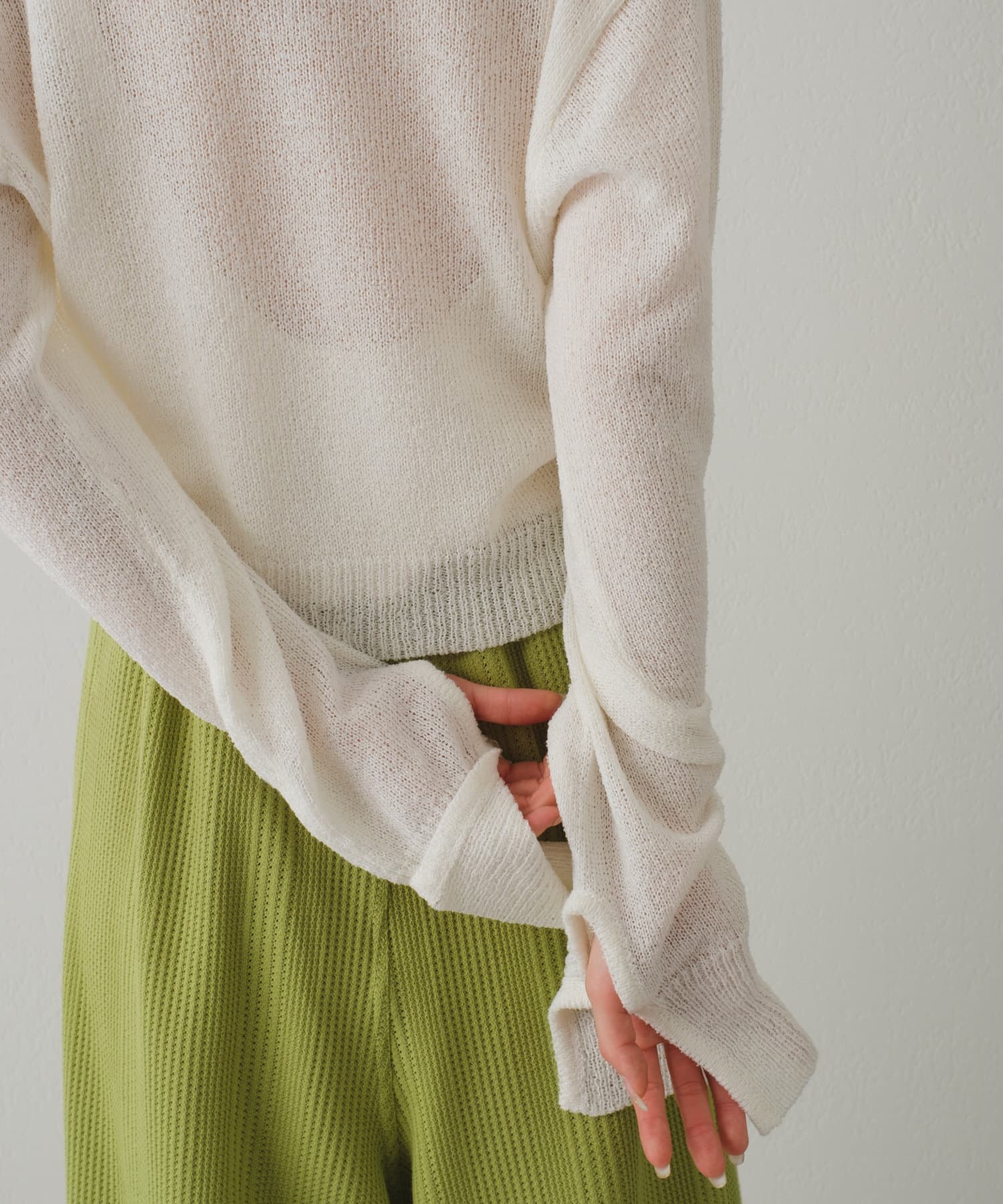 ニット素材ですが、透かし編みは通気性も良く、程よい透けが女性らしく着て頂けます。