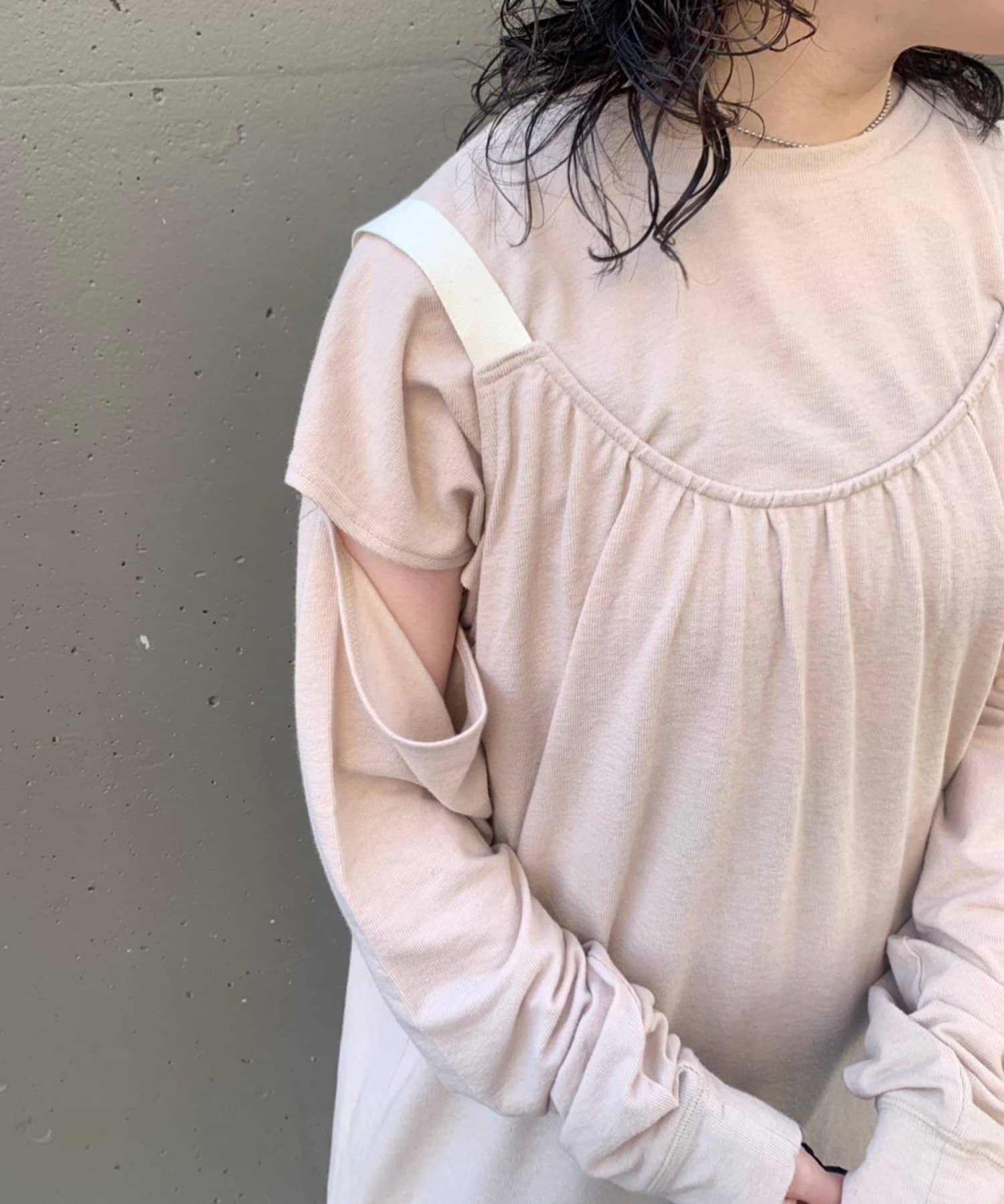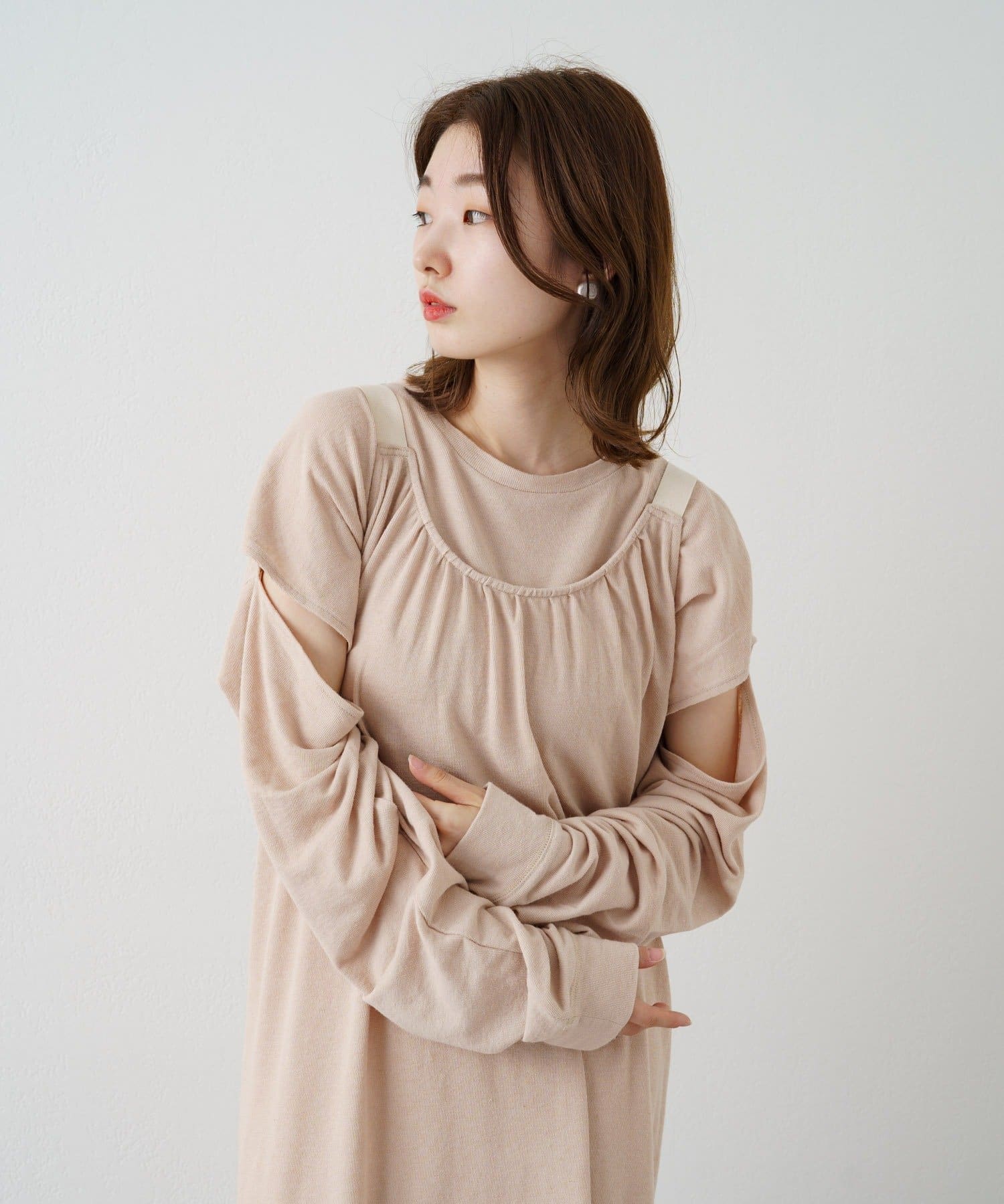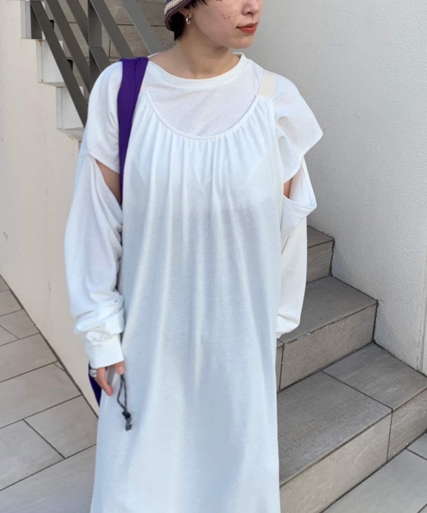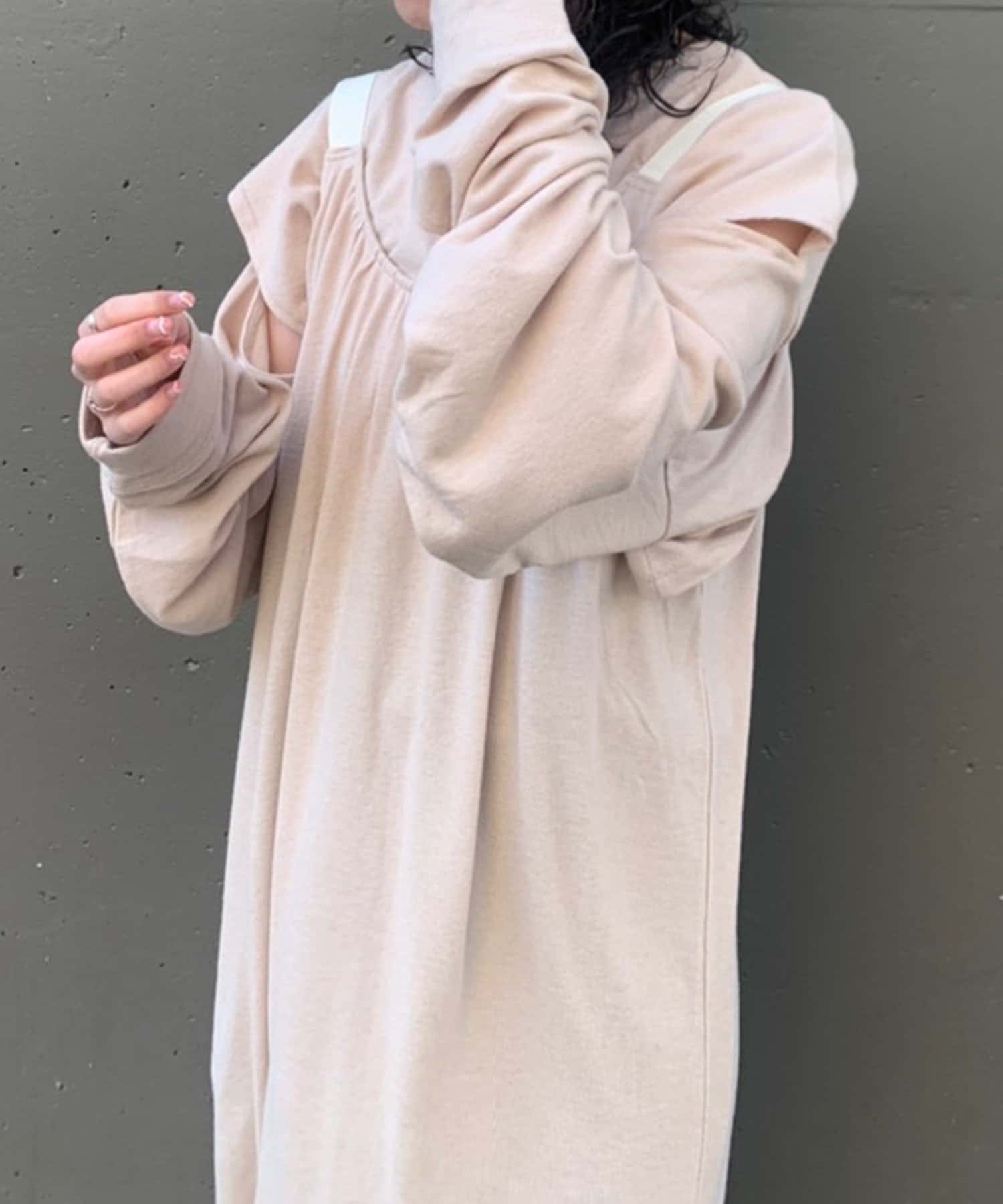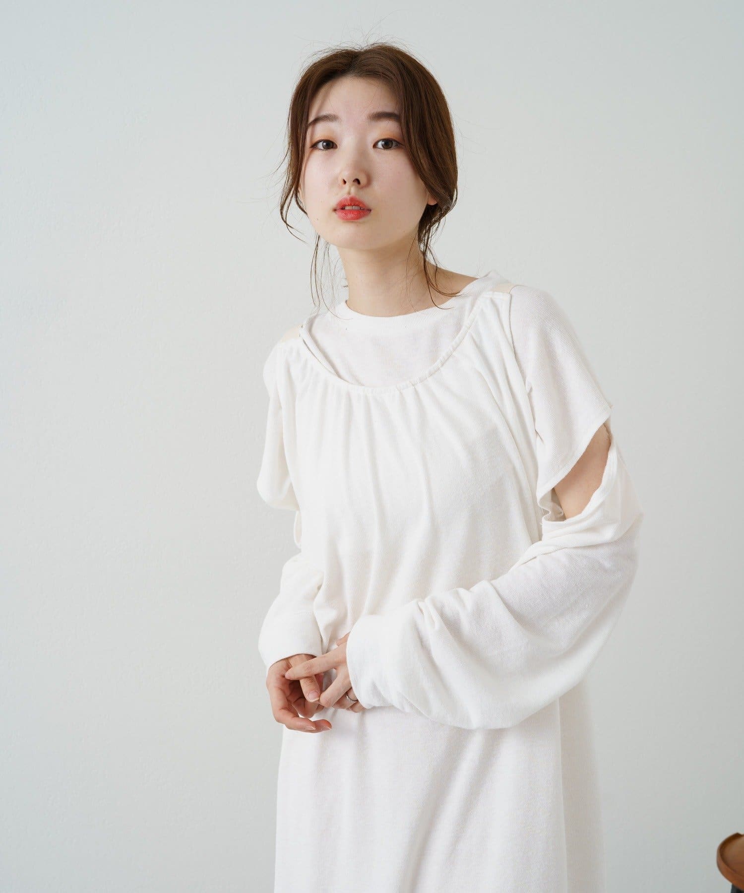 肩部分にスリットが入ったロンTと、ギャザーワンピースの同素材のアイテムがSETになった1着。