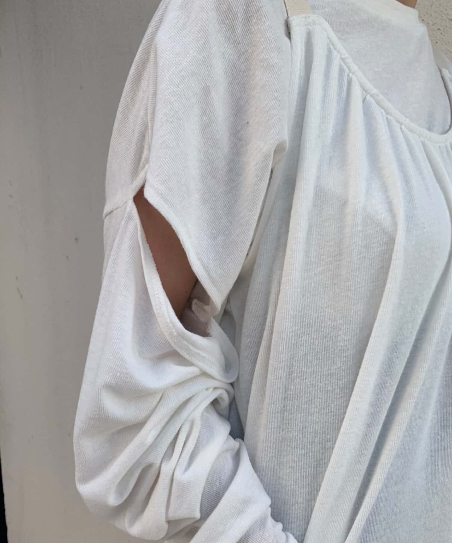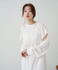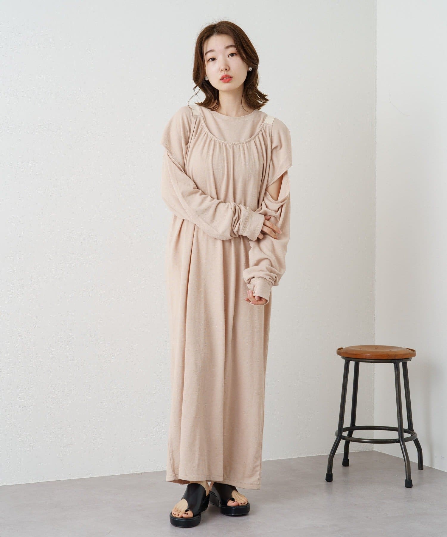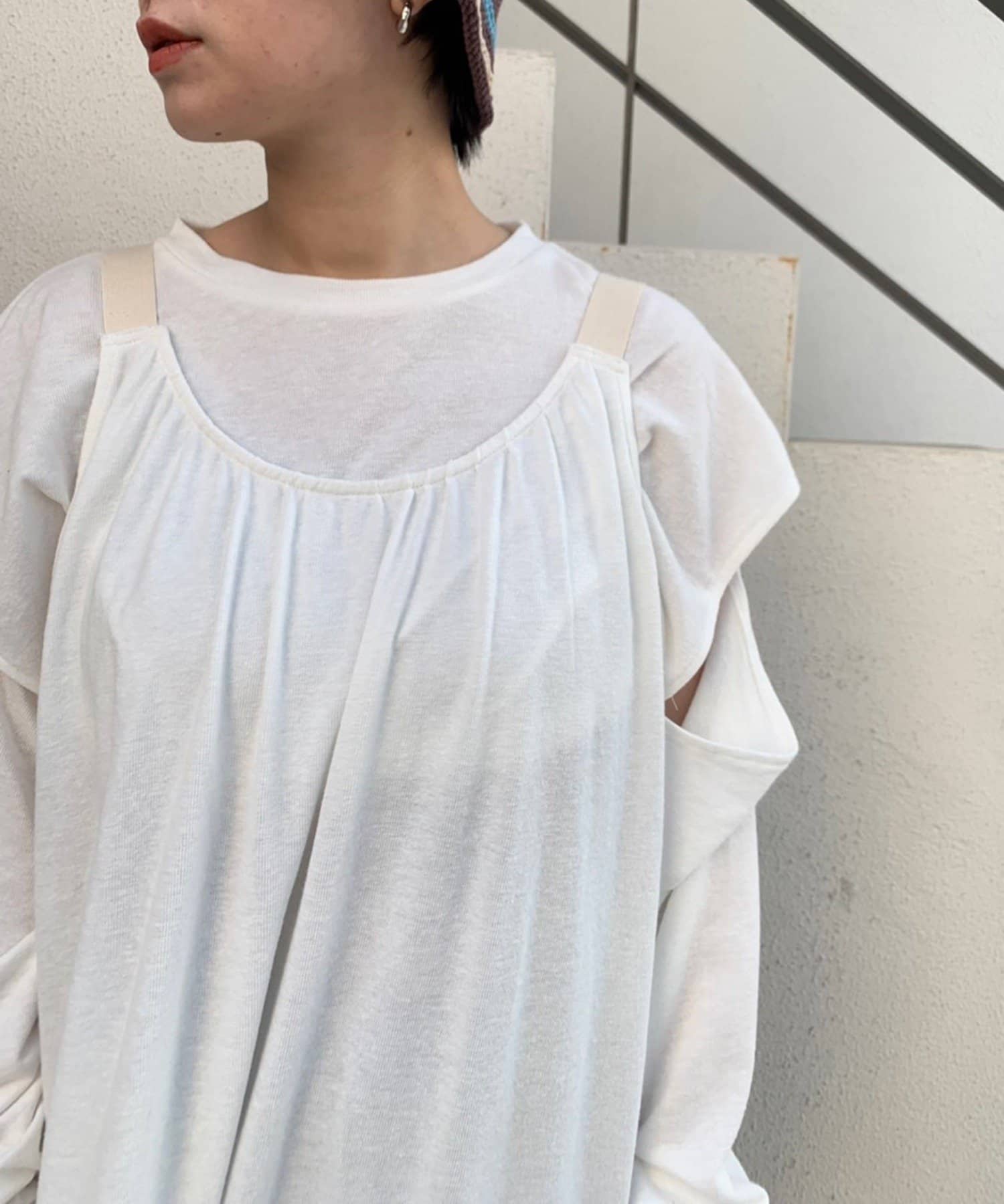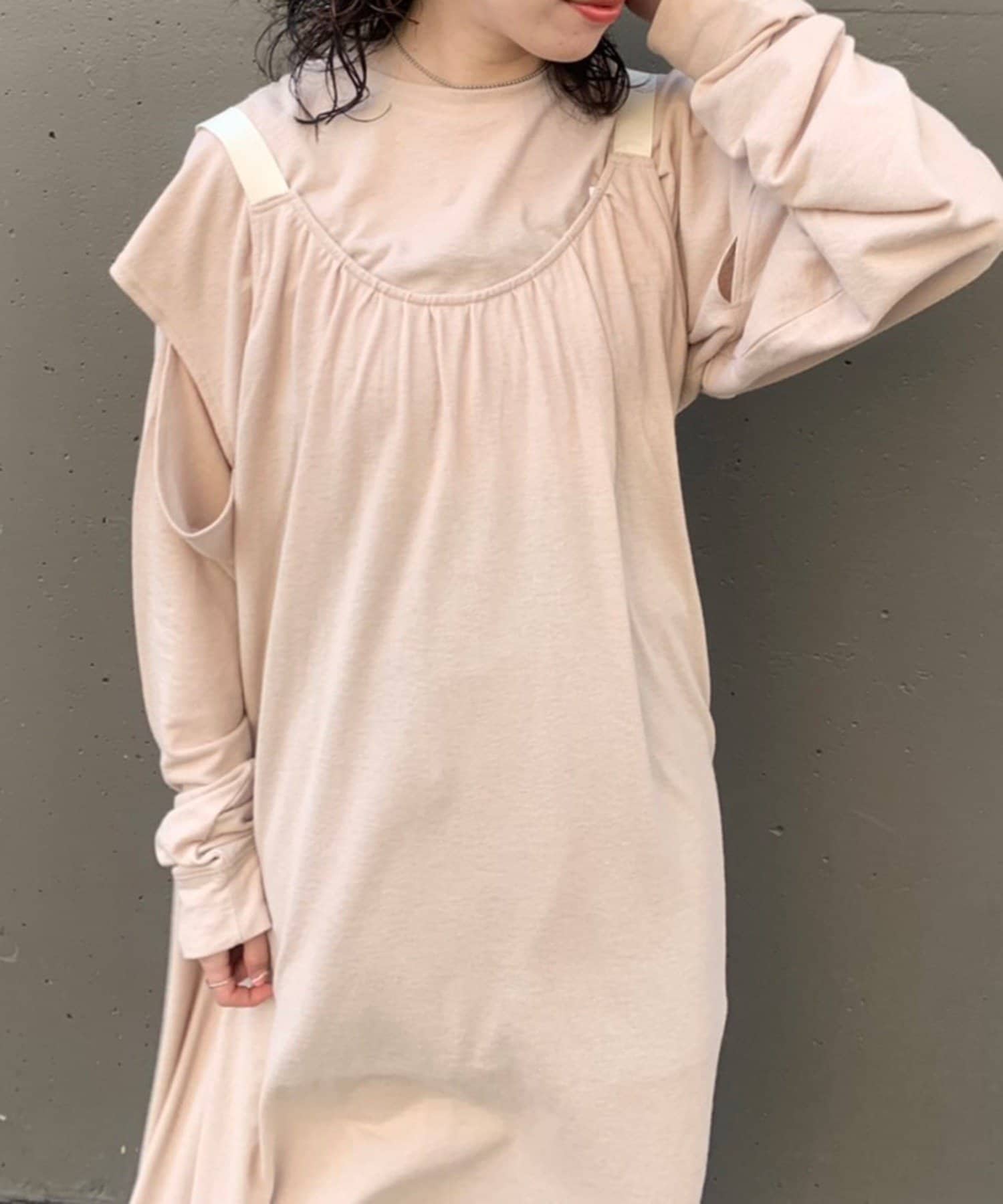 肩部分にスリットが入ったロンTと、ギャザーワンピースの同素材のアイテムがSETになった1着。