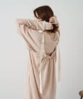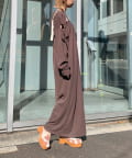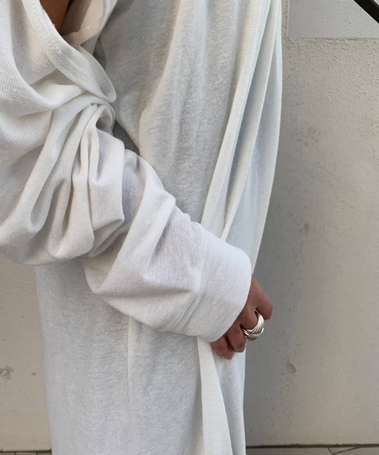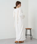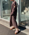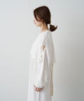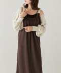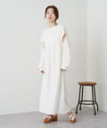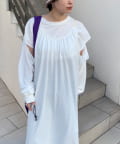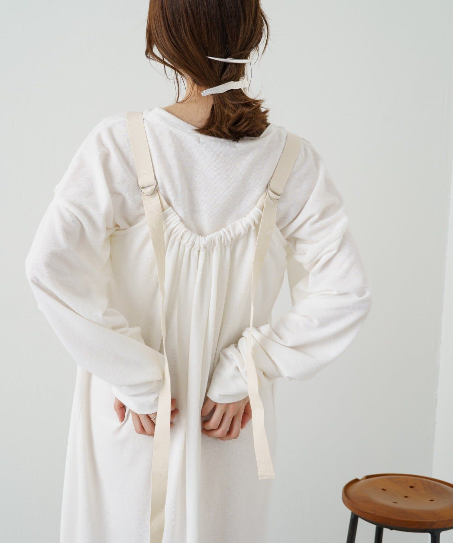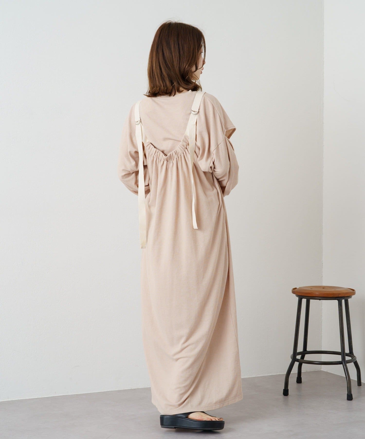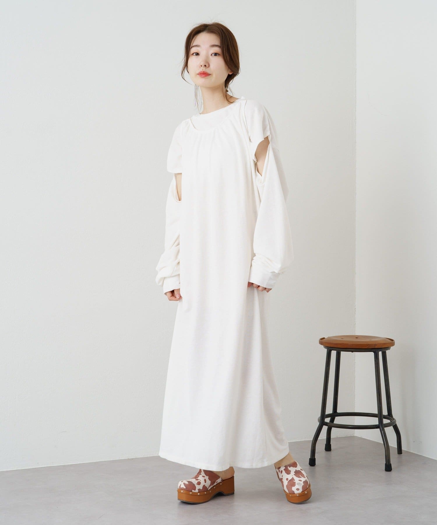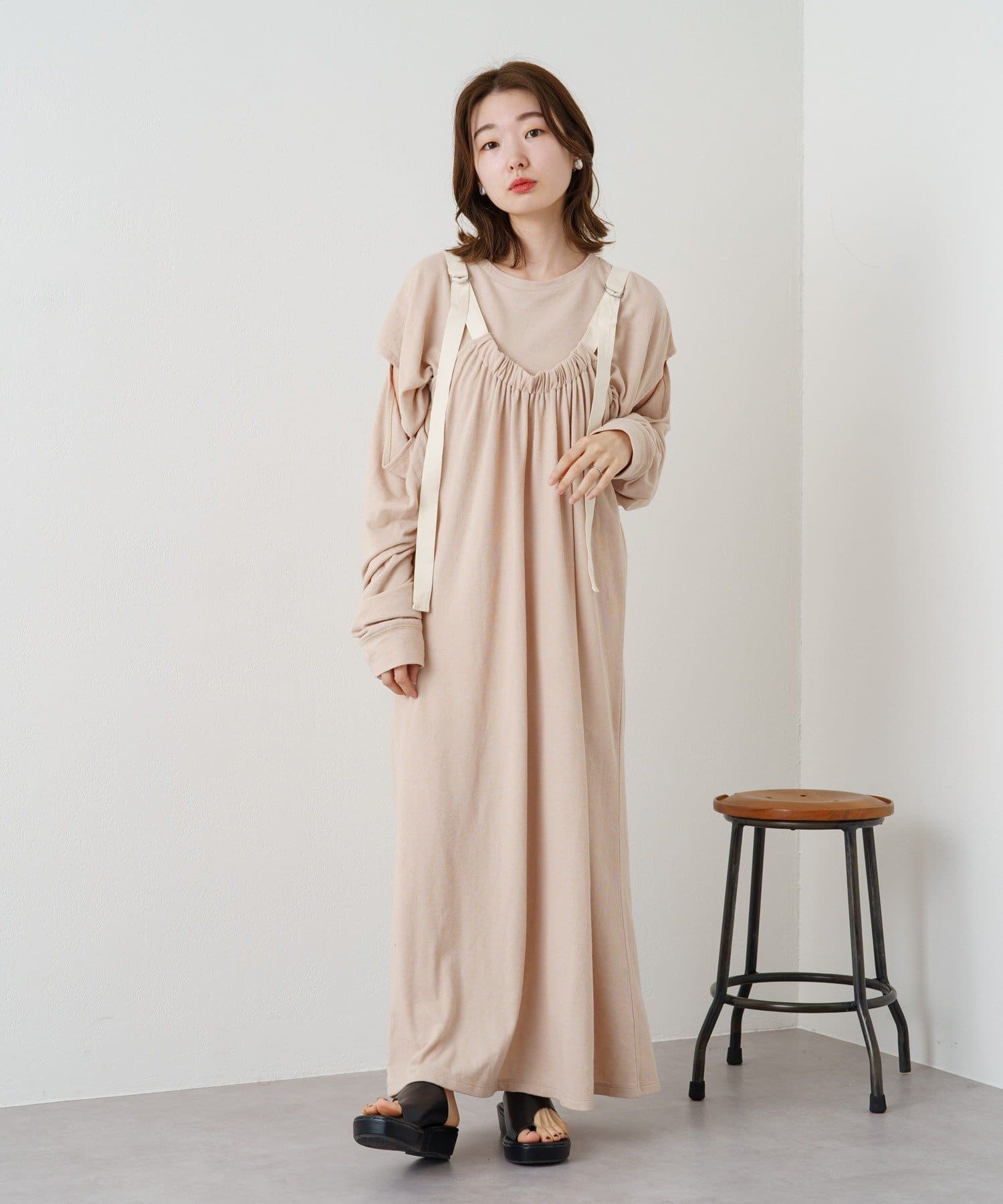 肩部分にスリットが入ったロンTと、ギャザーワンピースの同素材のアイテムがSETになった1着。