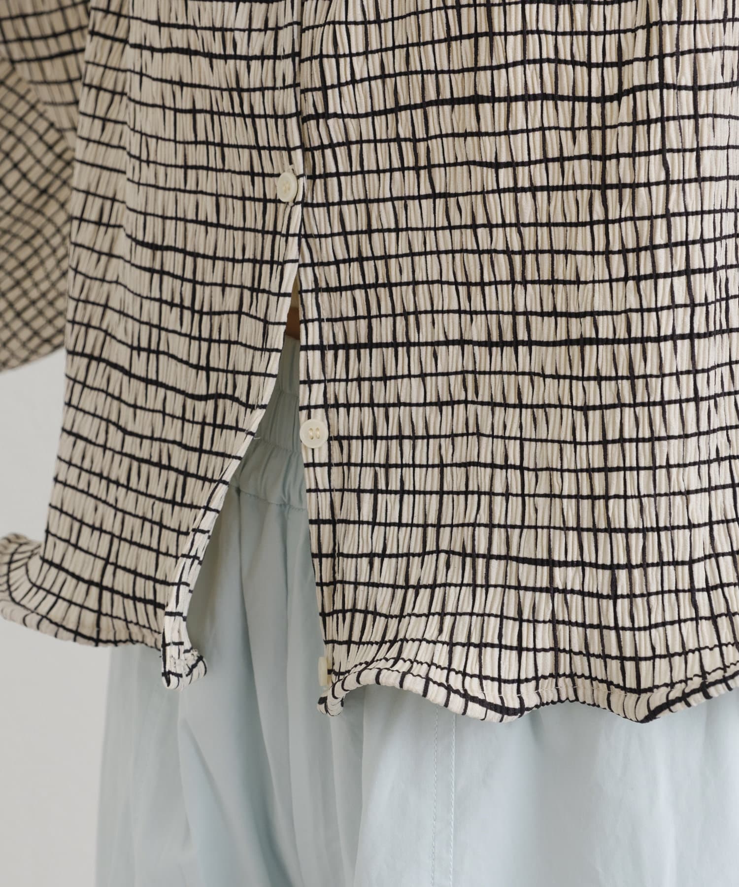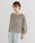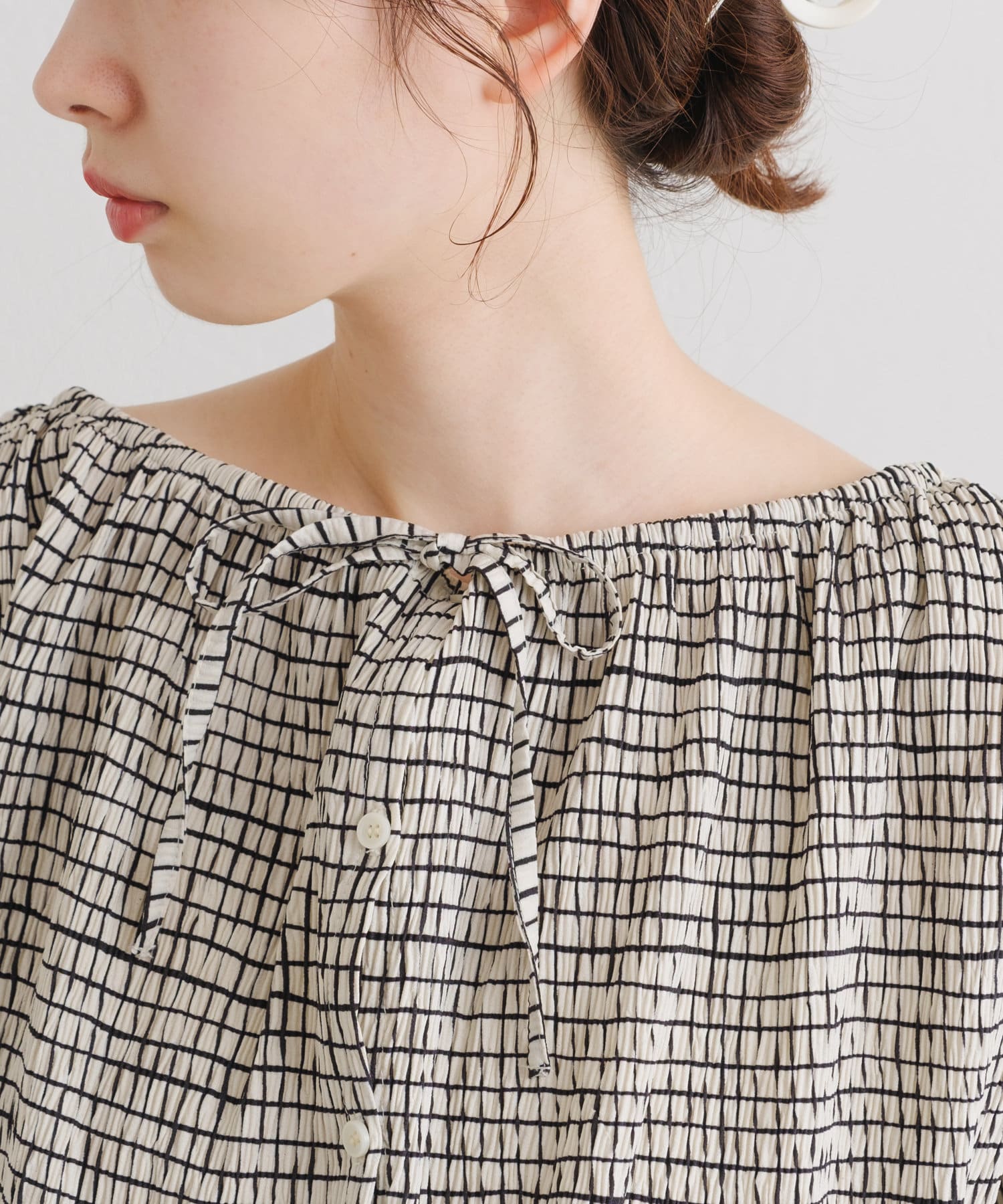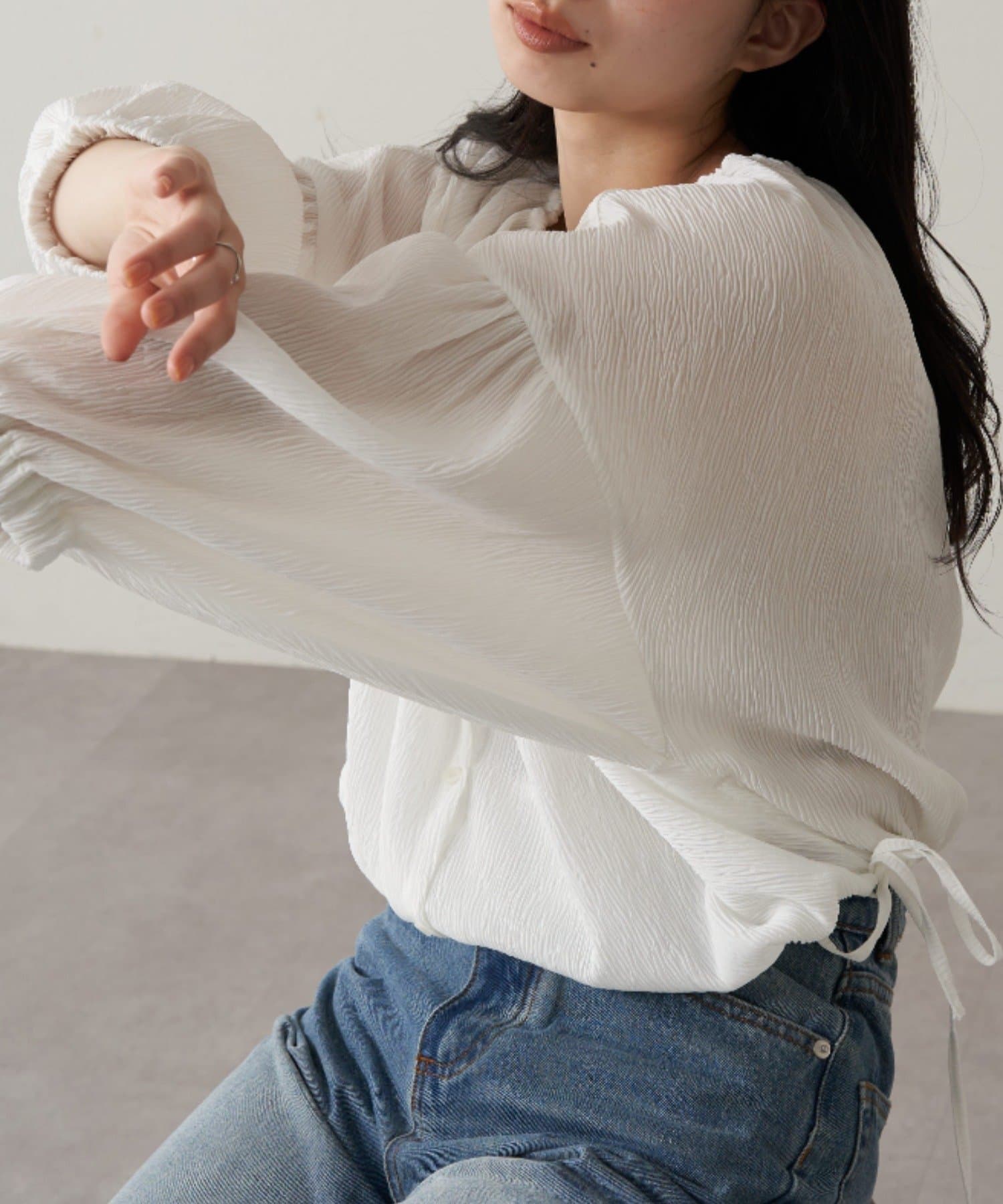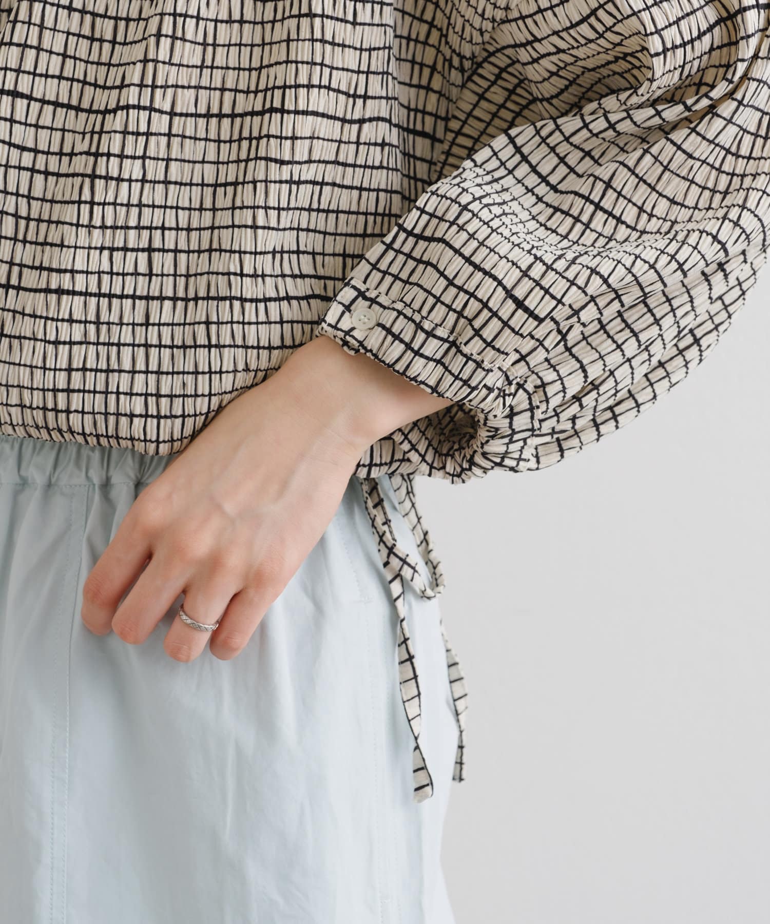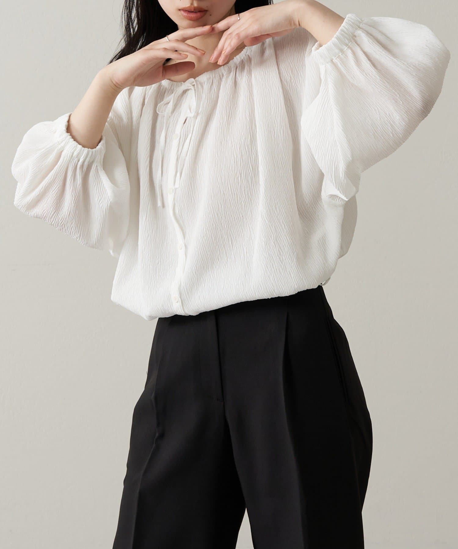 襟ギャザーが女性らしさを盛り立てるシャーリングブラウス