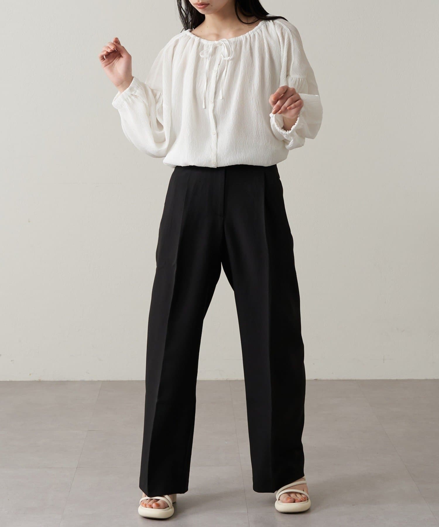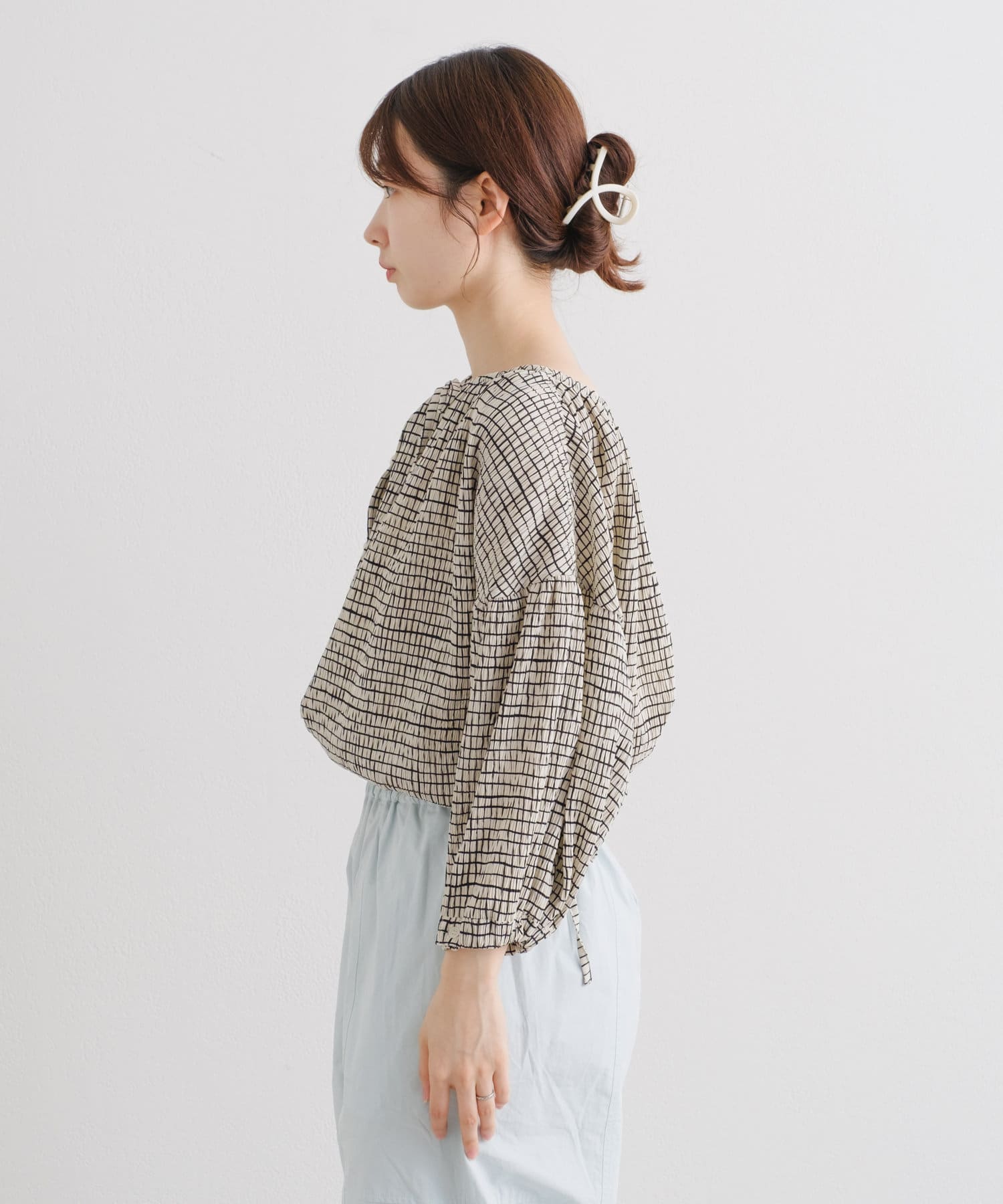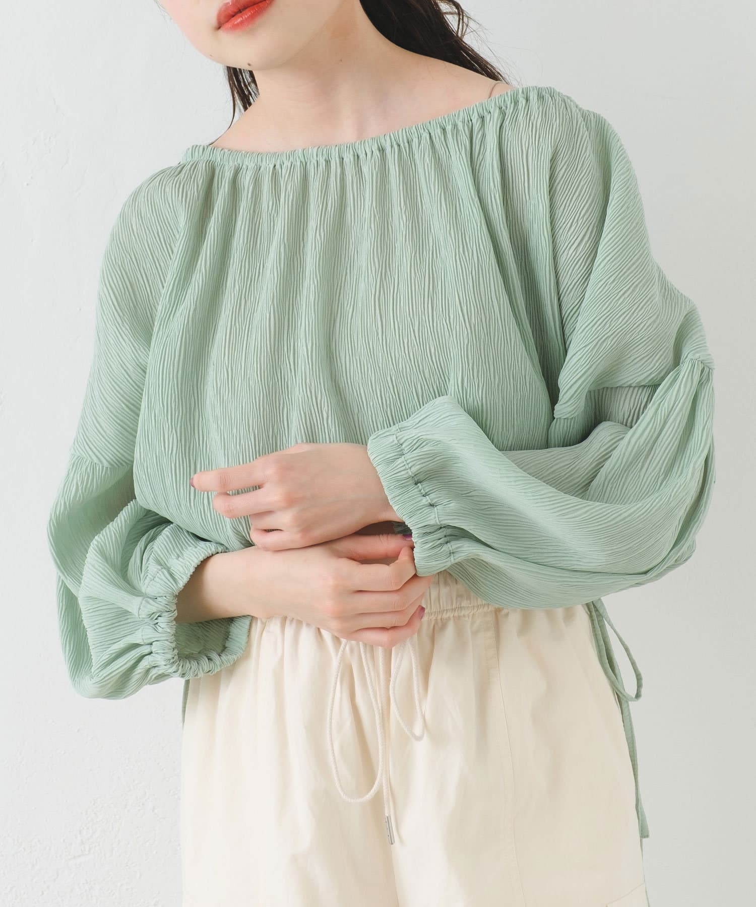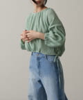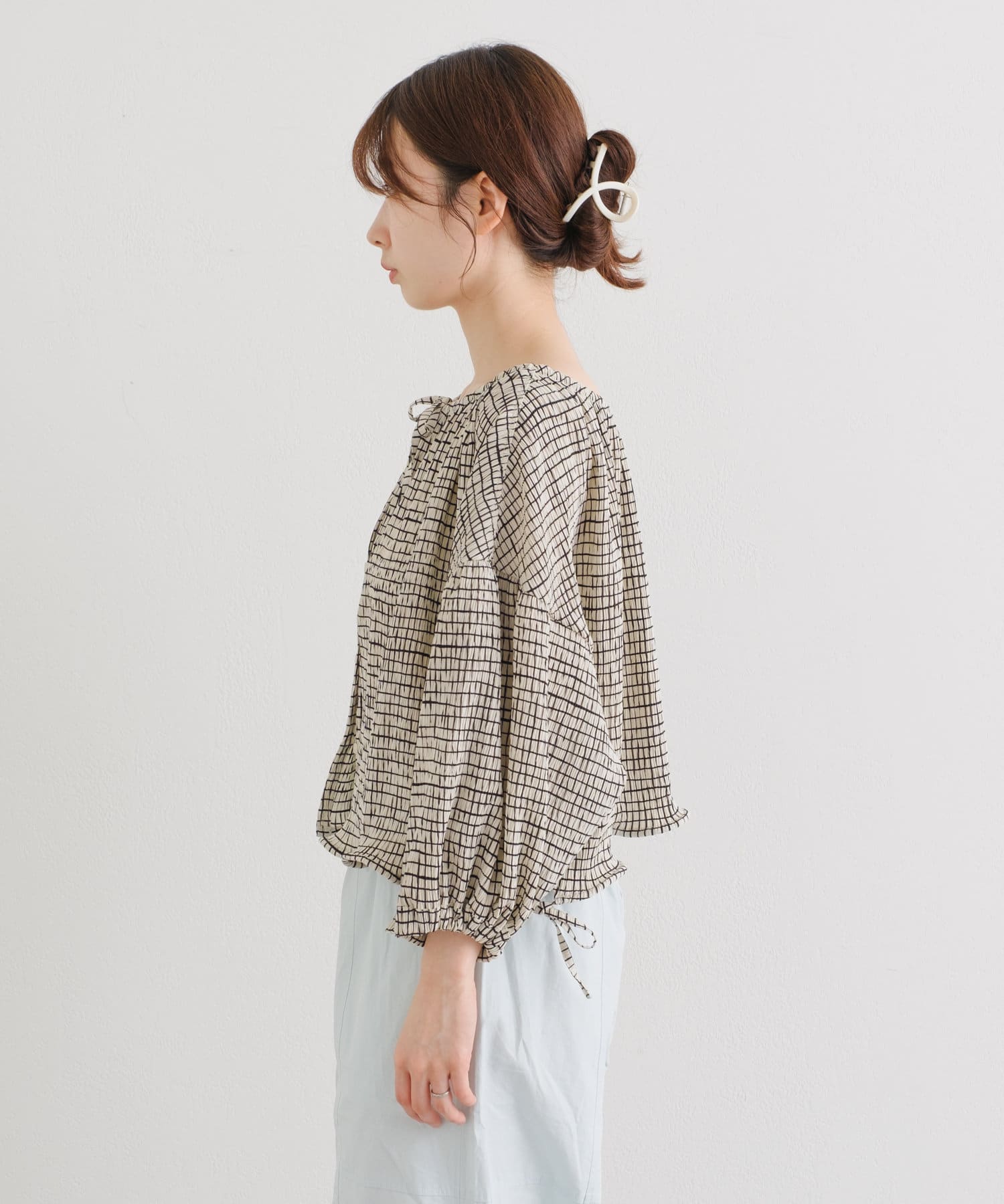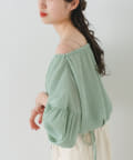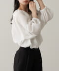 襟ギャザー、ボリューム袖、広めに開いた首周りが女性らしい印象に。