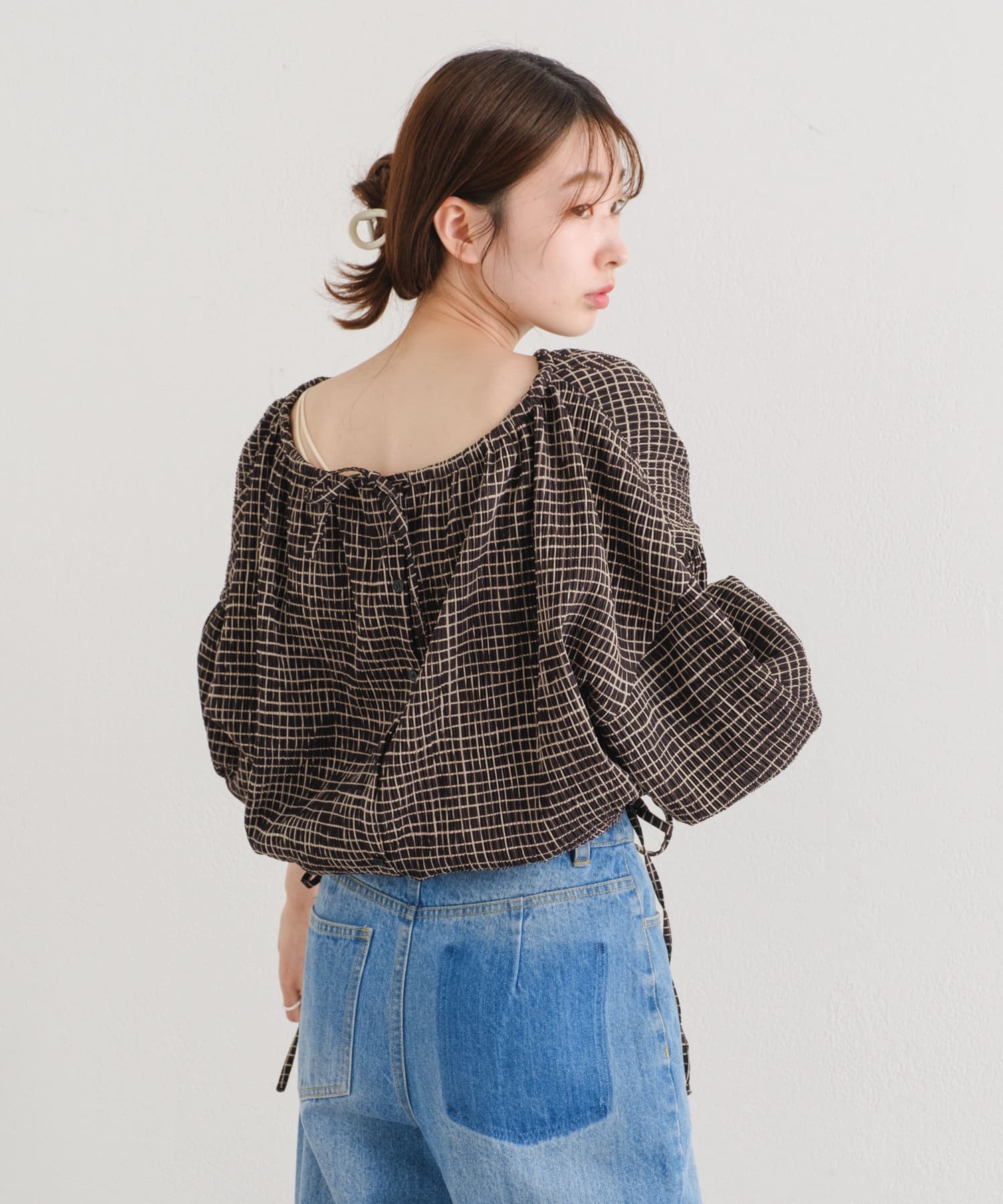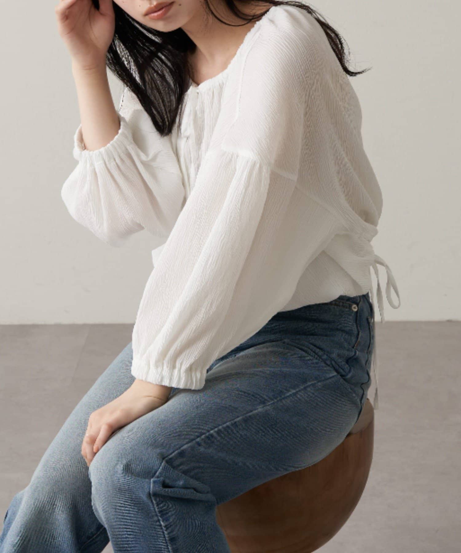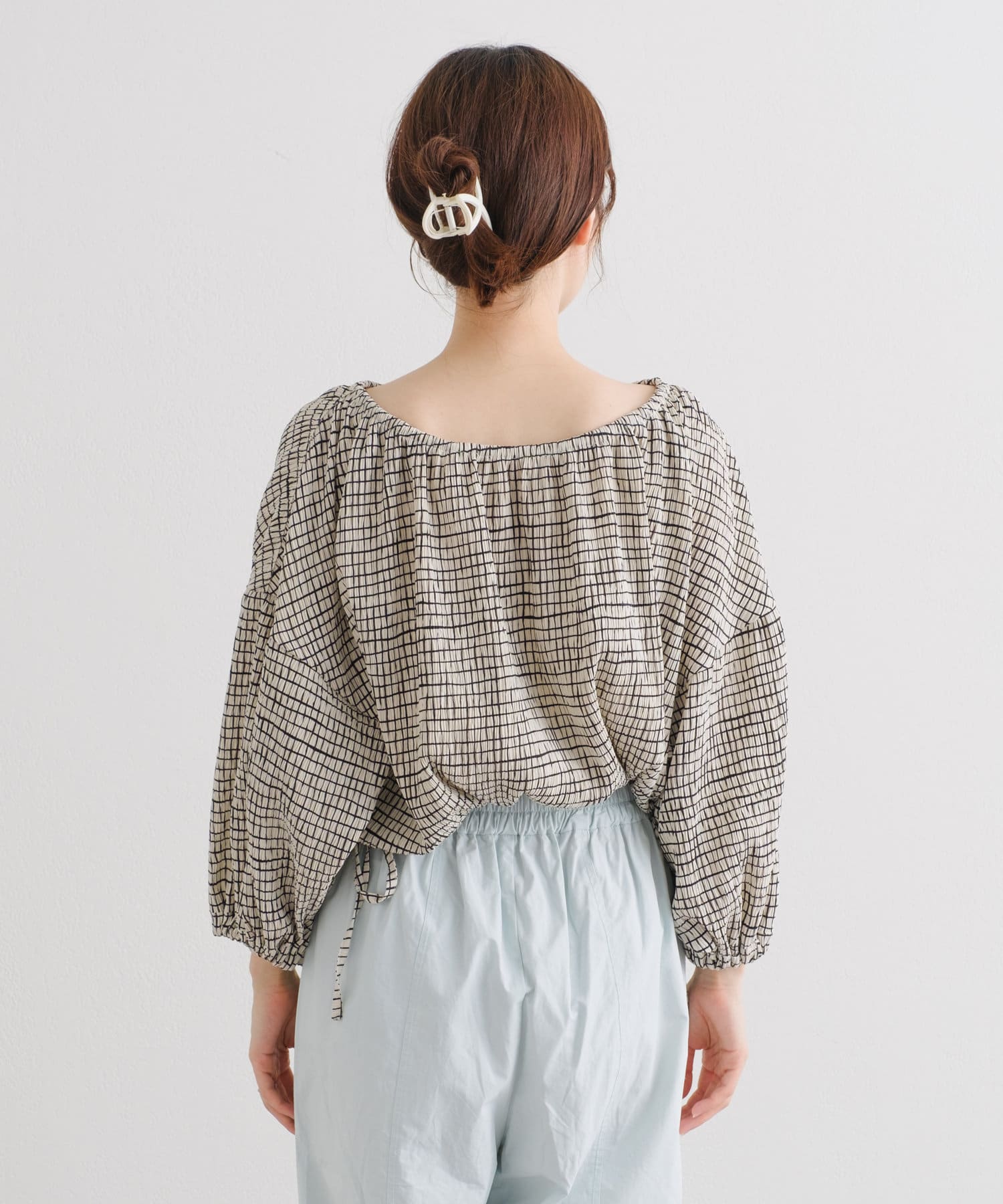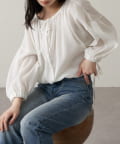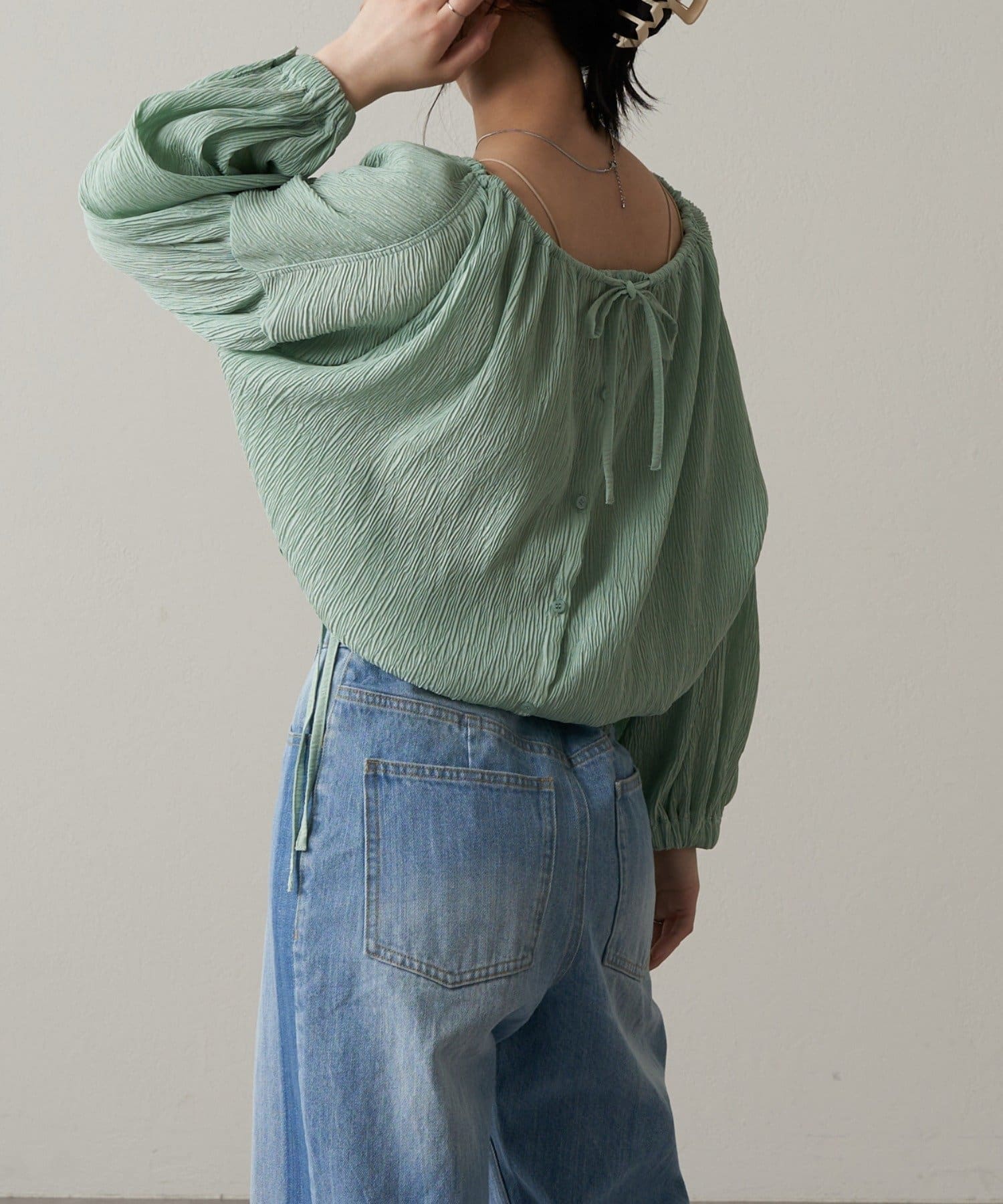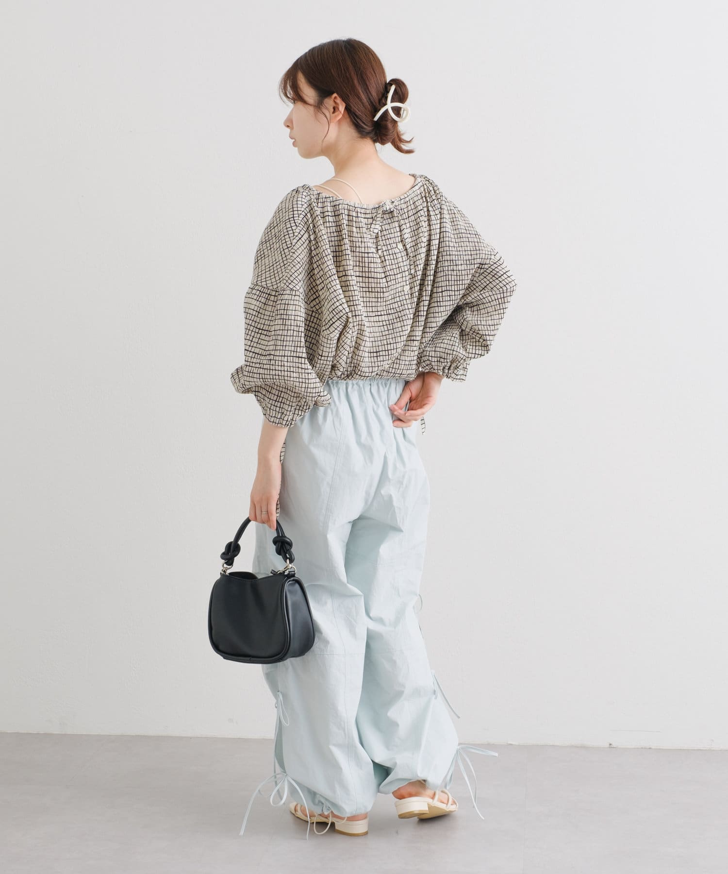 襟ギャザー、ボリューム袖、広めに開いた首周りが女性らしい印象に。