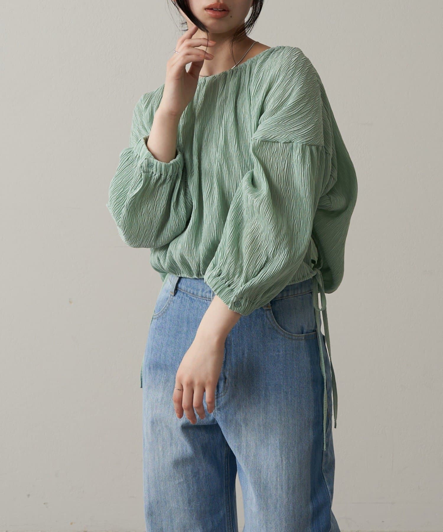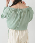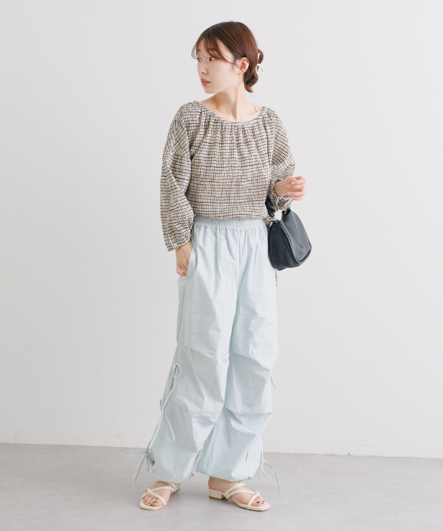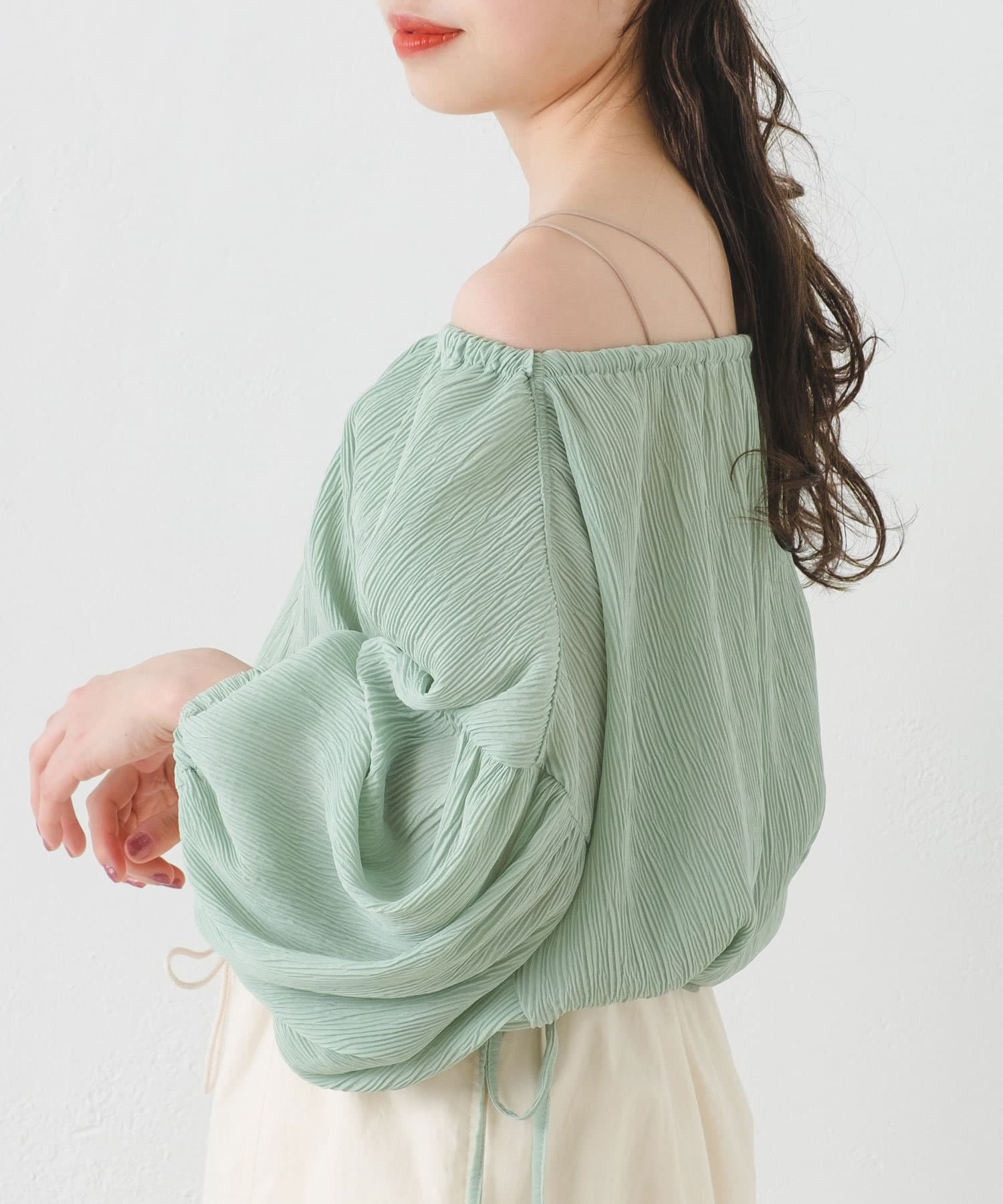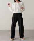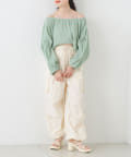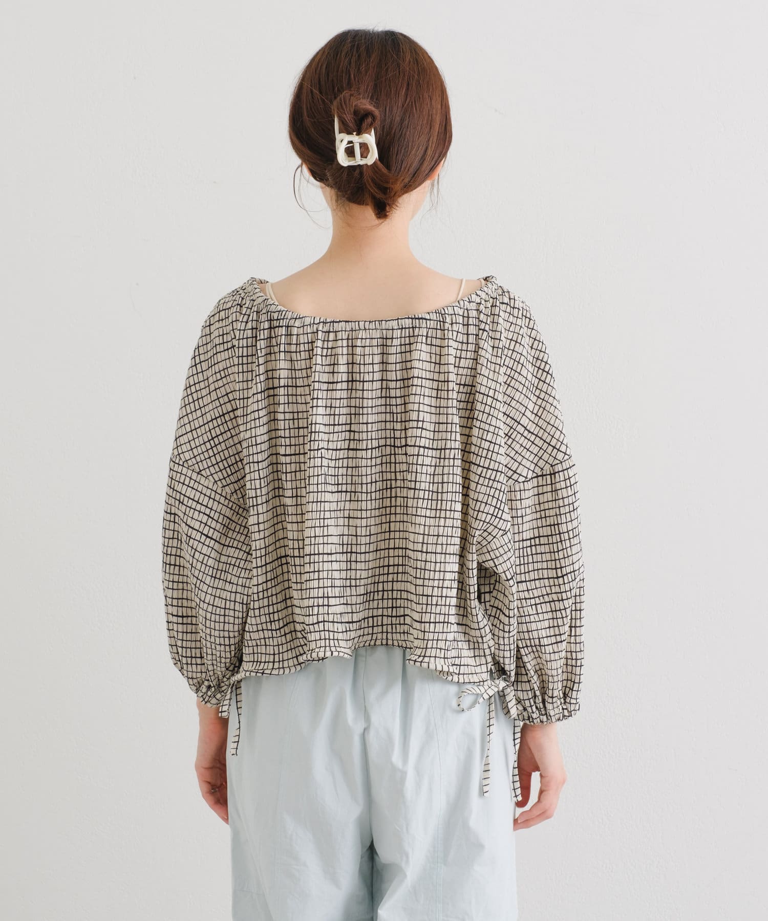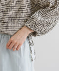 襟ギャザー、ボリューム袖、広めに開いた首周りが女性らしい印象に。