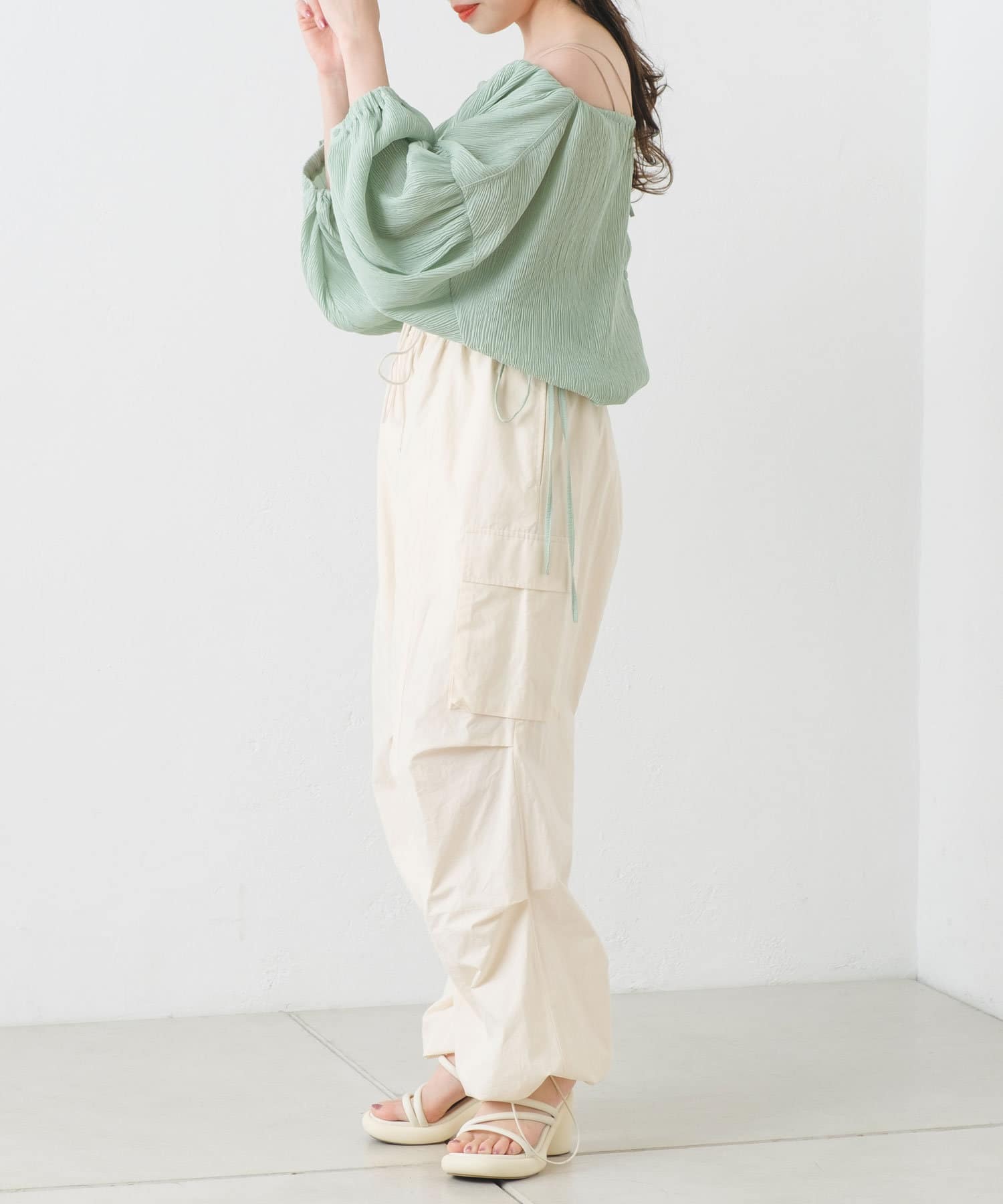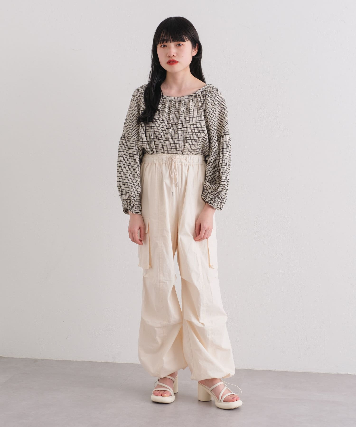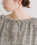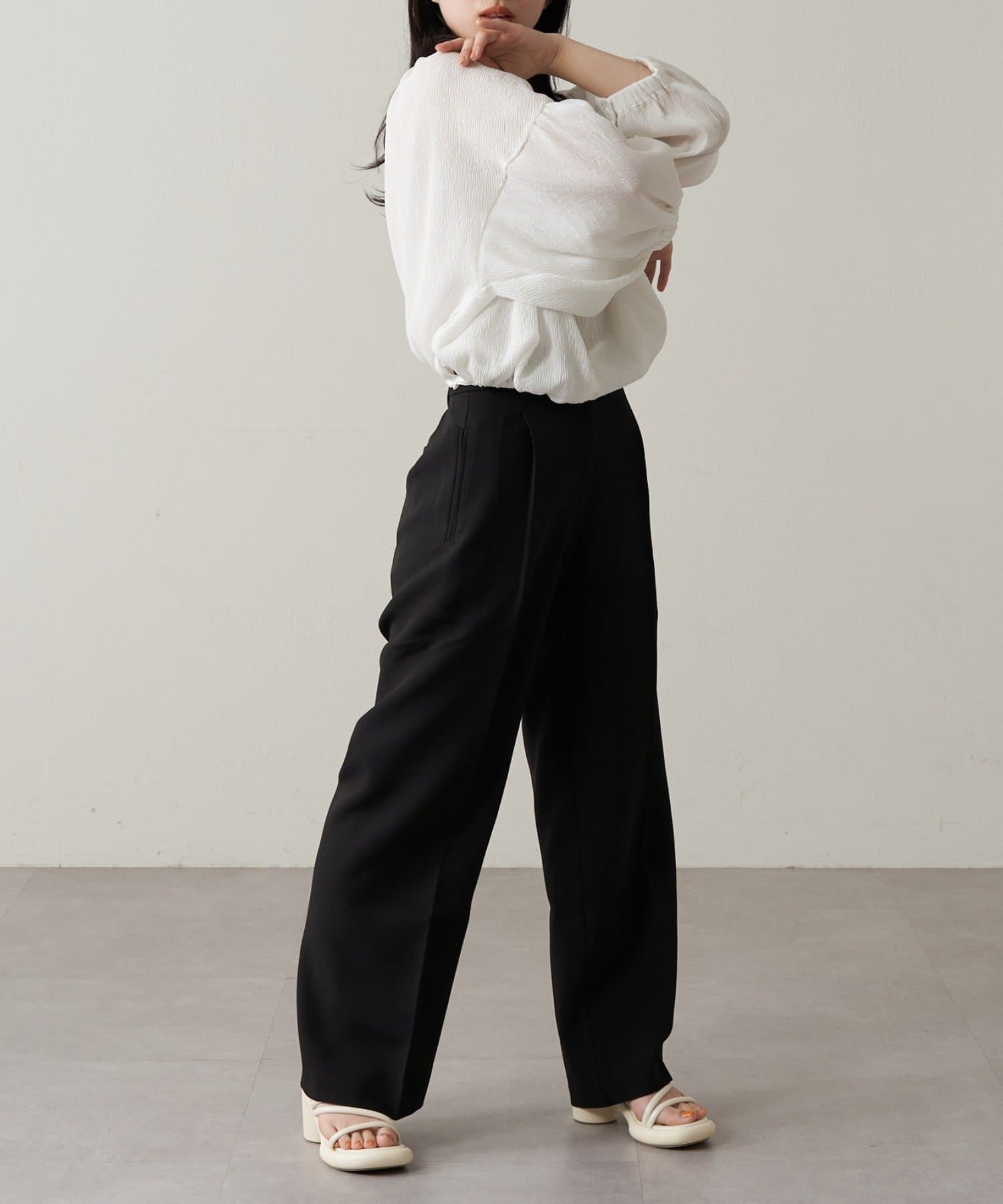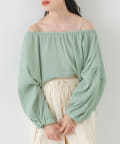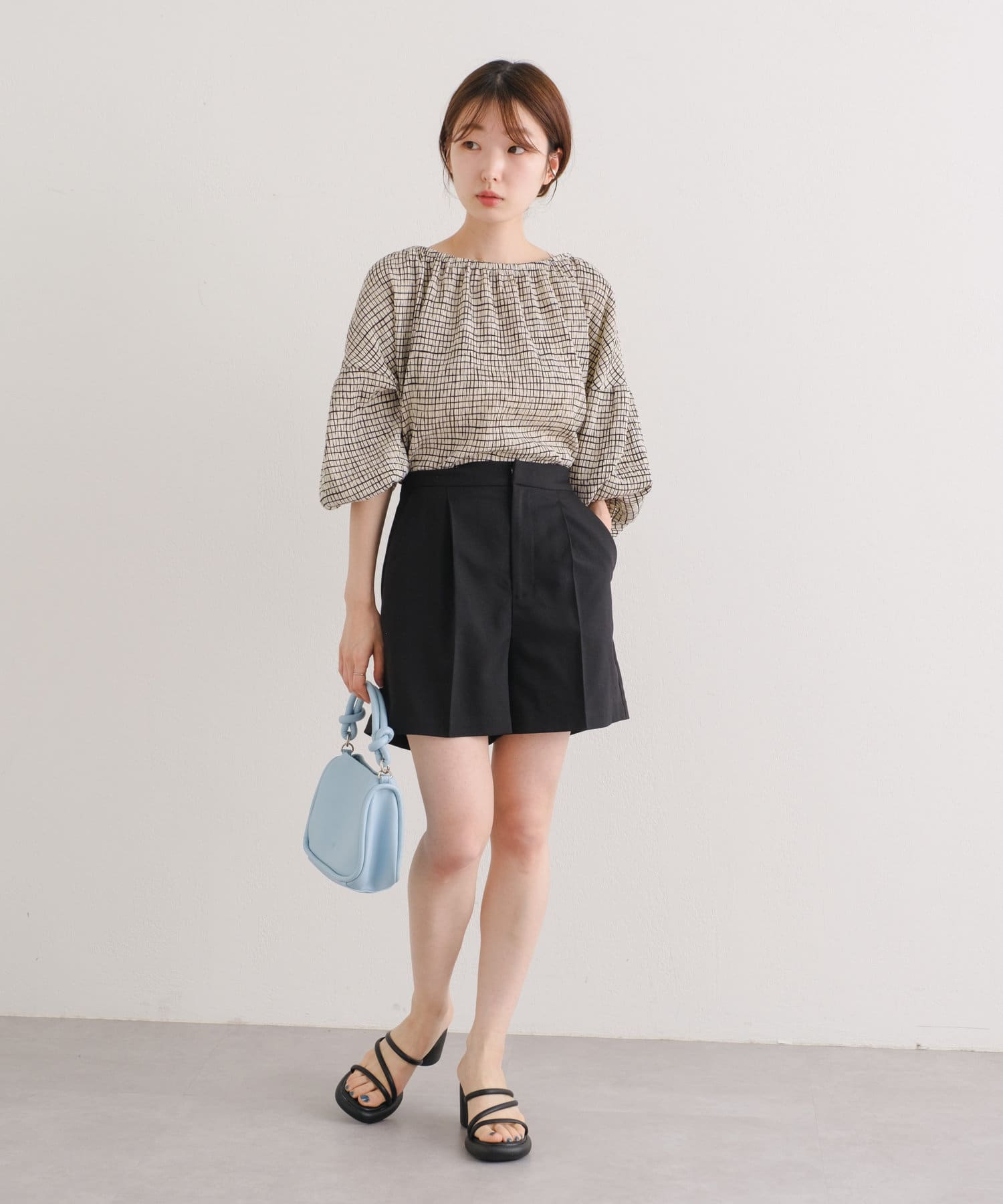 襟ギャザー、ボリューム袖、広めに開いた首周りが女性らしい印象に。