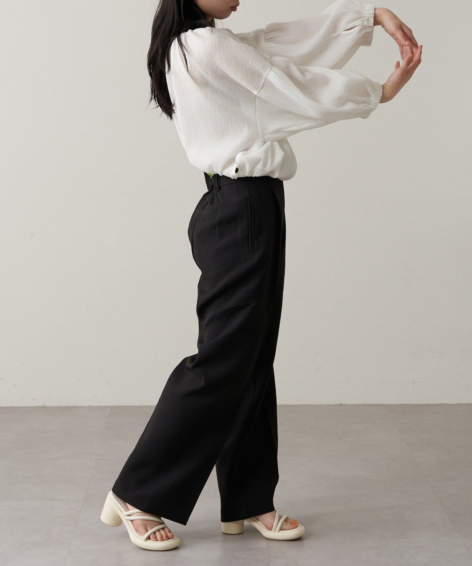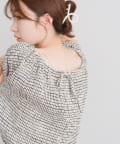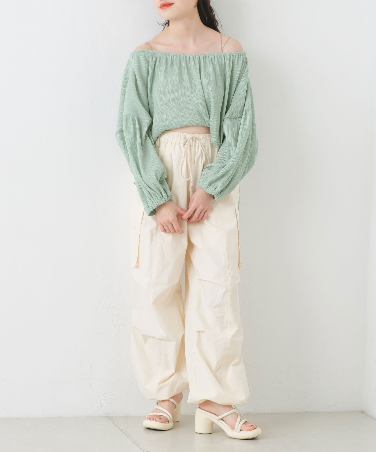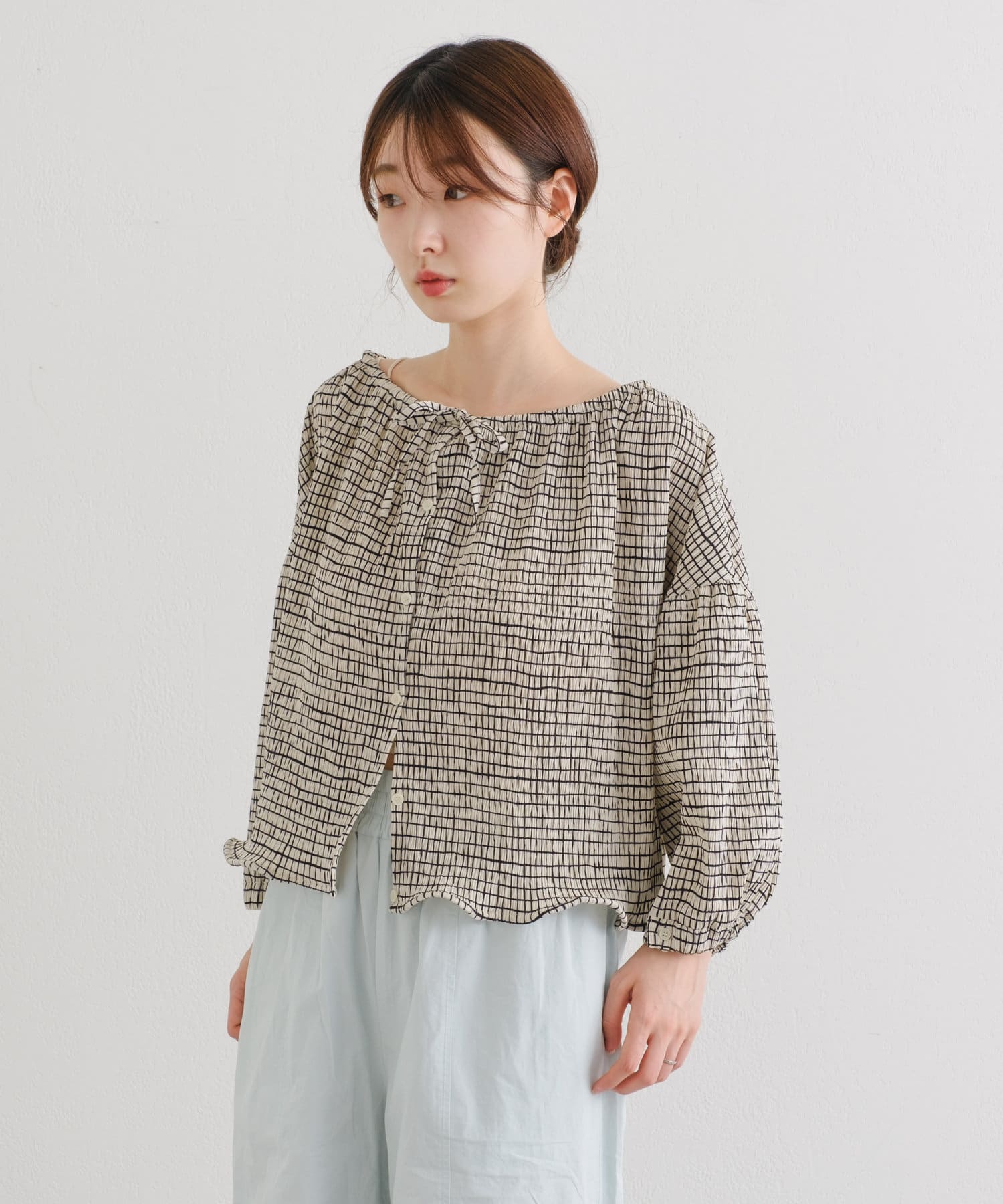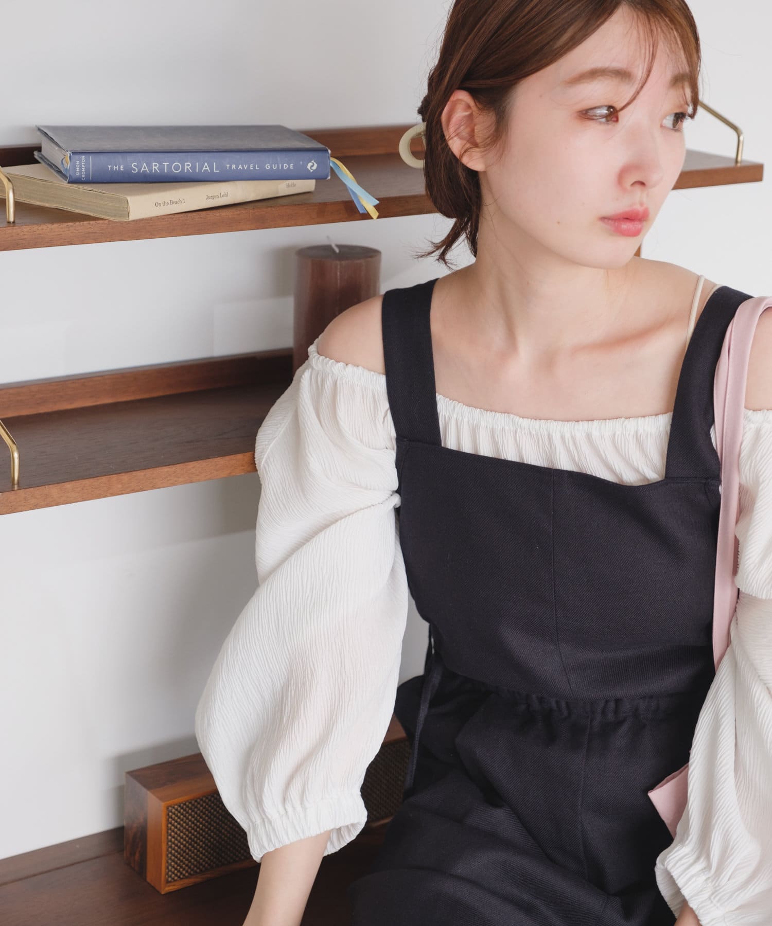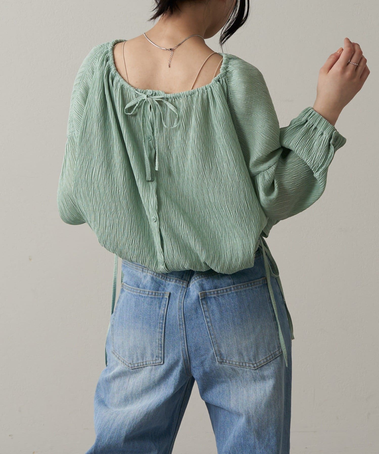 襟ギャザー、ボリューム袖、広めに開いた首周りが女性らしい印象に。