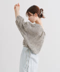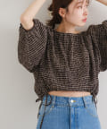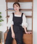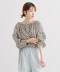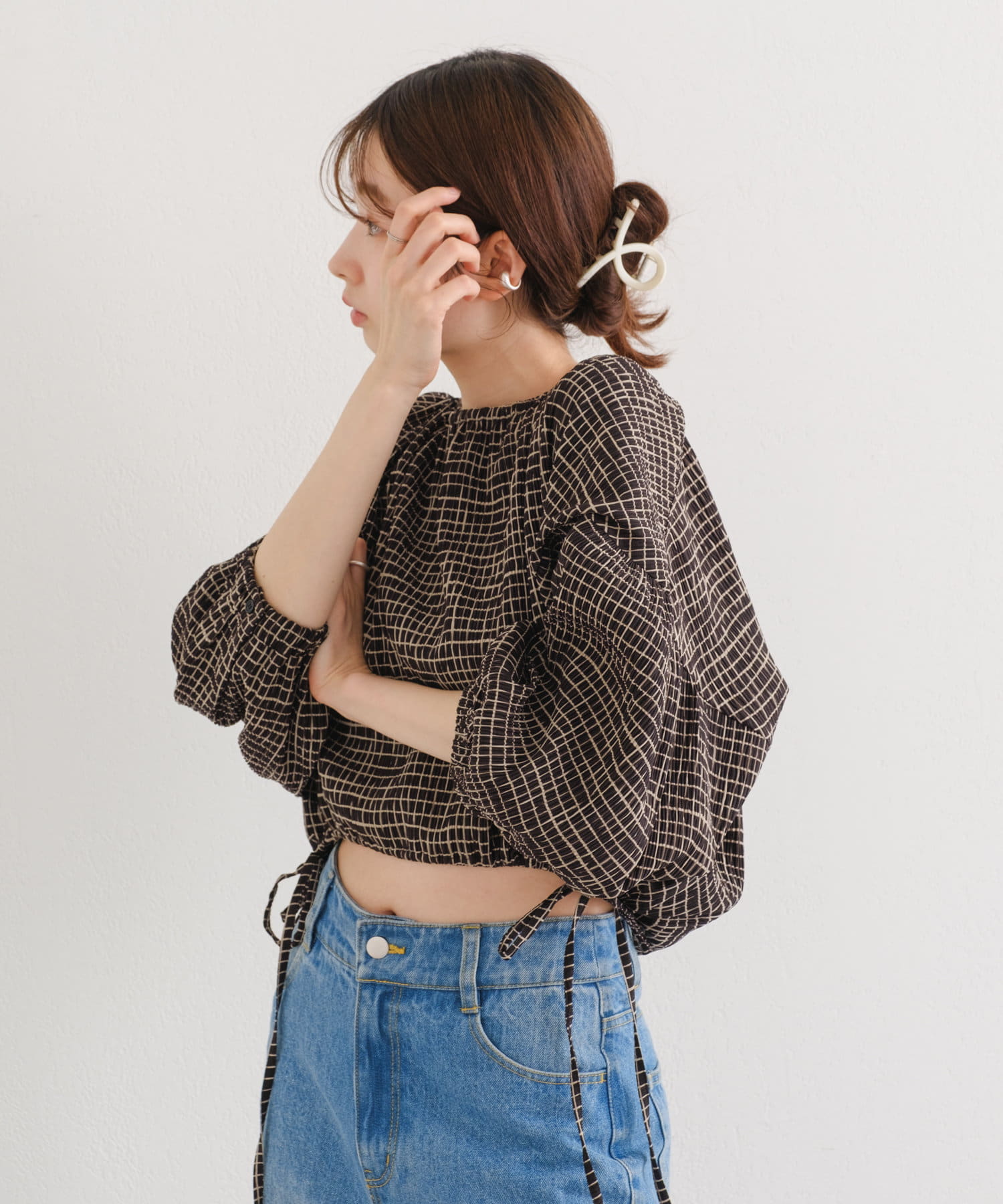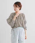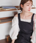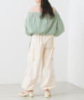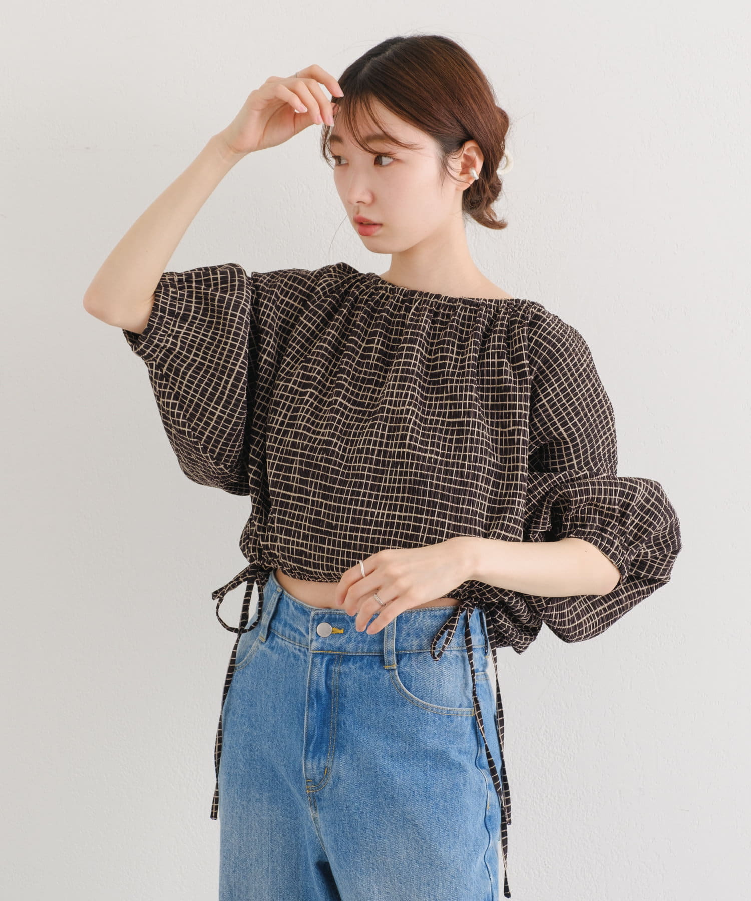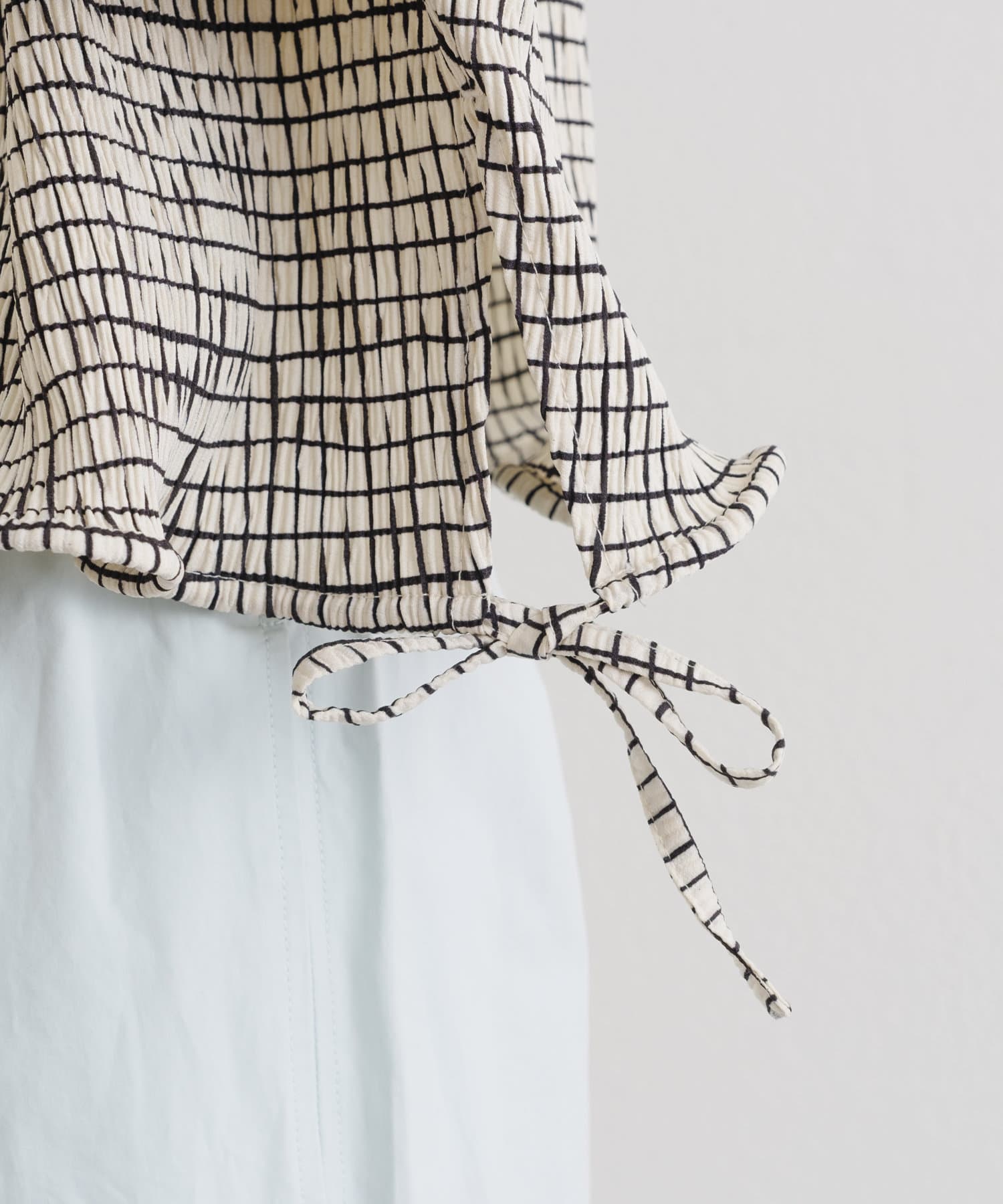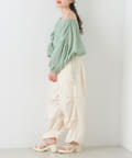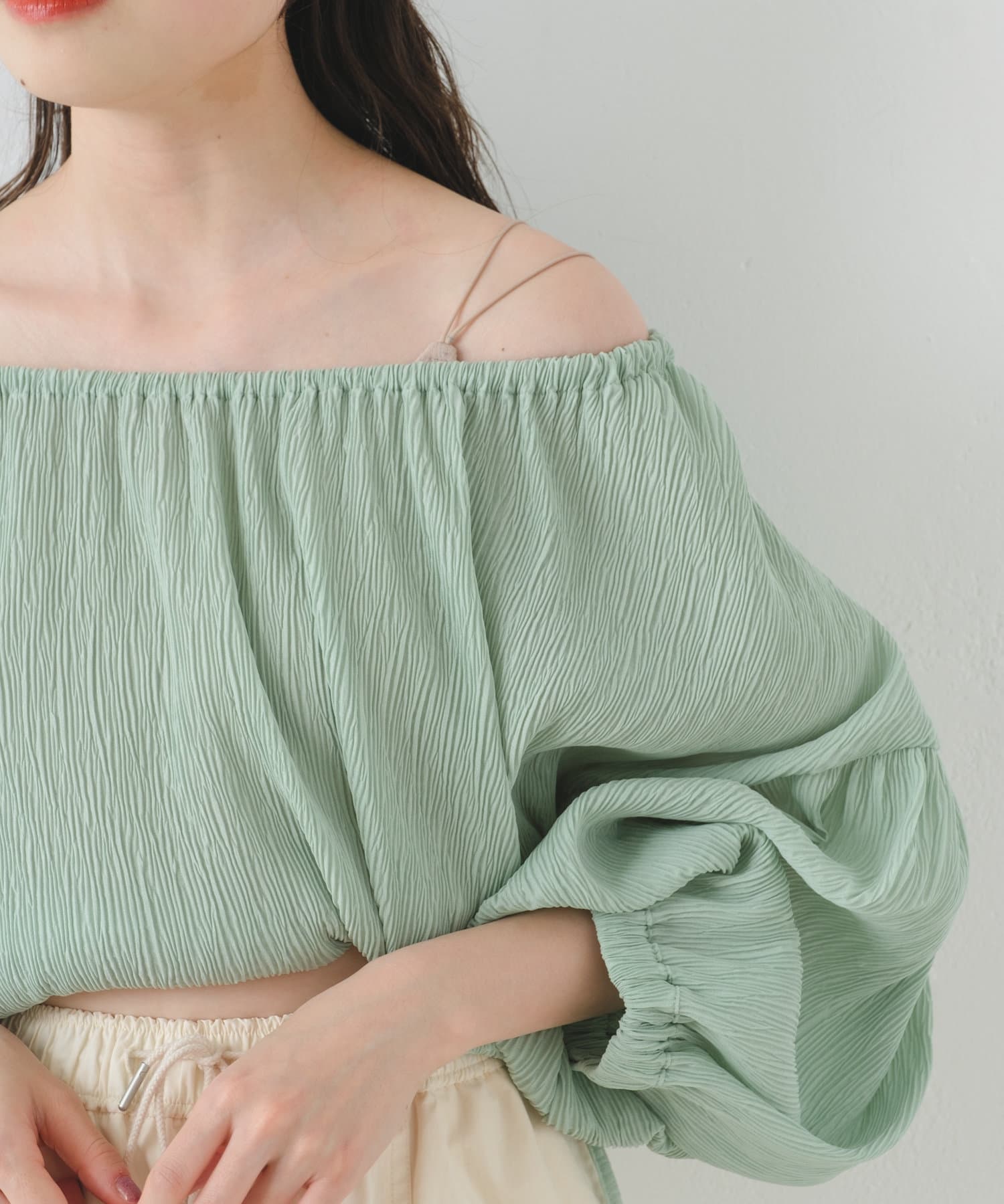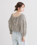 襟ギャザー、ボリューム袖、広めに開いた首周りが女性らしい印象に。