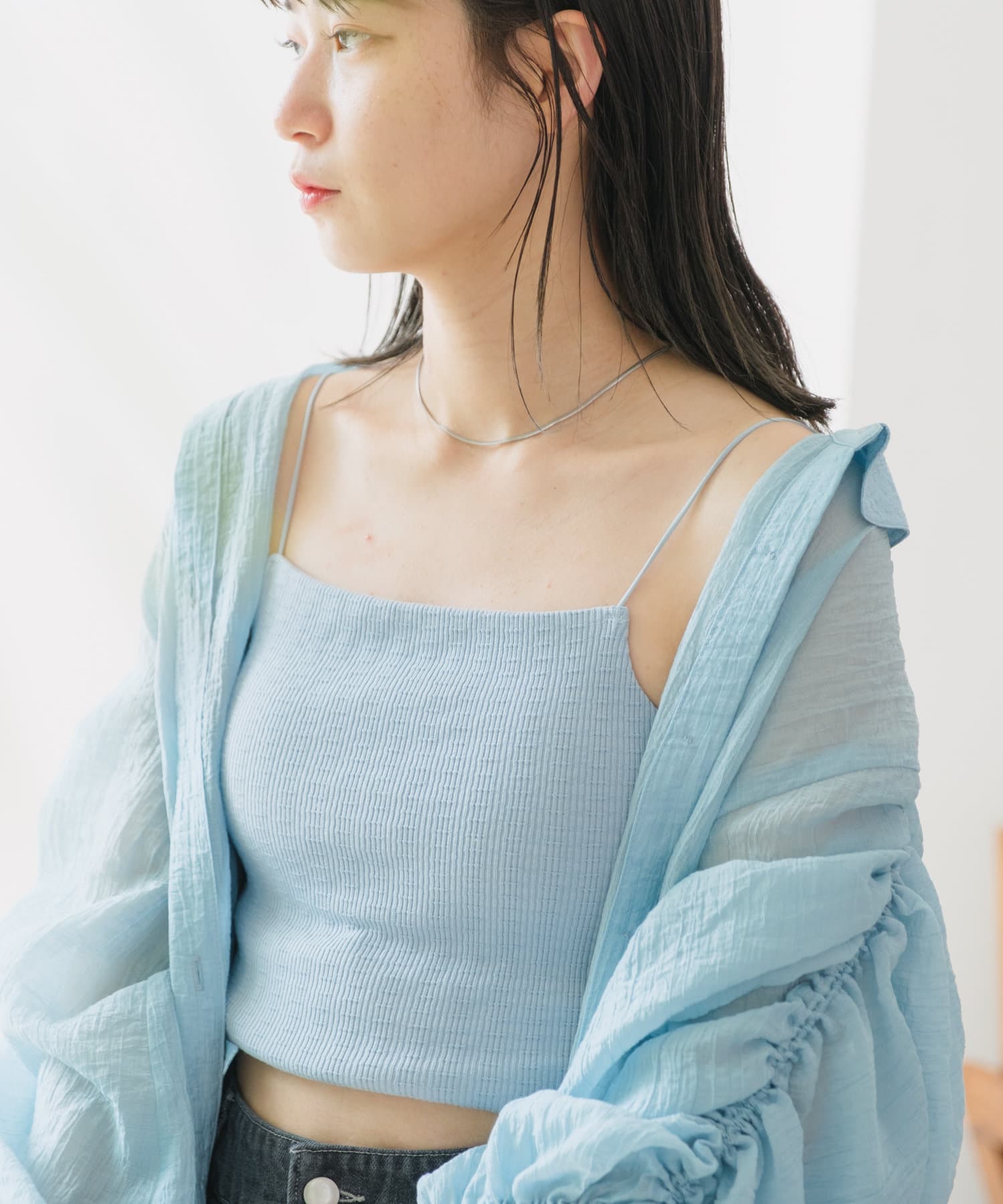 シャツやジャケットなどのインナーとして、真夏には一枚でトップスとしてもオススメです。