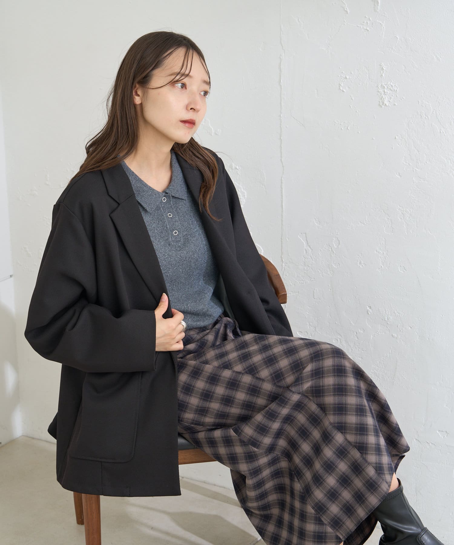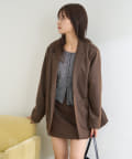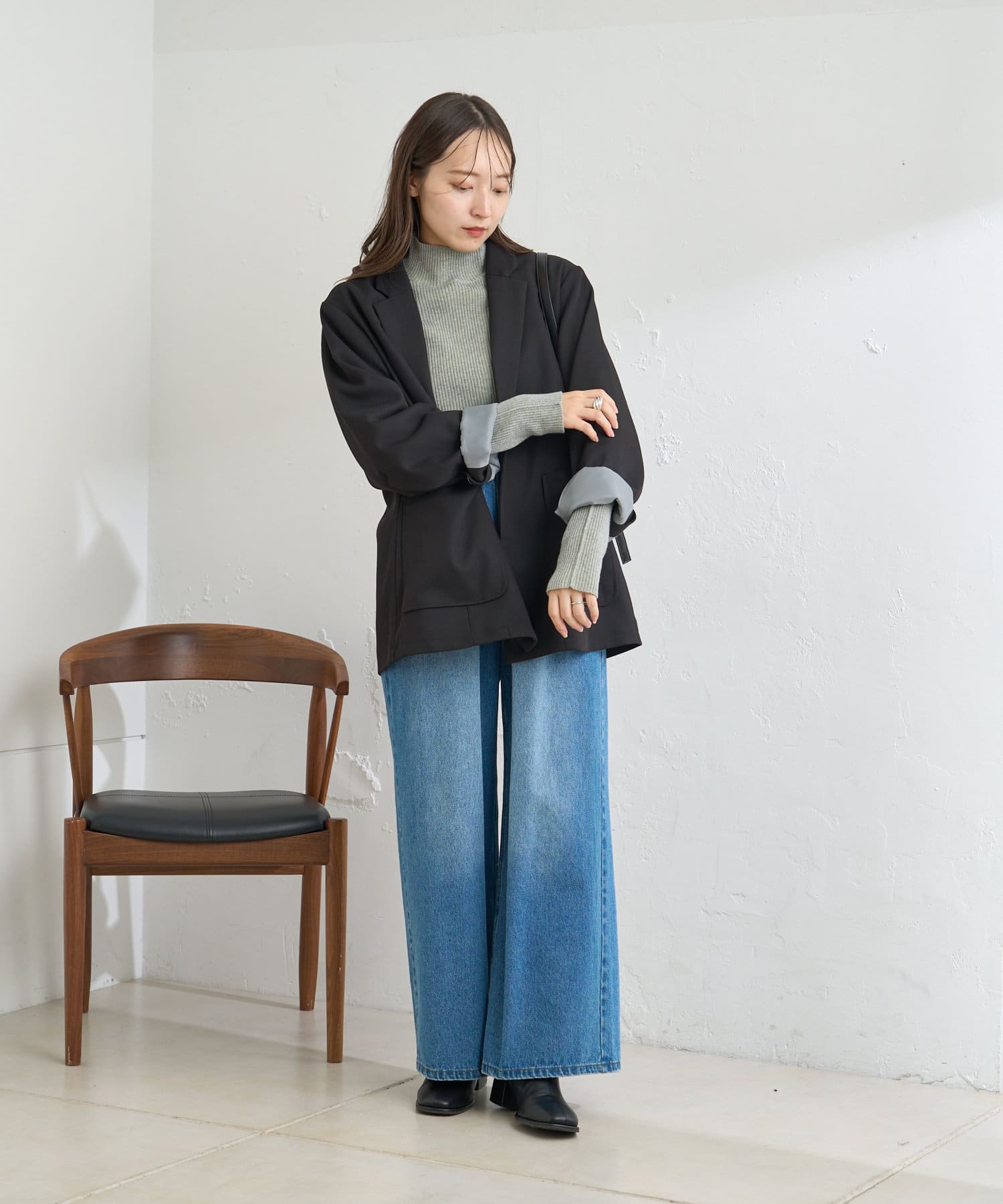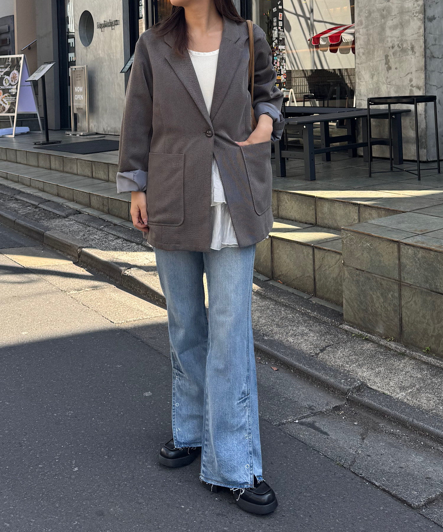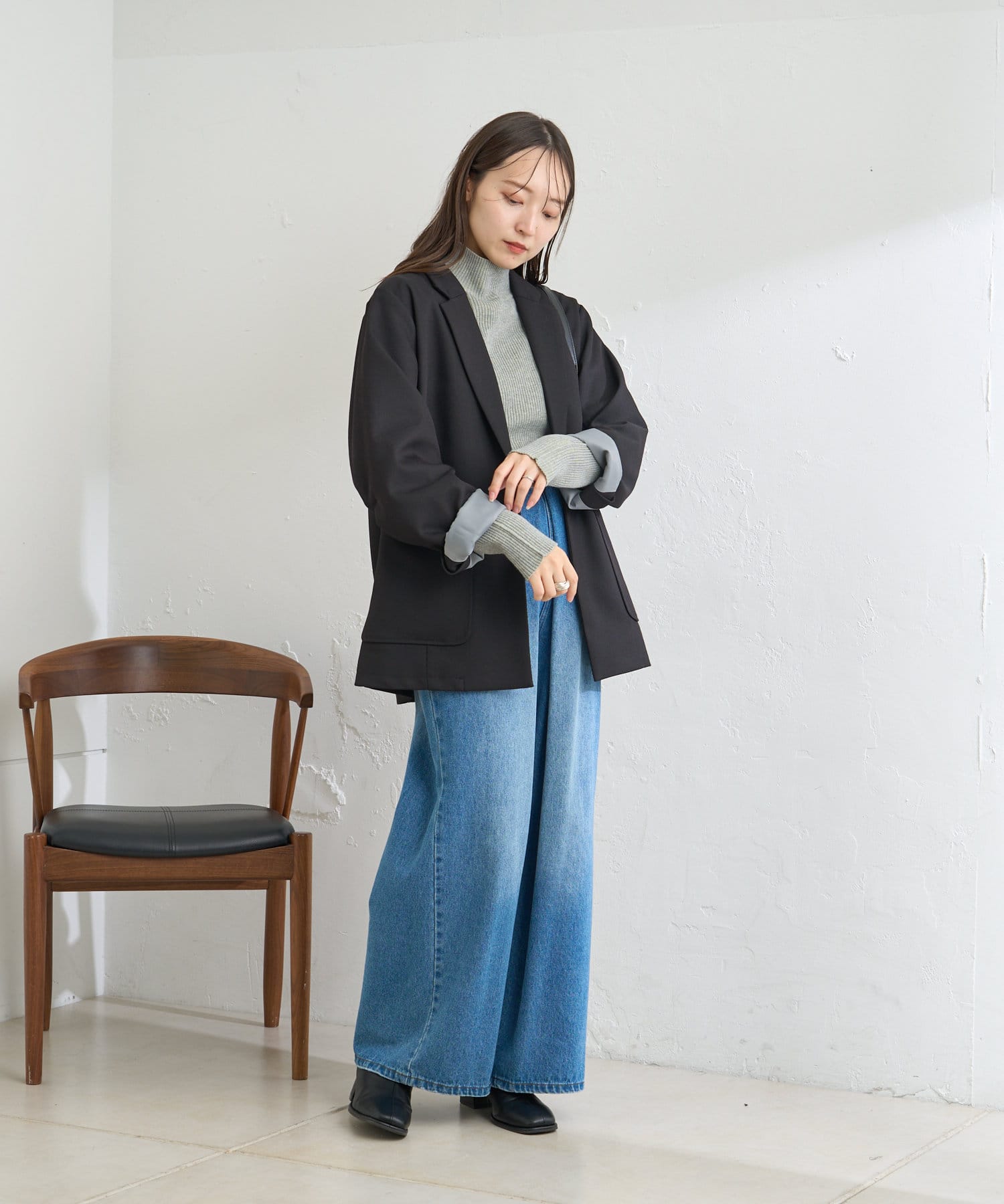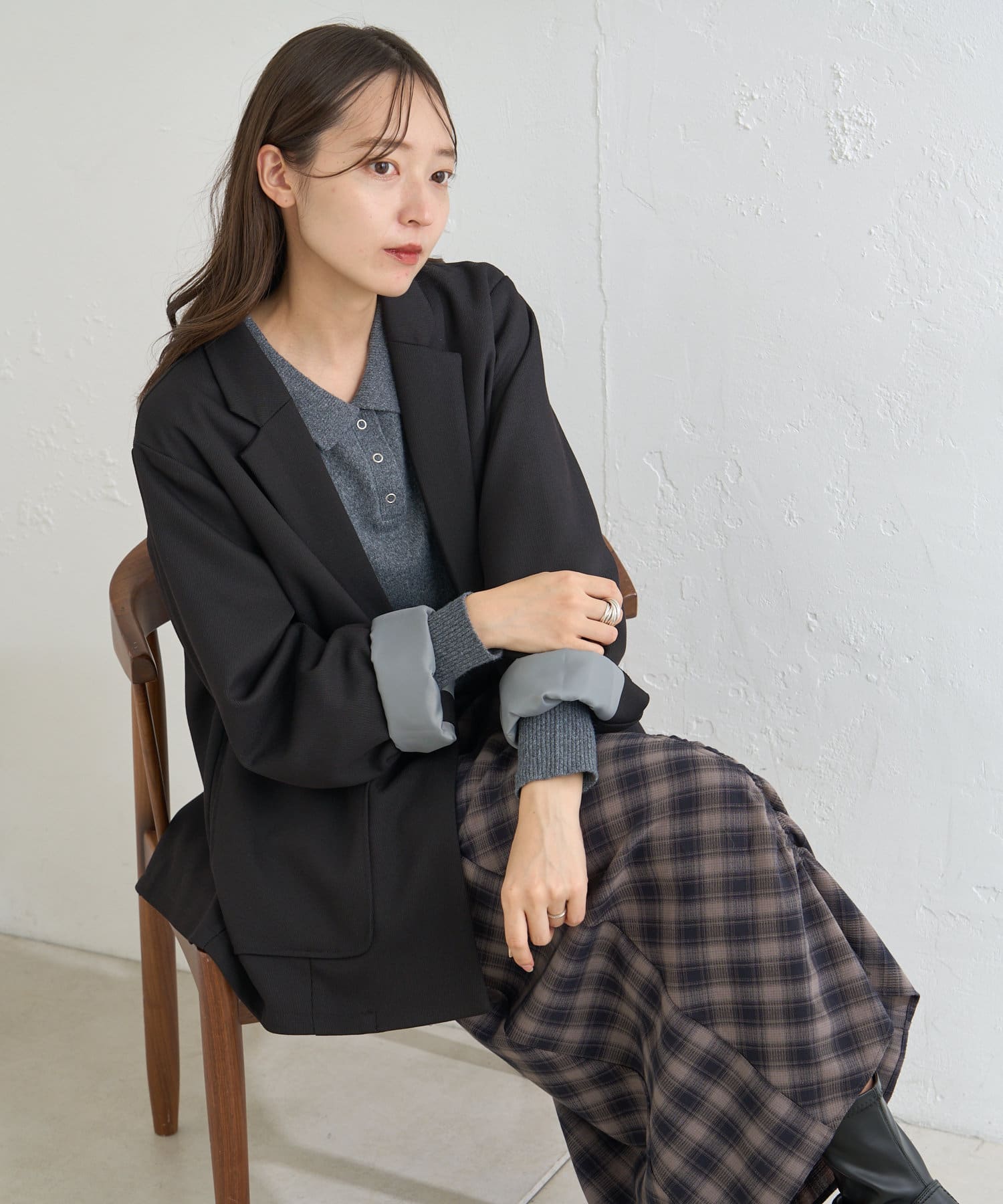 ジャケットのオーバーサイズ感を活かし、ベーシックなインナーやリブニットを合わせると抜け感のある軽やかな印象に。