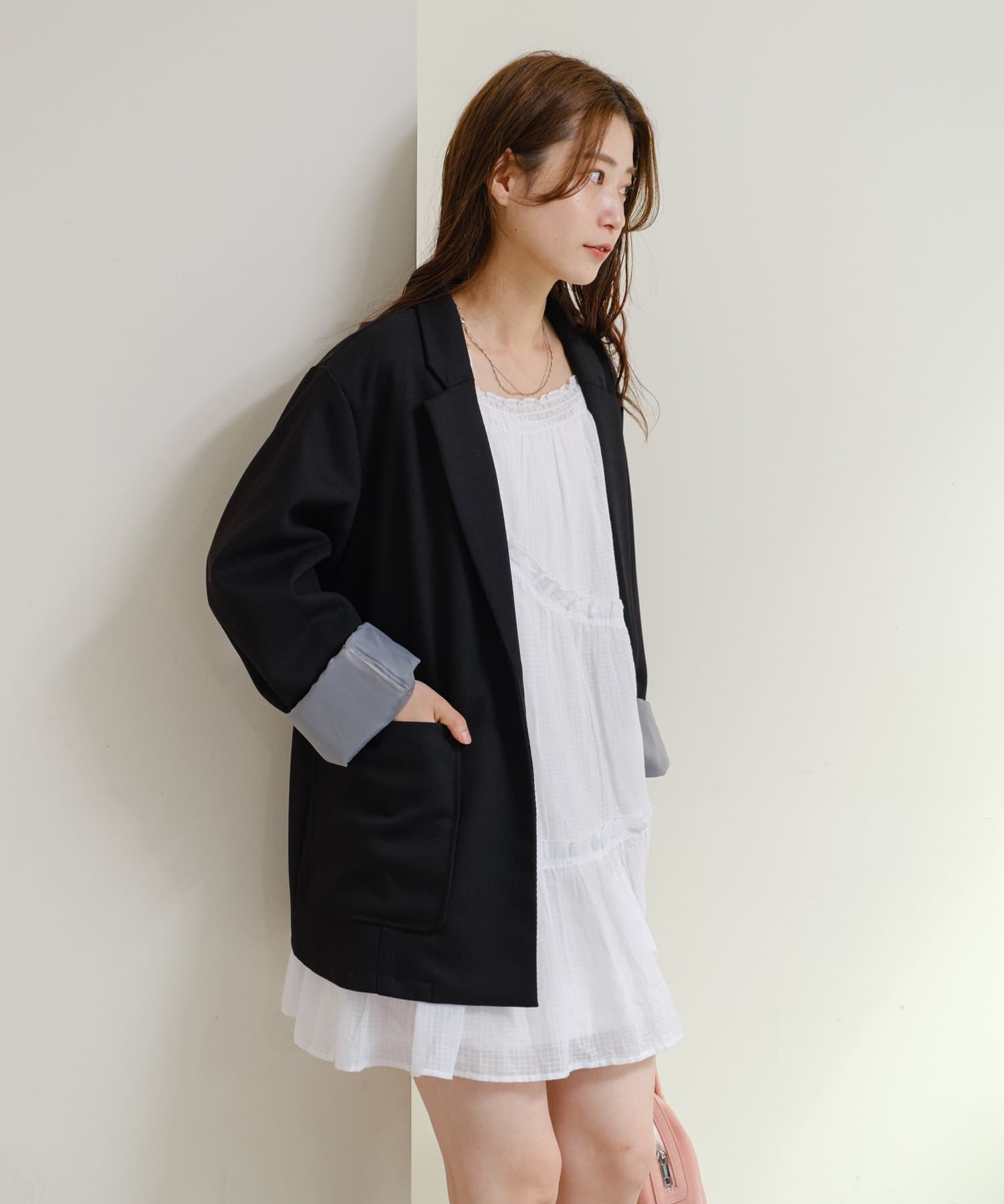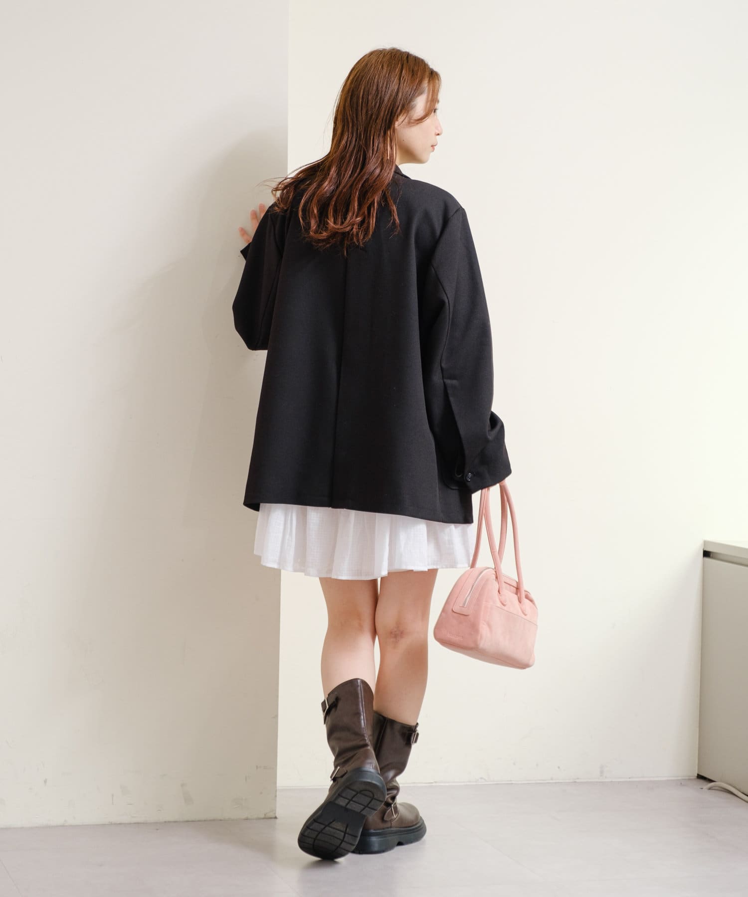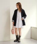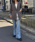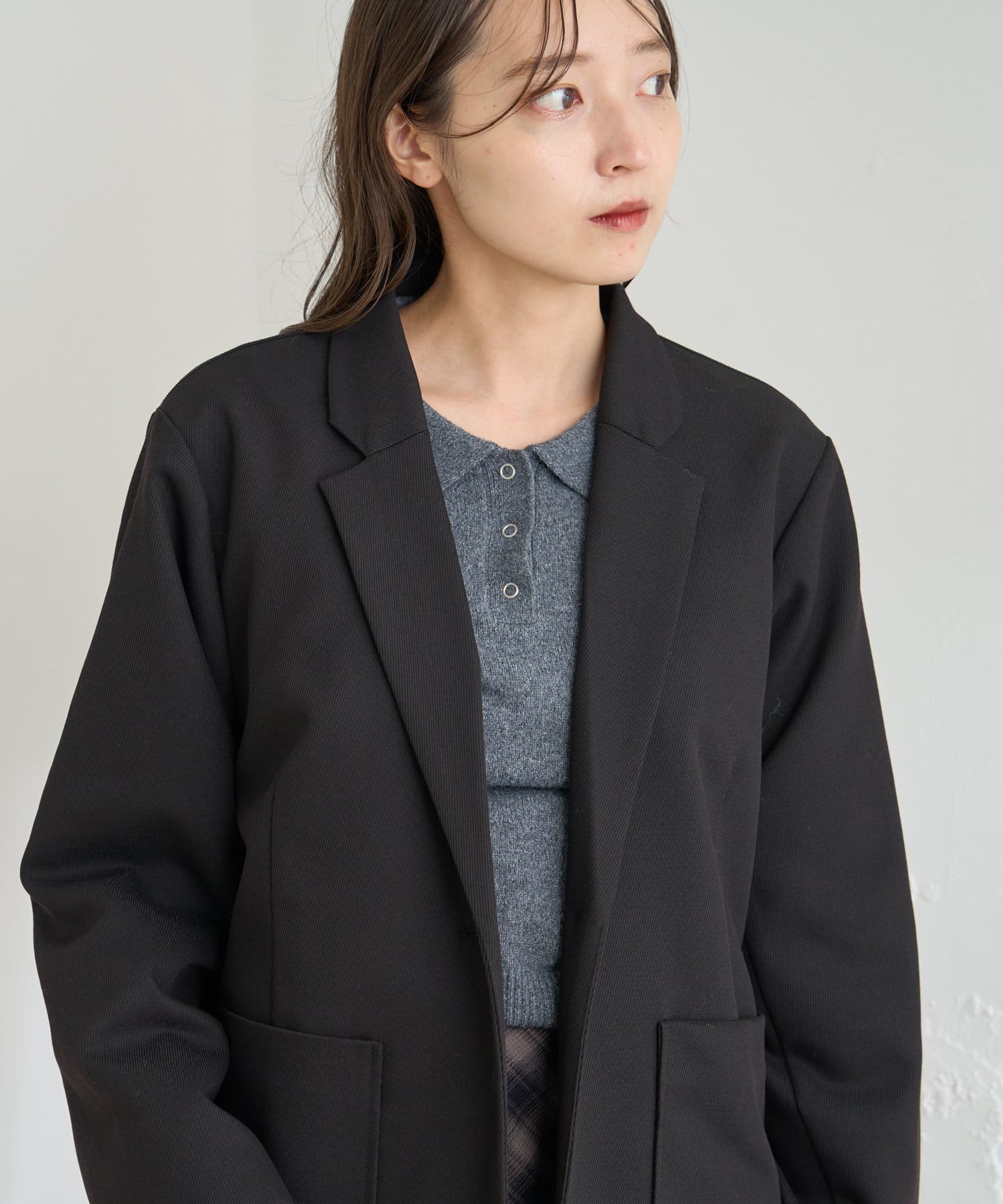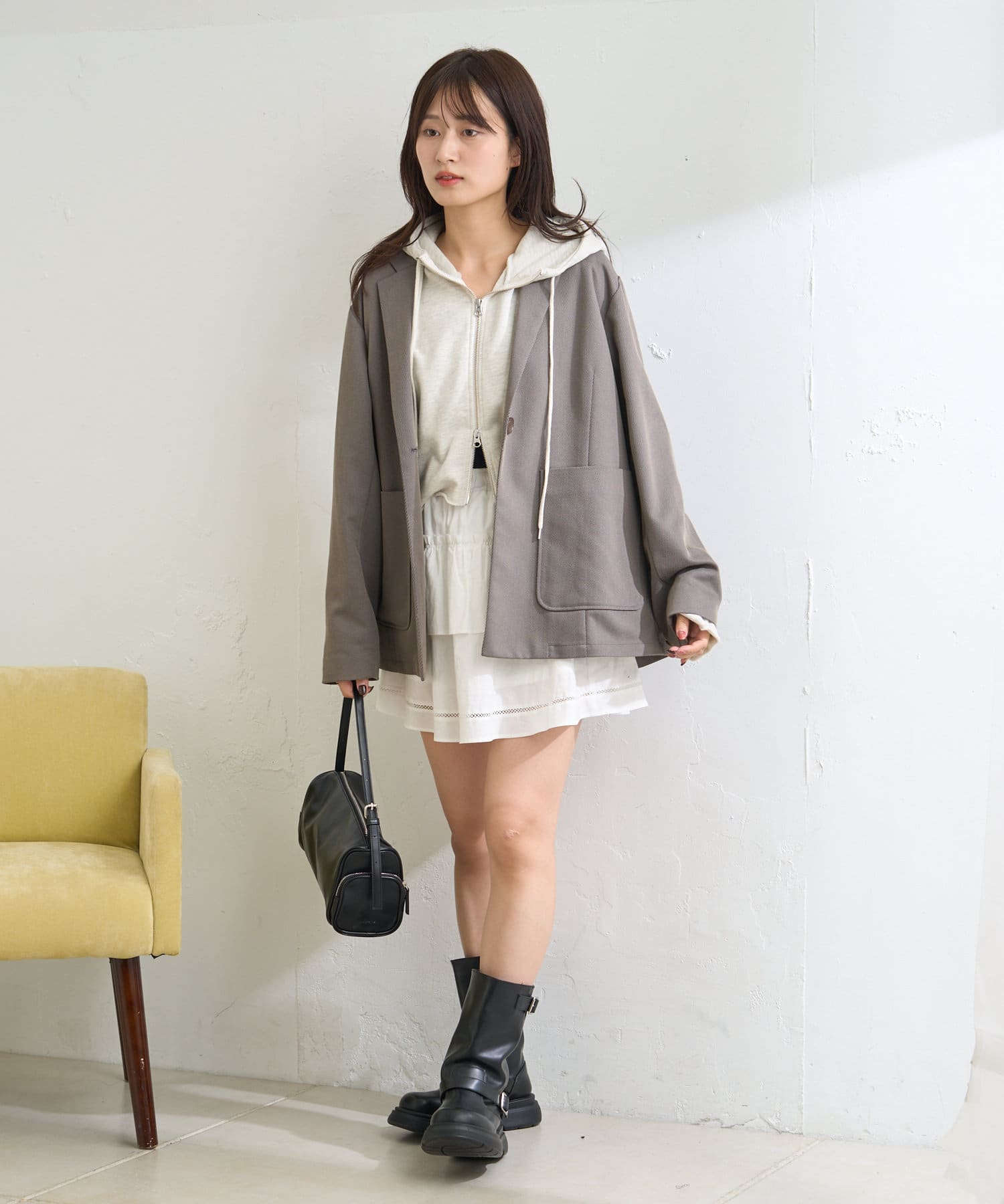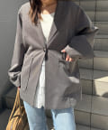 ジャケットのオーバーサイズ感を活かし、ベーシックなインナーやリブニットを合わせると抜け感のある軽やかな印象に。