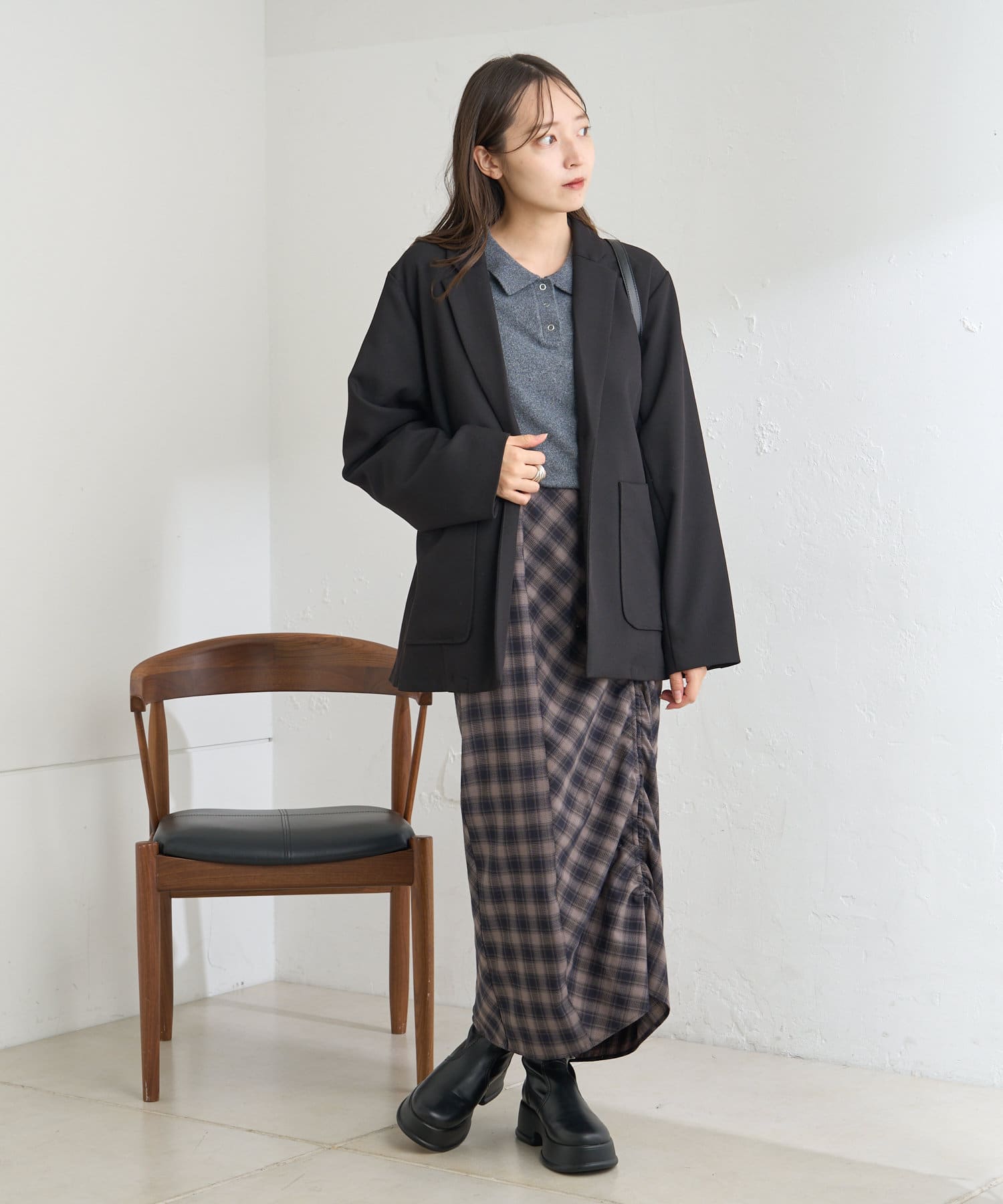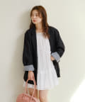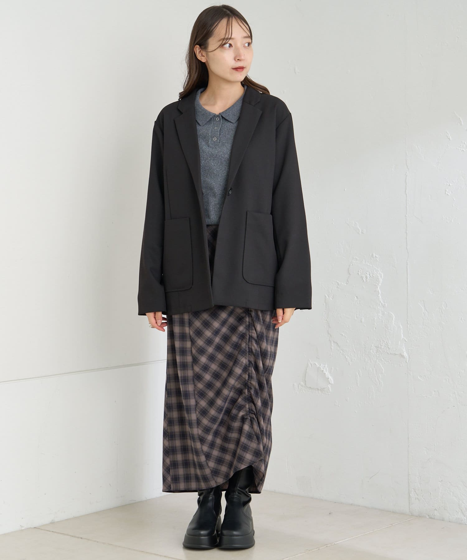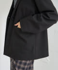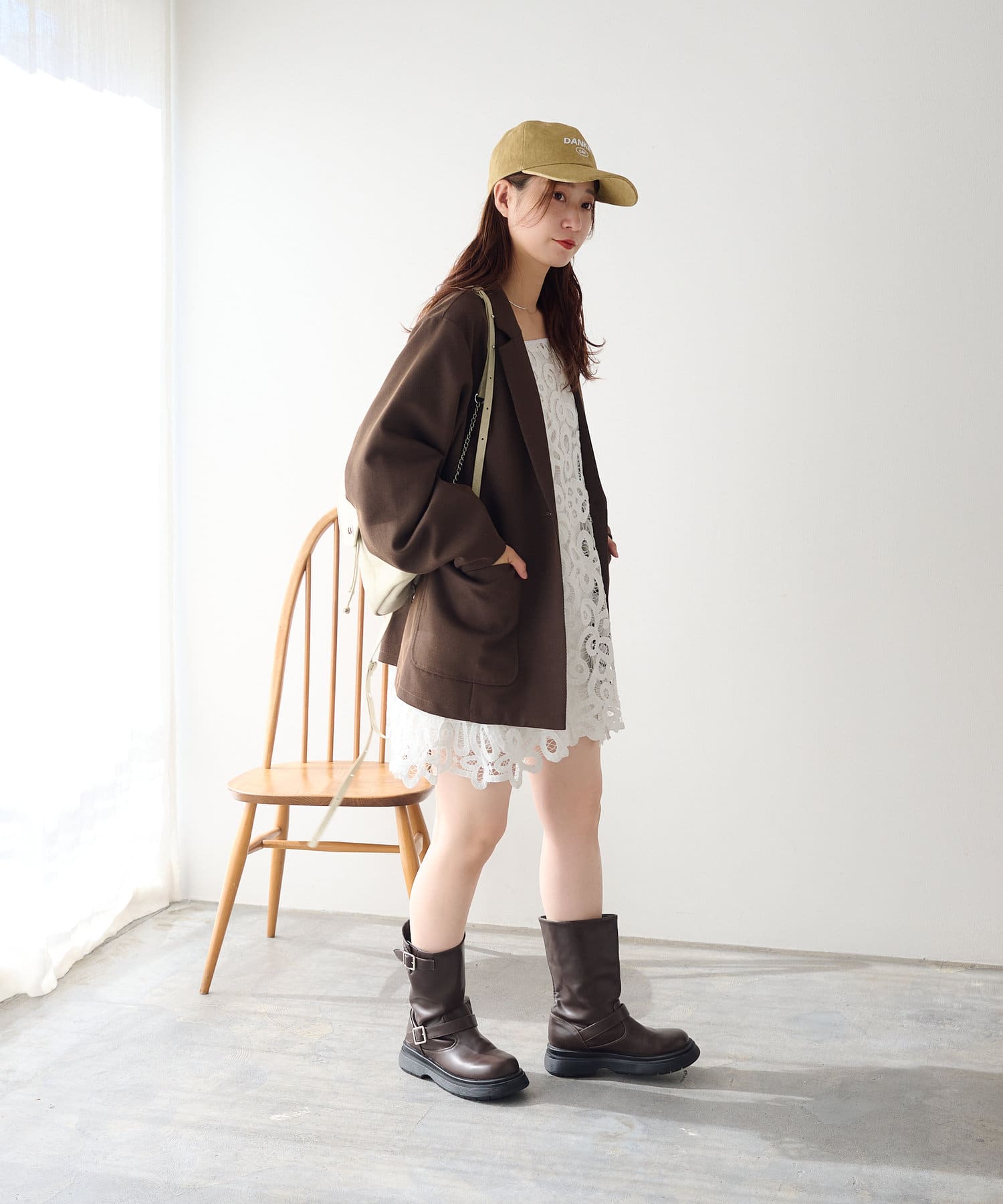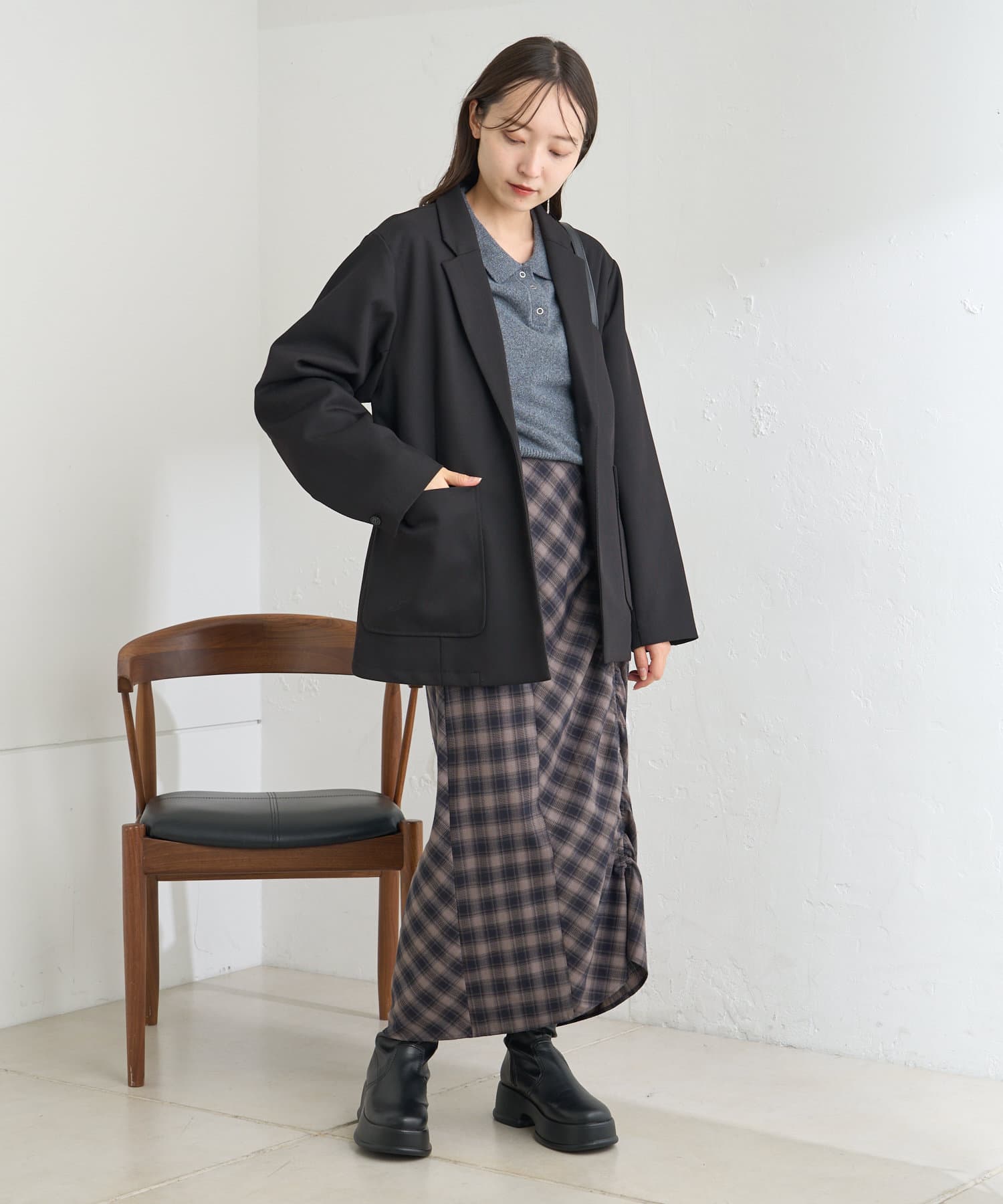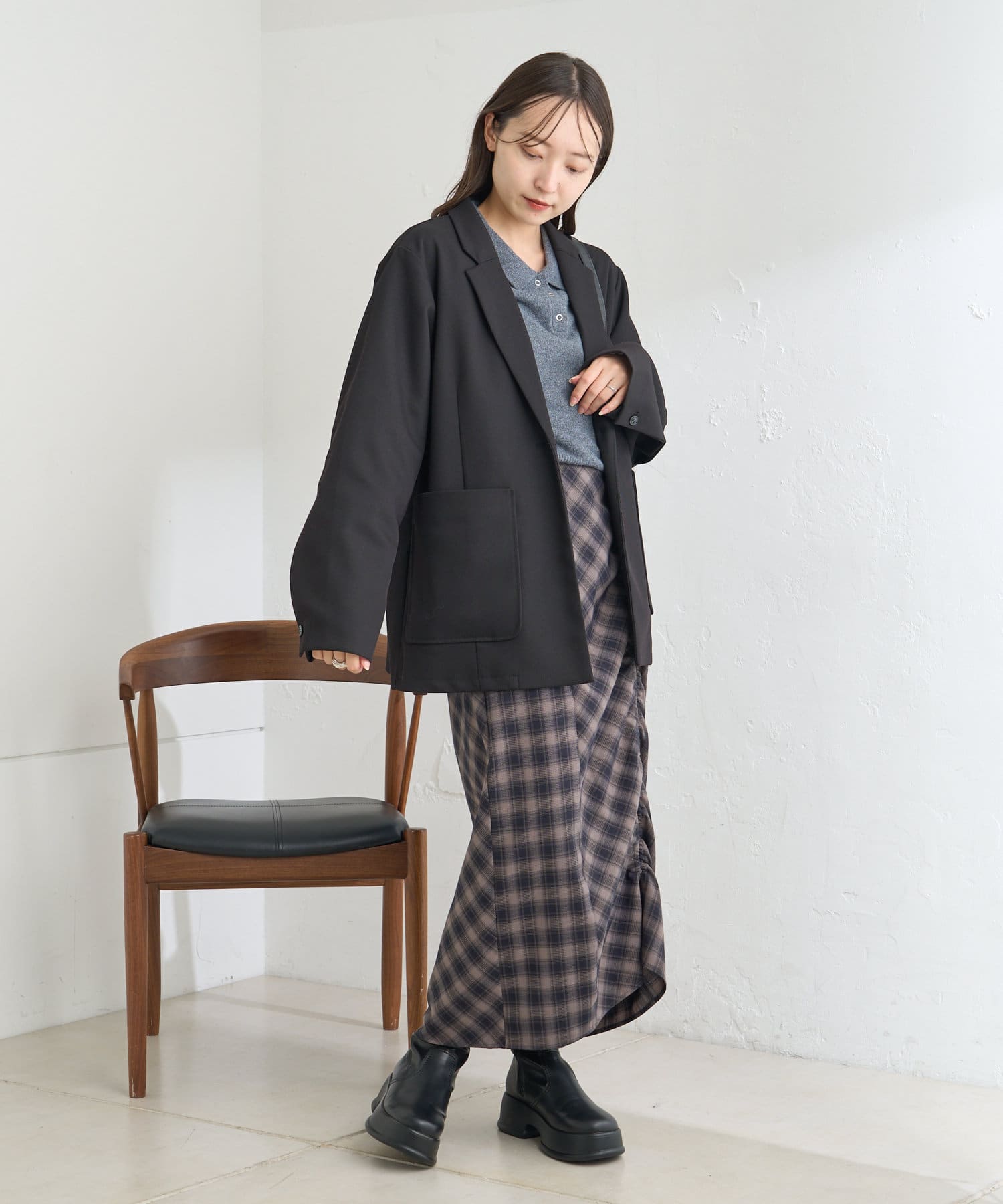 ジャケットのオーバーサイズ感を活かし、ベーシックなインナーやリブニットを合わせると抜け感のある軽やかな印象に。